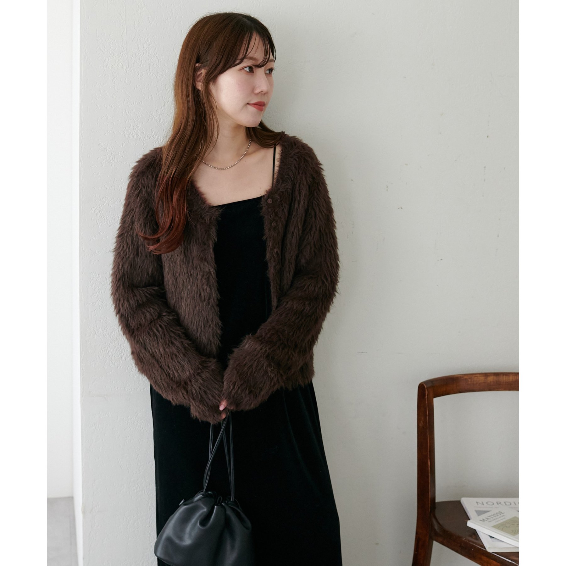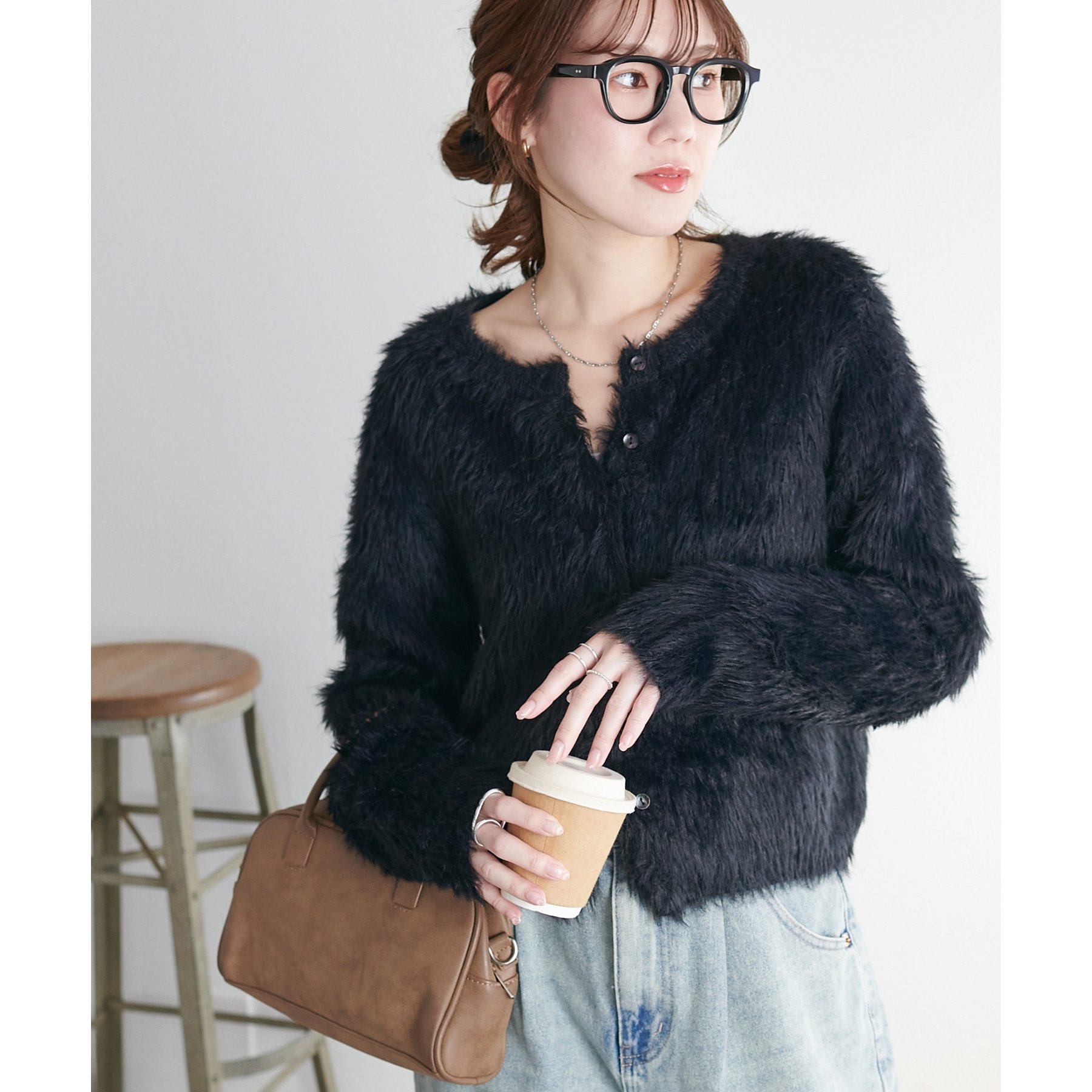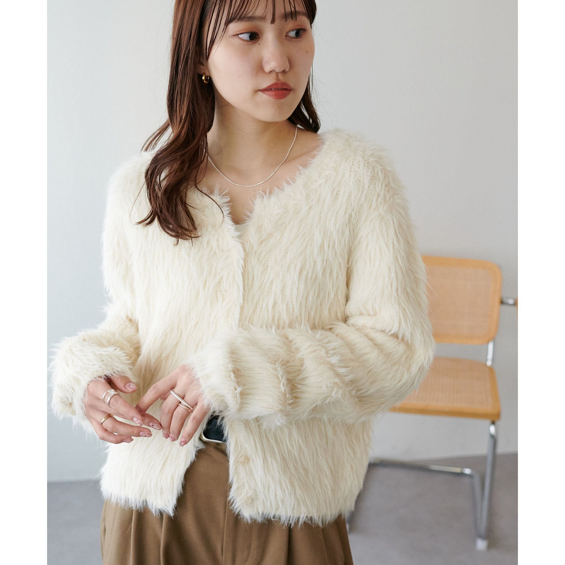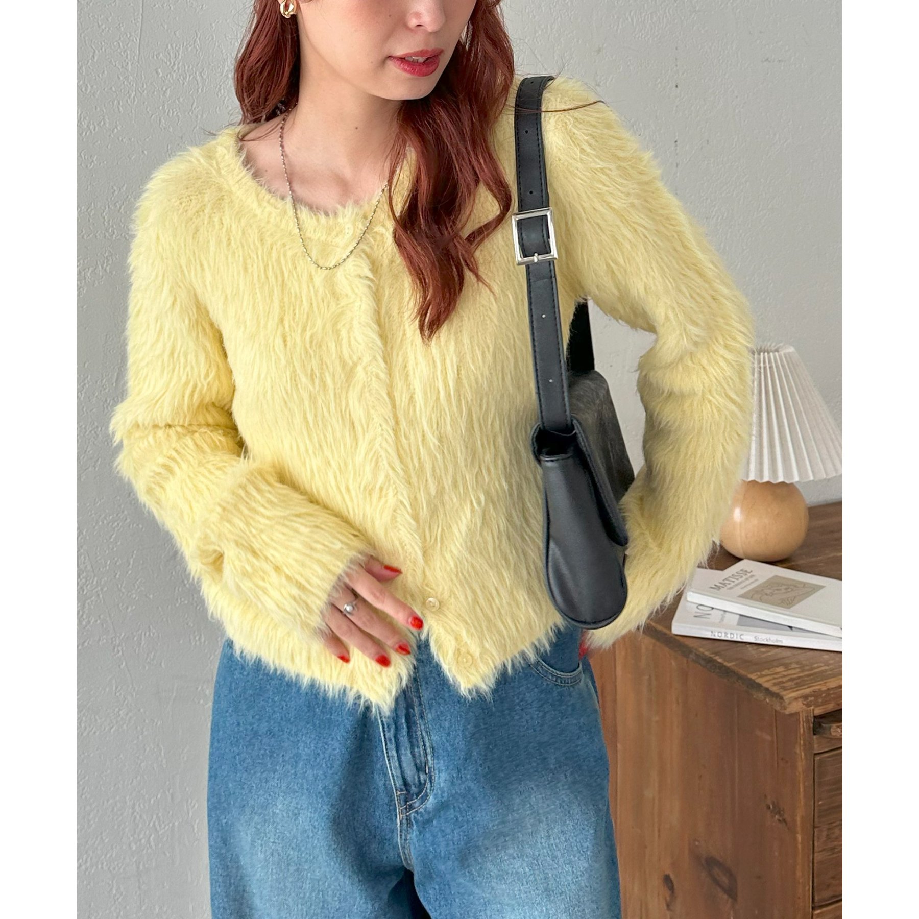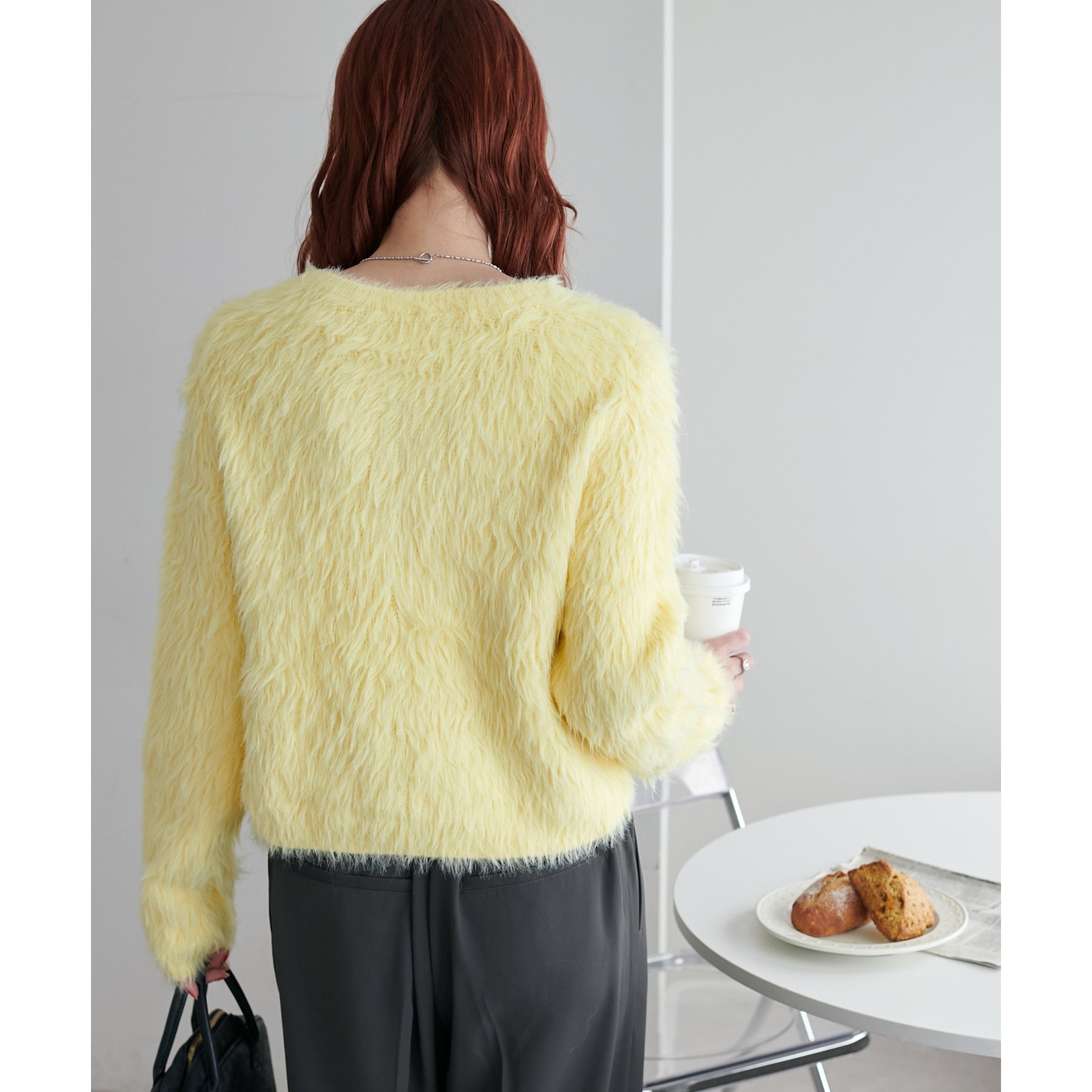 全体に毛足の長いロングフェザーヤーンを贅沢に使用した、ふんわりとした質感が魅力のカーディガン。