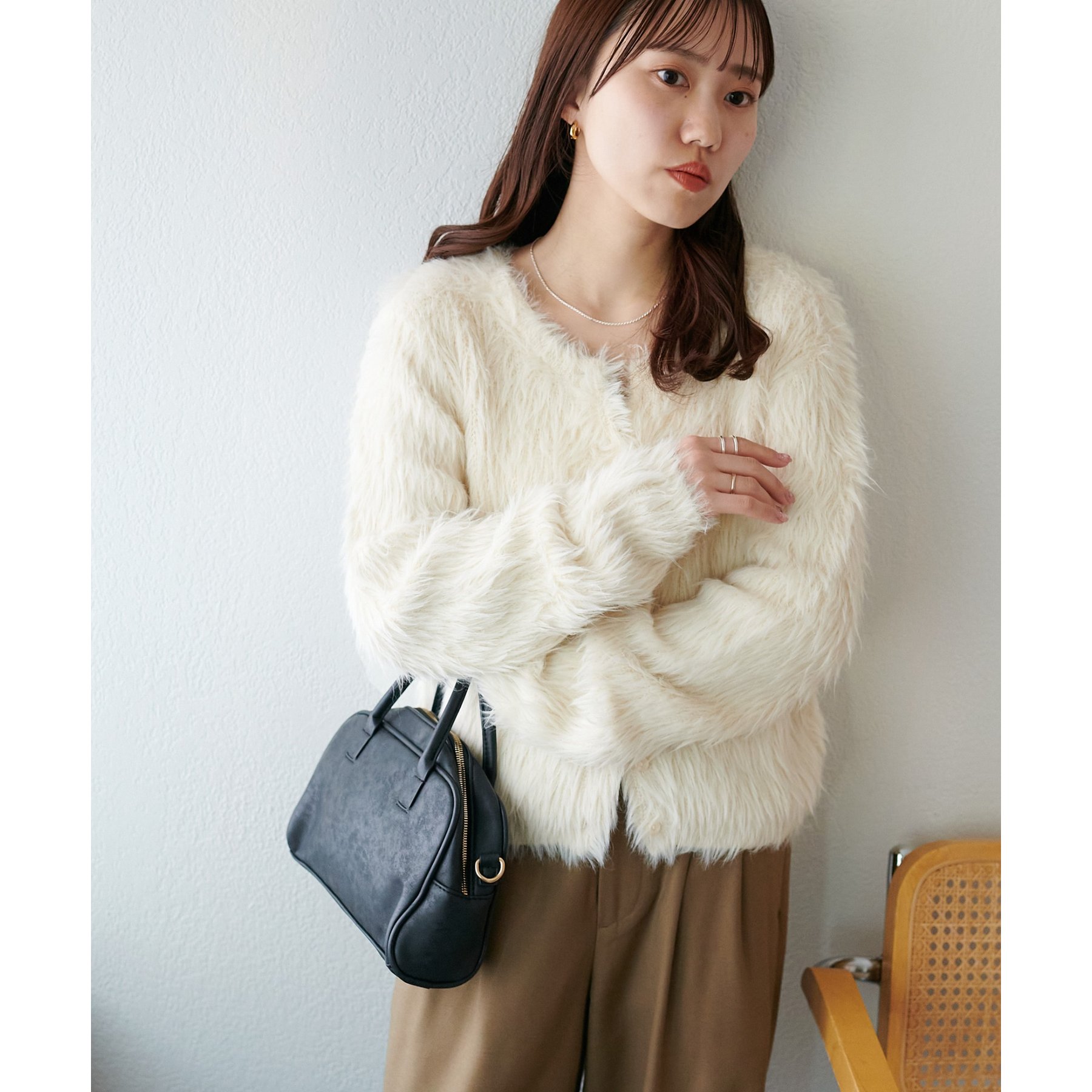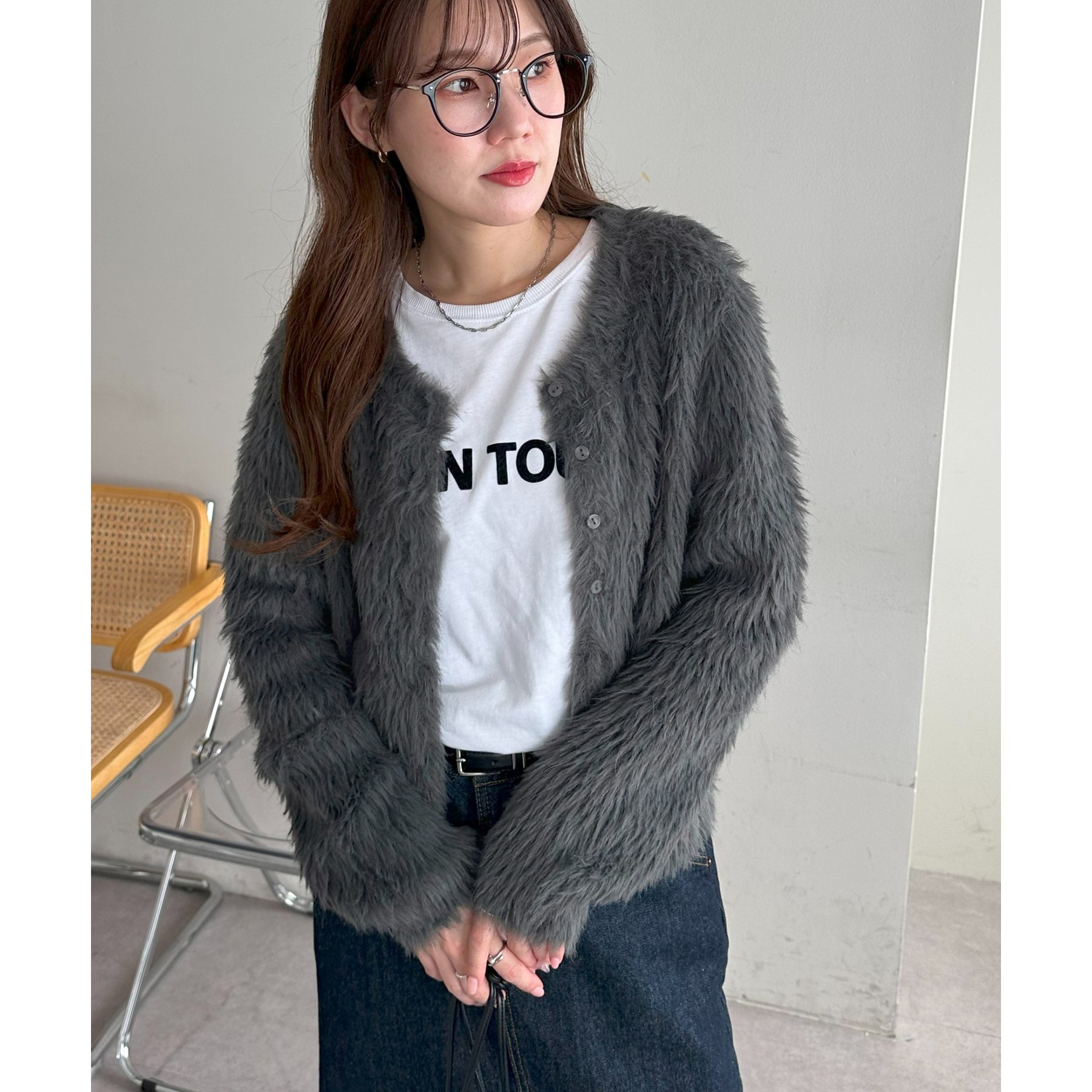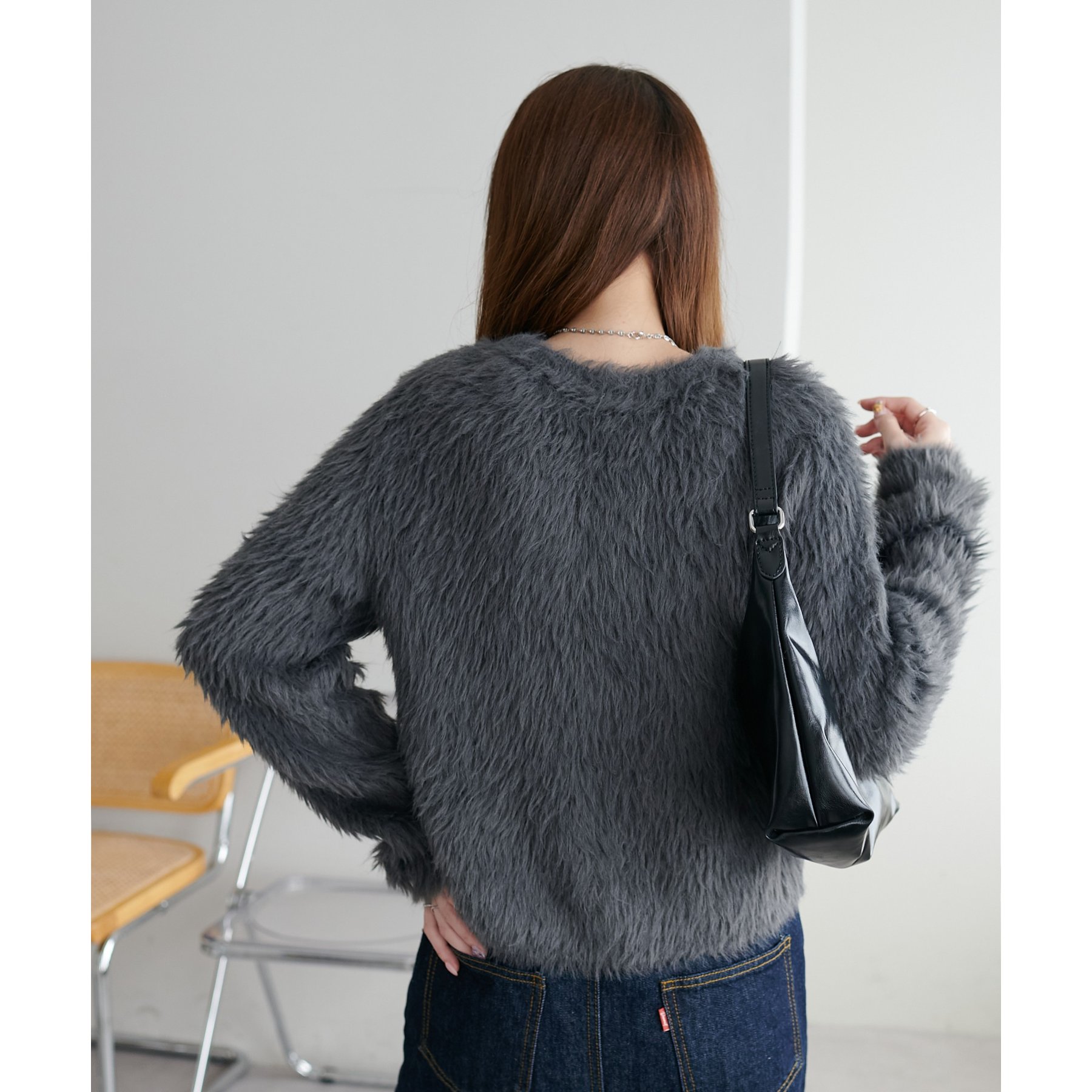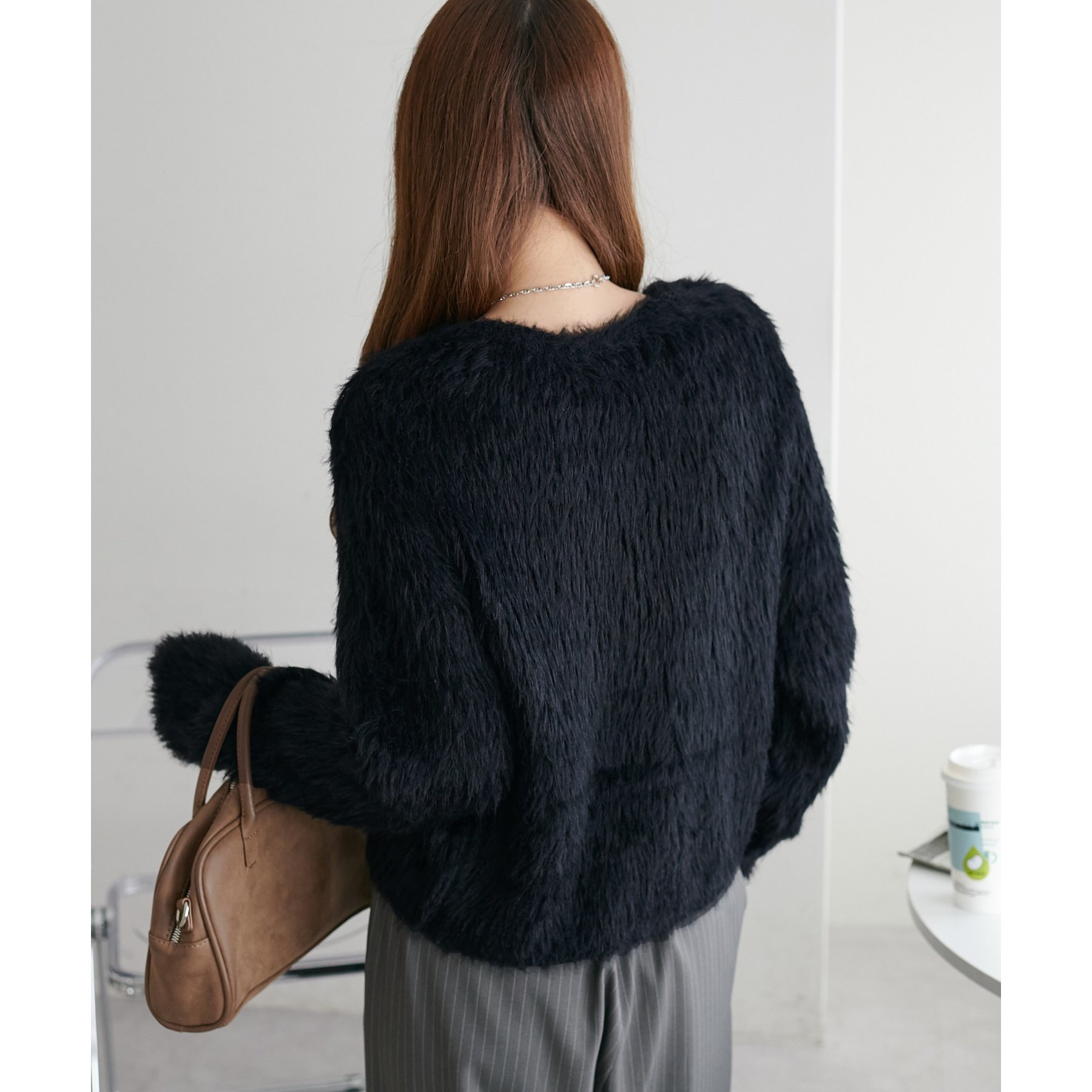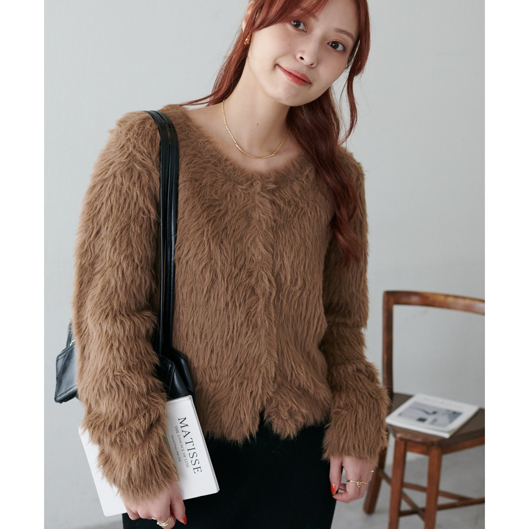 全体に毛足の長いロングフェザーヤーンを贅沢に使用した、ふんわりとした質感が魅力のカーディガン。
