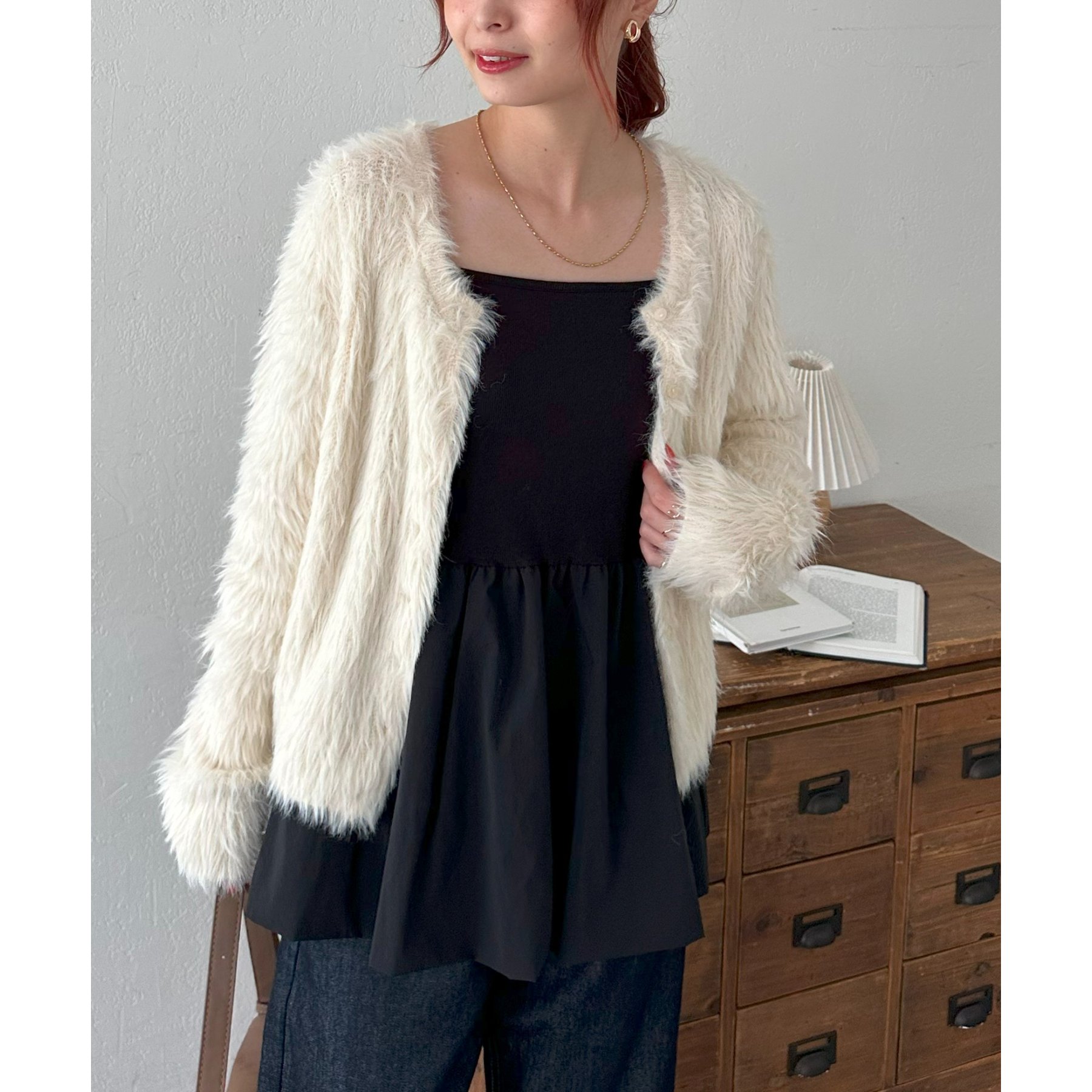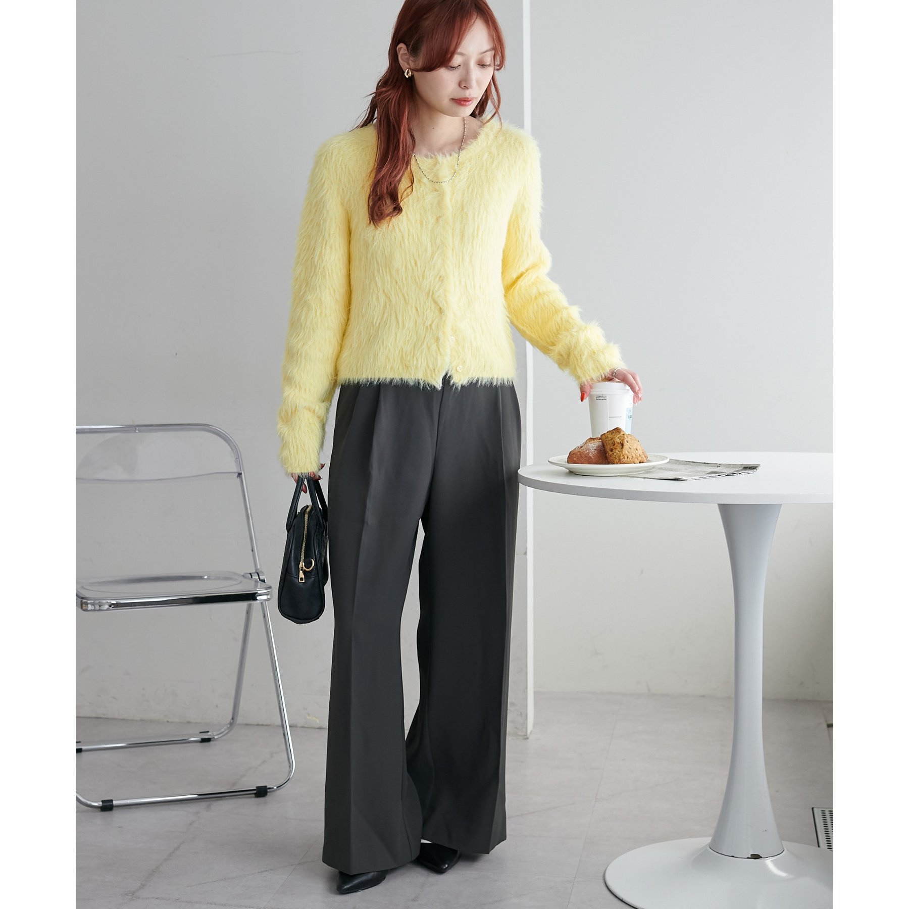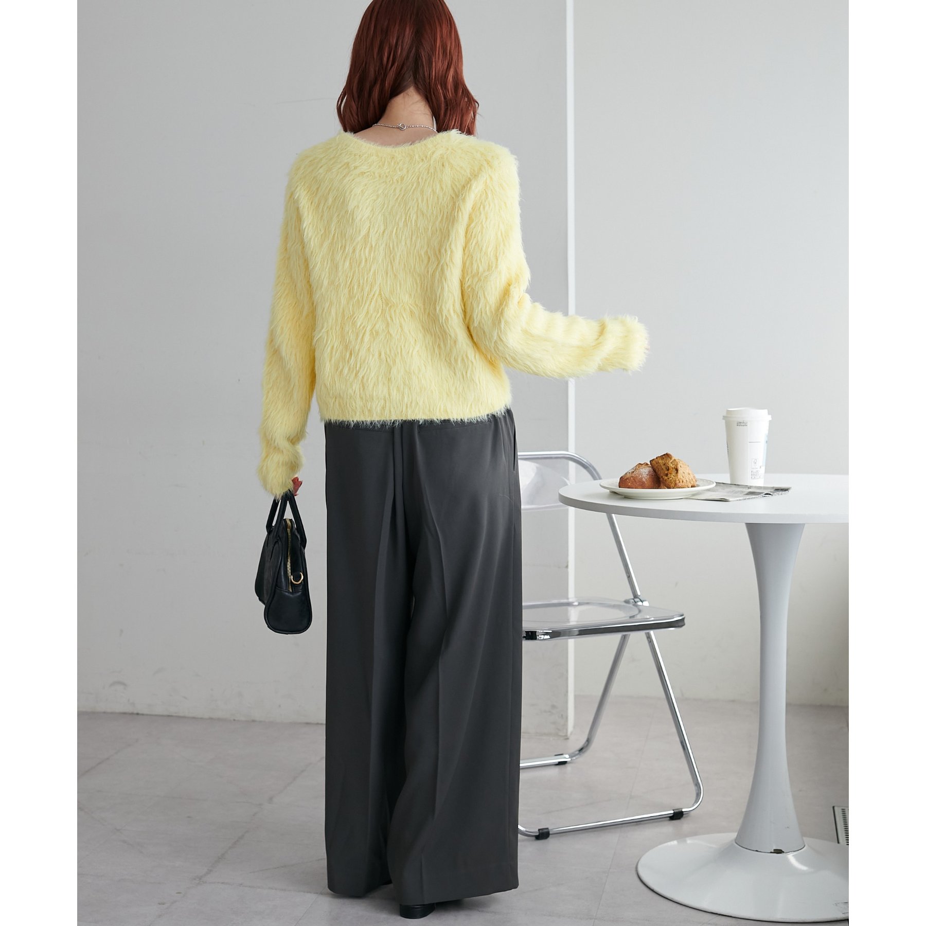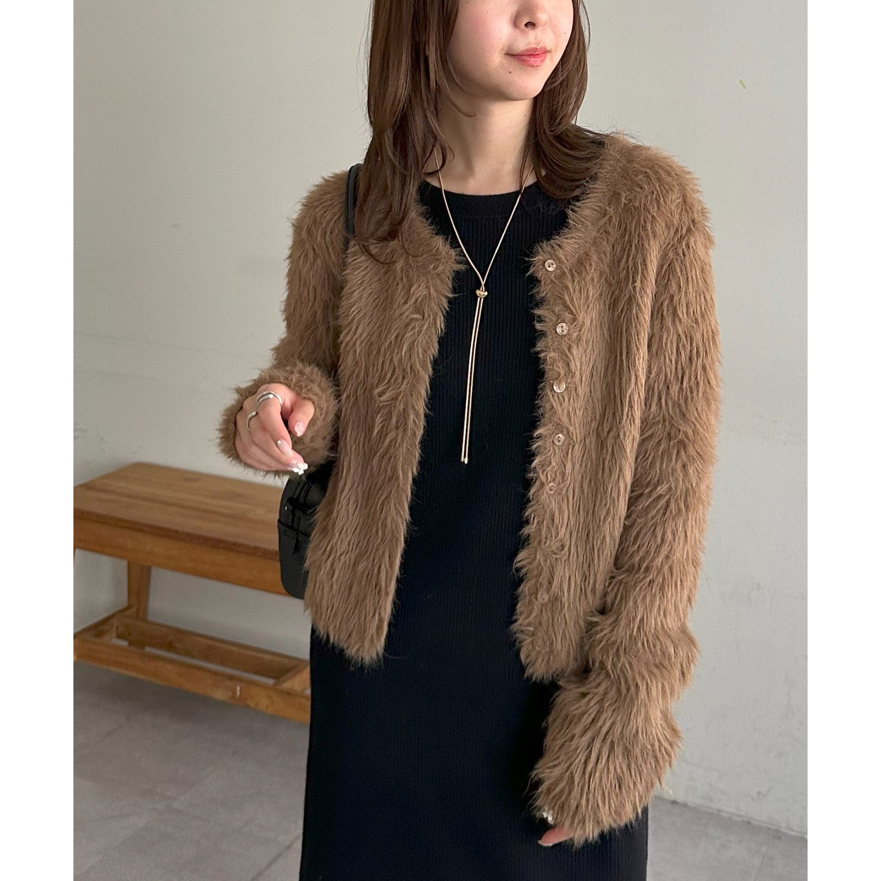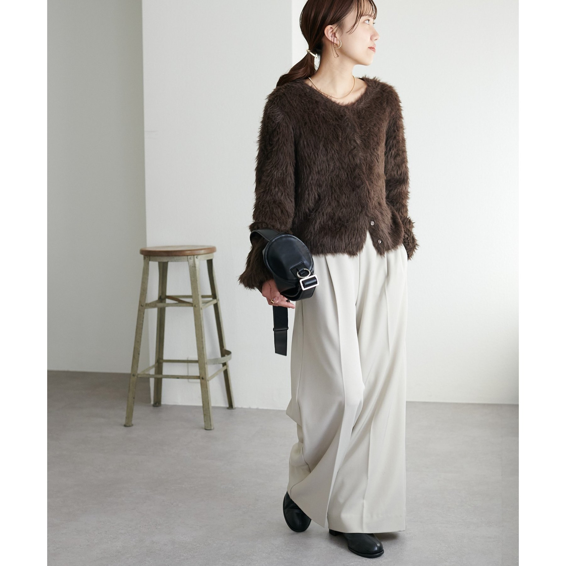 全体に毛足の長いロングフェザーヤーンを贅沢に使用した、ふんわりとした質感が魅力のカーディガン。