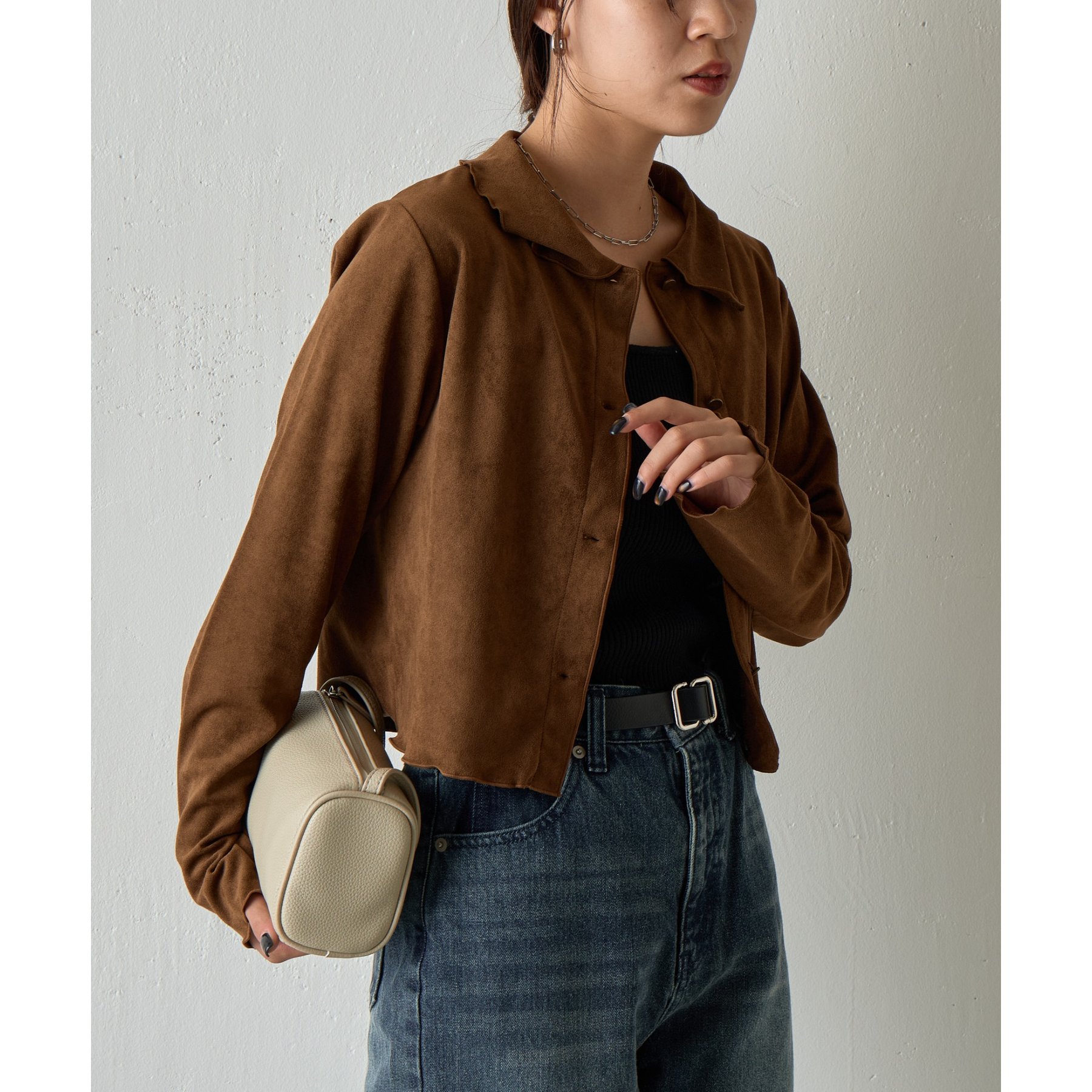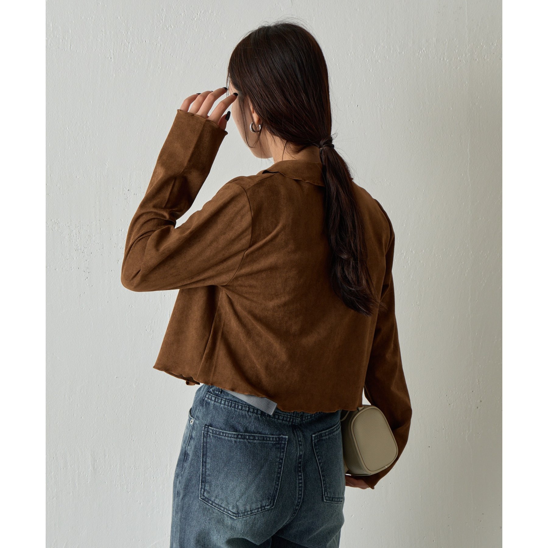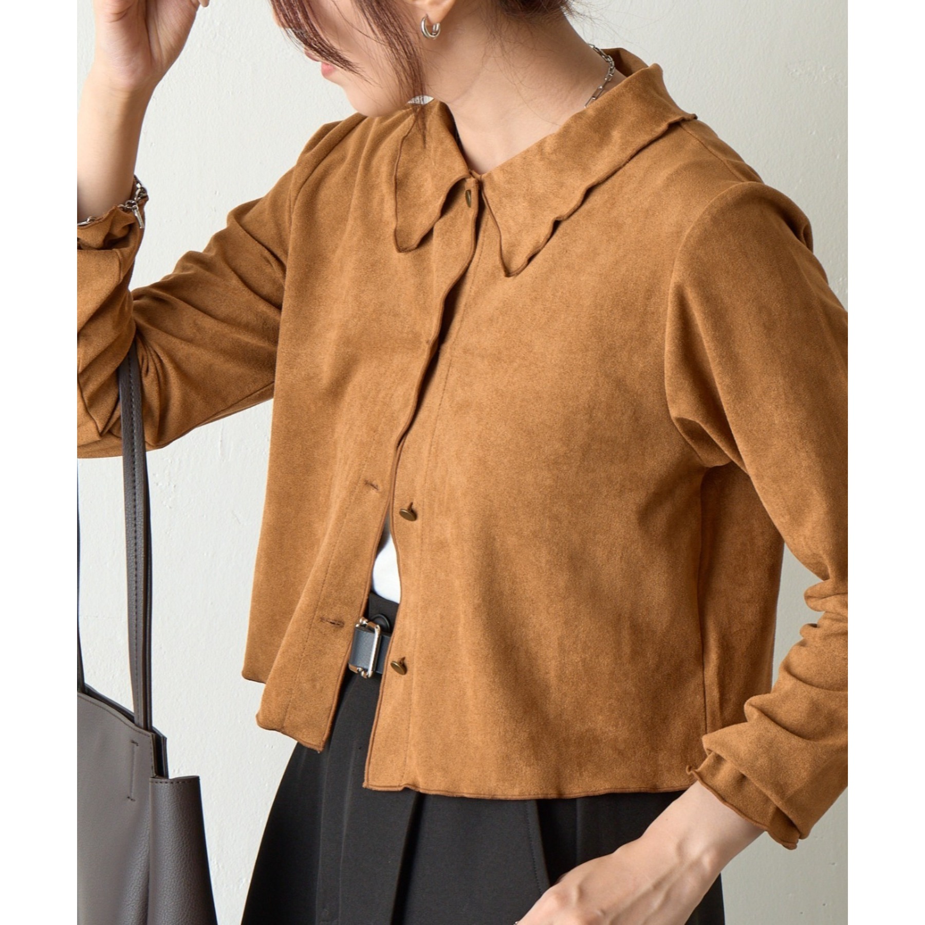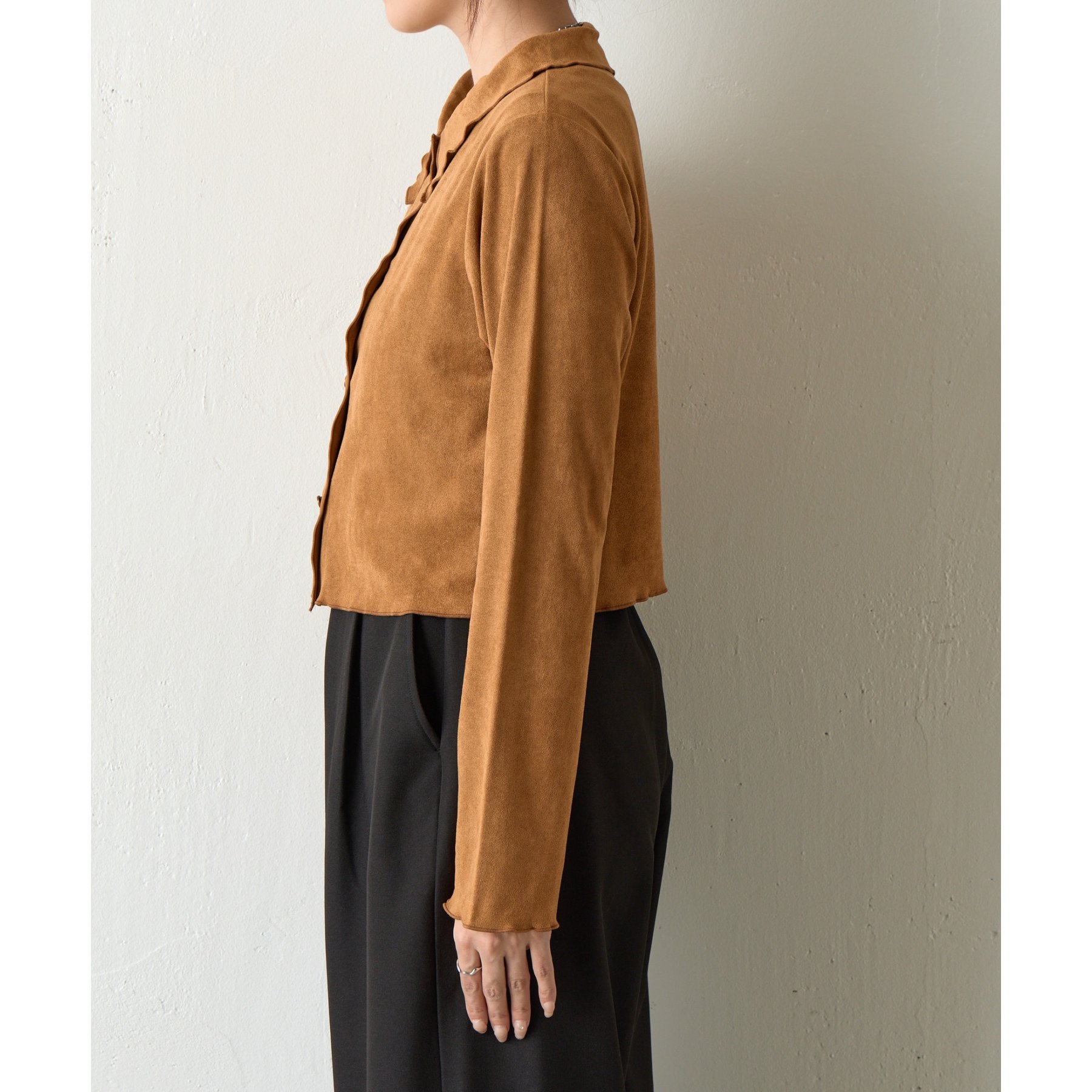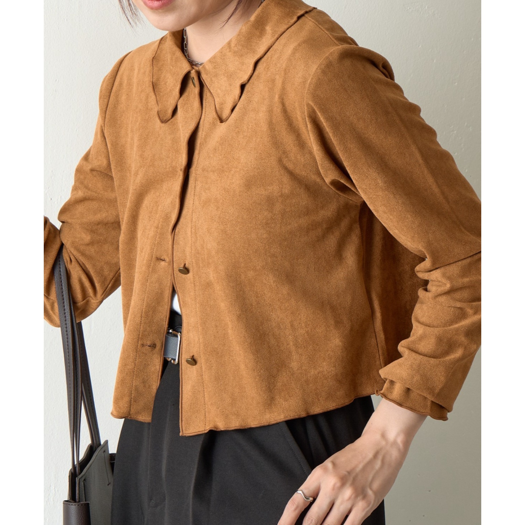微起毛感のあるフェイクスエード生地が、上品な艶感と秋冬らしい温もりを演出し、ややとろみのある素材で身体のラインに沿うような美しい落ち感が特徴です。