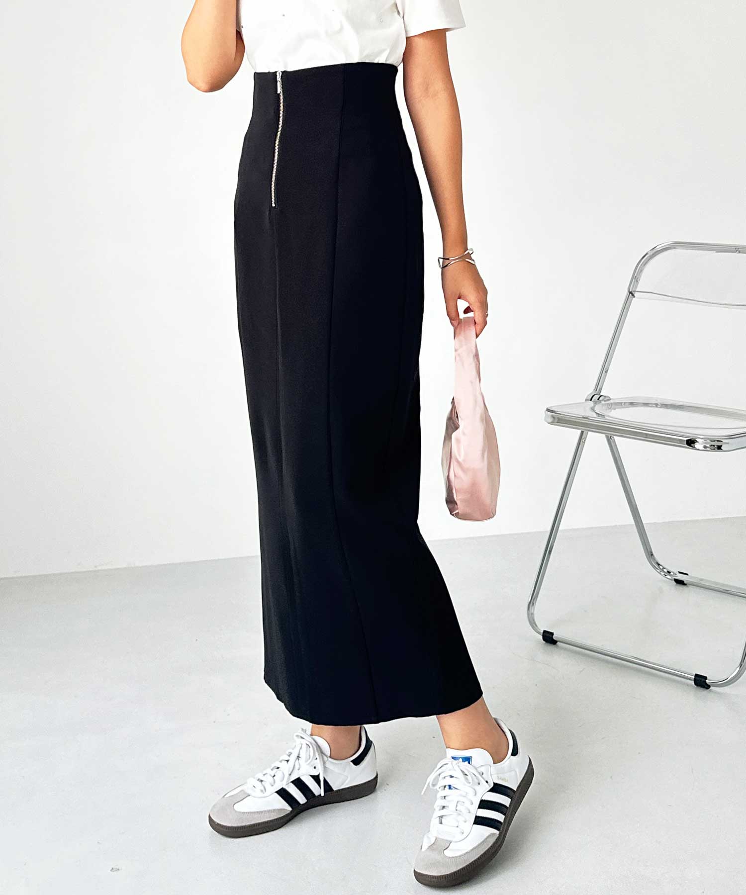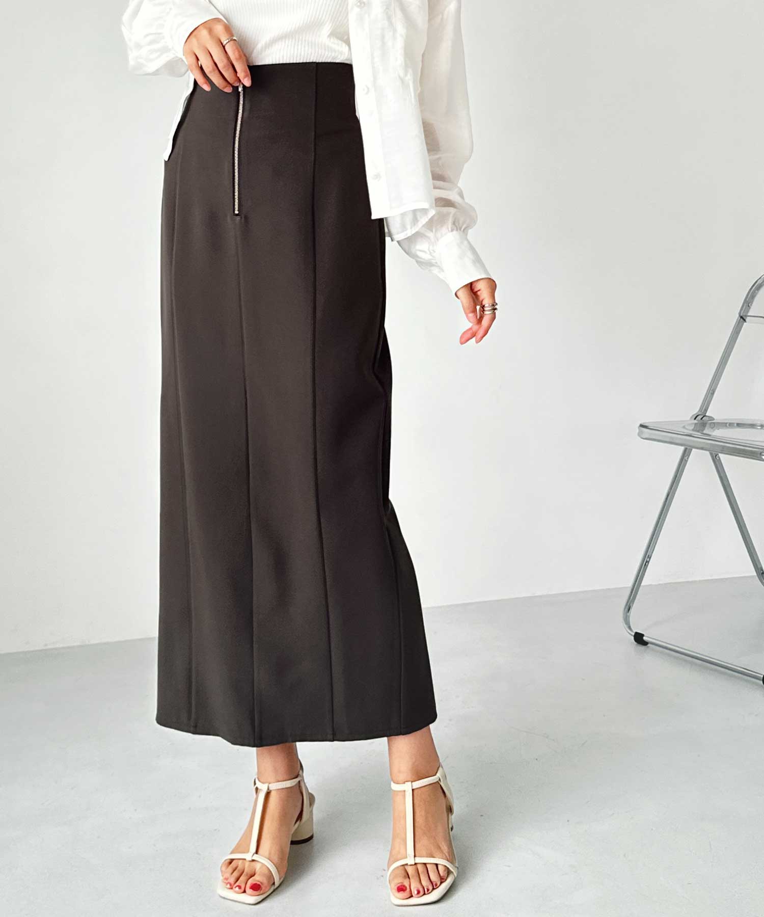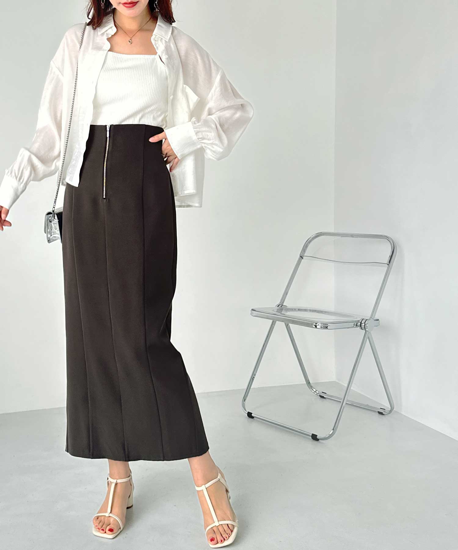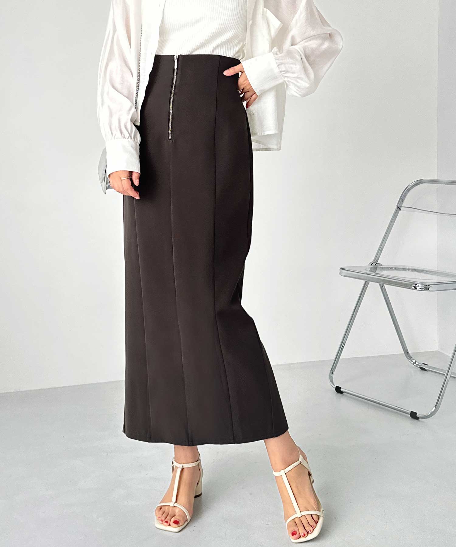 フロントジップ×切替デザインが縦ラインを強調するペンシルスカート。