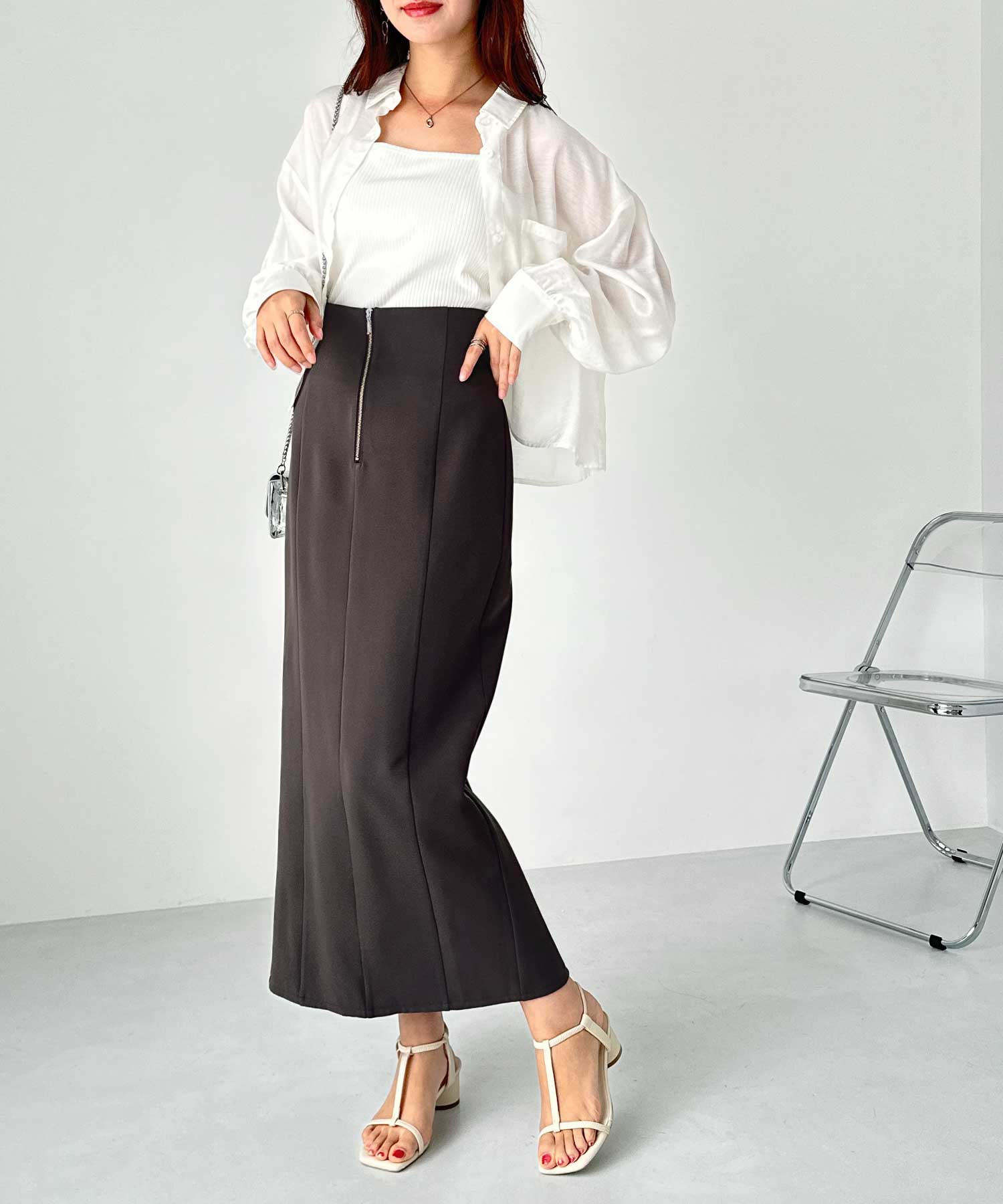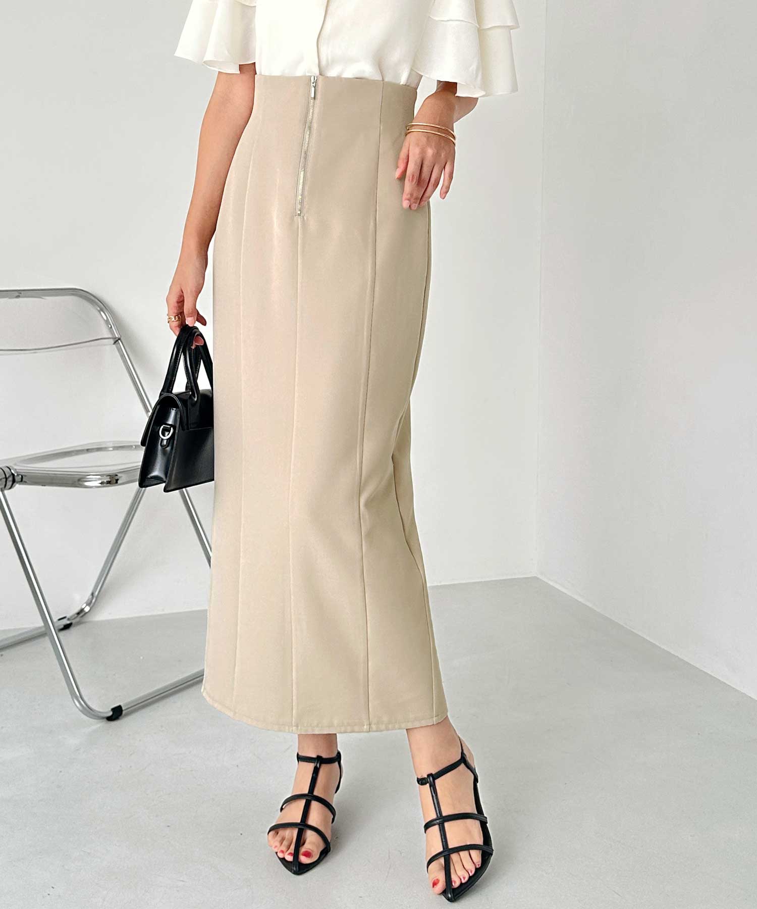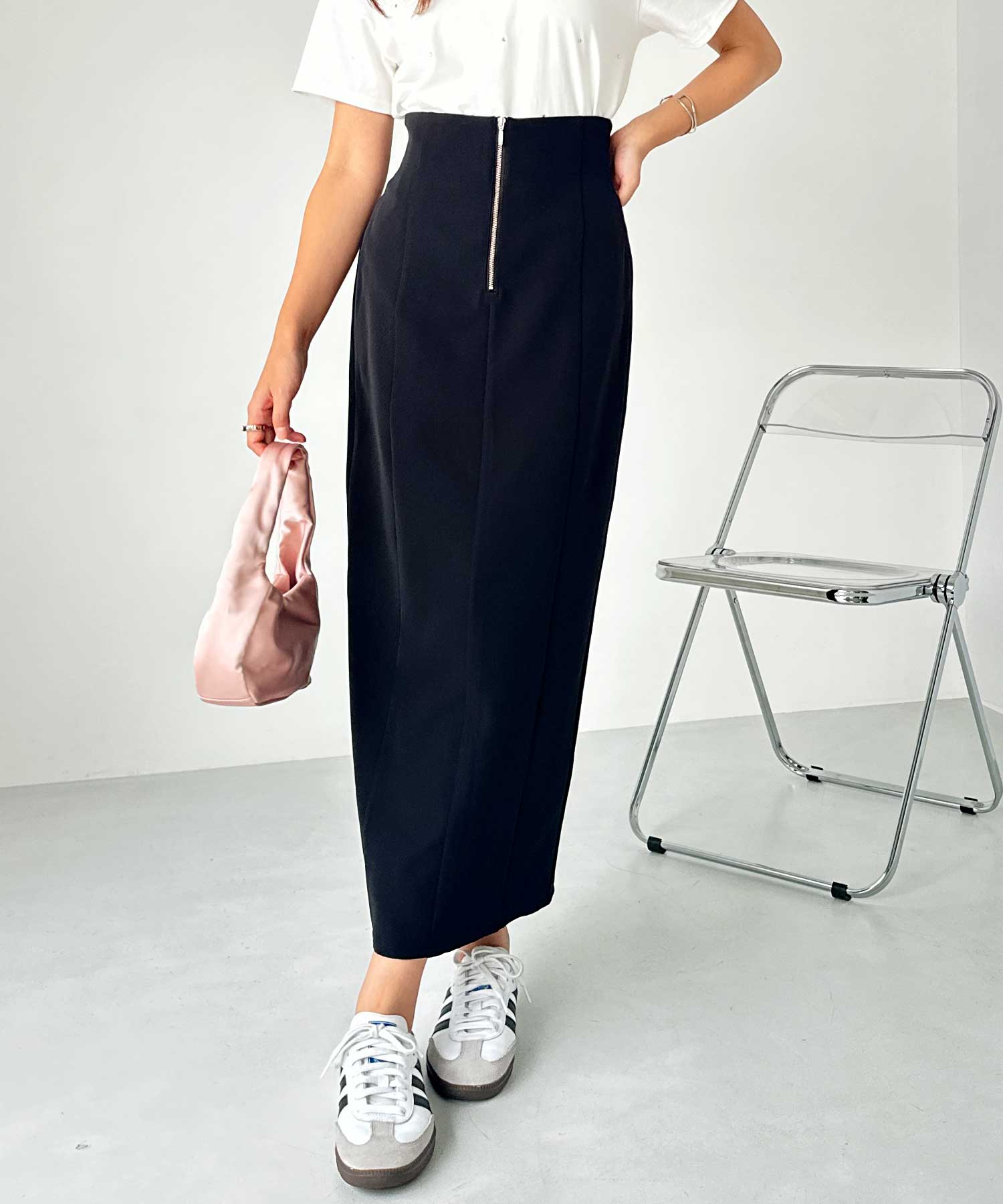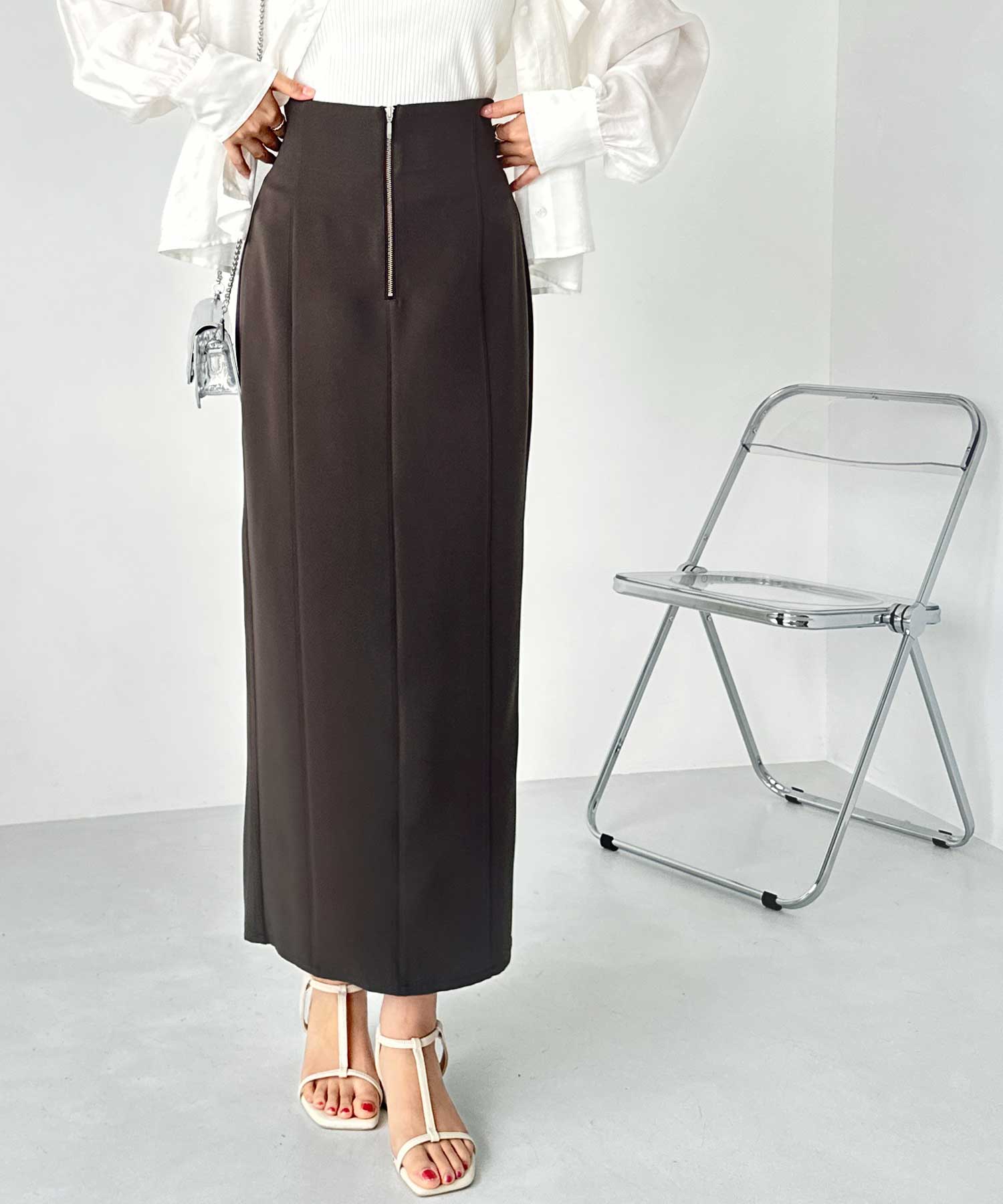 フロントジップ×切替デザインが縦ラインを強調するペンシルスカート。