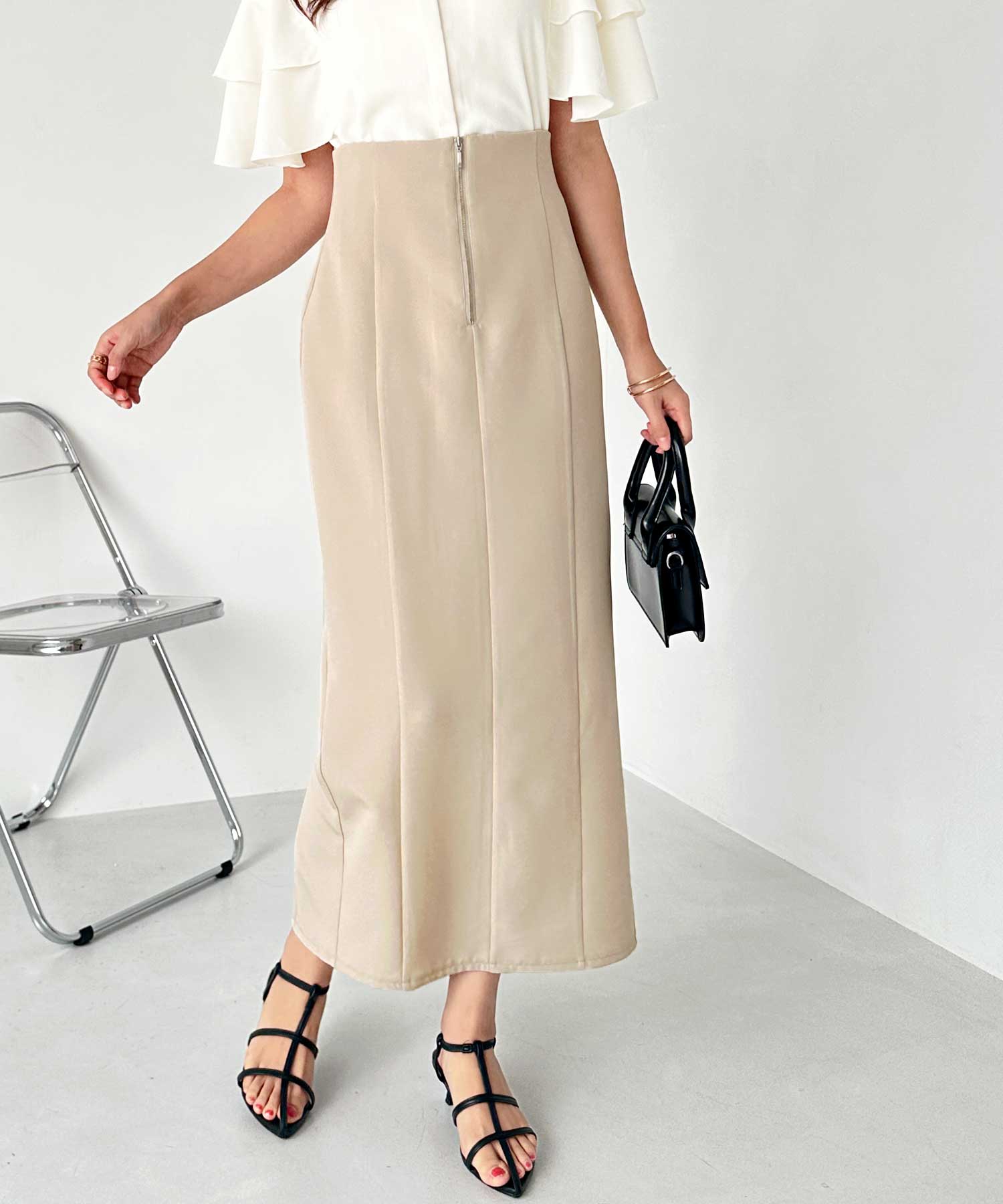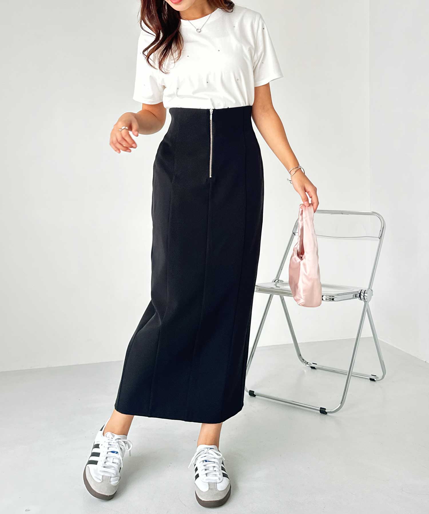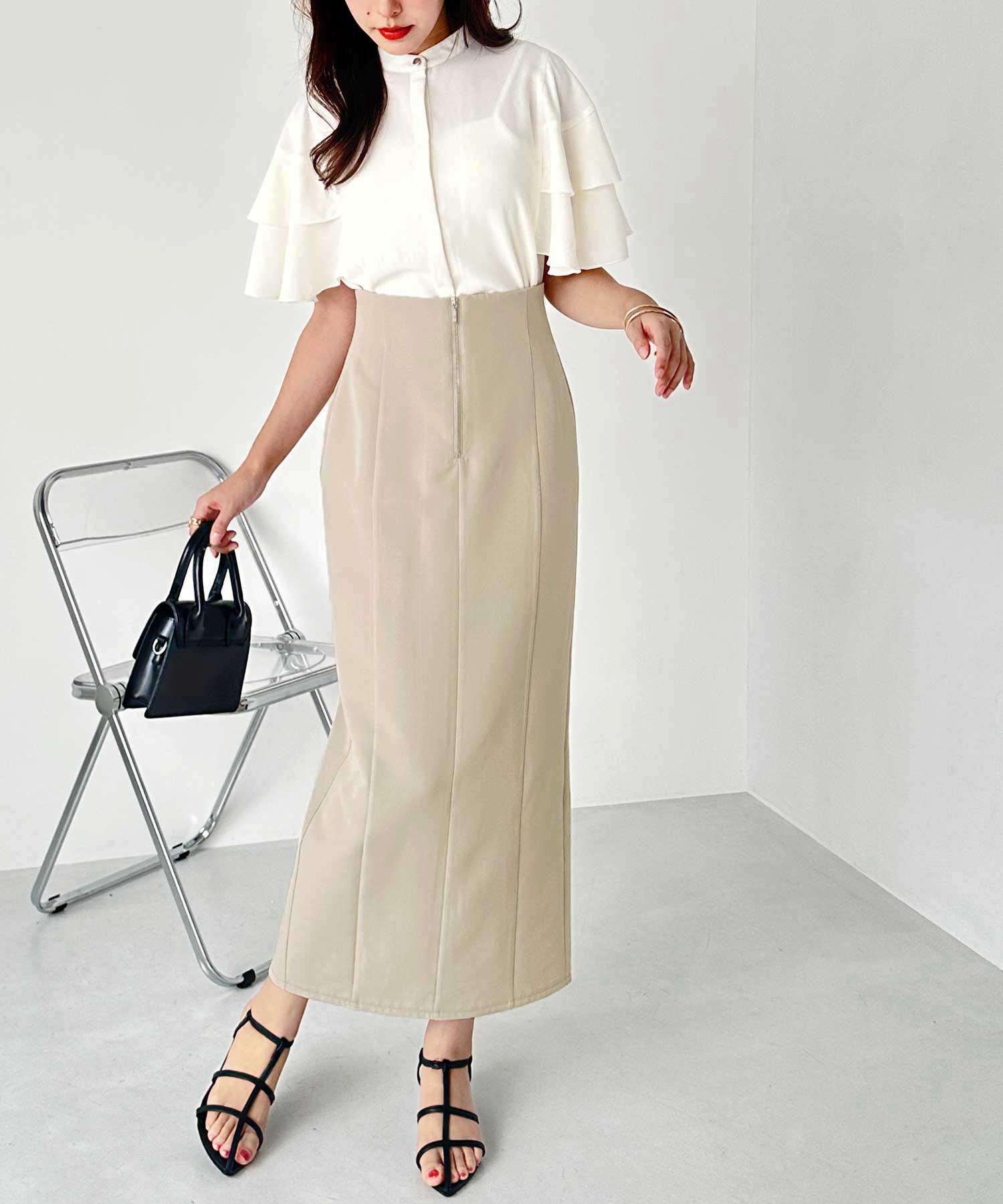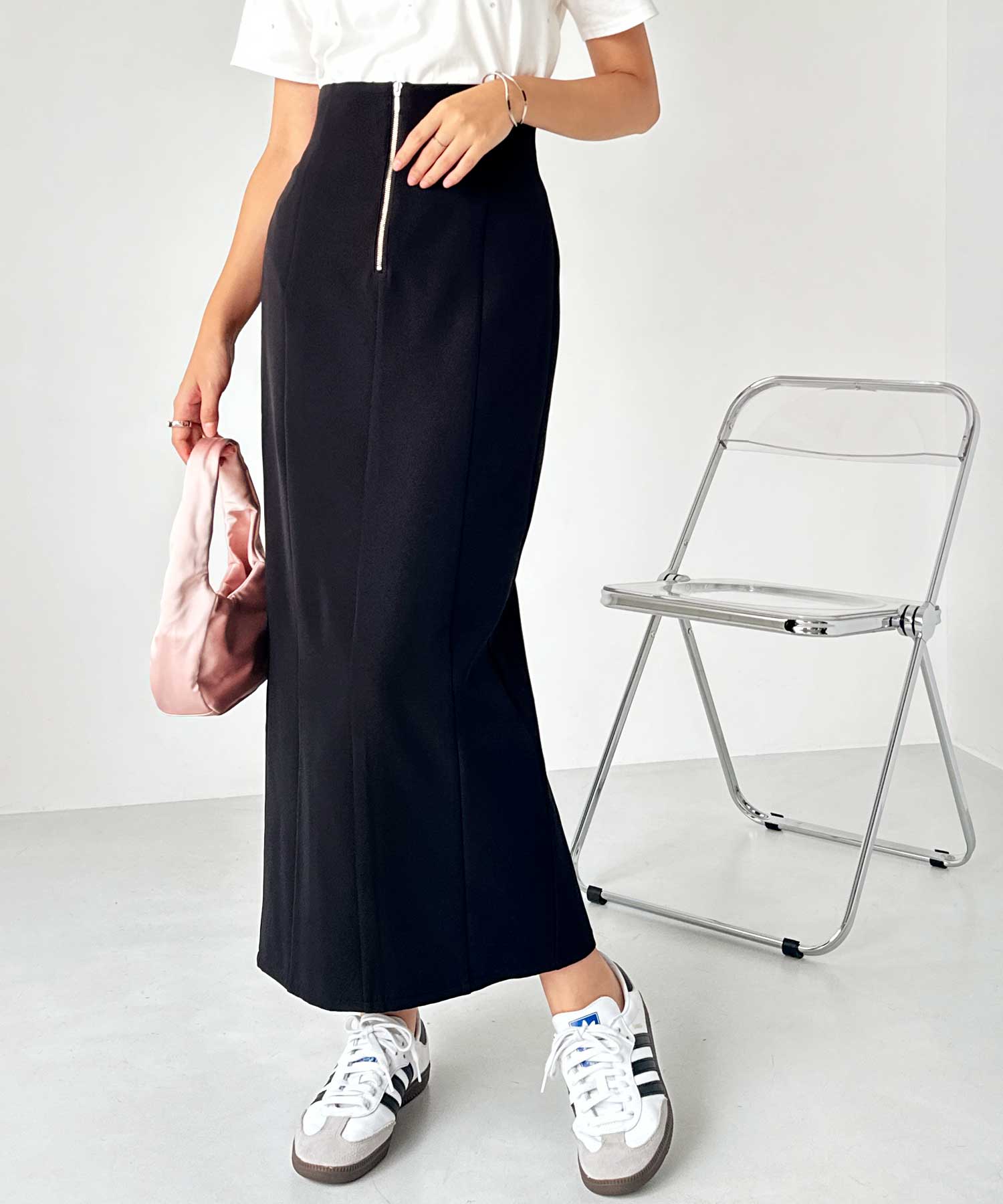 フロントジップ×切替デザインが縦ラインを強調するペンシルスカート。