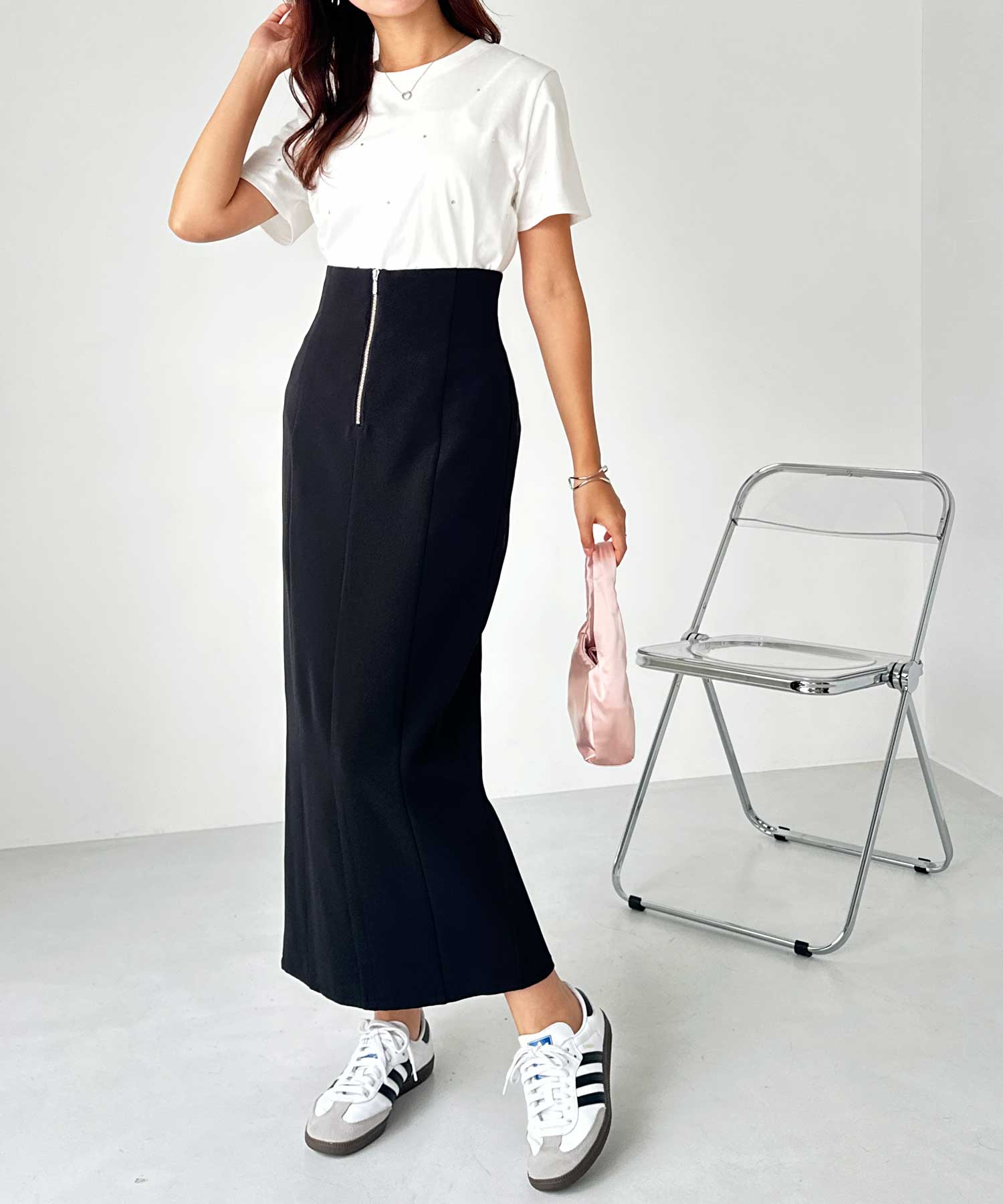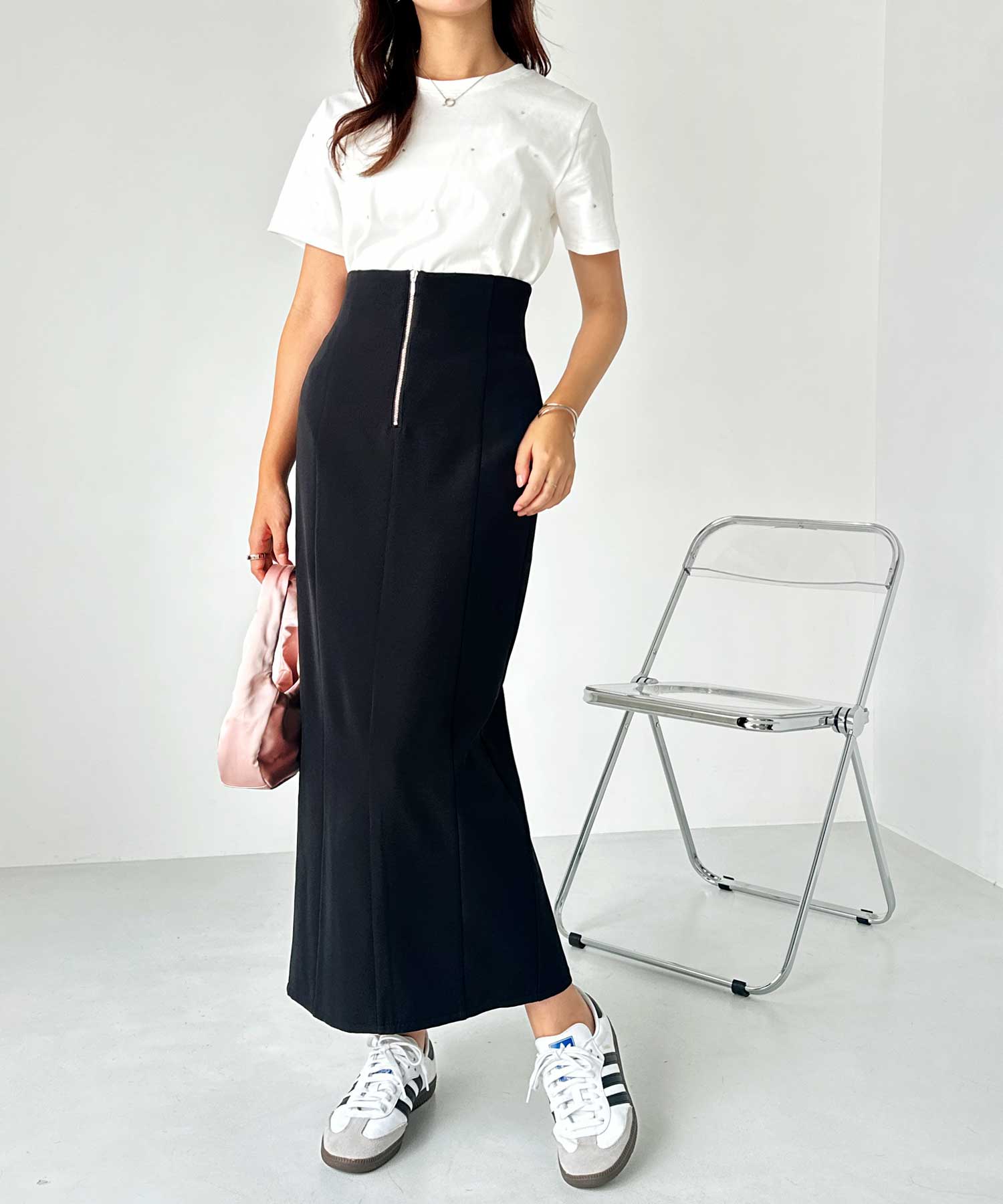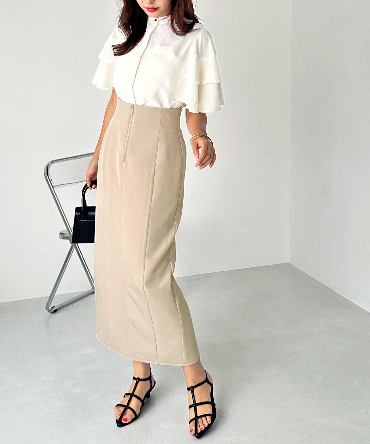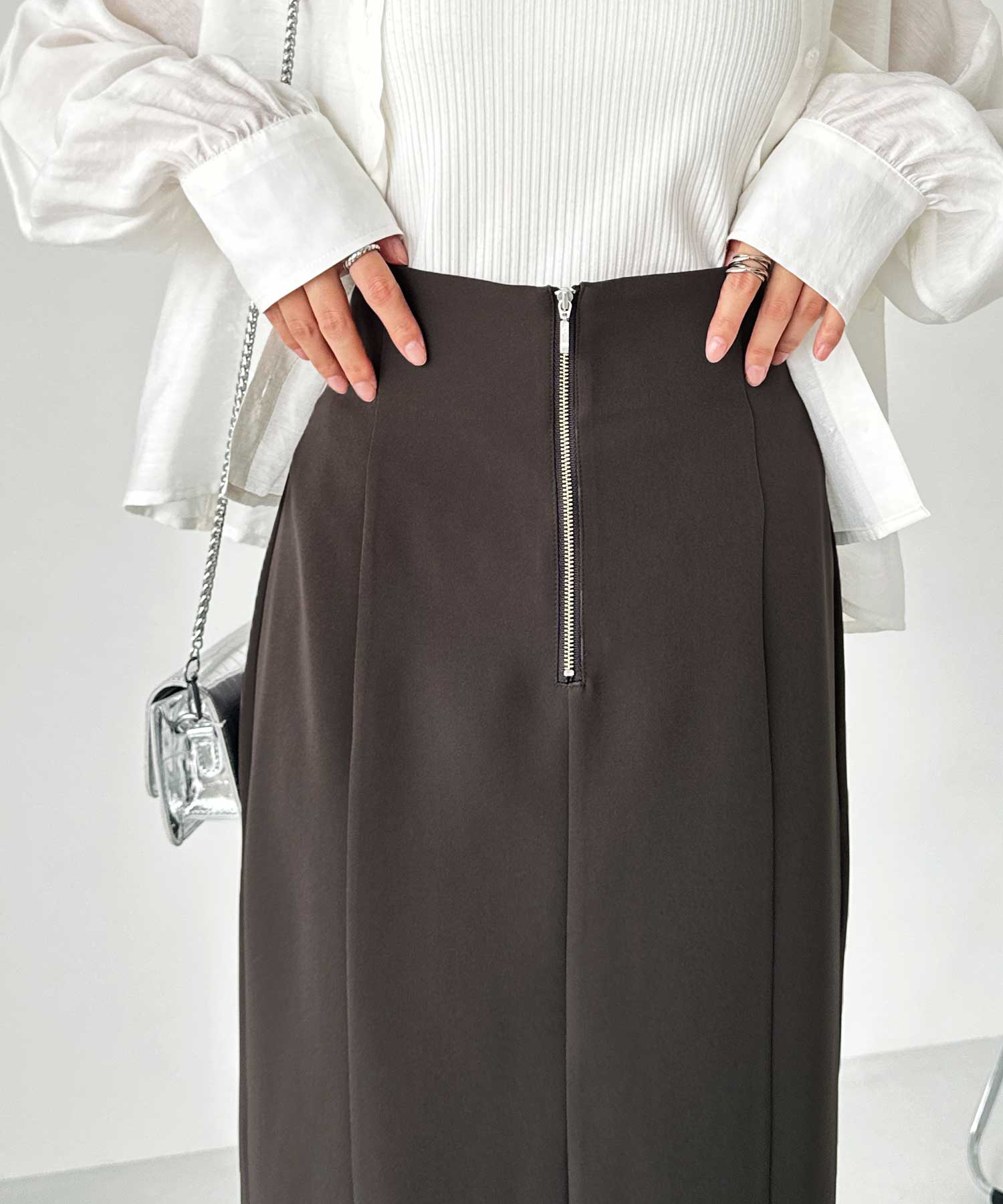 フロントジップ×切替デザインが縦ラインを強調するペンシルスカート。