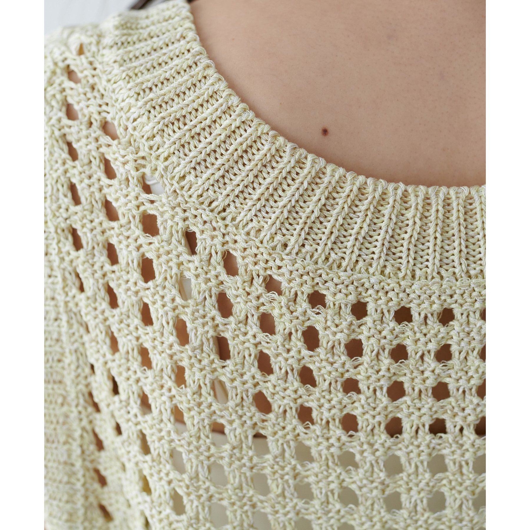 透かし編みなので重たくならず、涼しげな印象に。カップ付きキャミやタンクと合わせると、すっきり着られておすすめです!