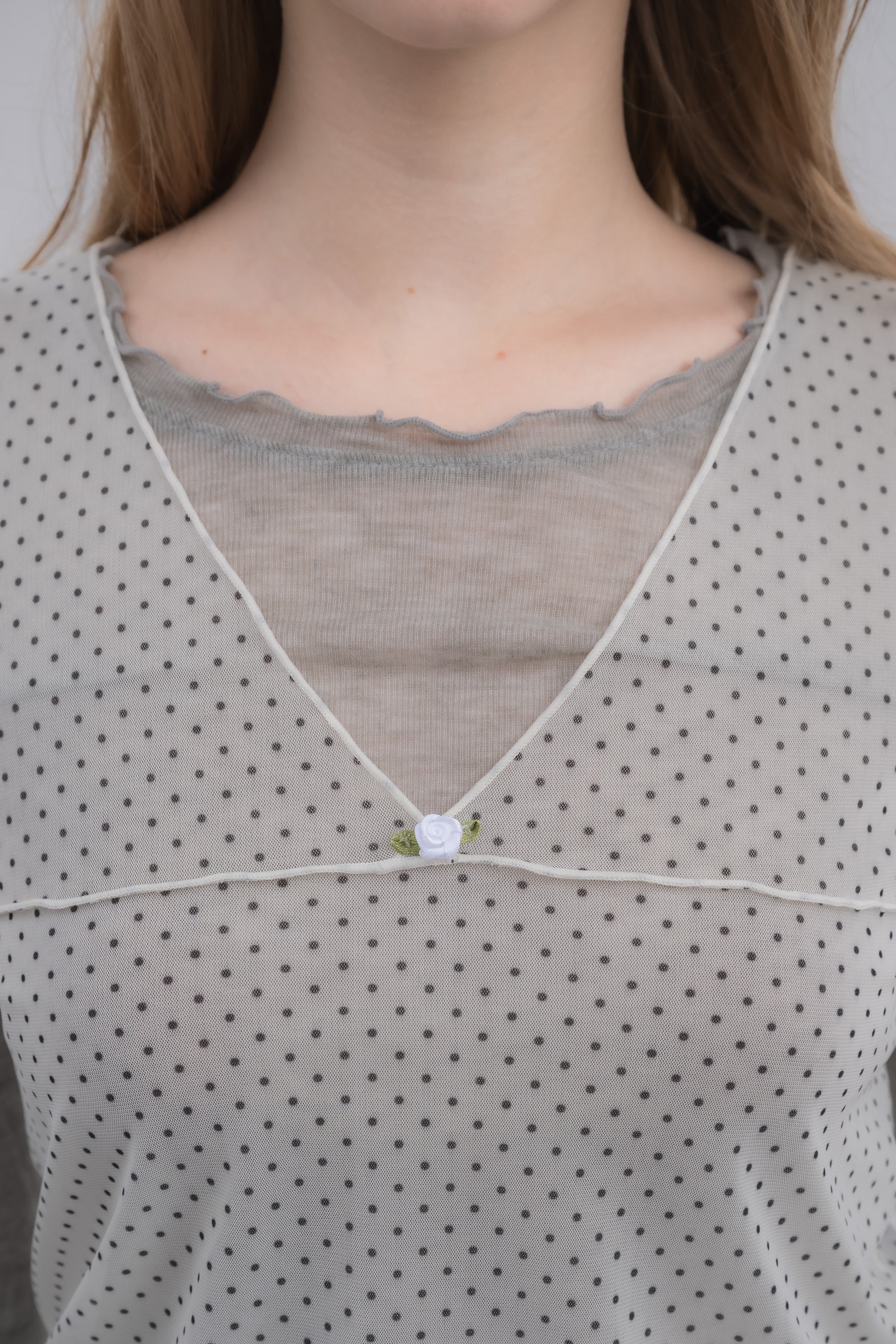 デコルテをきれいに見せるVネックに、胸元にはバラモチーフをあしらってアクセントに。