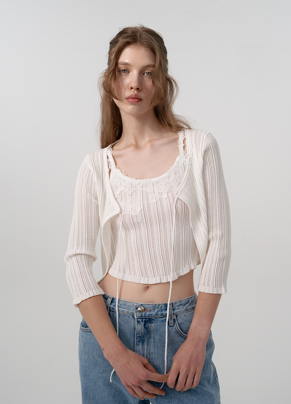ラウンドネックそしてタイでロック演出可能なカーディガンタイプ