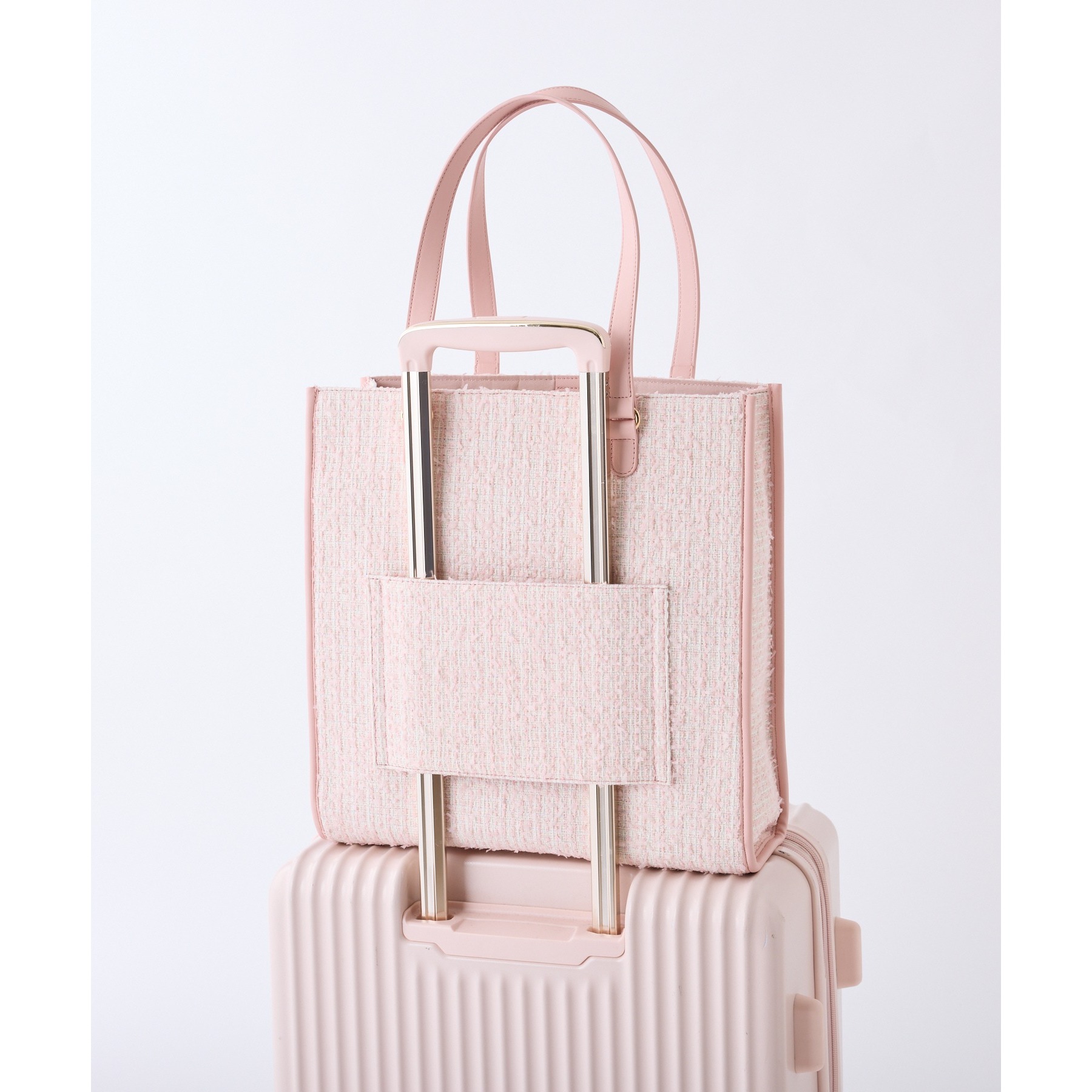 背面部分がキャリーケースのハンドルに通せる仕様になっており、一緒に持ち運べる便利なデザインです。