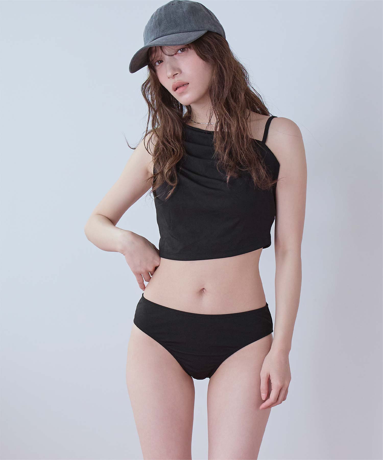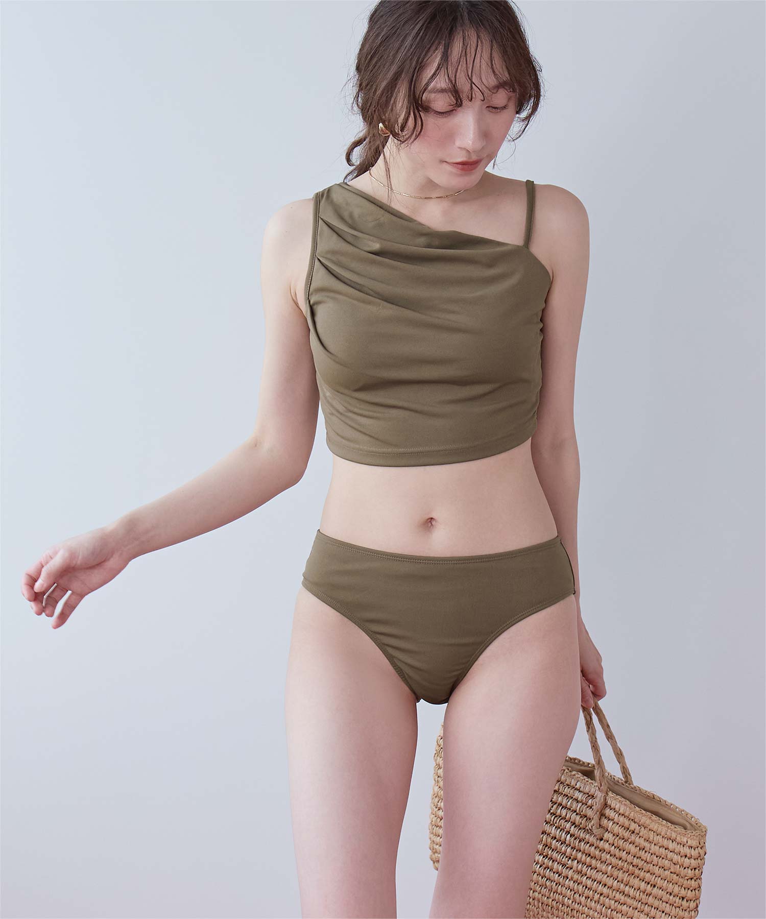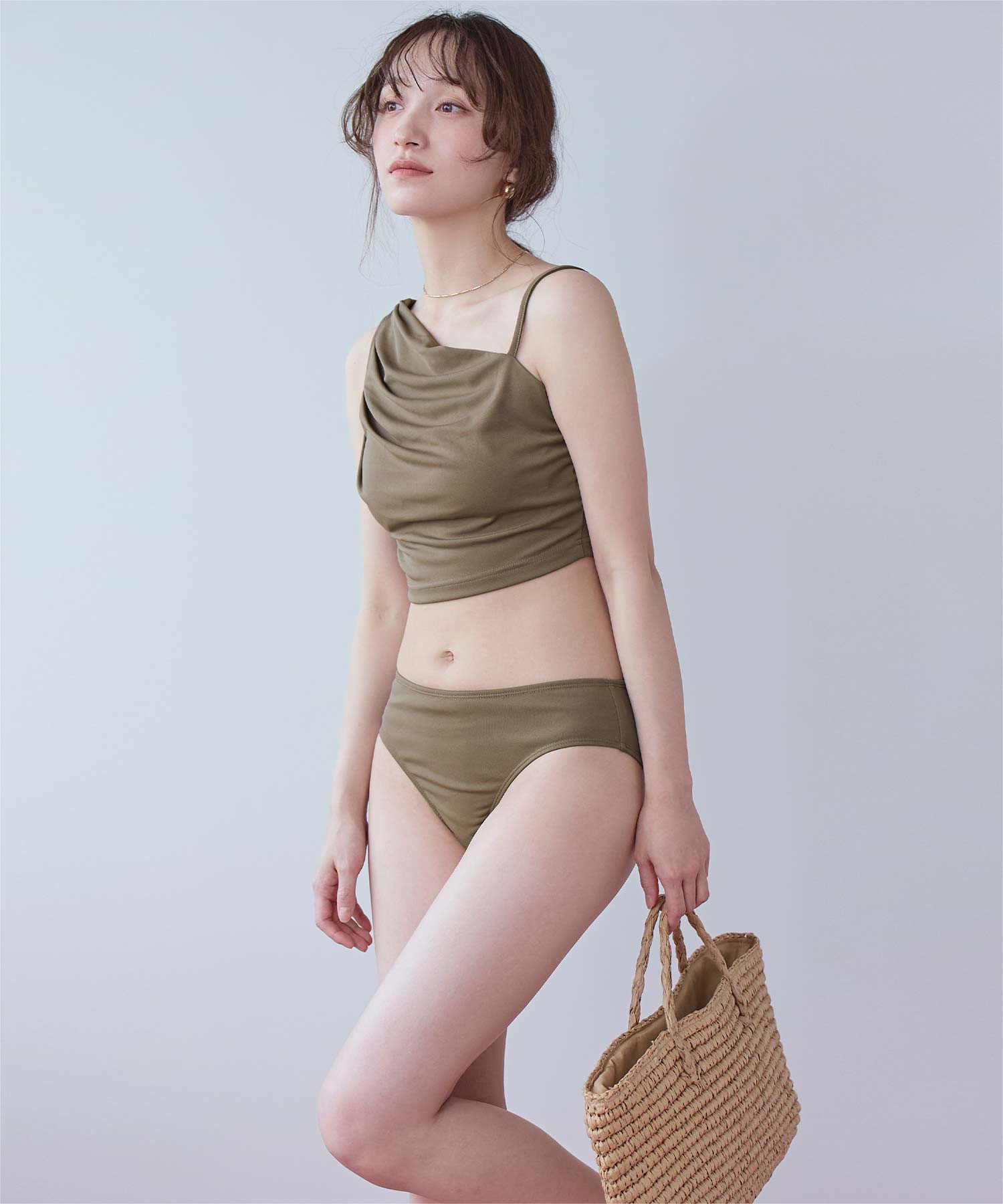 ・タックデザインが魅力的、スタイリッシュで大人な装いのセット水着。