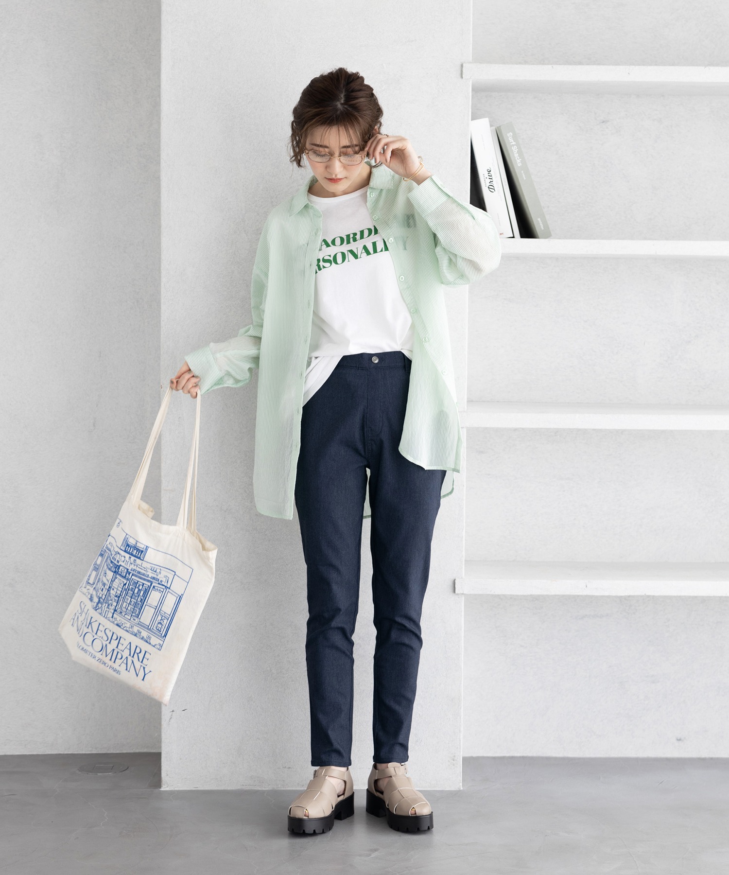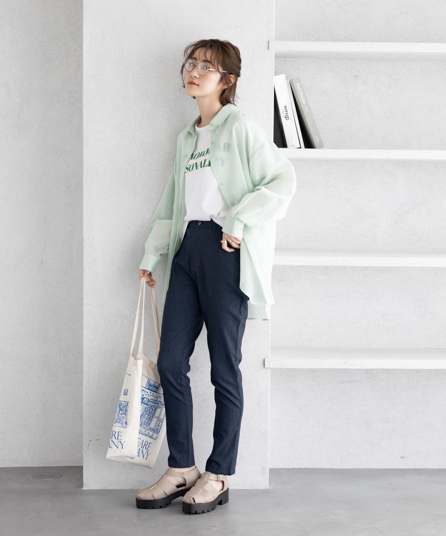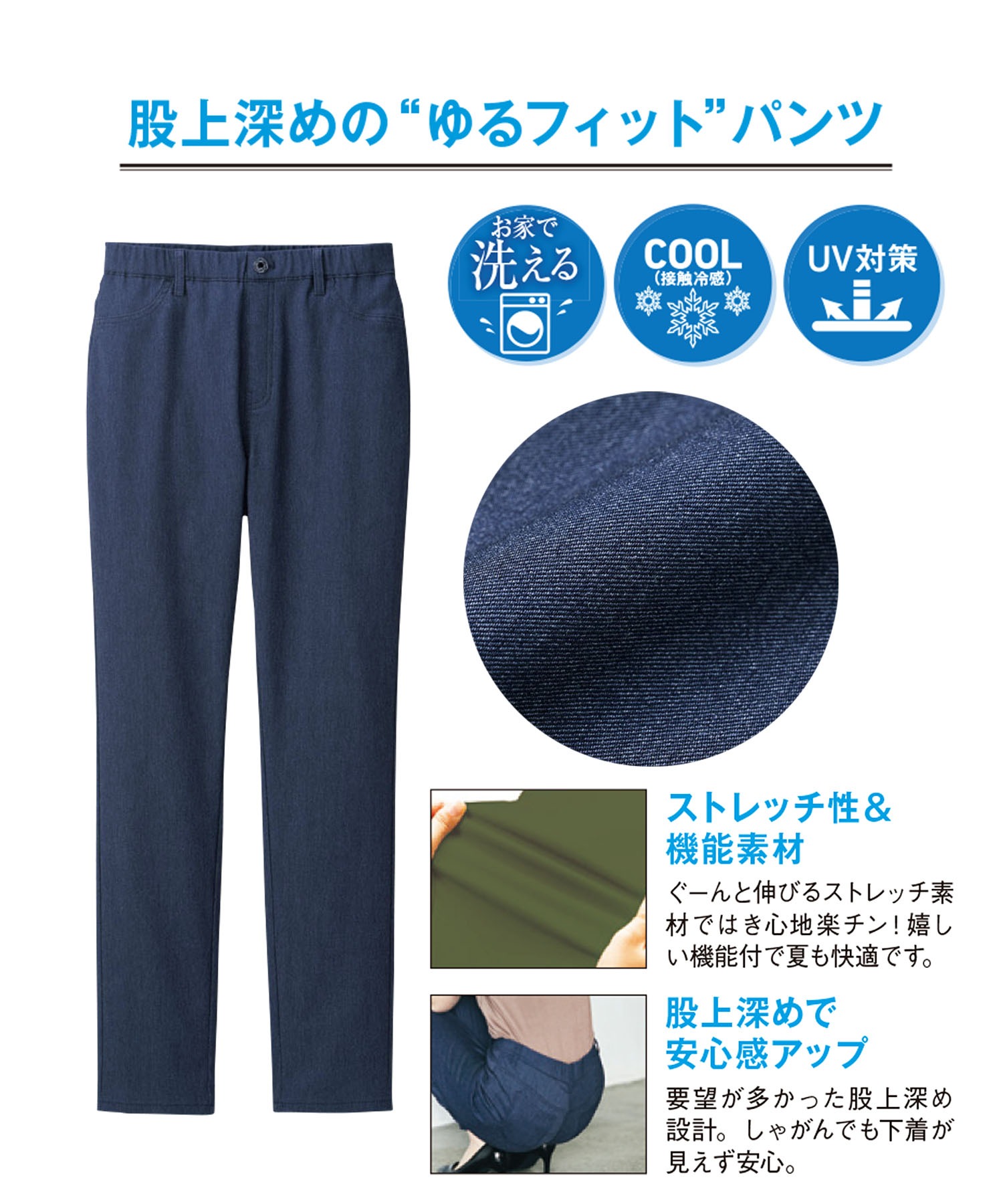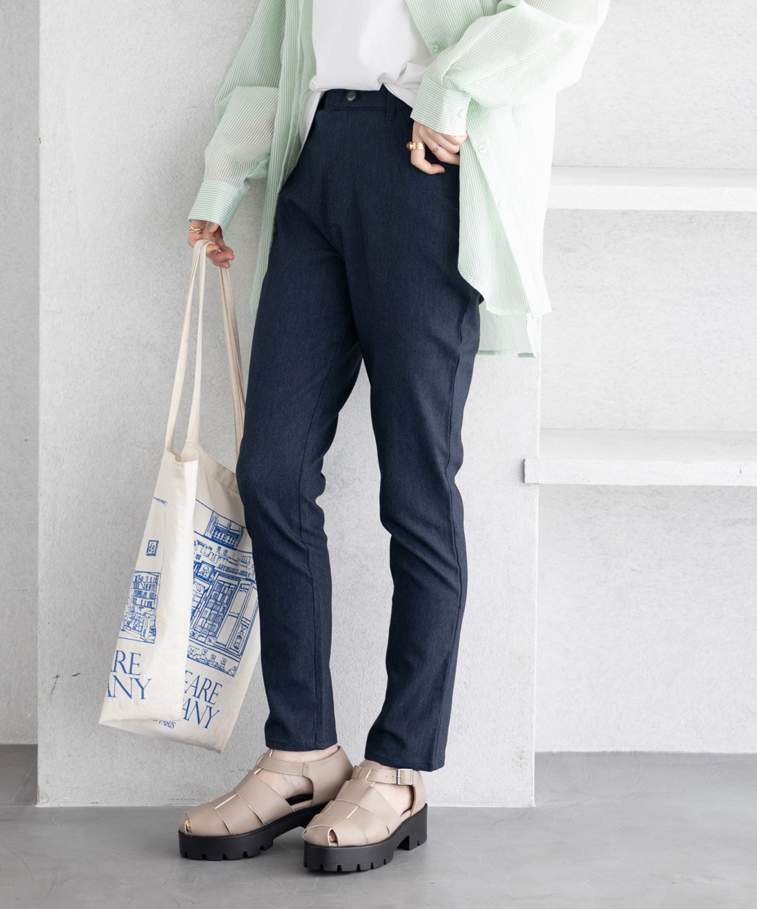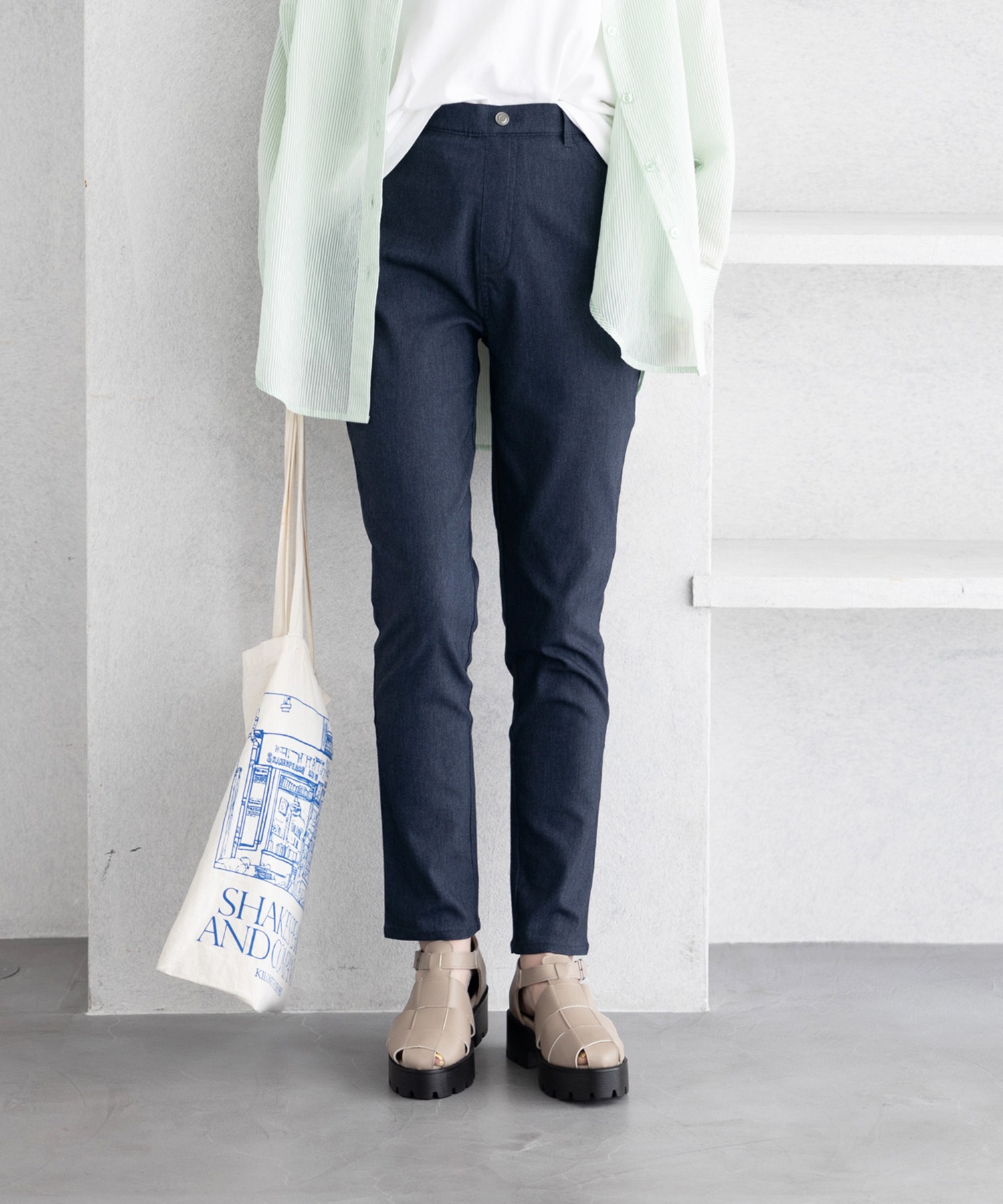 (デニム調ネイビー)ポリエステル48%、レーヨン28%、ナイロン21%、ポリウレタン3%