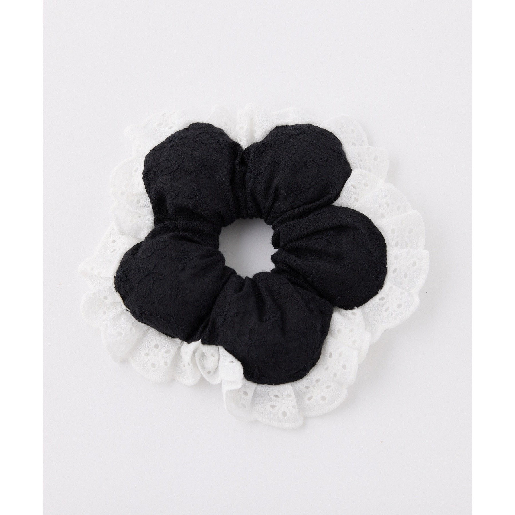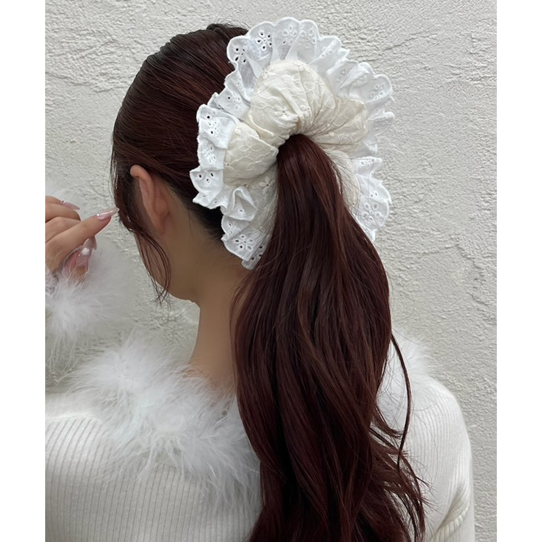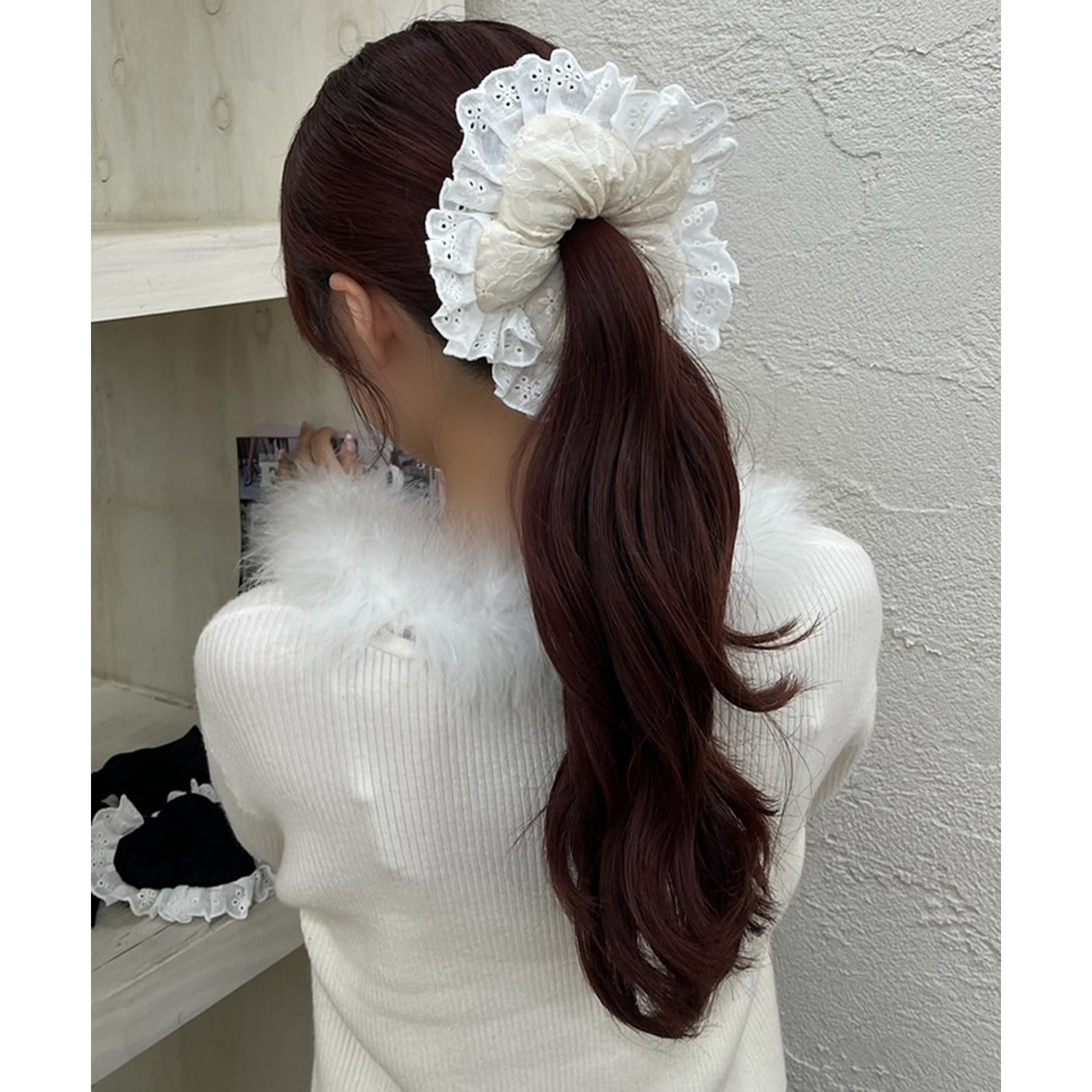 バックスタイルを華やかに彩るフラワー型のファーシュシュ。