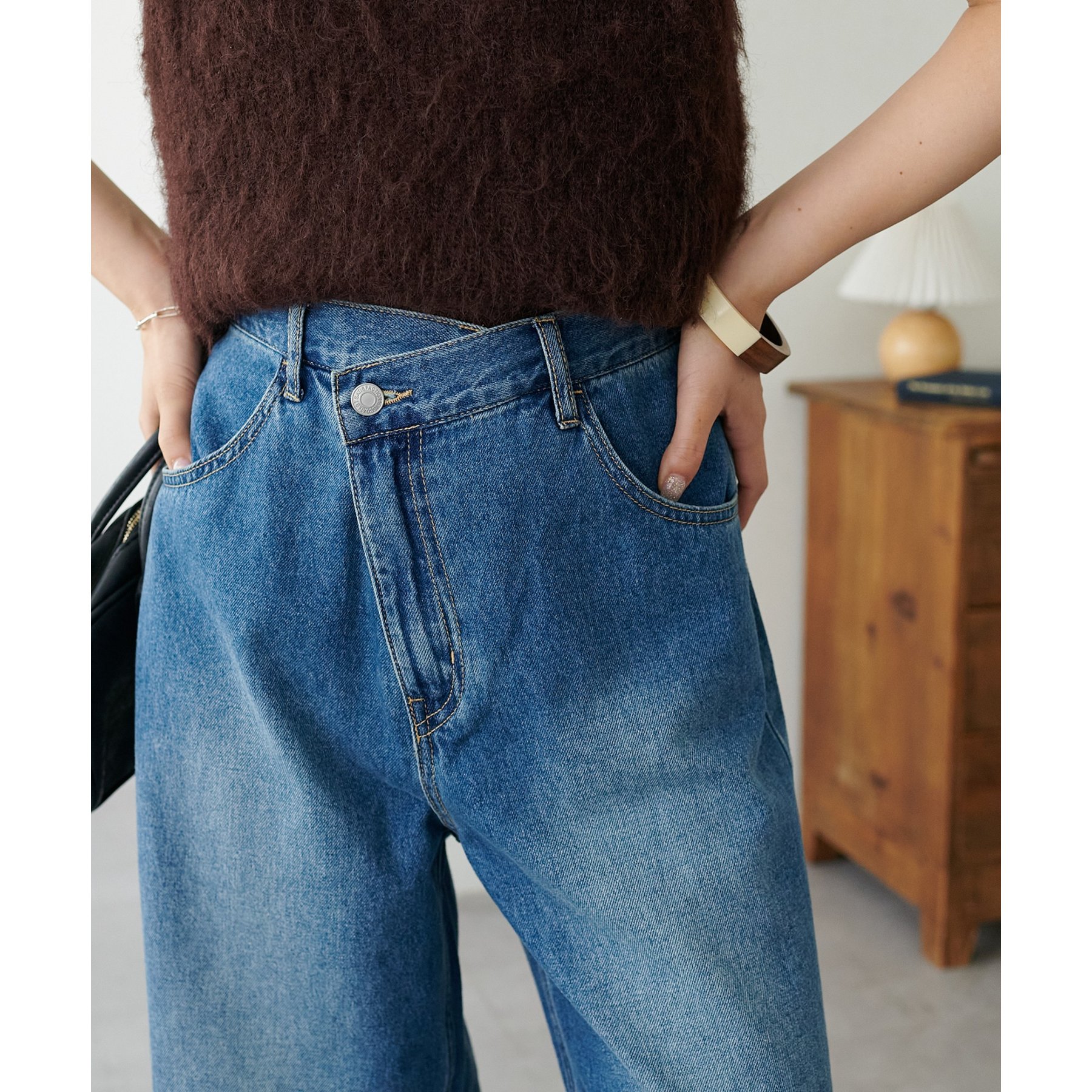 162cmスタッフ(Mサイズ着用):柔らかく薄めの素材なので、夏でも快適に着用していただけるデニムです。ウエストがクロスデザインになっているのもポイントで可愛い!