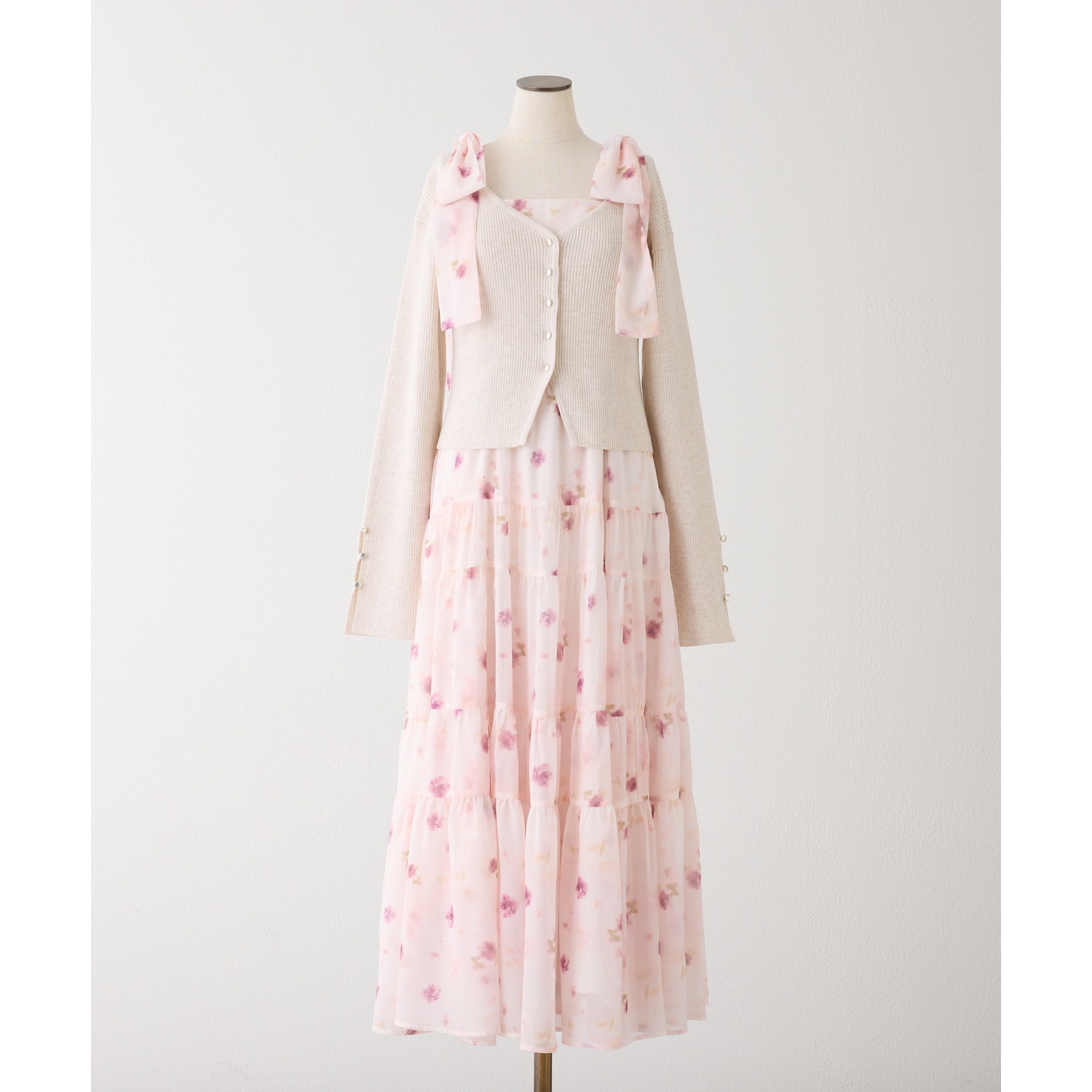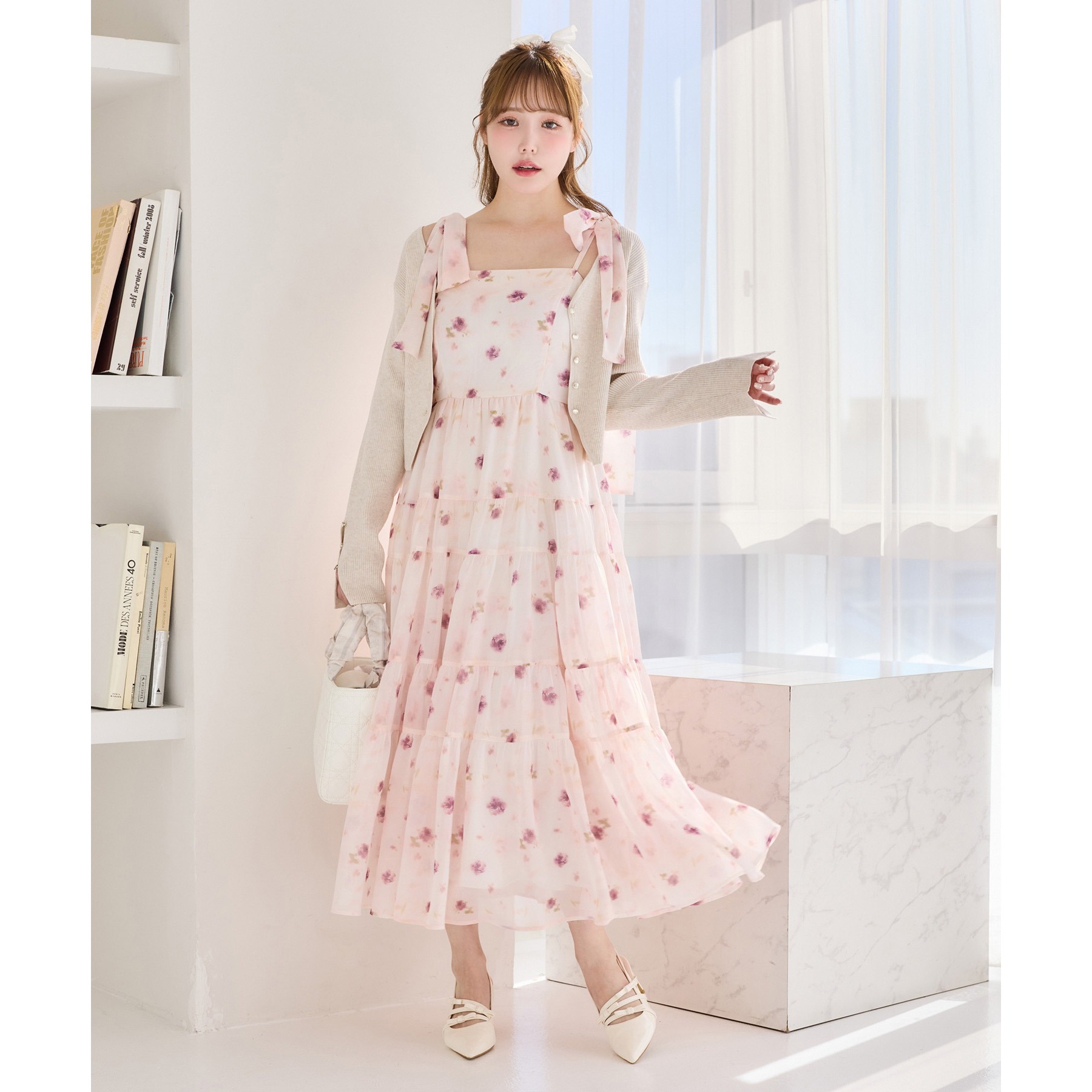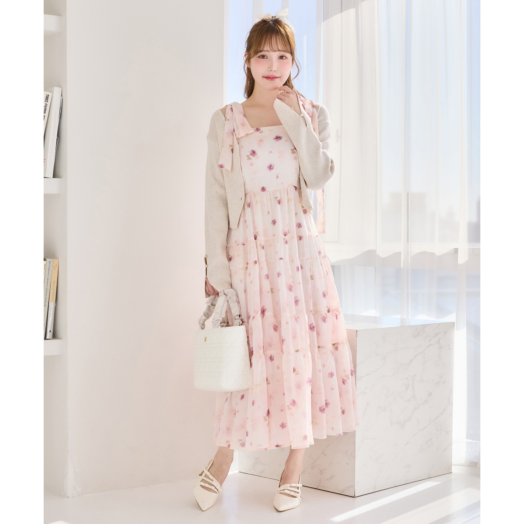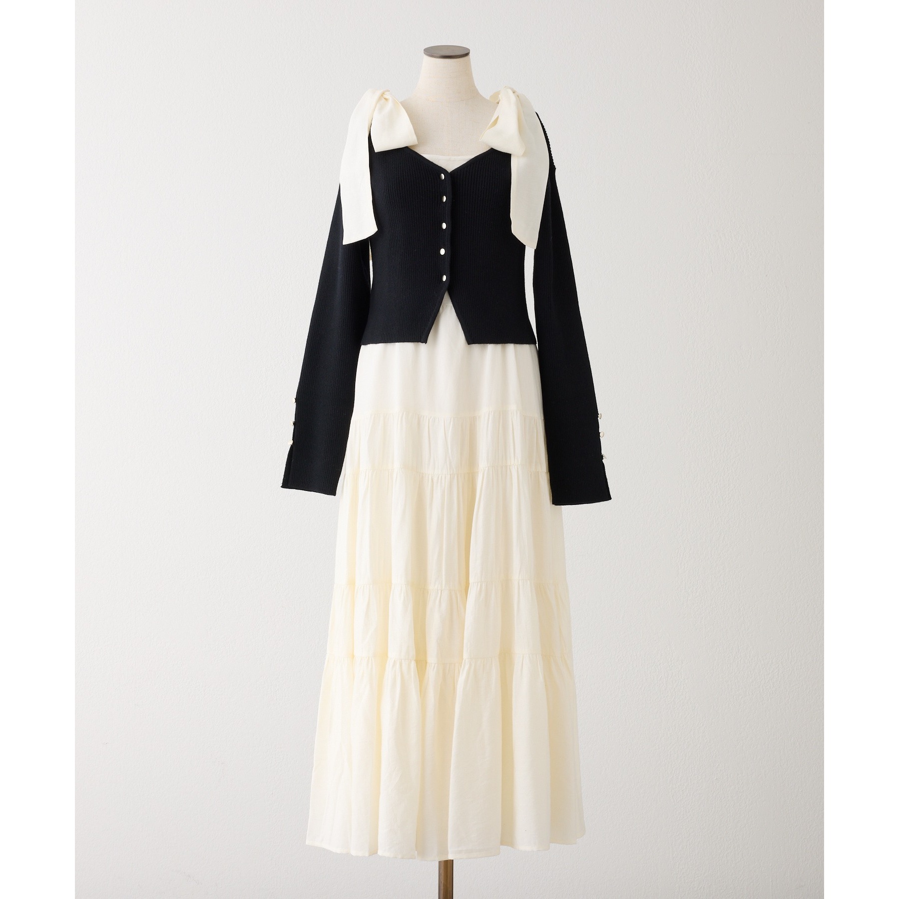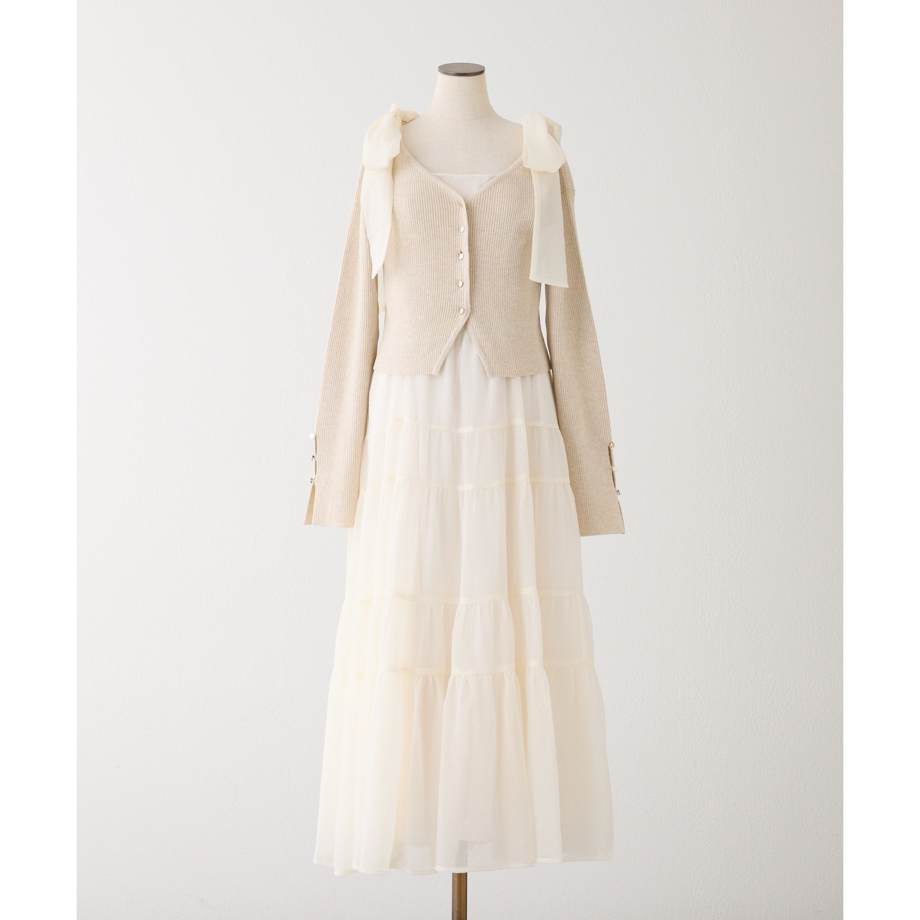 シルエットがきれいなティアードデザインになったキャミワンピースとカーディガンのセットアイテム。