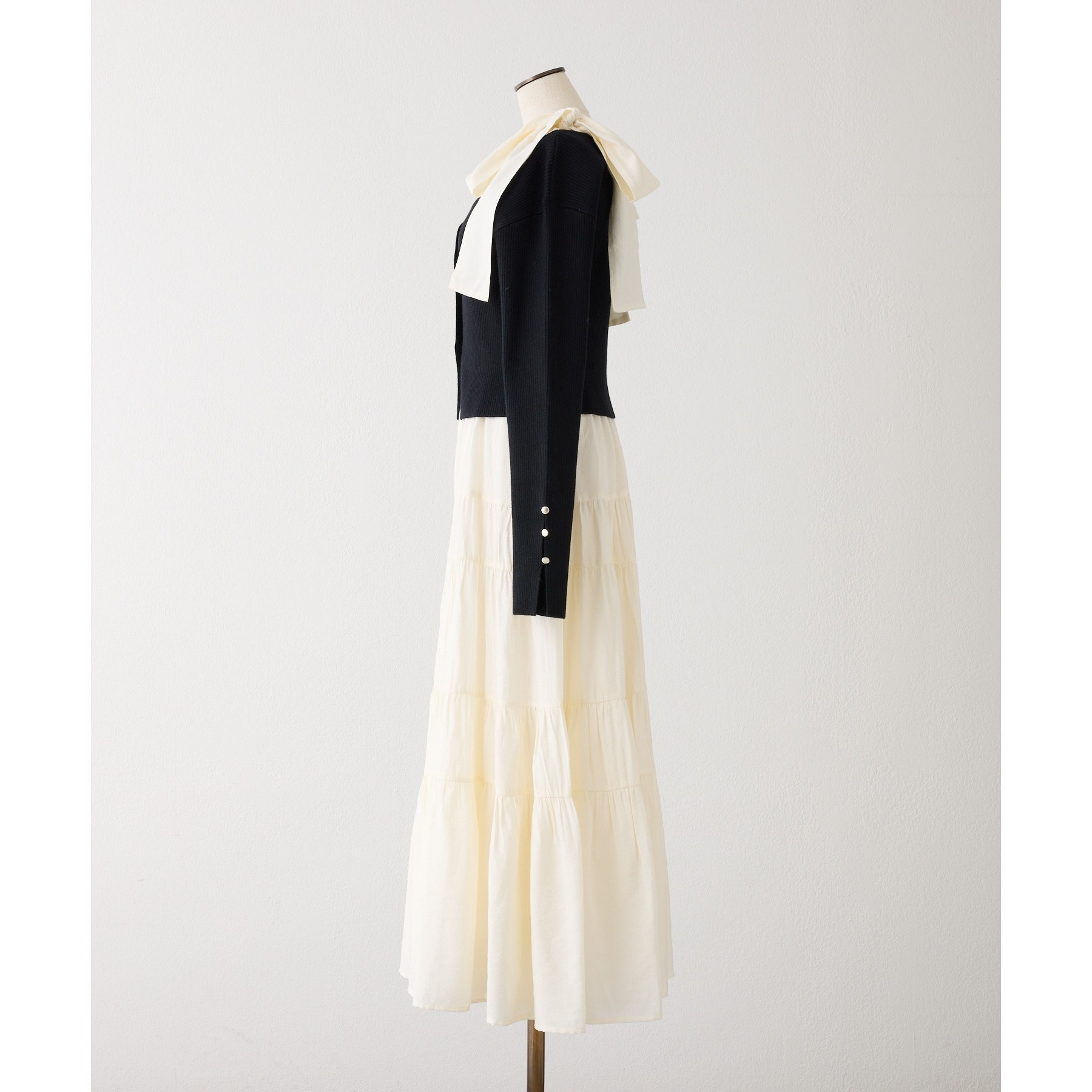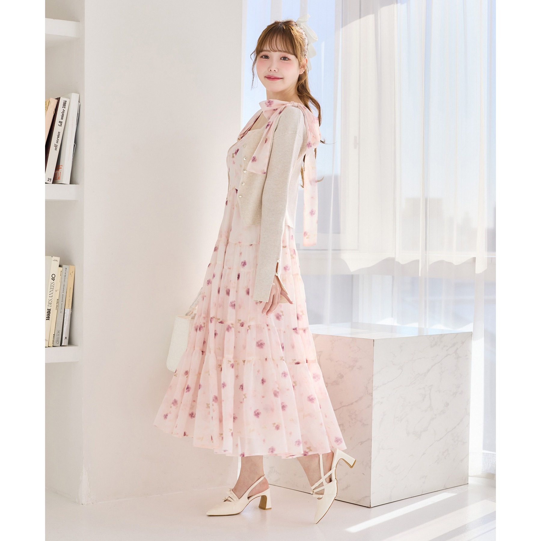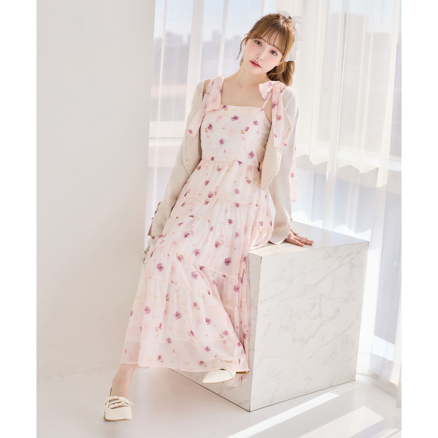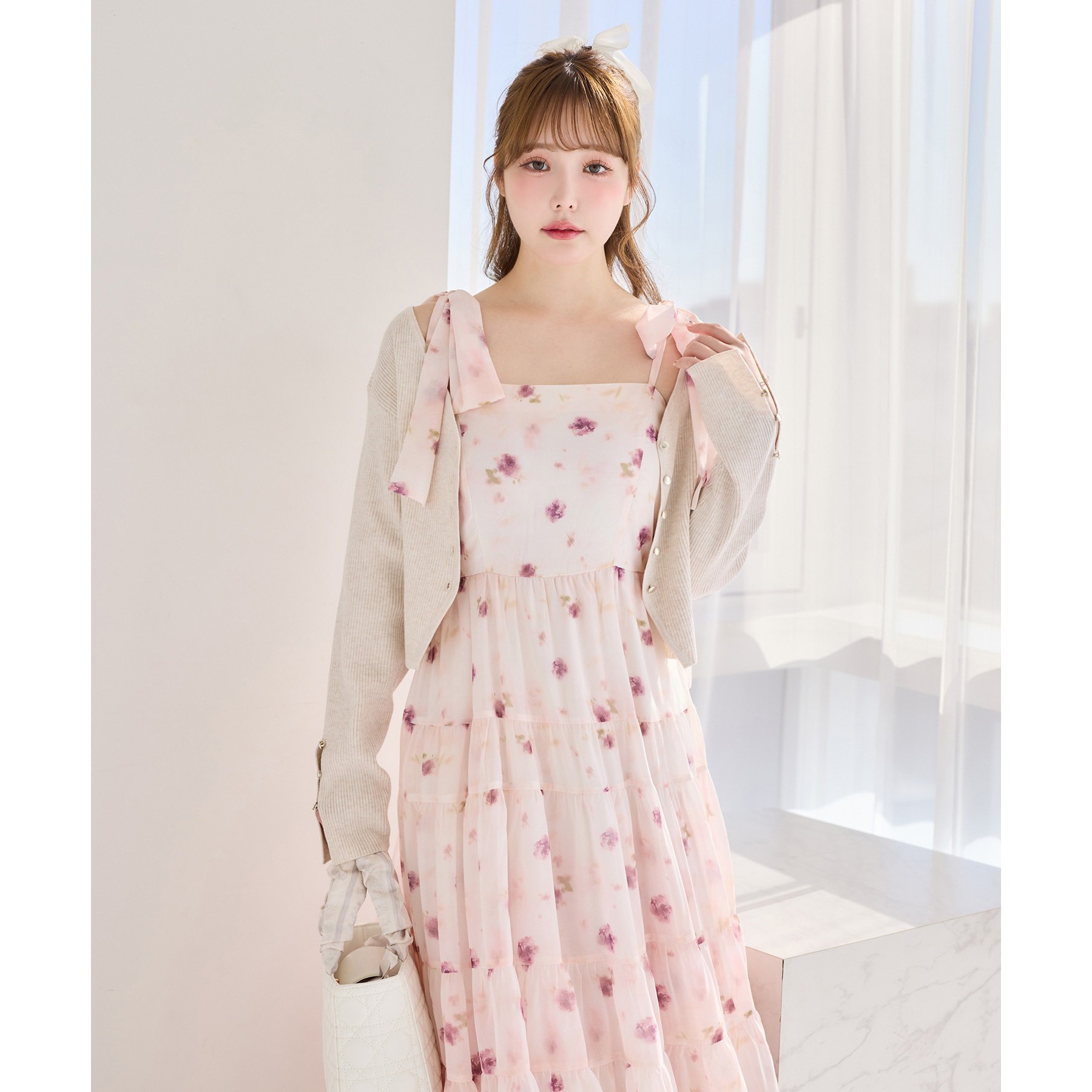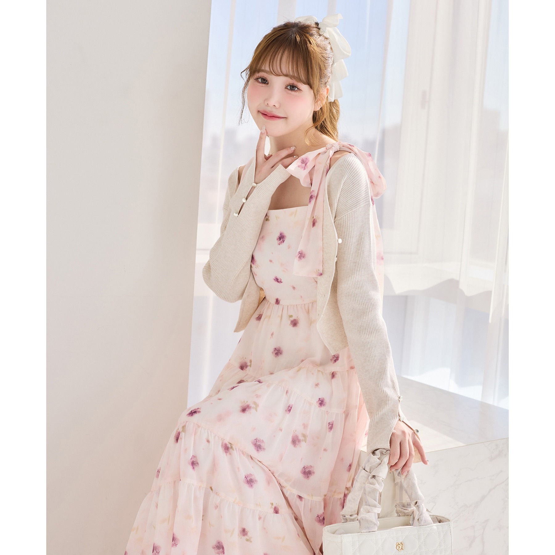 シルエットがきれいなティアードデザインになったキャミワンピースとカーディガンのセットアイテム。
