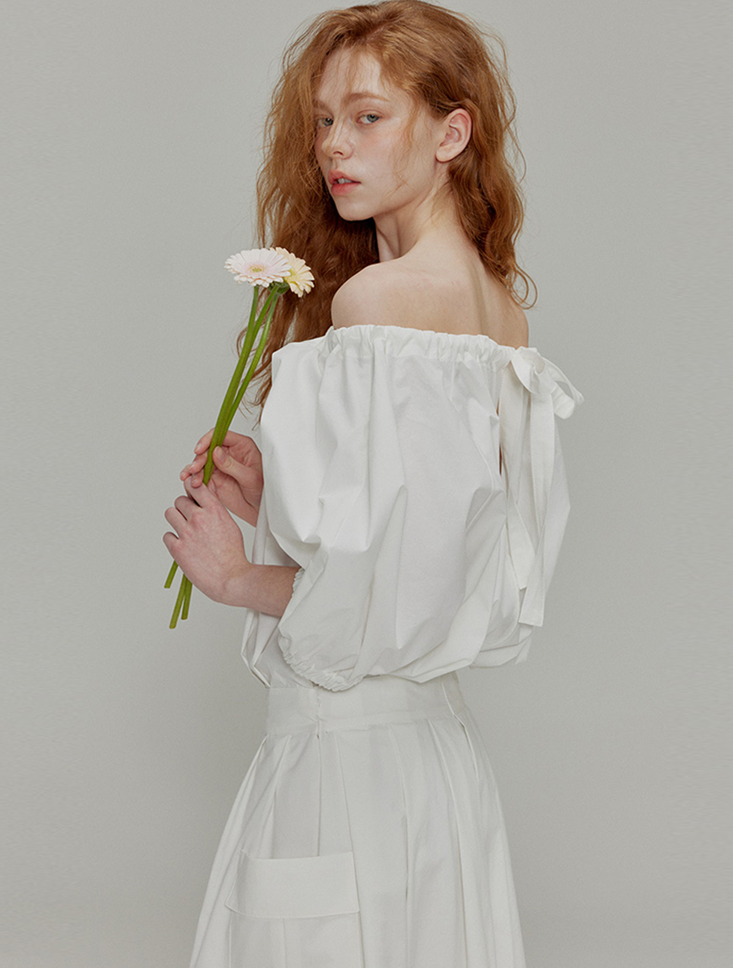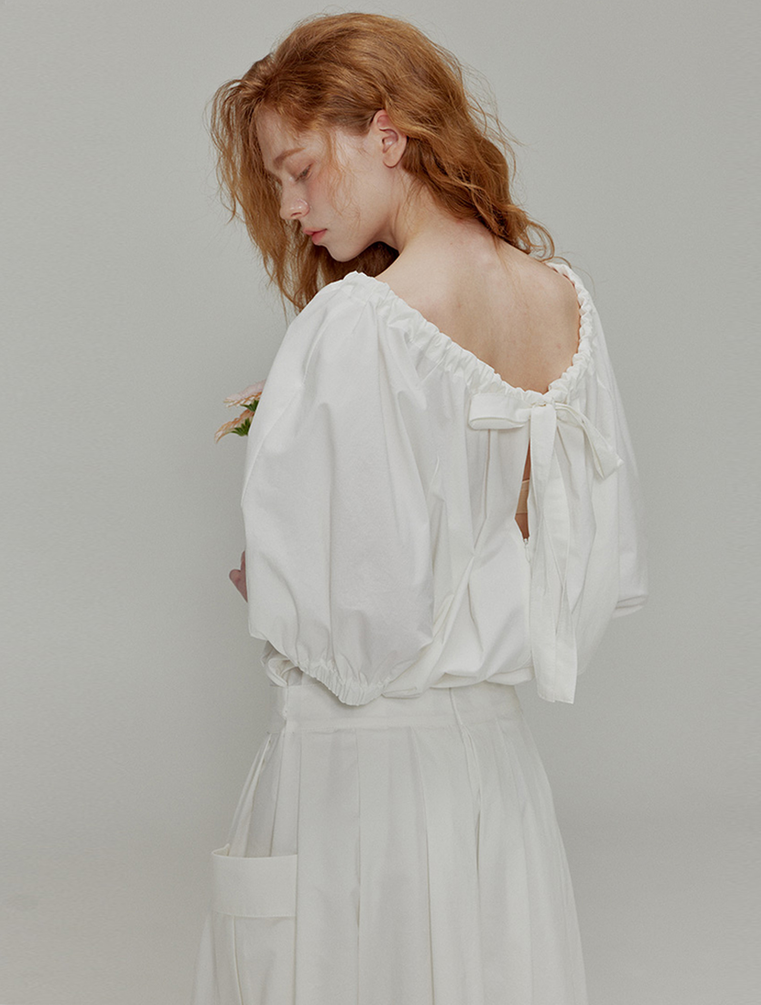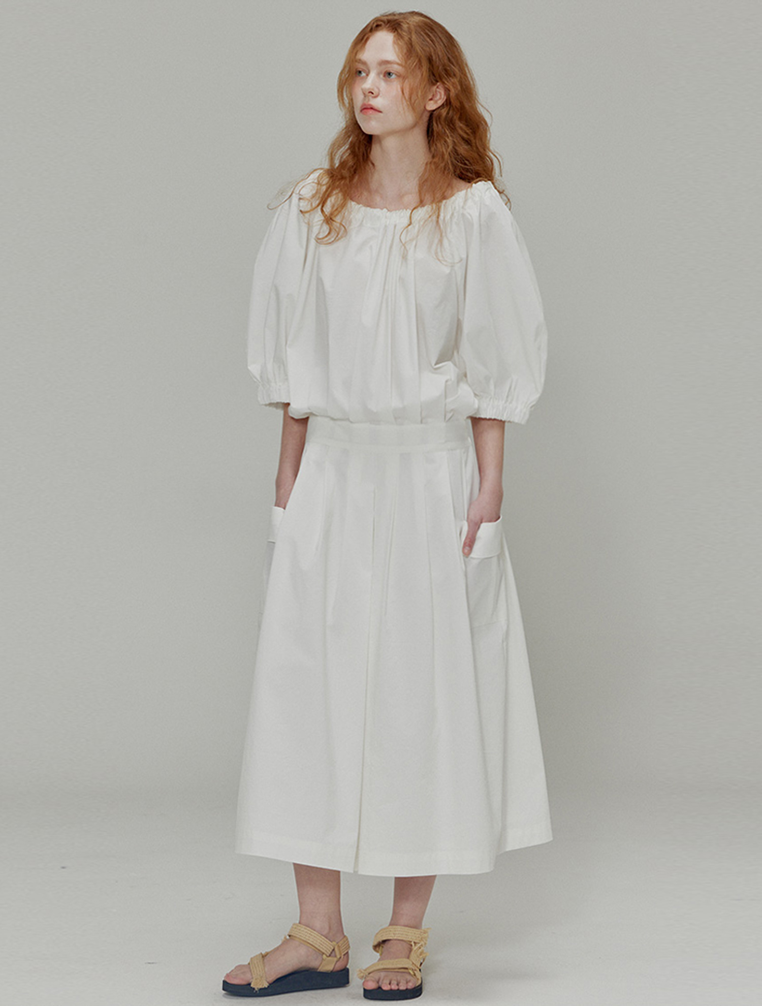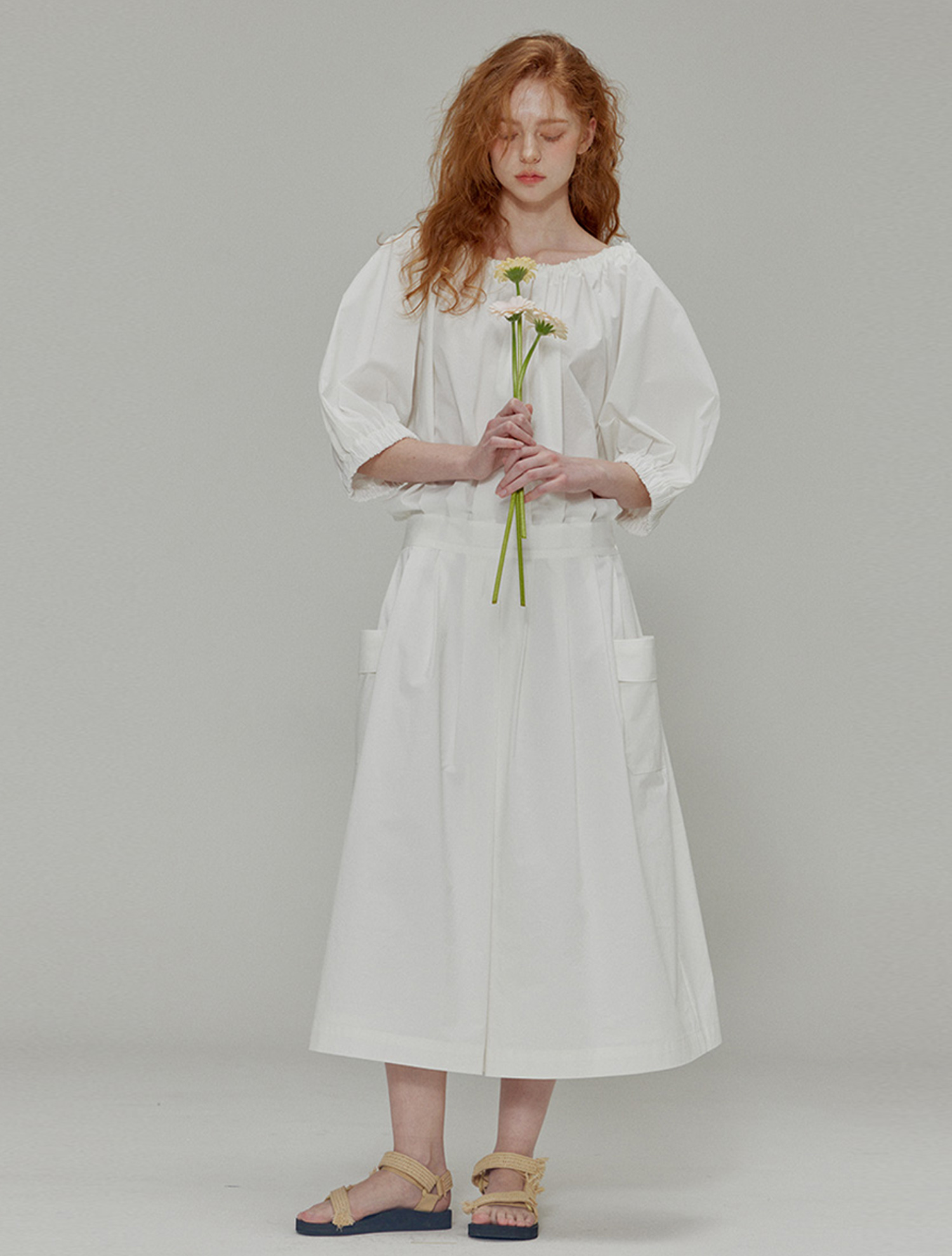 Balloon shirring pleated dress_White