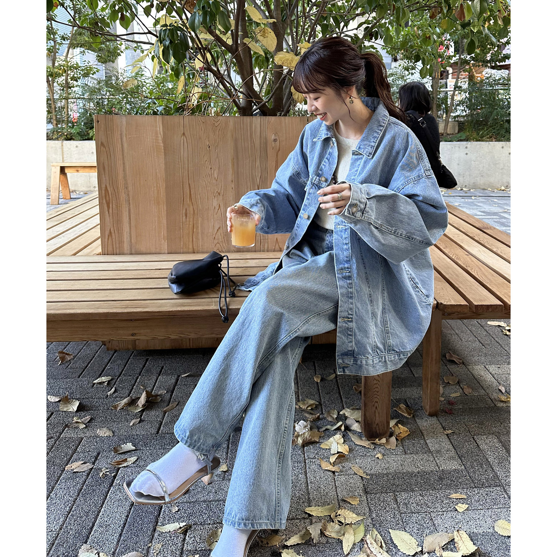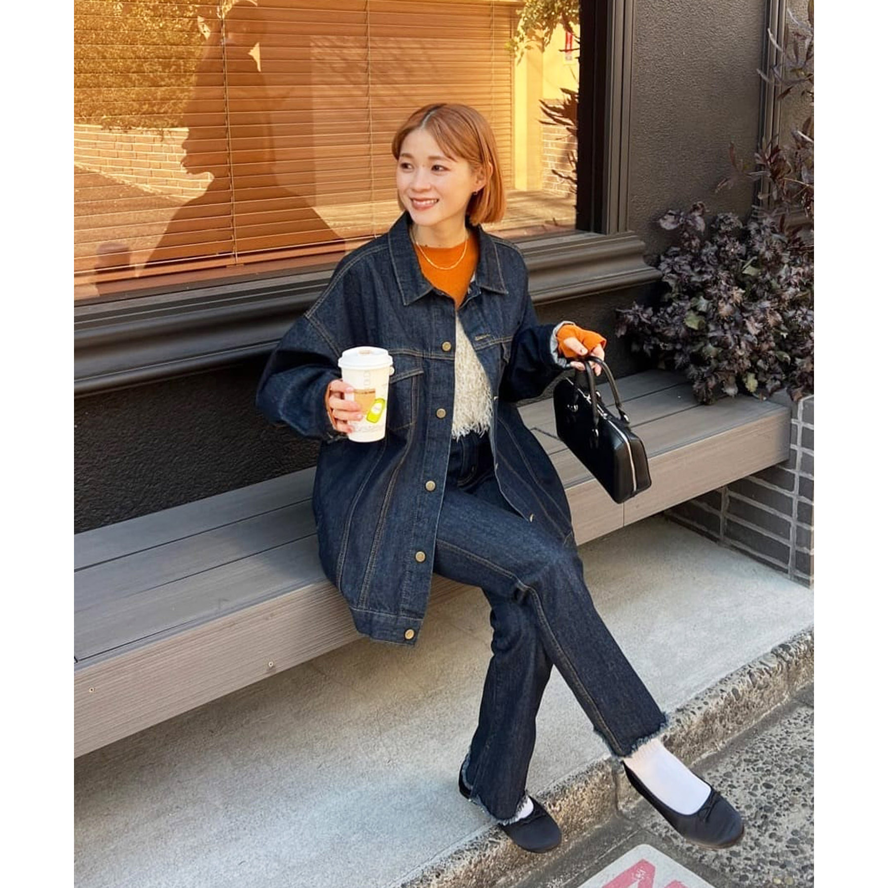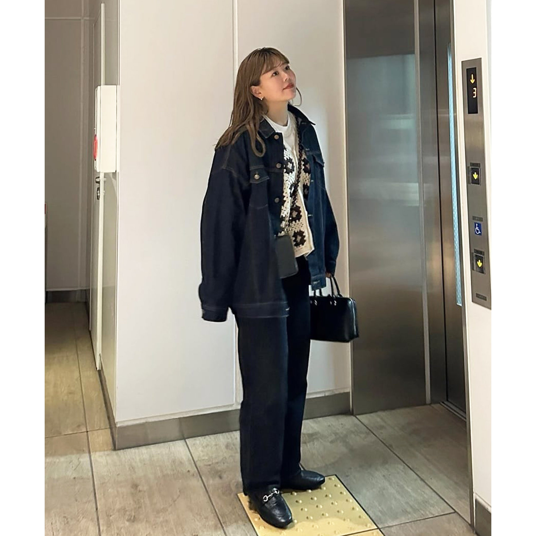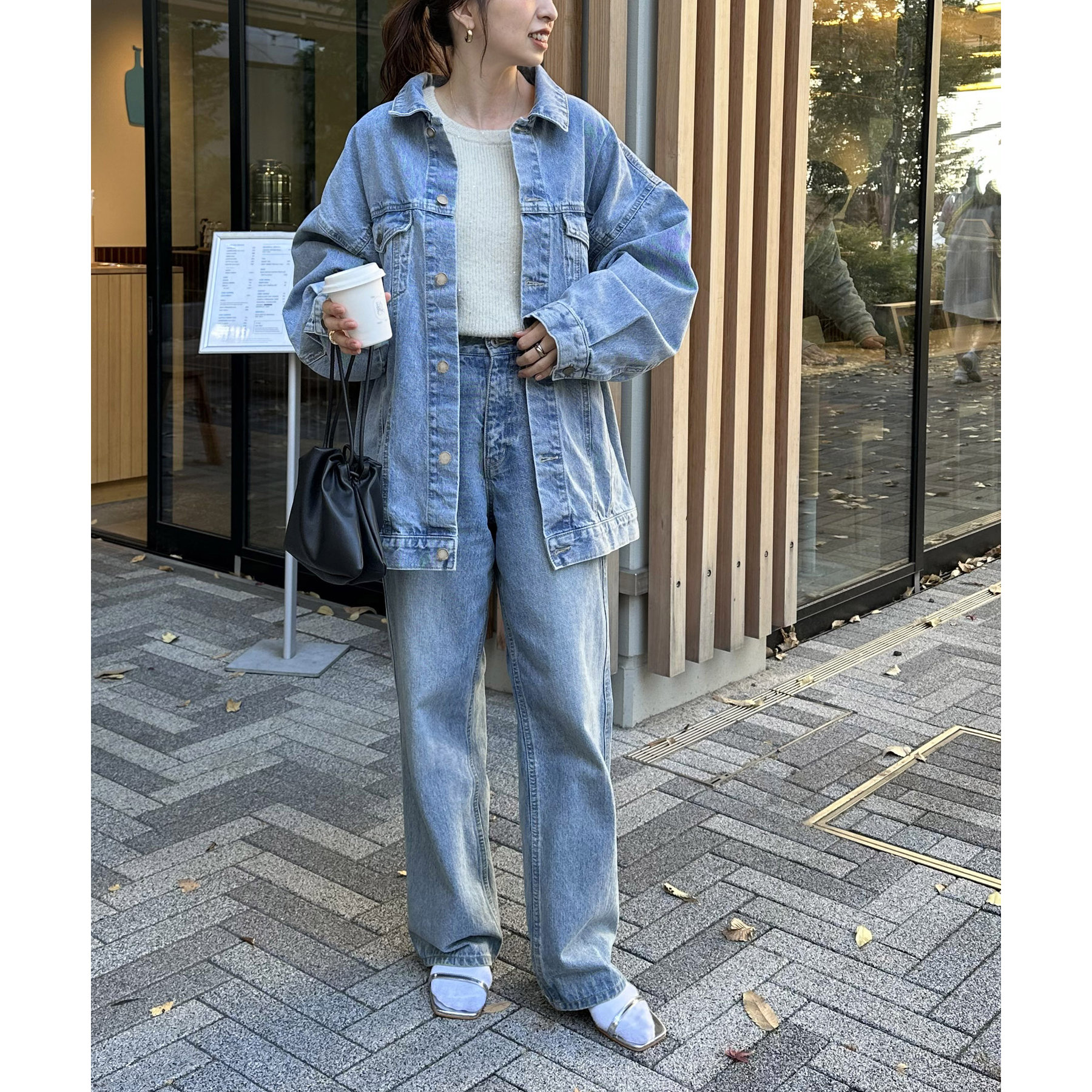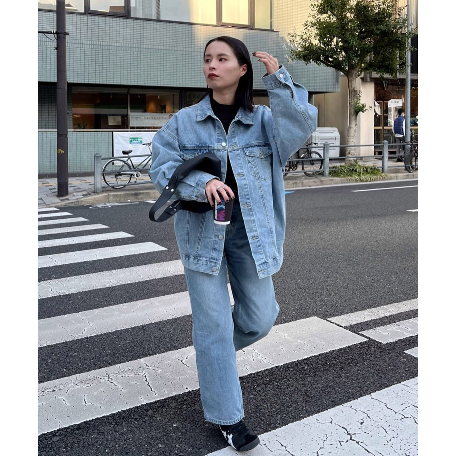 同色のデニムパンツを合わせたセットアップ風スタイルで上級者見えな着こなしも楽しめます。
