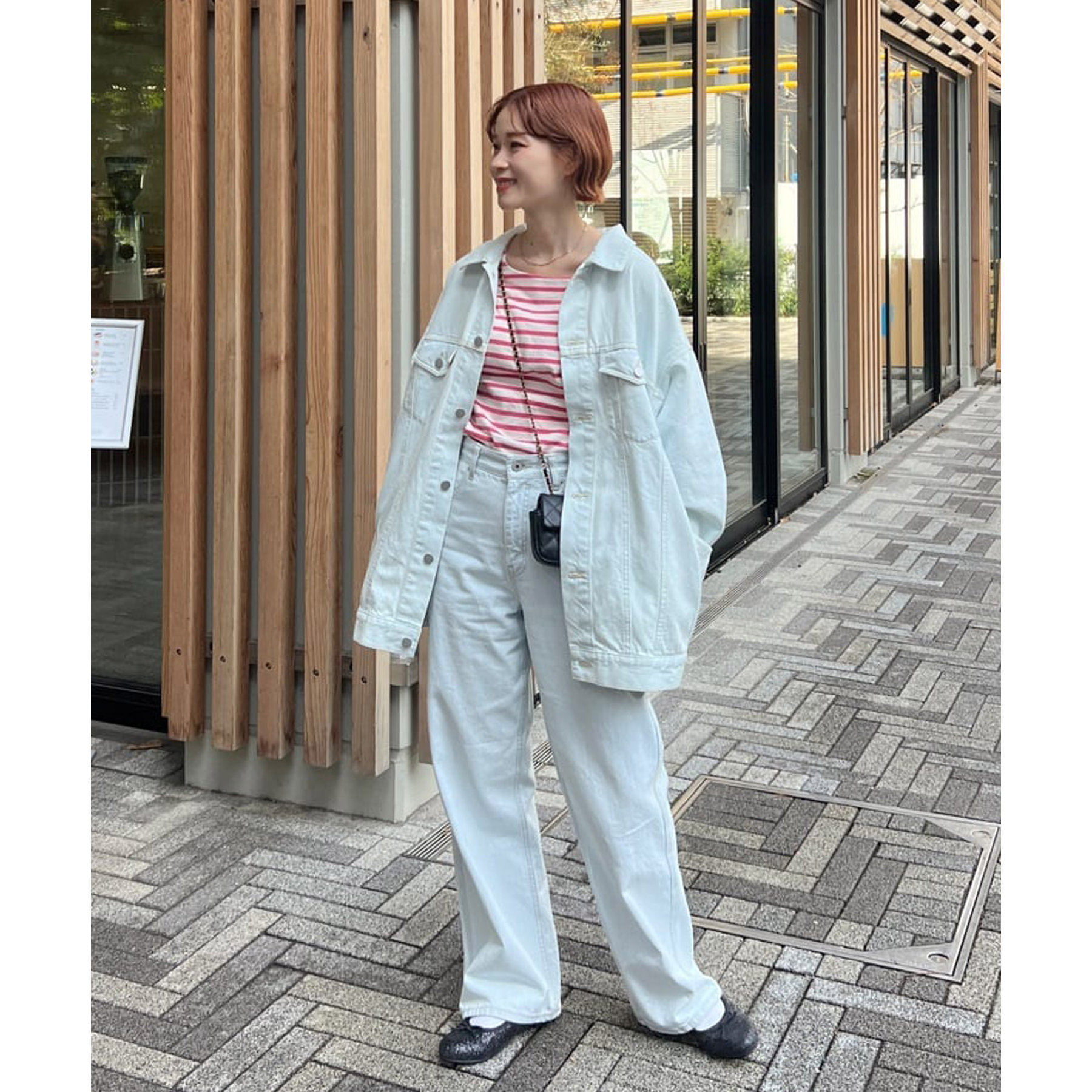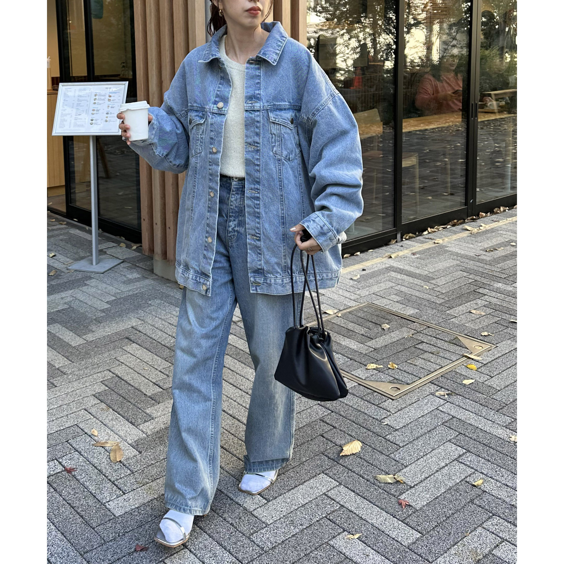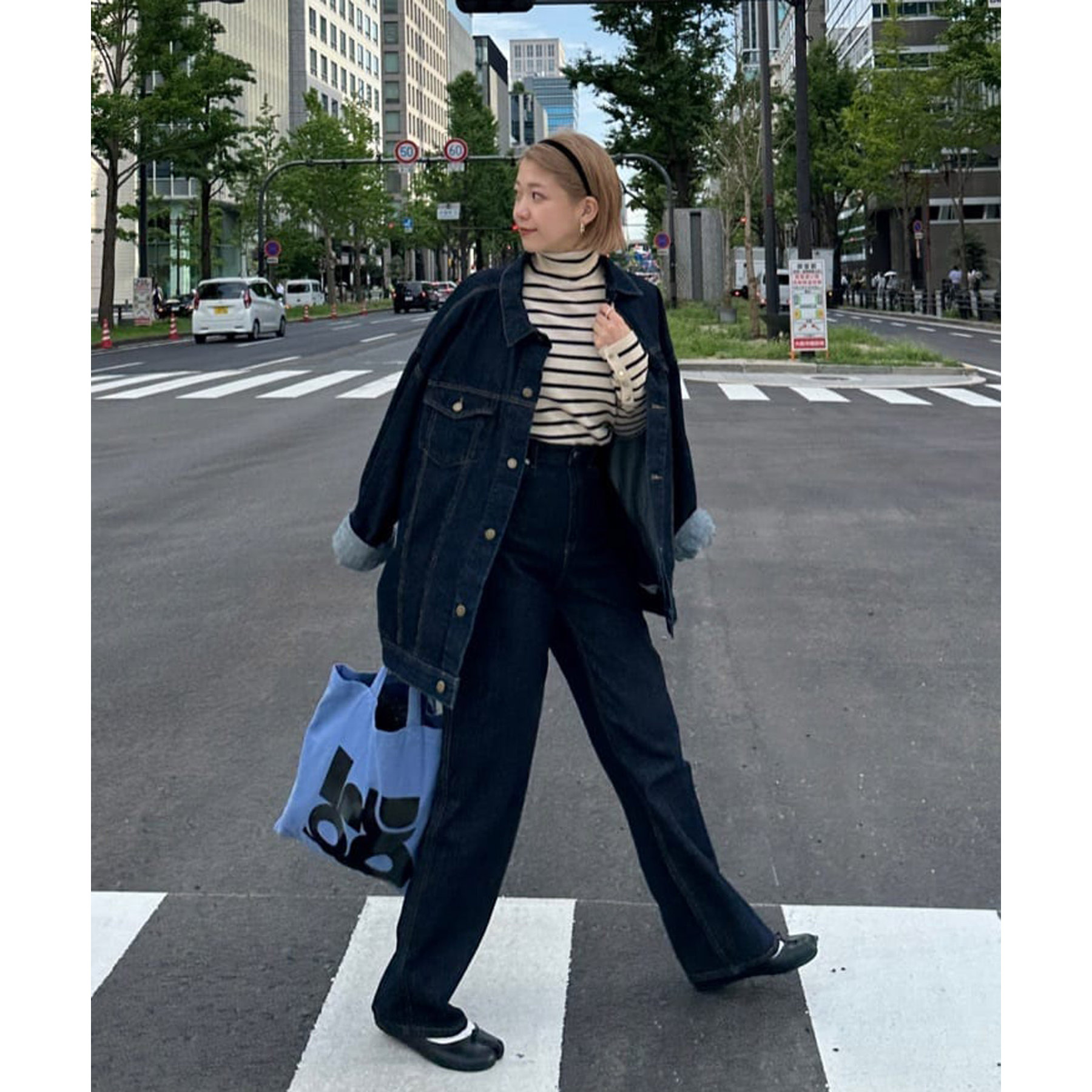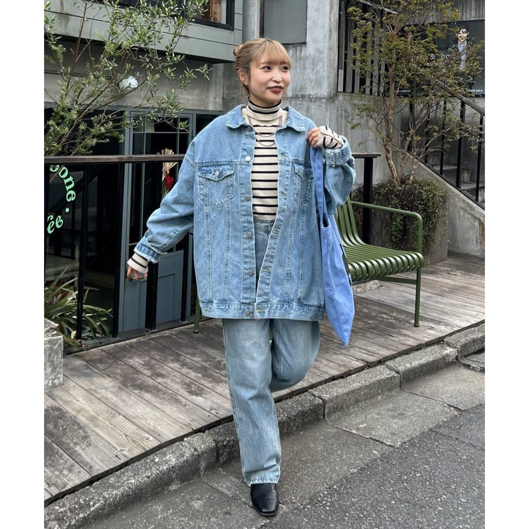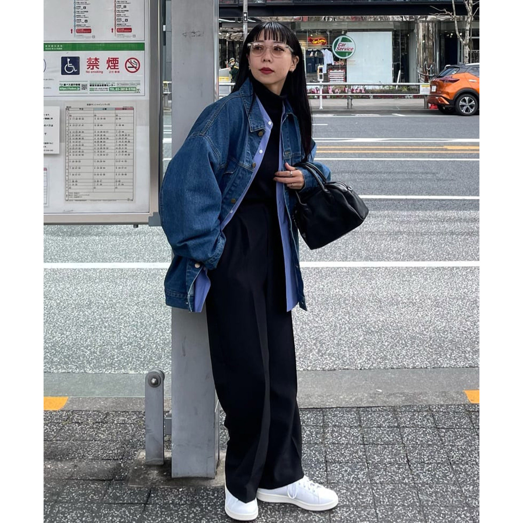 同色のデニムパンツを合わせたセットアップ風スタイルで上級者見えな着こなしも楽しめます。