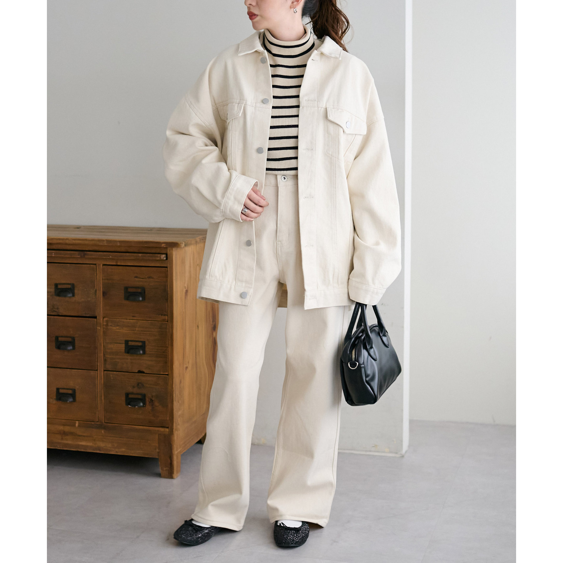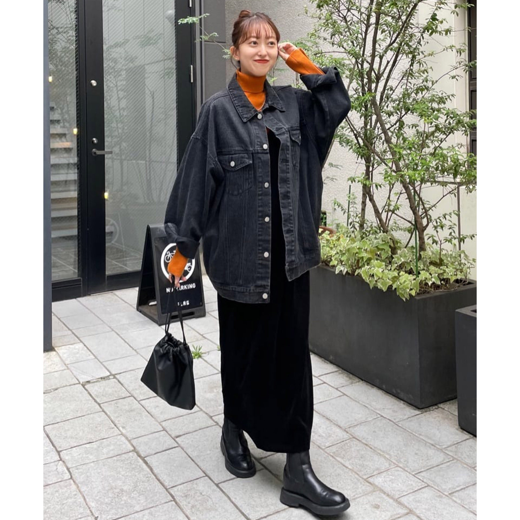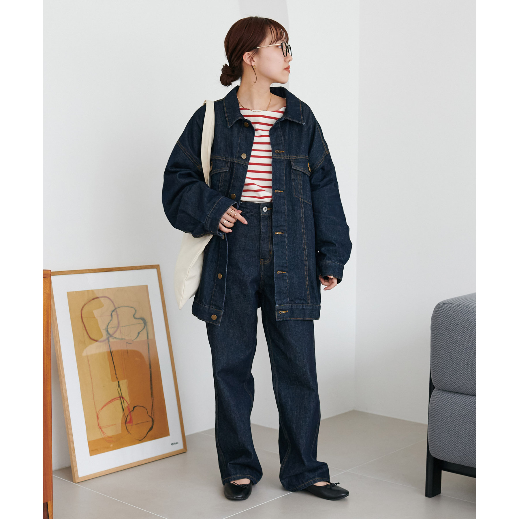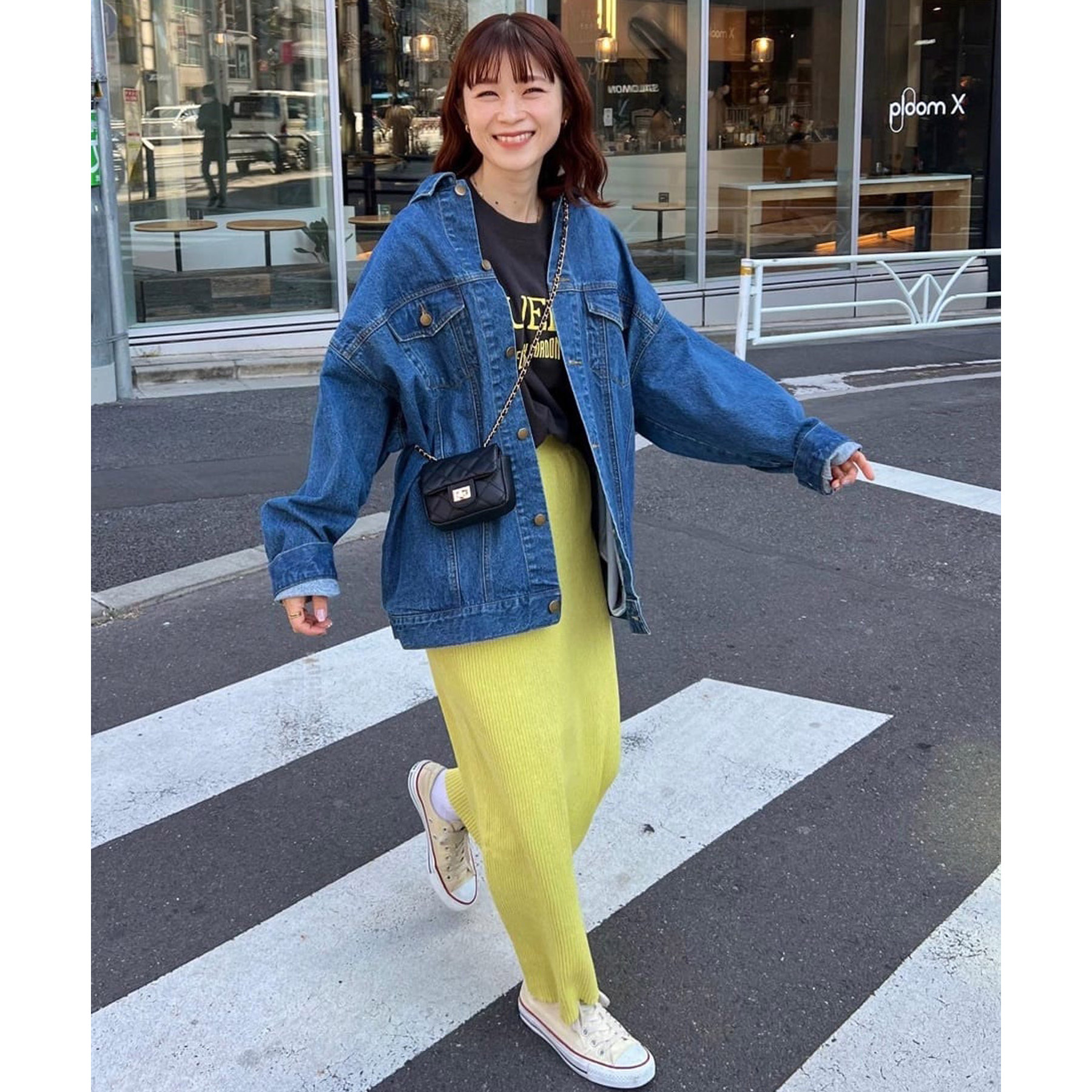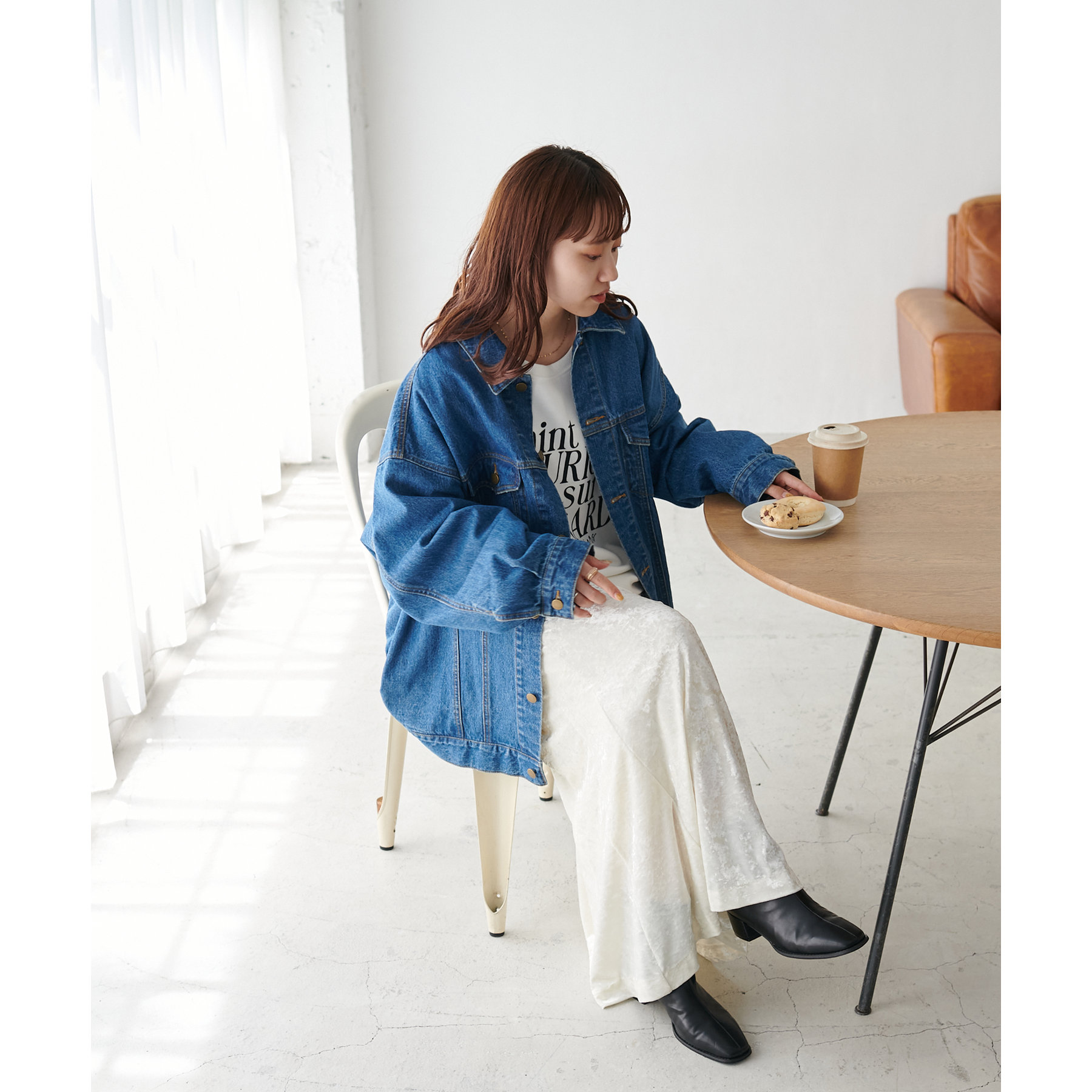 同色のデニムパンツを合わせたセットアップ風スタイルで上級者見えな着こなしも楽しめます。
