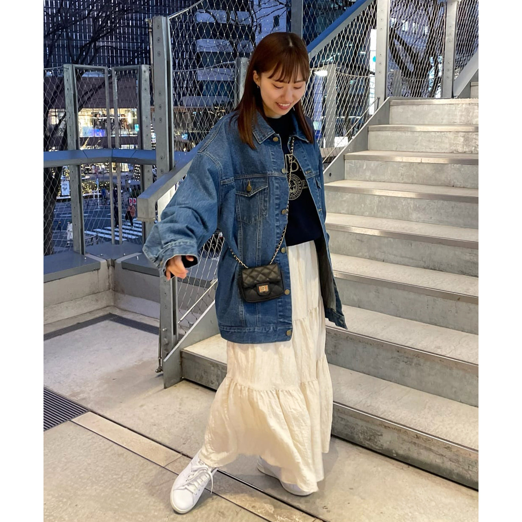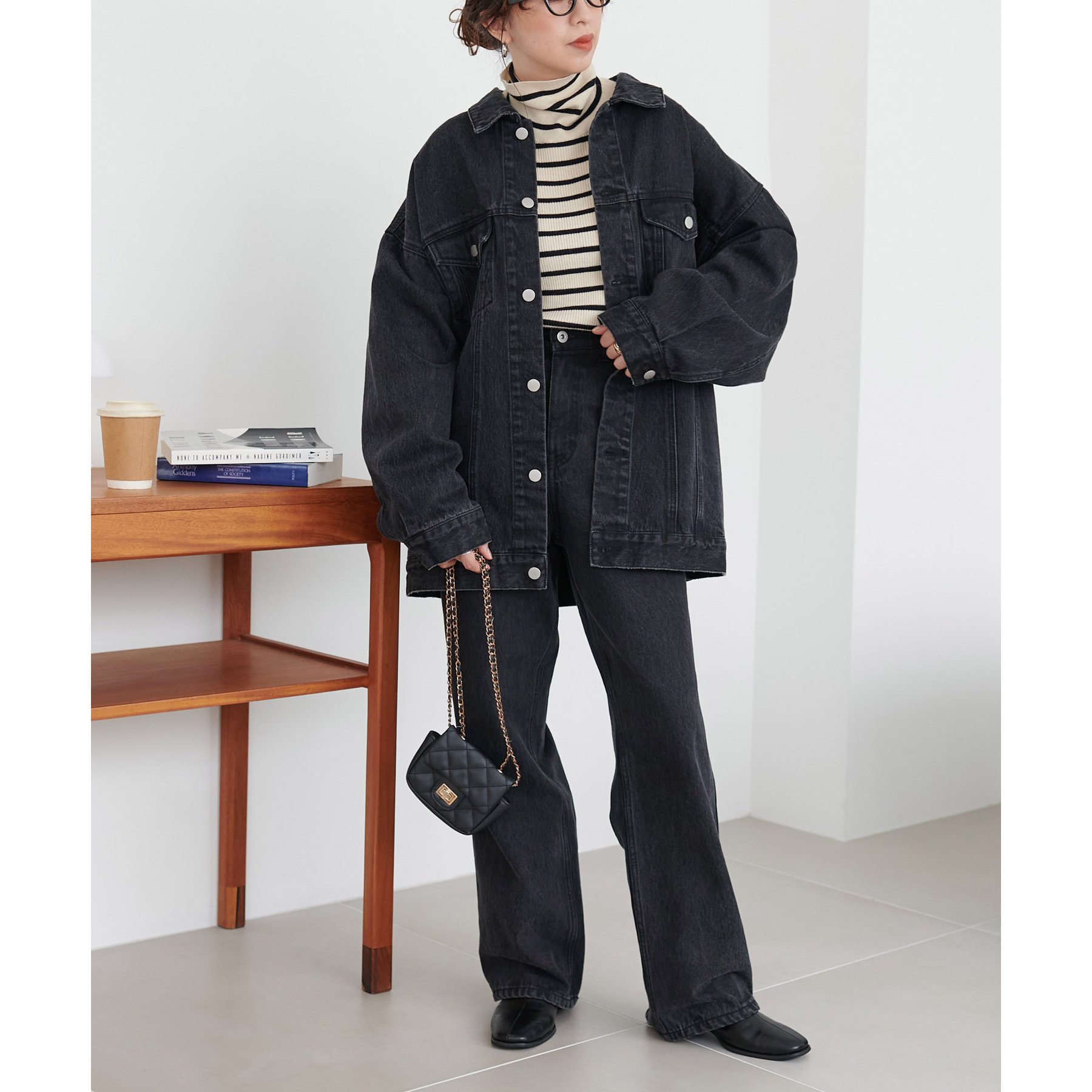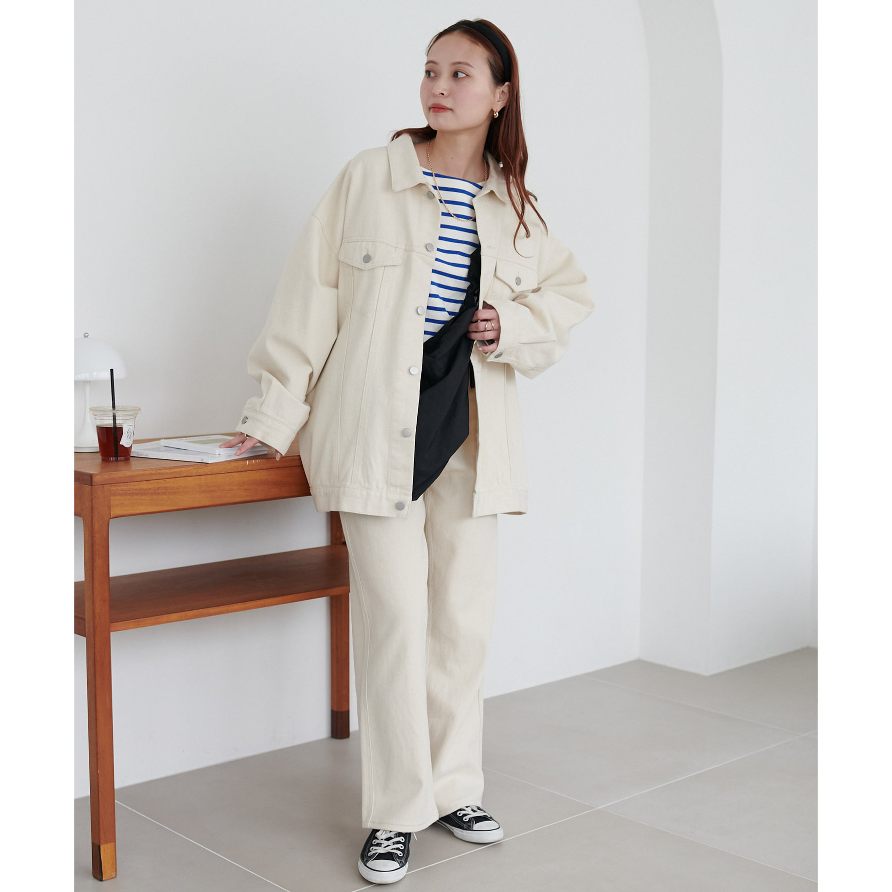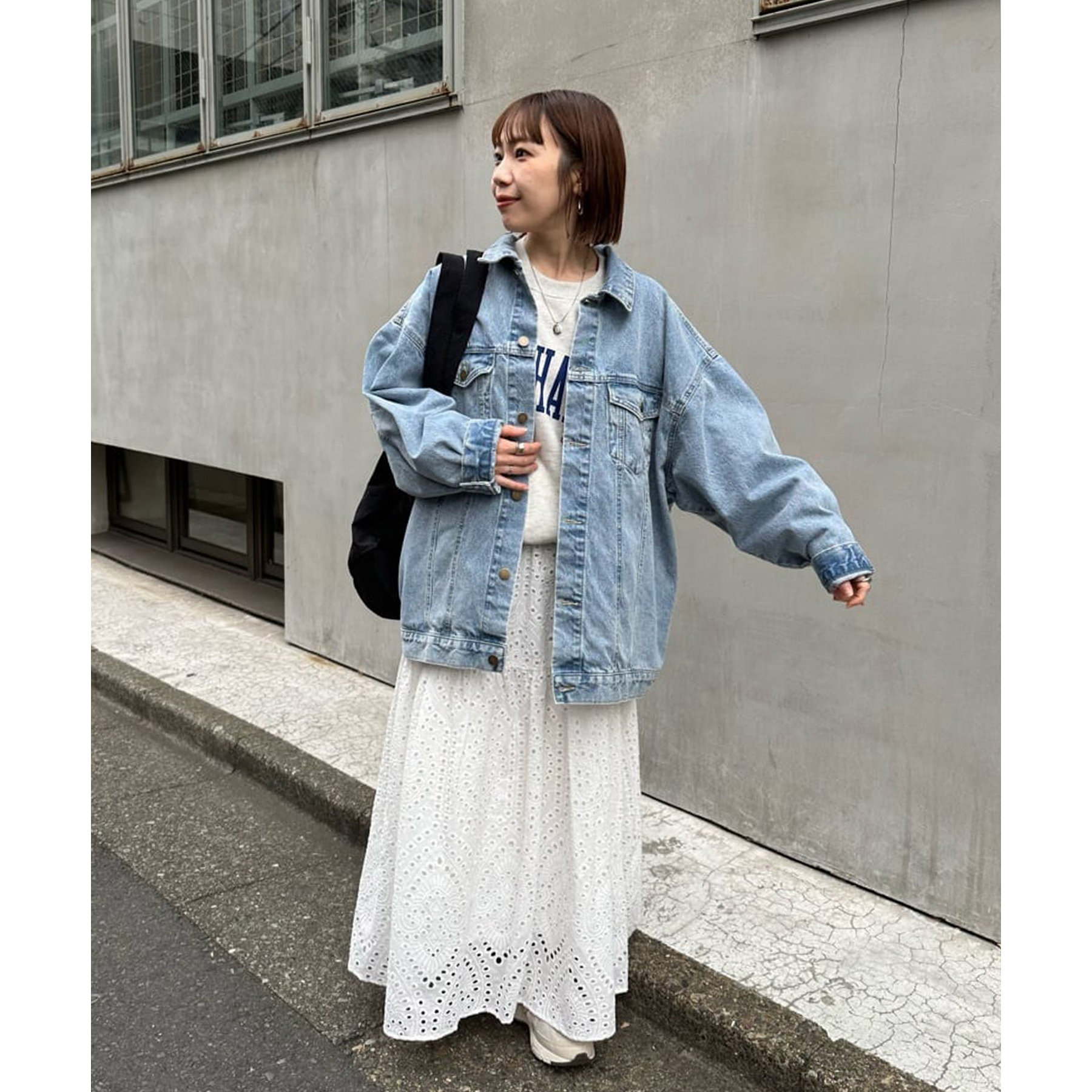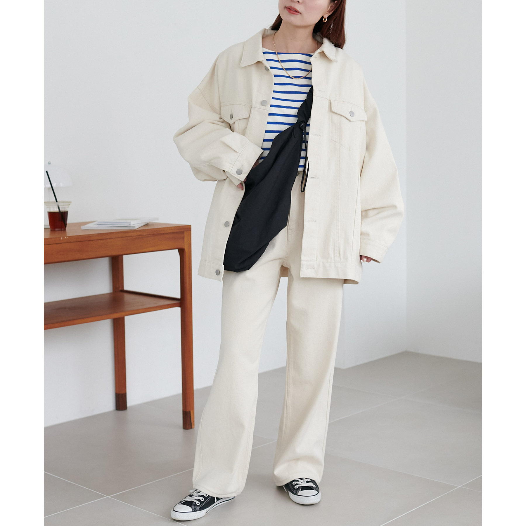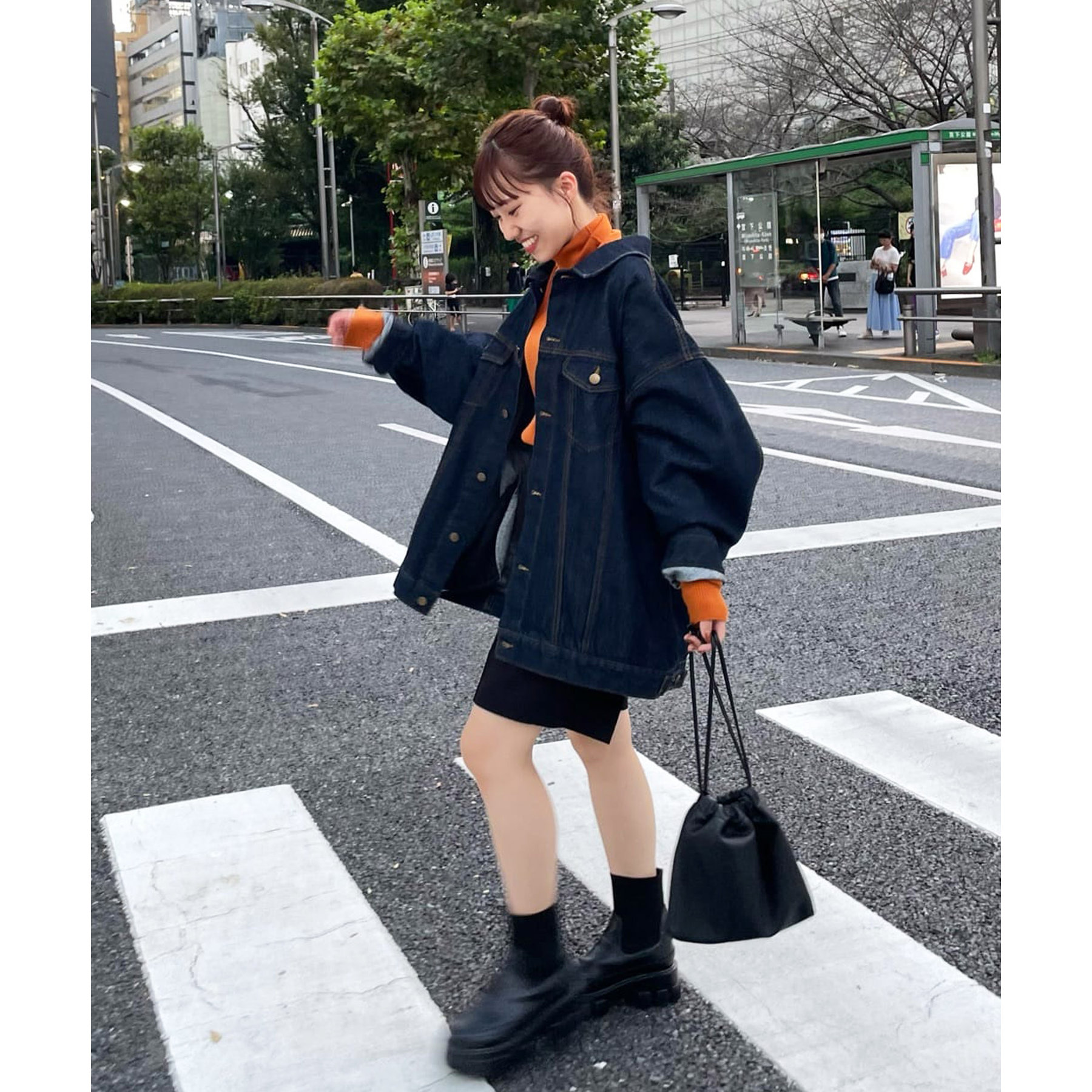同色のデニムパンツを合わせたセットアップ風スタイルで上級者見えな着こなしも楽しめます。