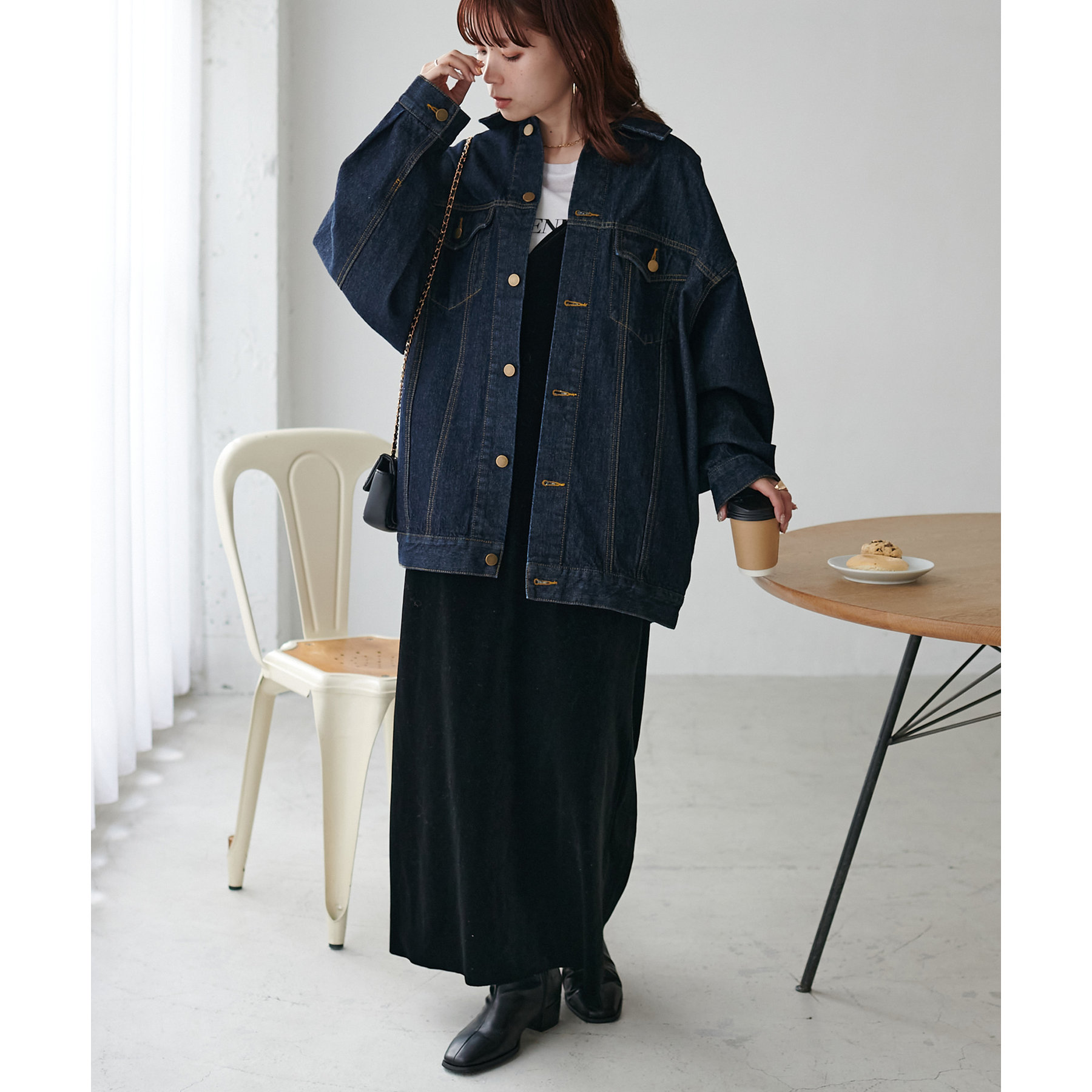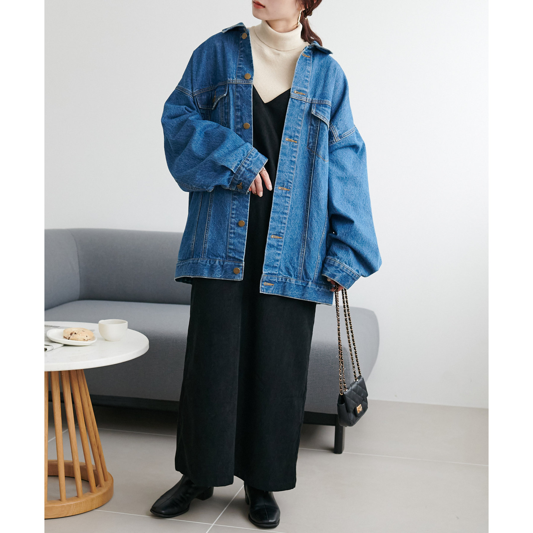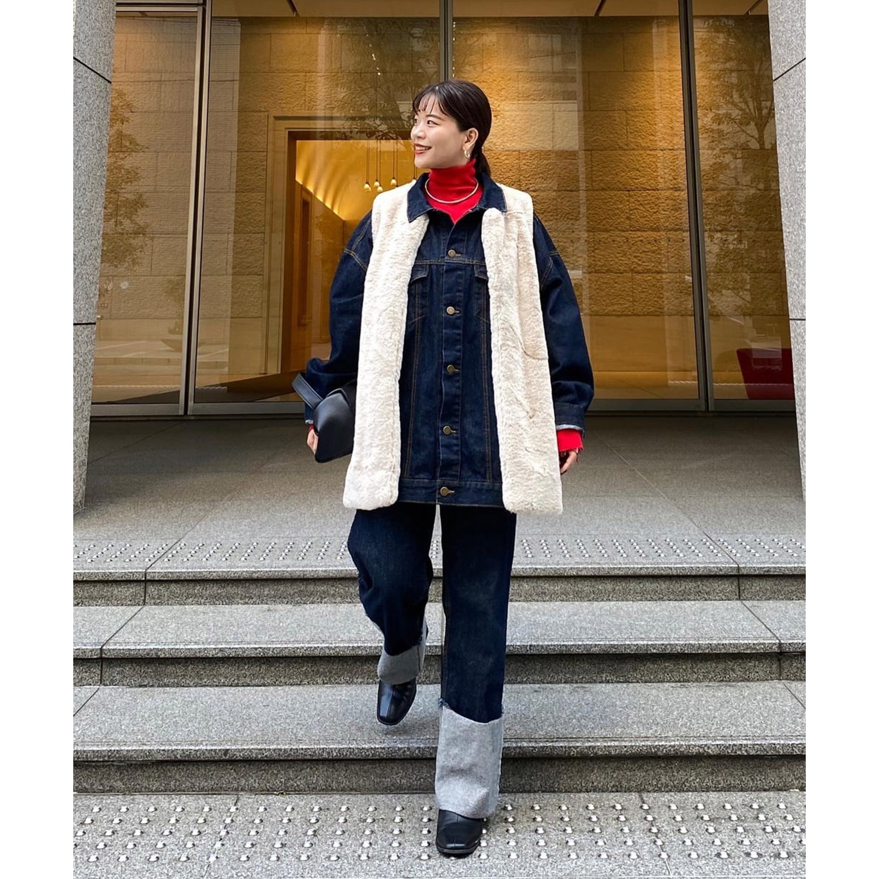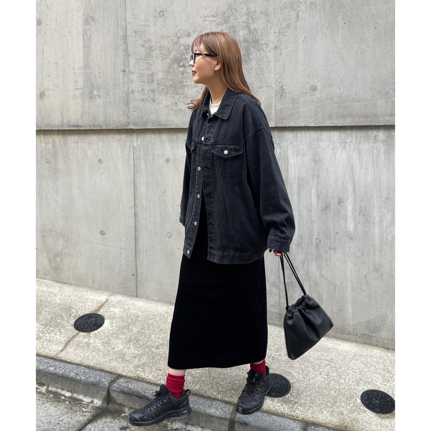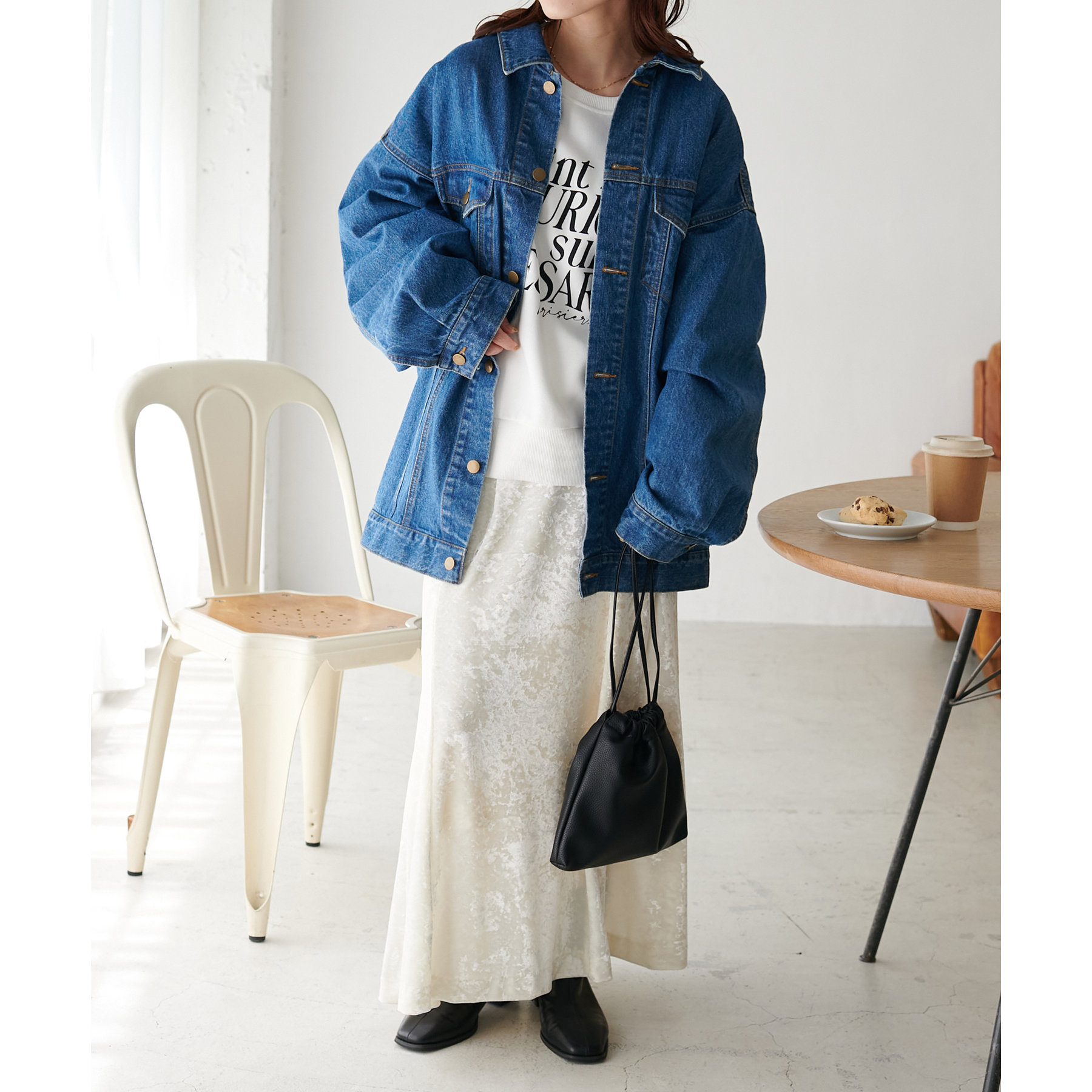 同色のデニムパンツを合わせたセットアップ風スタイルで上級者見えな着こなしも楽しめます。
