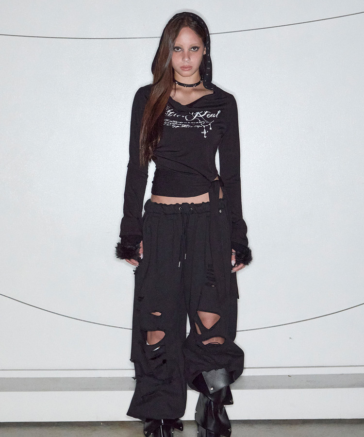 - 裾のアシンメトリーなロングパネルでタイドレープを作ることも、自然に垂らして単体でのスタイリングも楽しめるデザイン