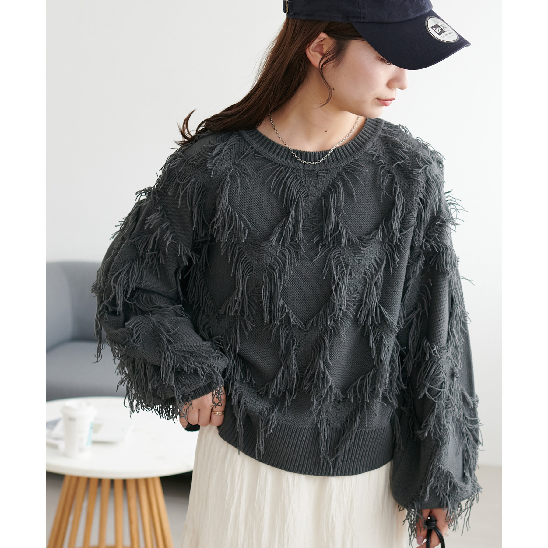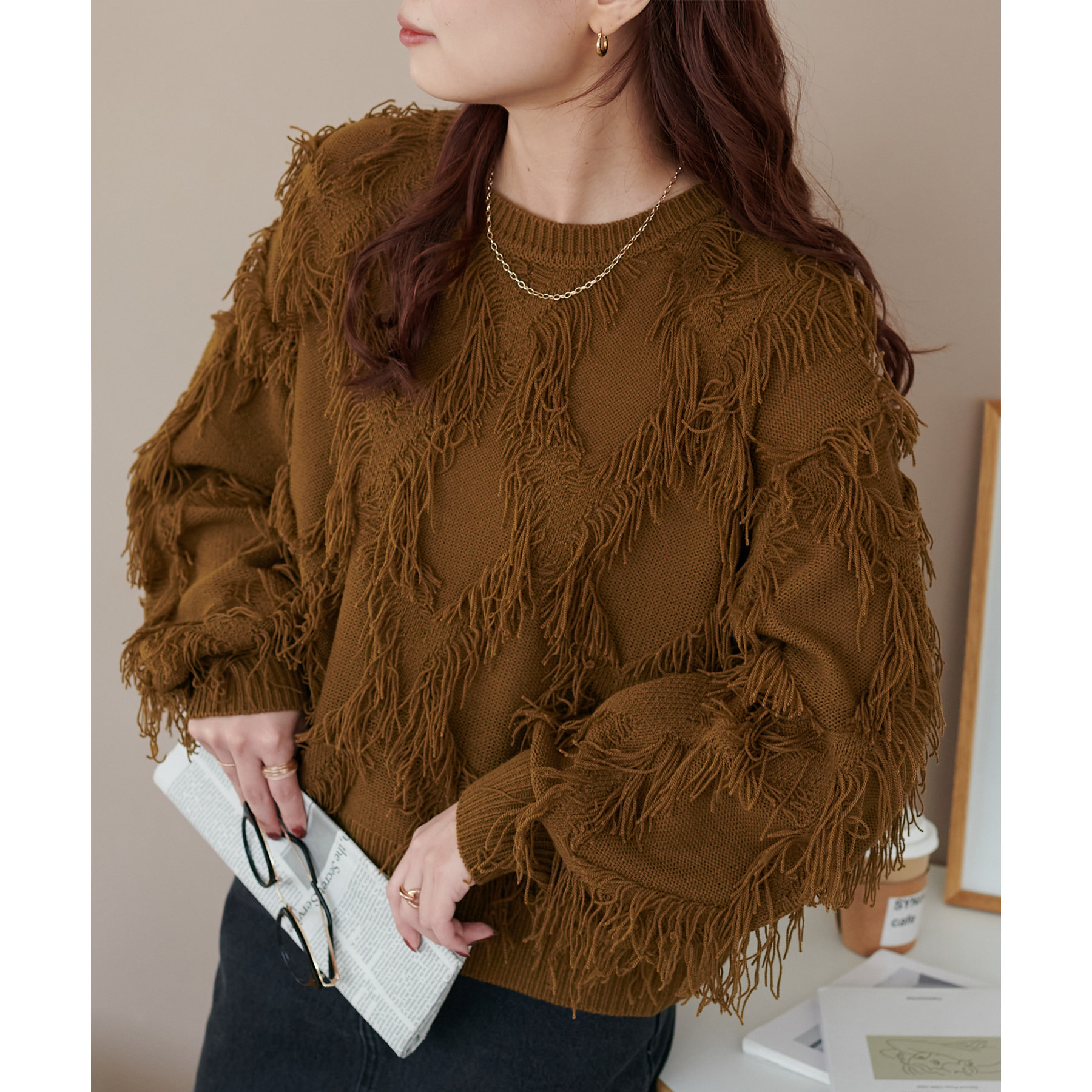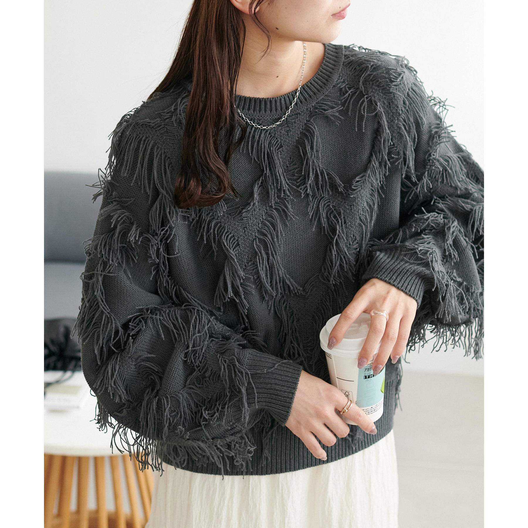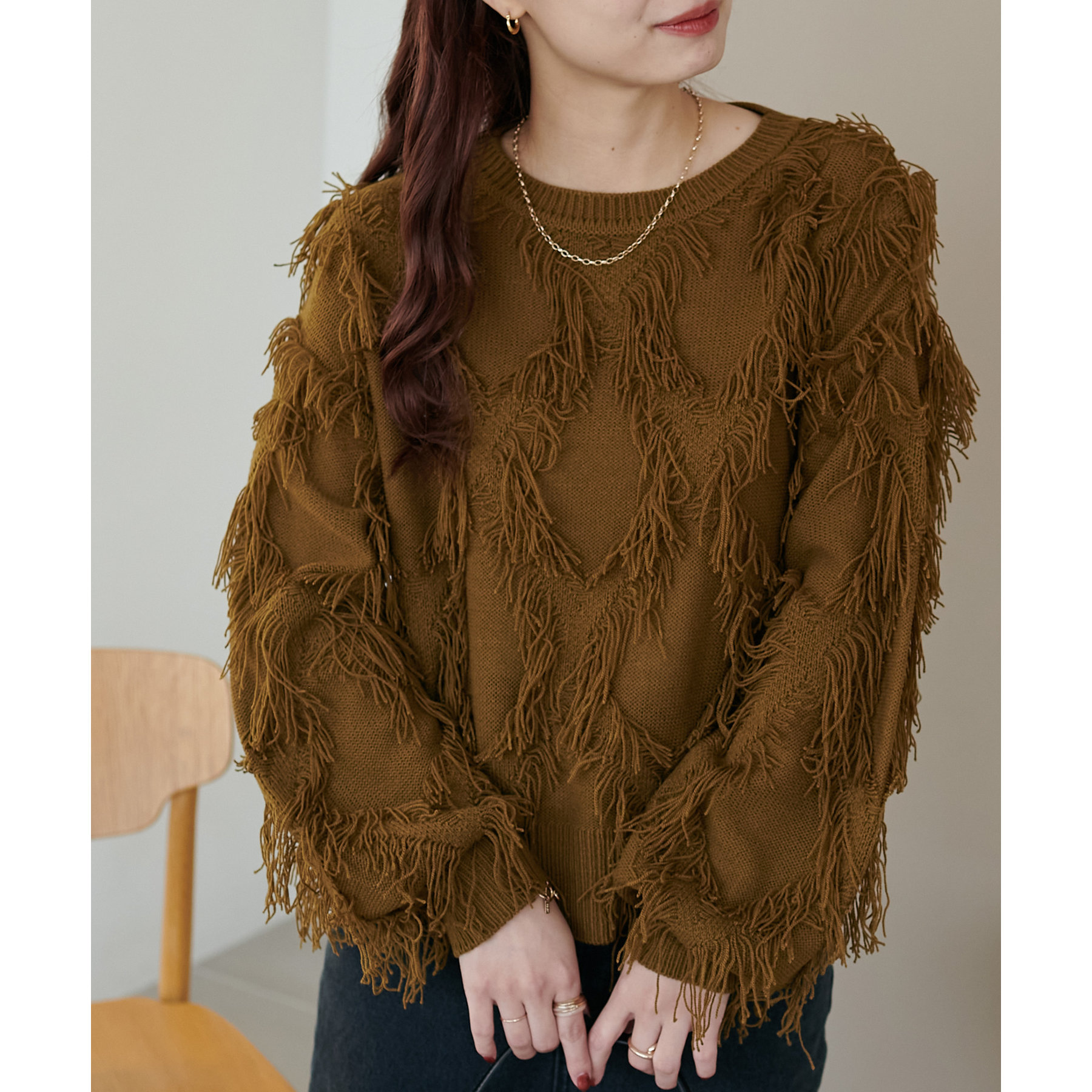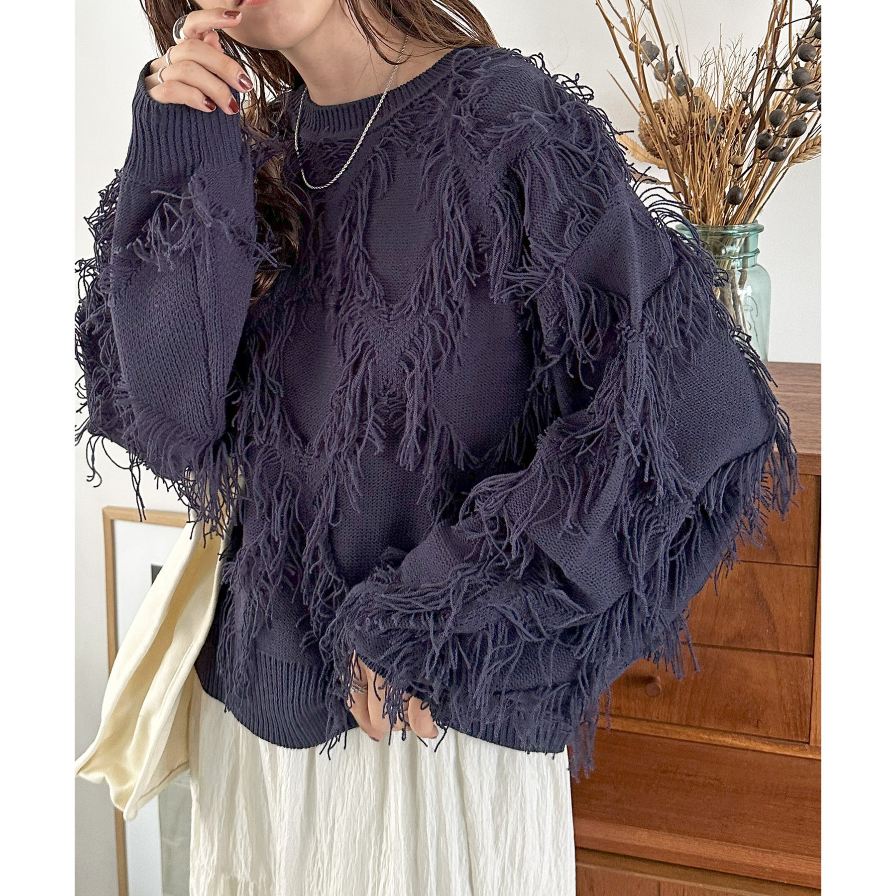 身頃や袖にふさふさしたフリンジのデザインがあしらわれどの角度から見ても目を惹くニットプルオーバー。