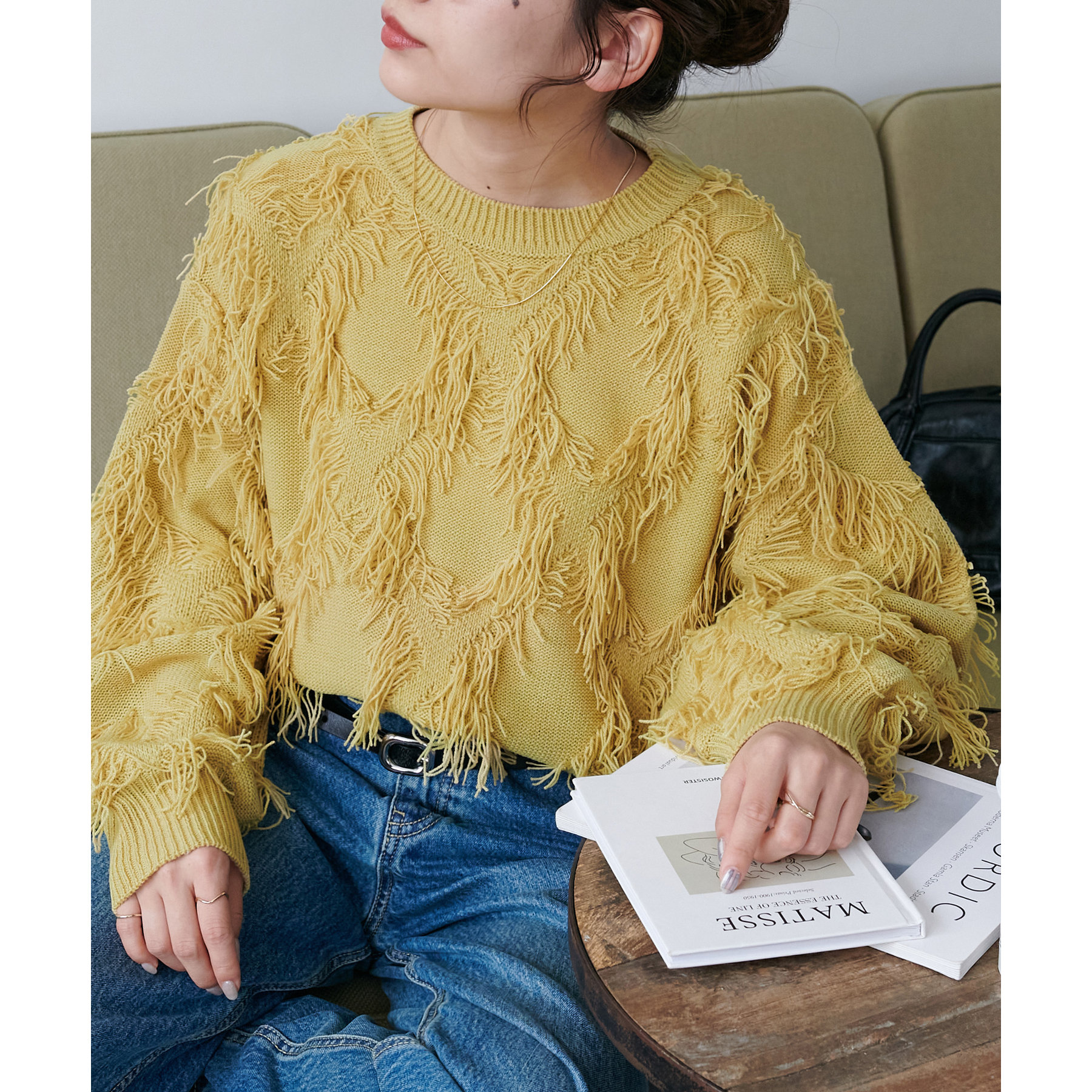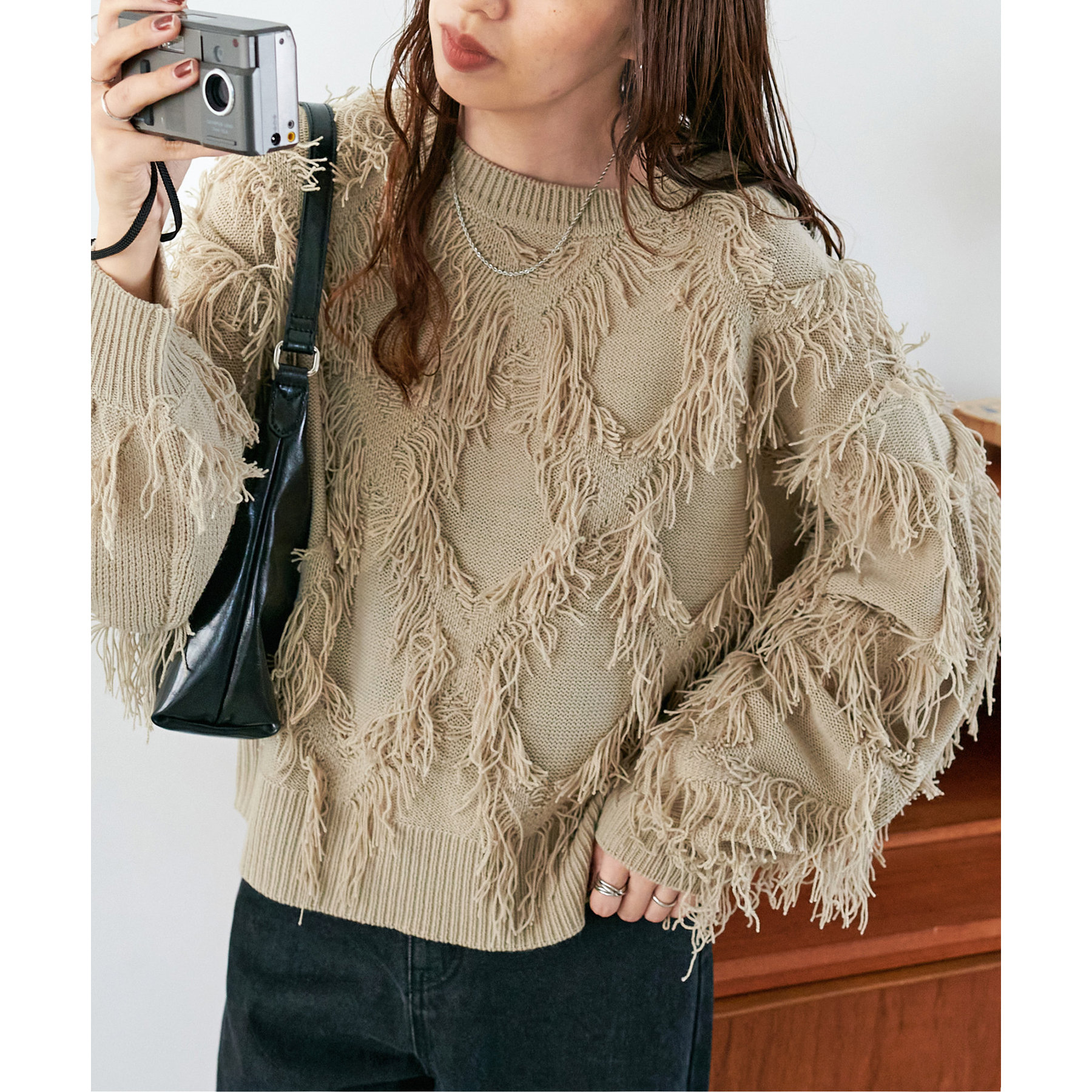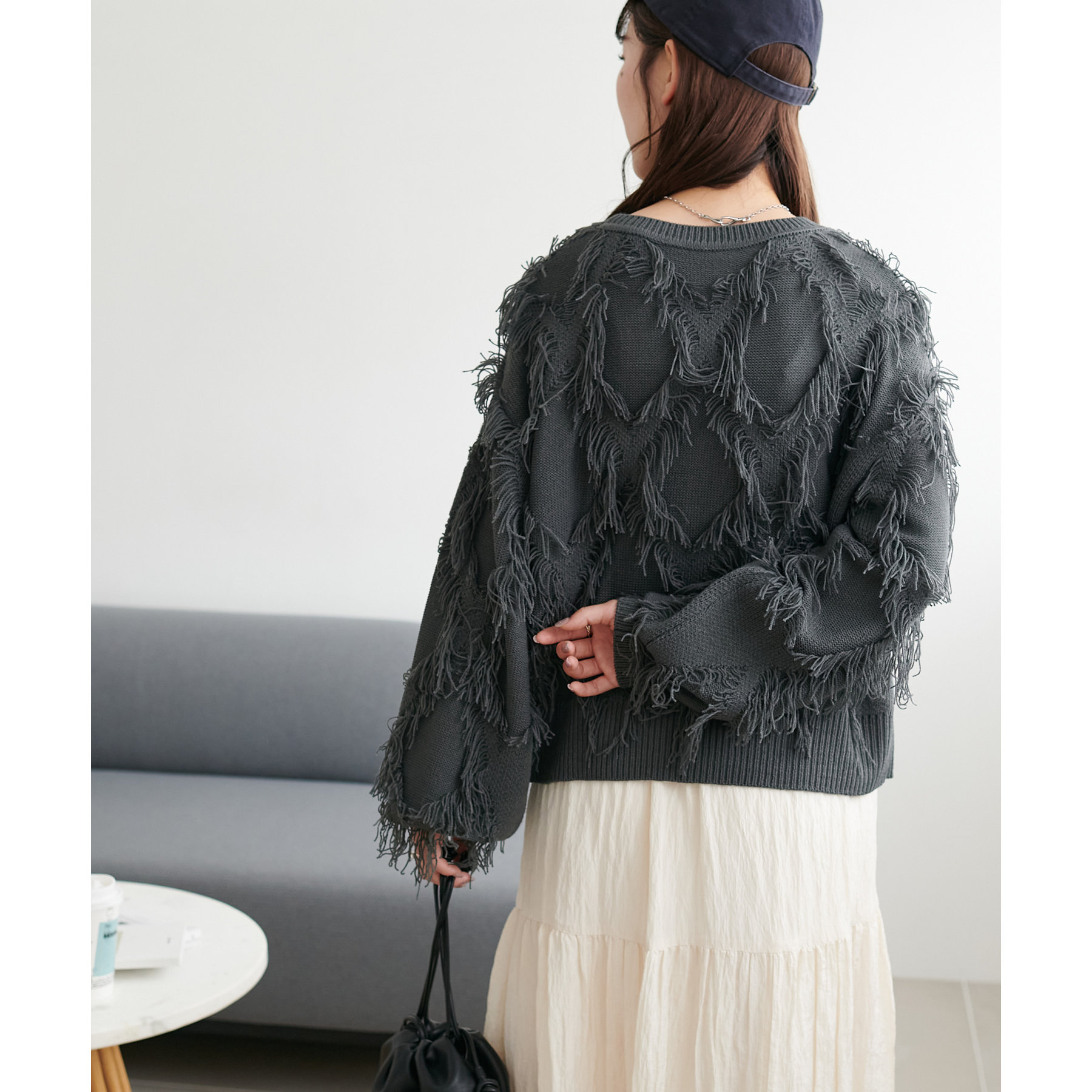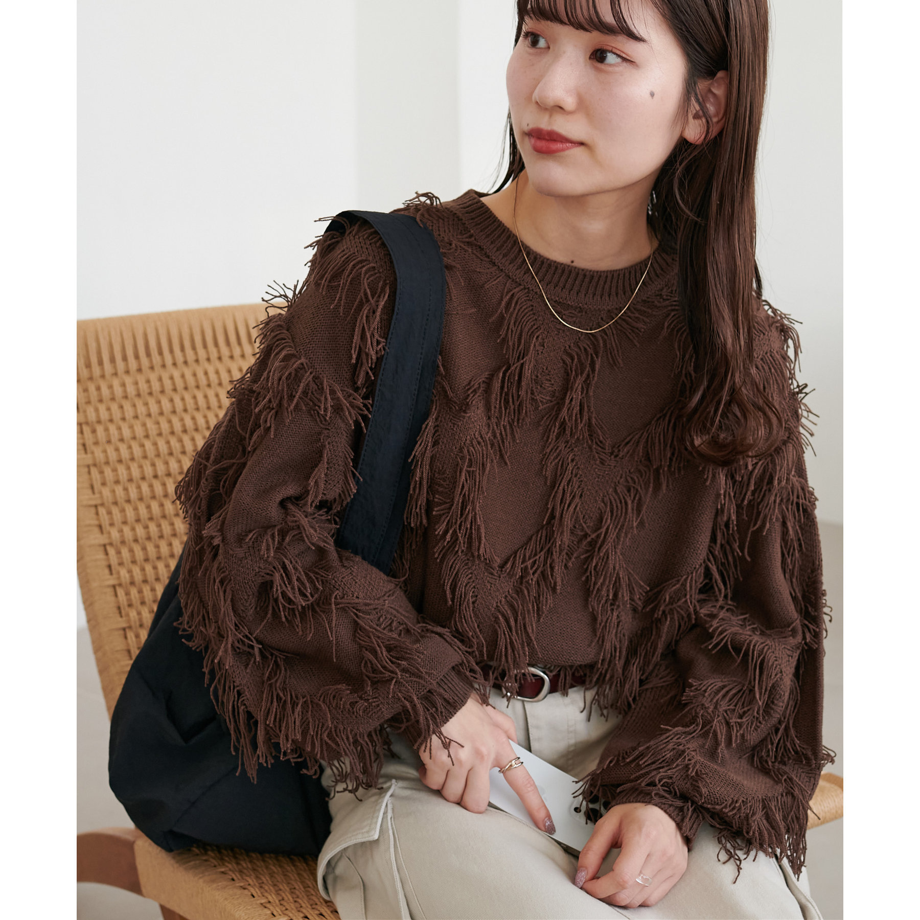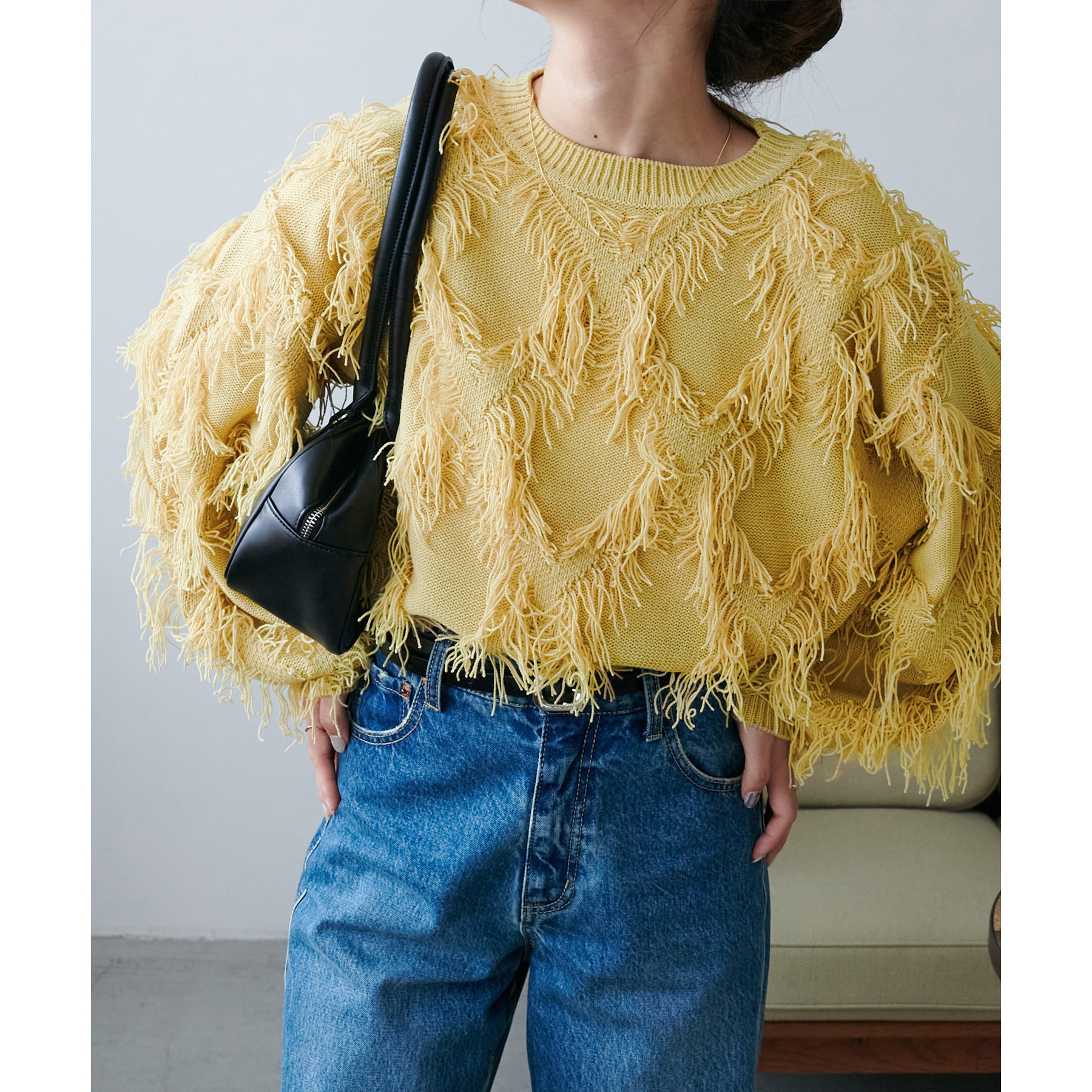 身頃や袖にふさふさしたフリンジのデザインがあしらわれどの角度から見ても目を惹くニットプルオーバー。