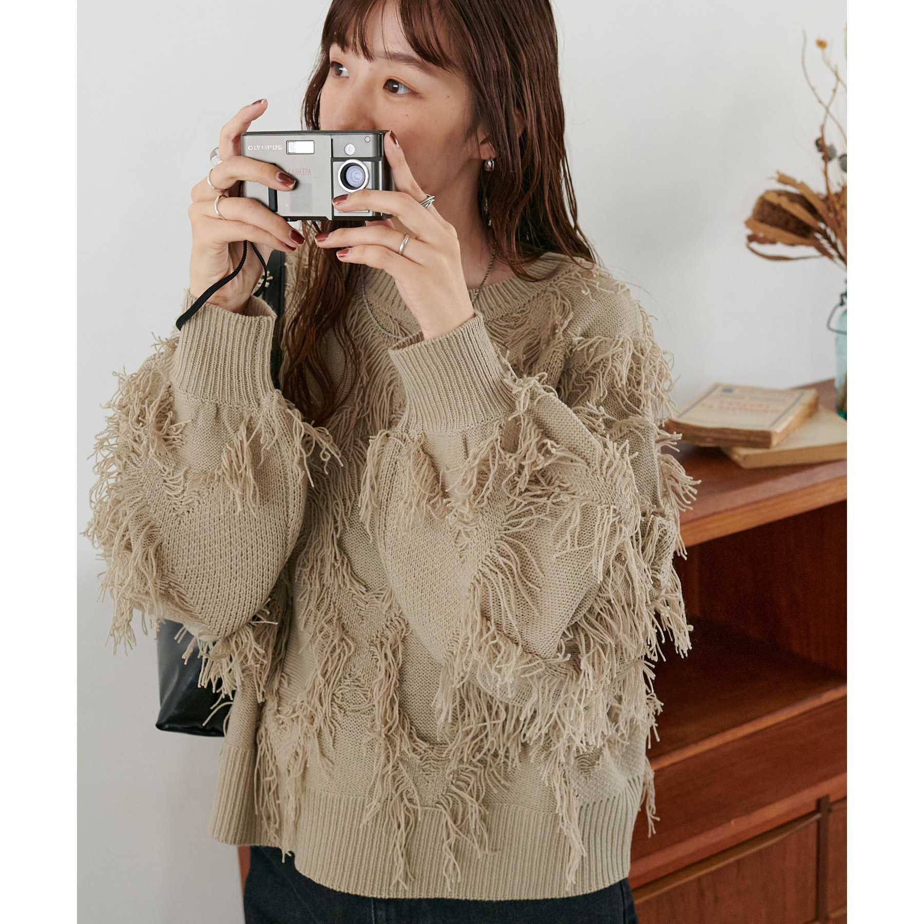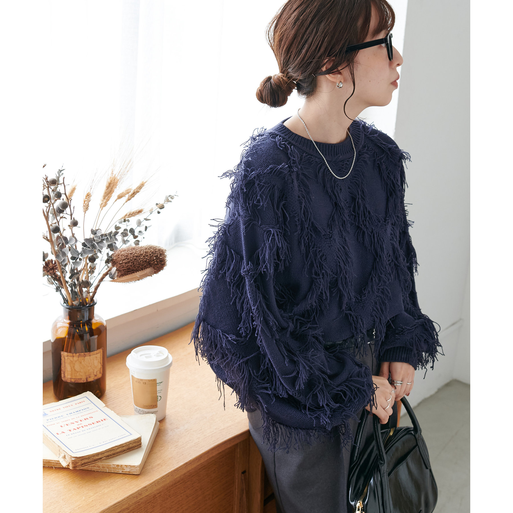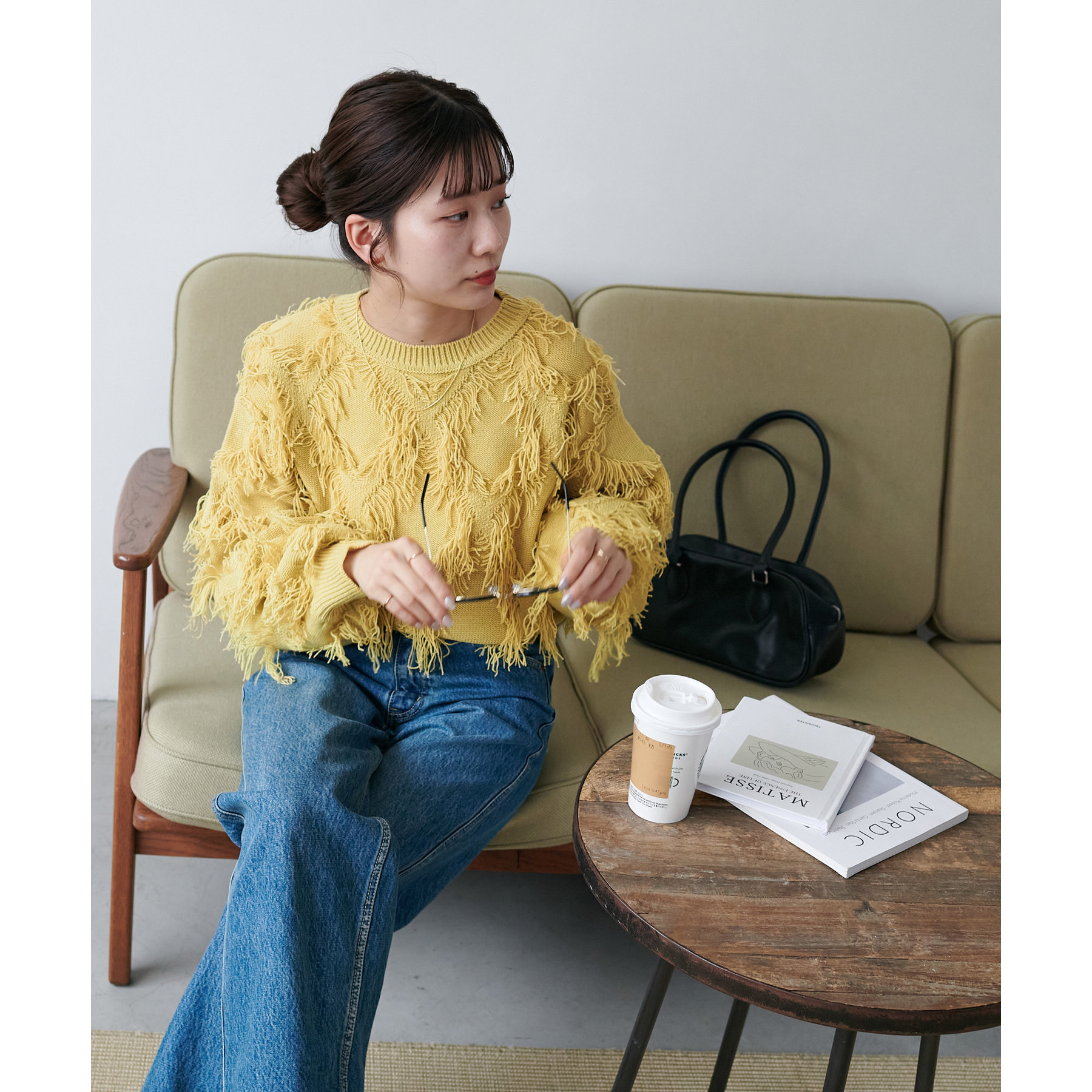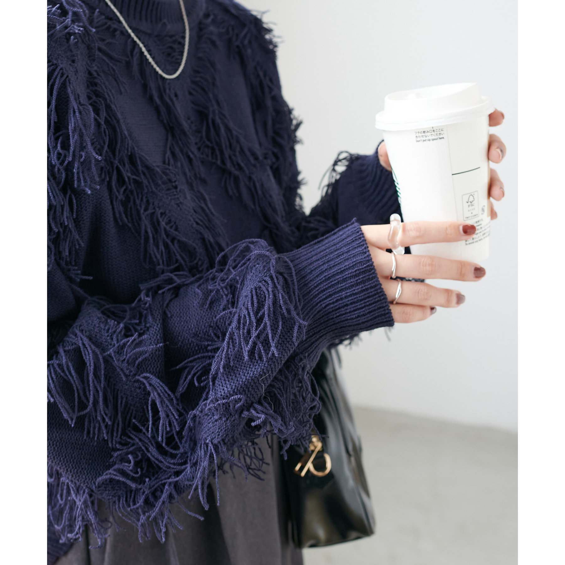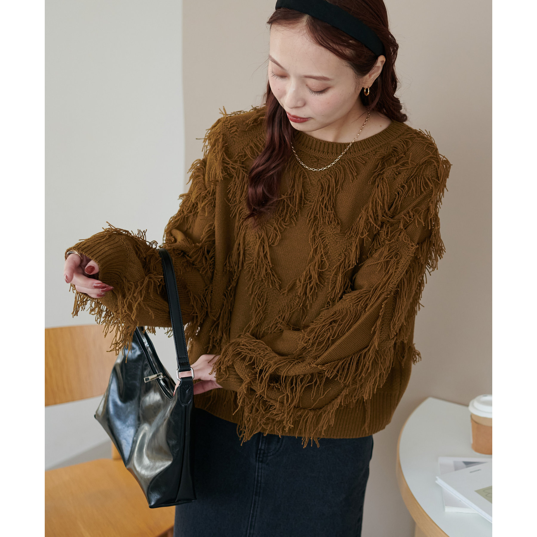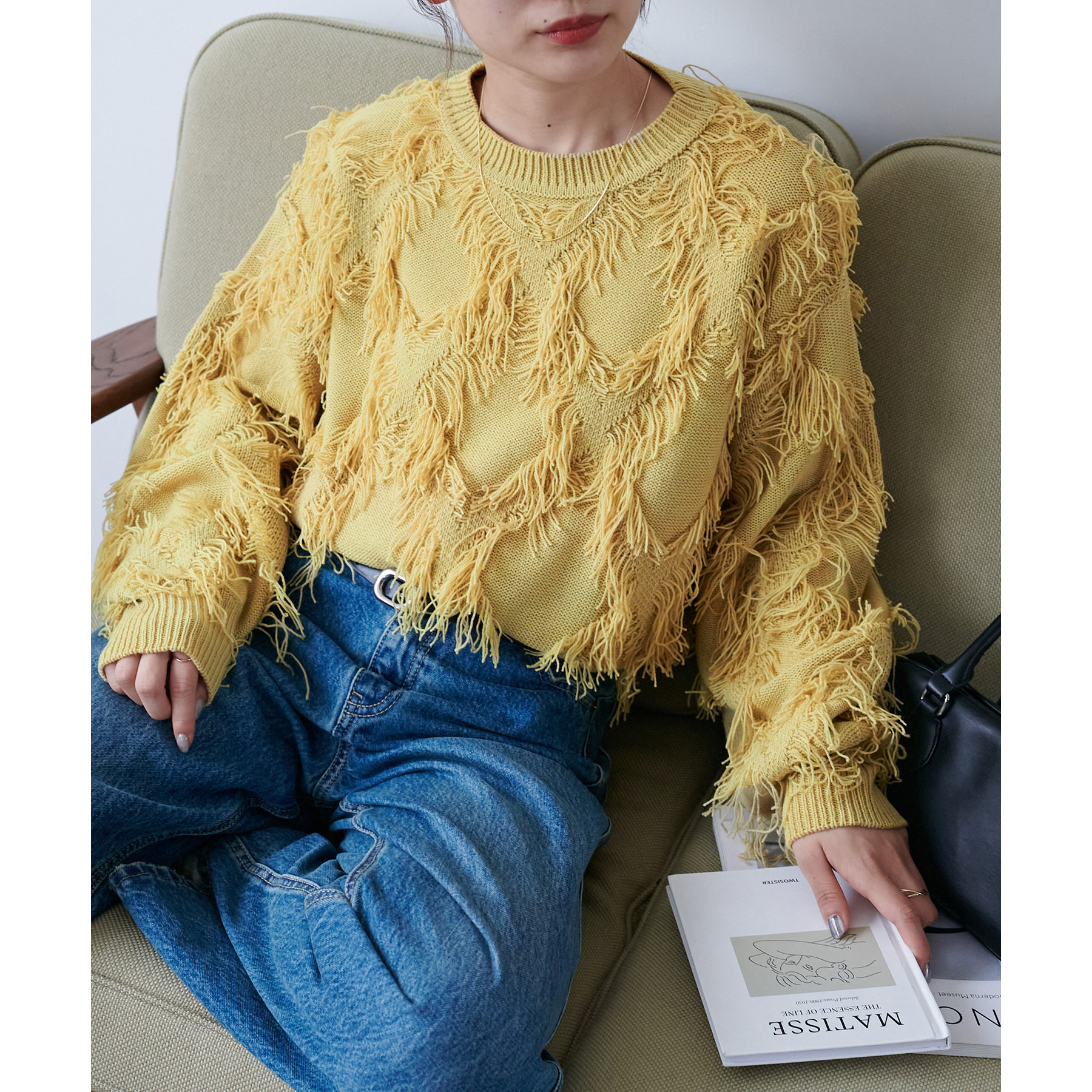 身頃や袖にふさふさしたフリンジのデザインがあしらわれどの角度から見ても目を惹くニットプルオーバー。