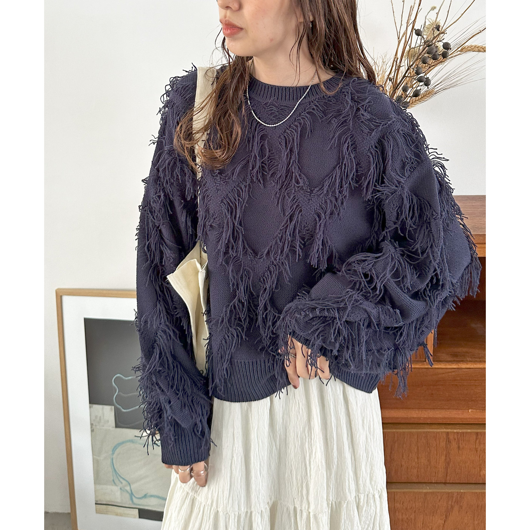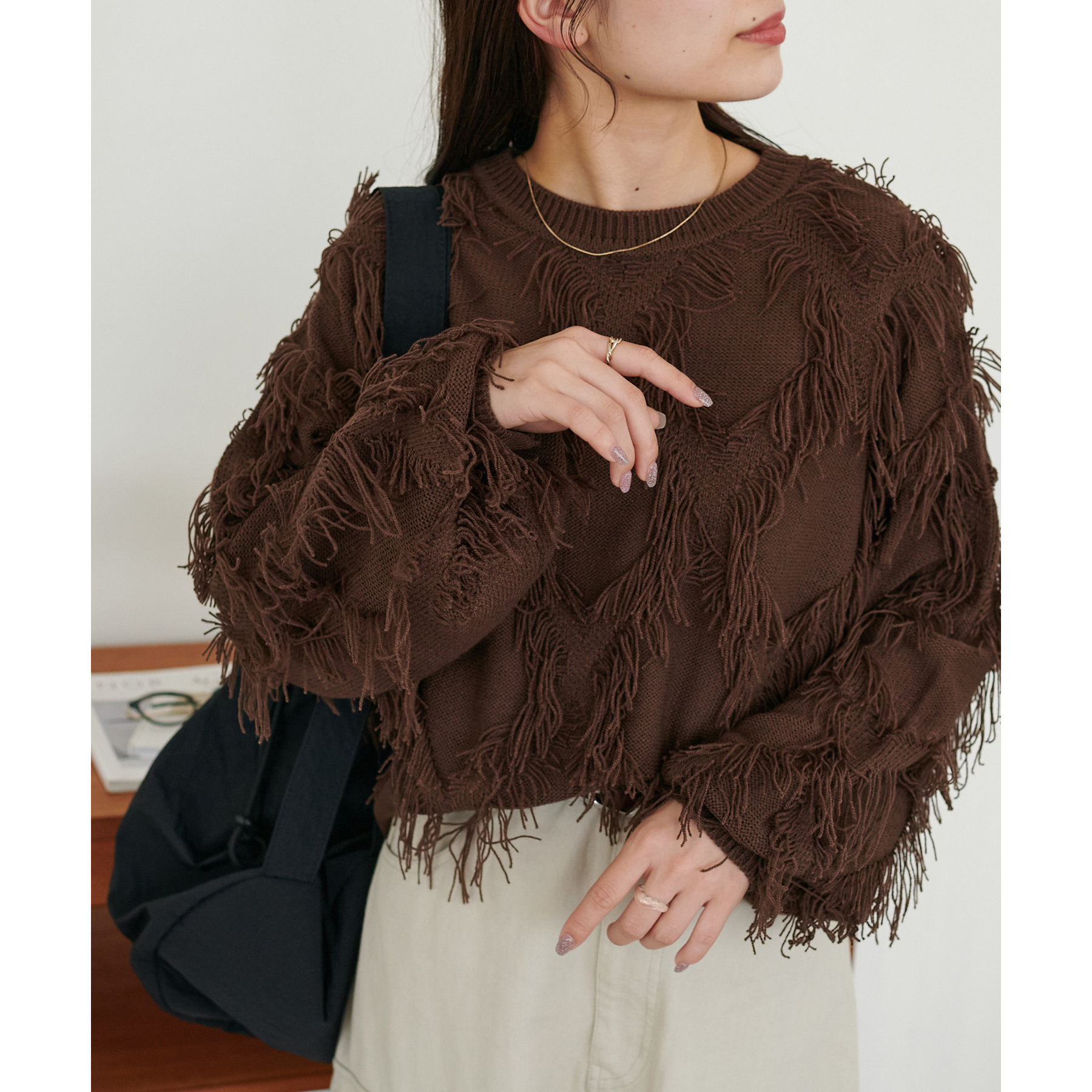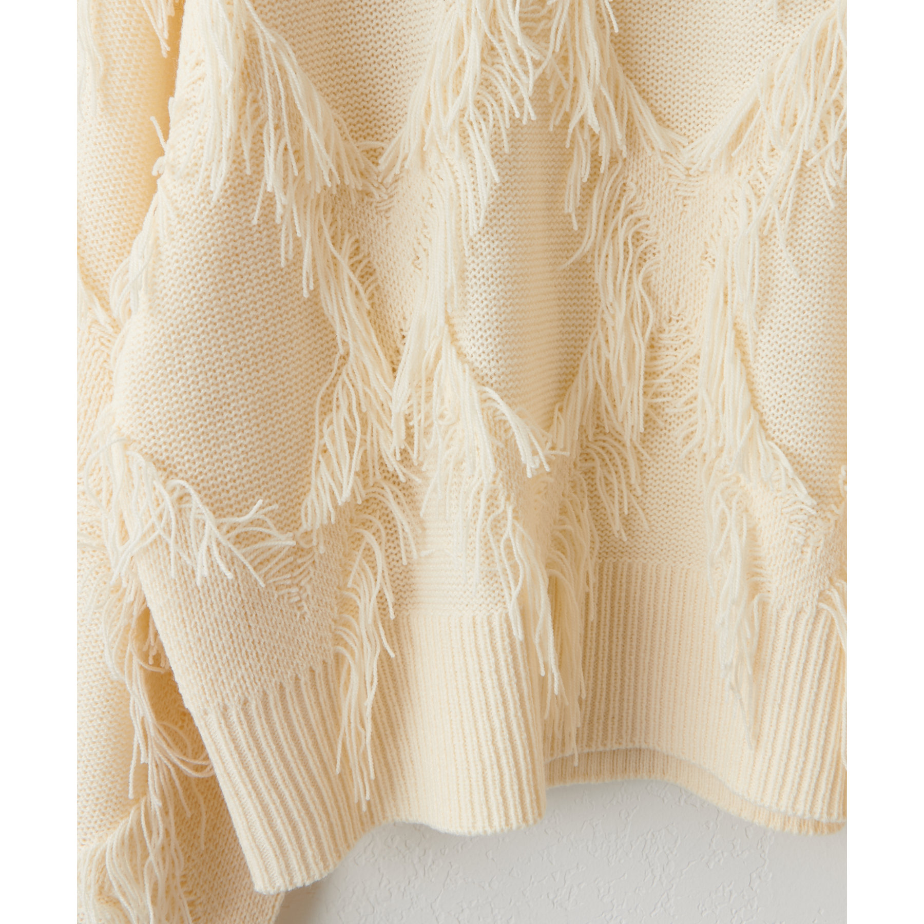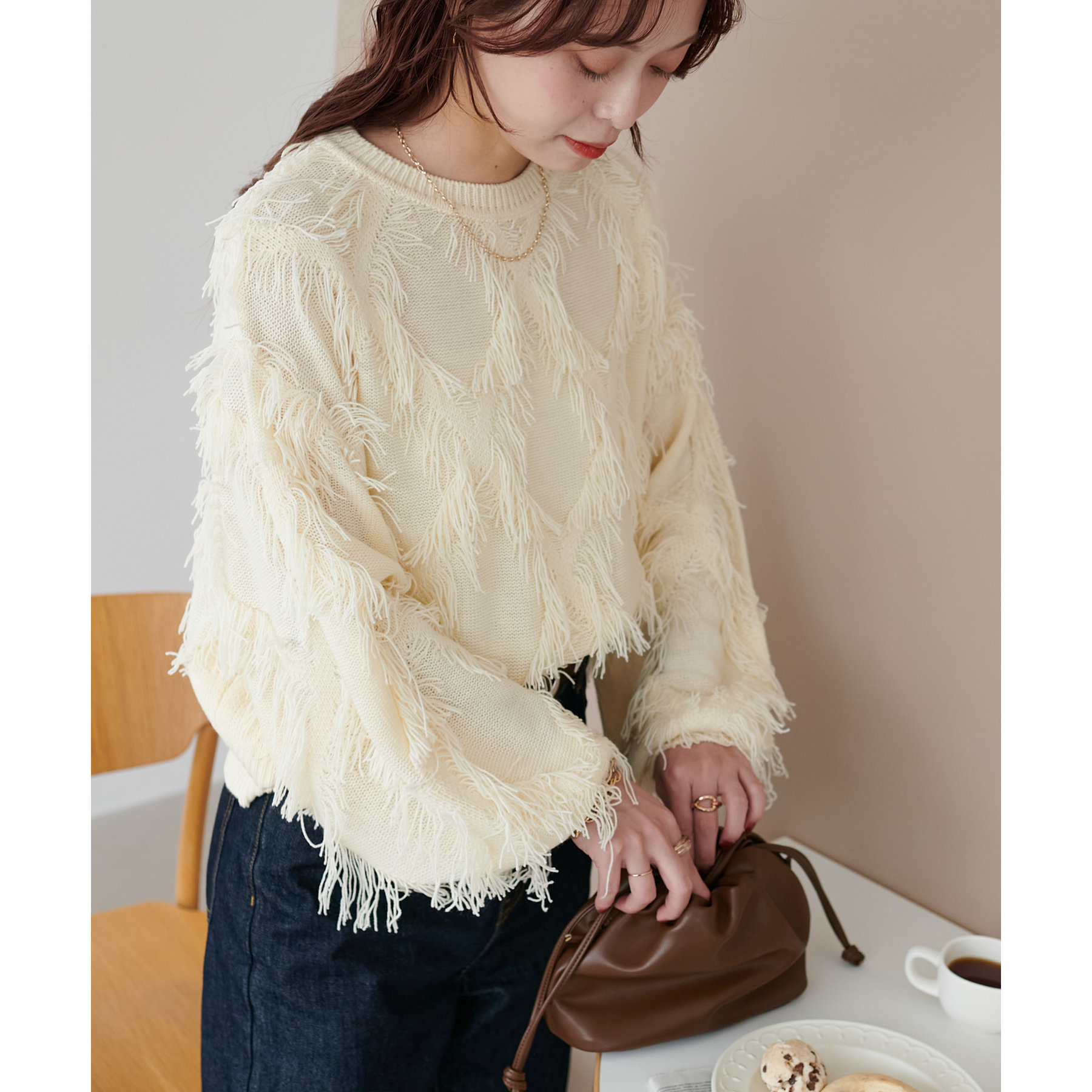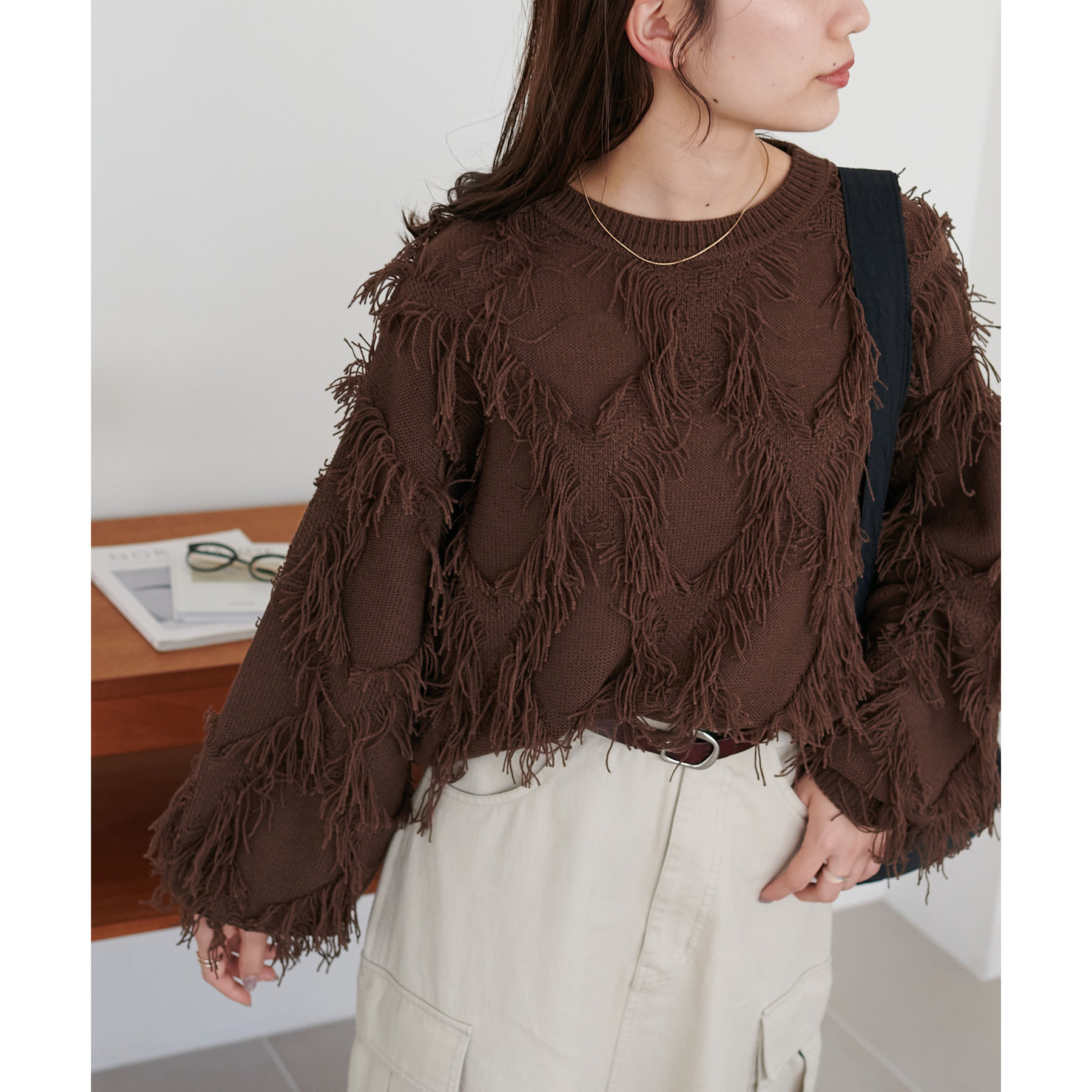 身頃や袖にふさふさしたフリンジのデザインがあしらわれどの角度から見ても目を惹くニットプルオーバー。