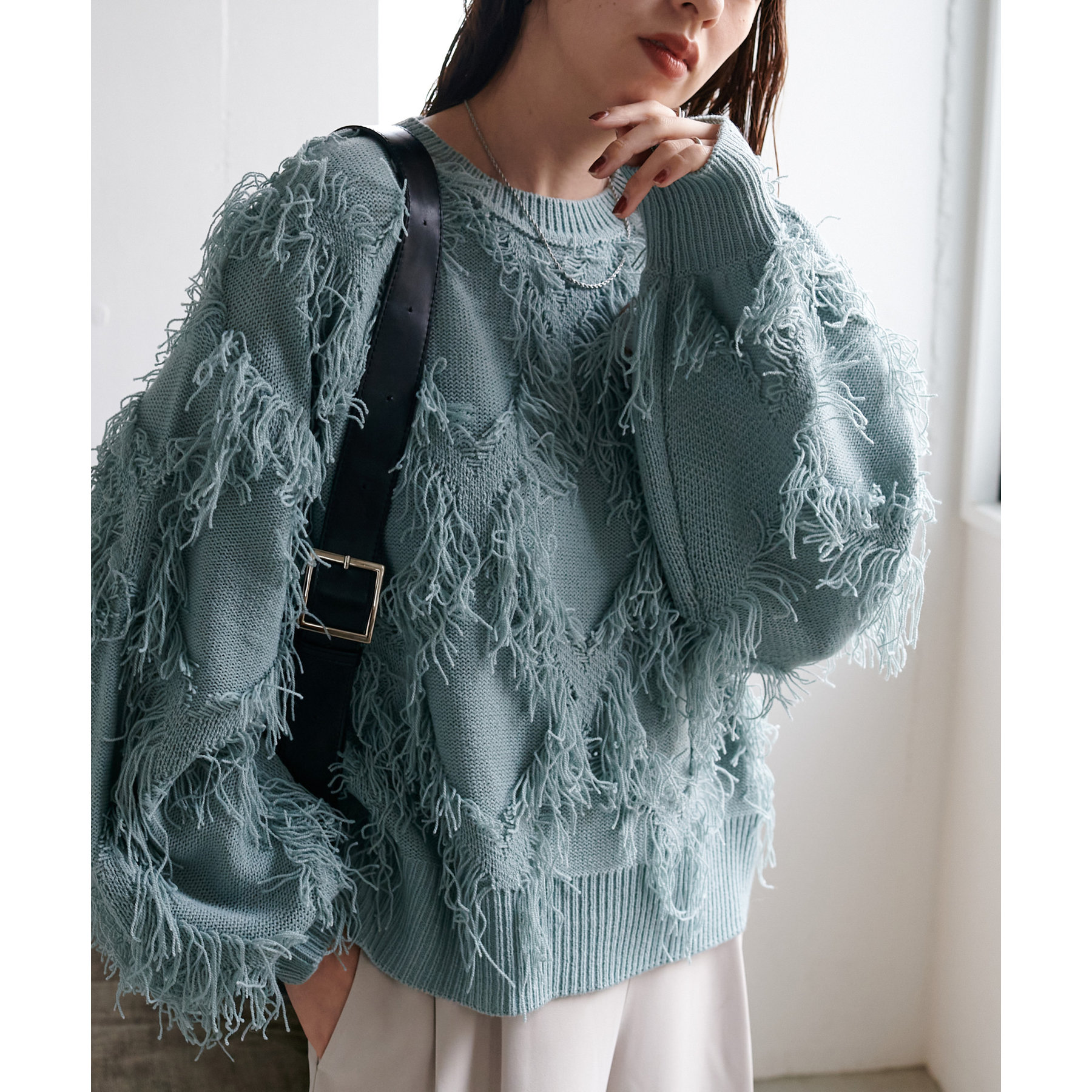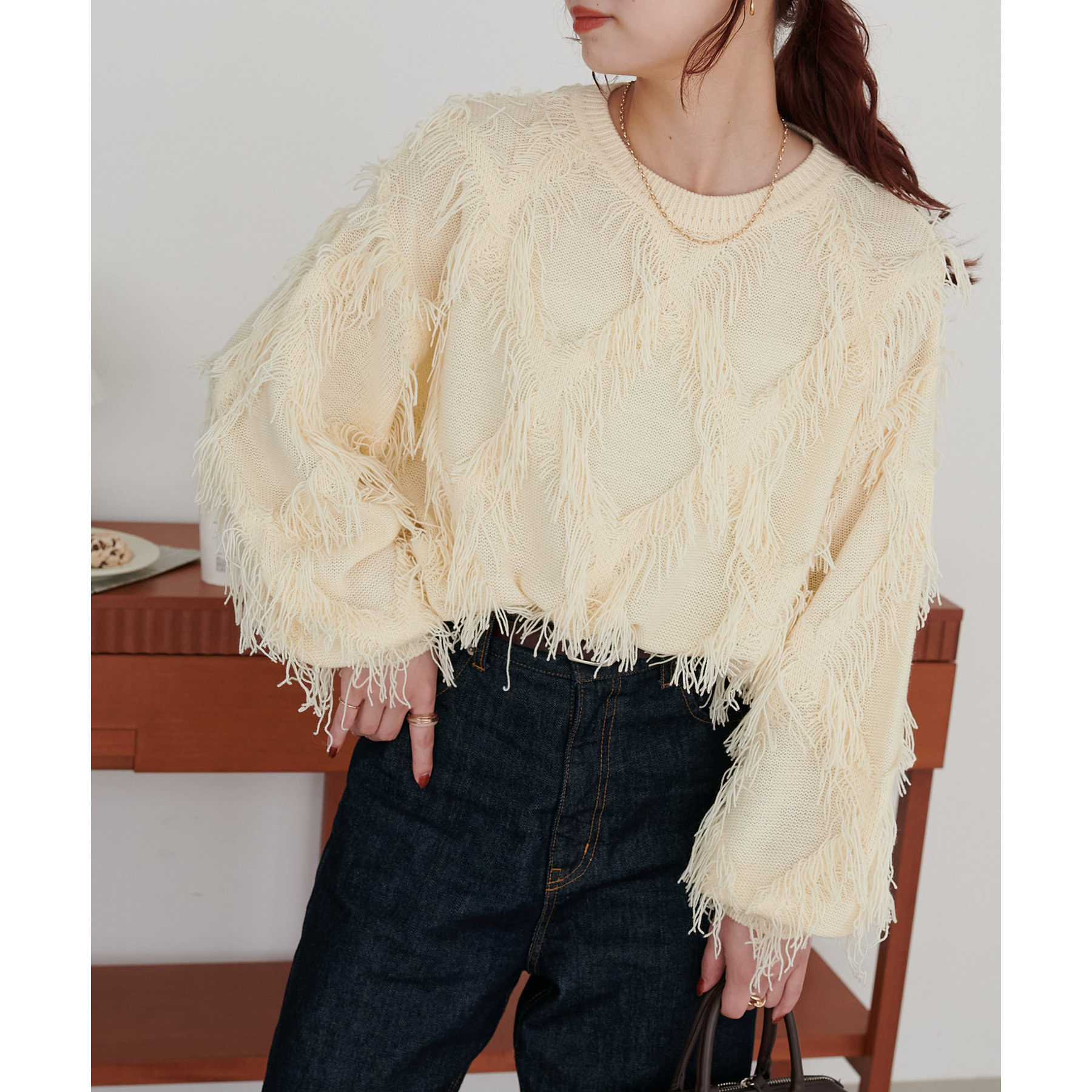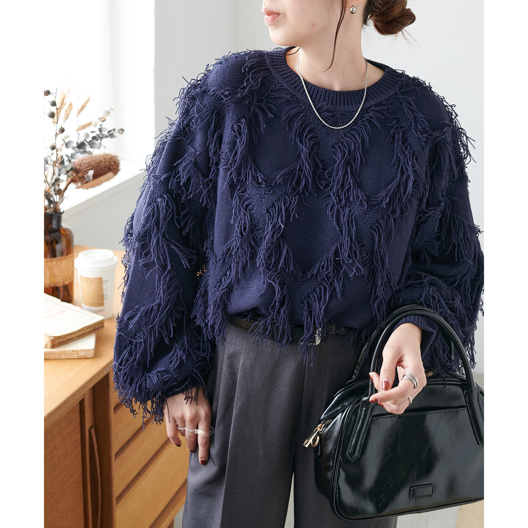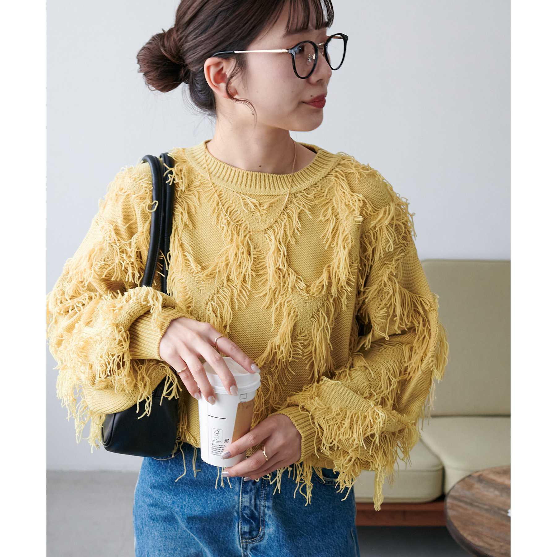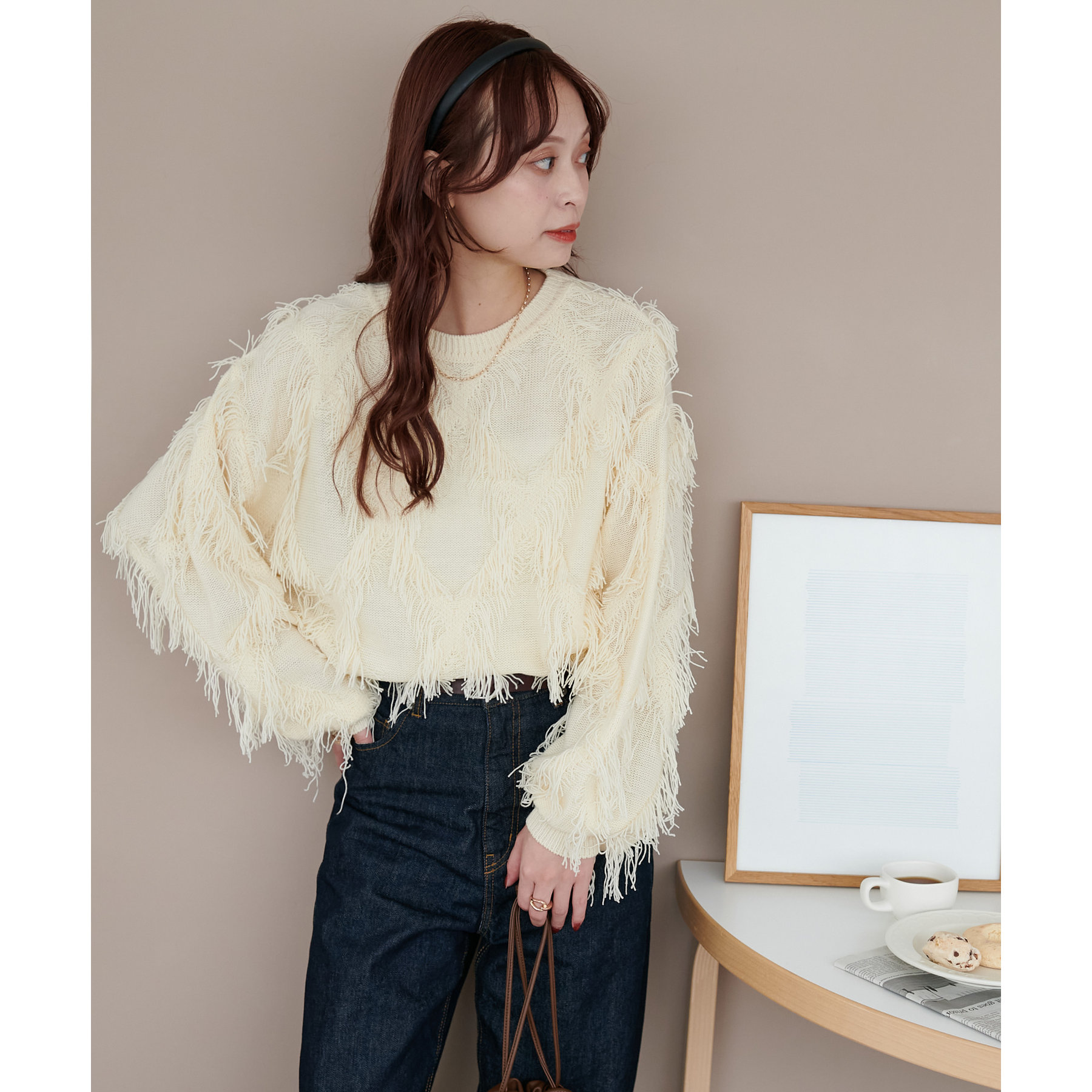 身頃や袖にふさふさしたフリンジのデザインがあしらわれどの角度から見ても目を惹くニットプルオーバー。
