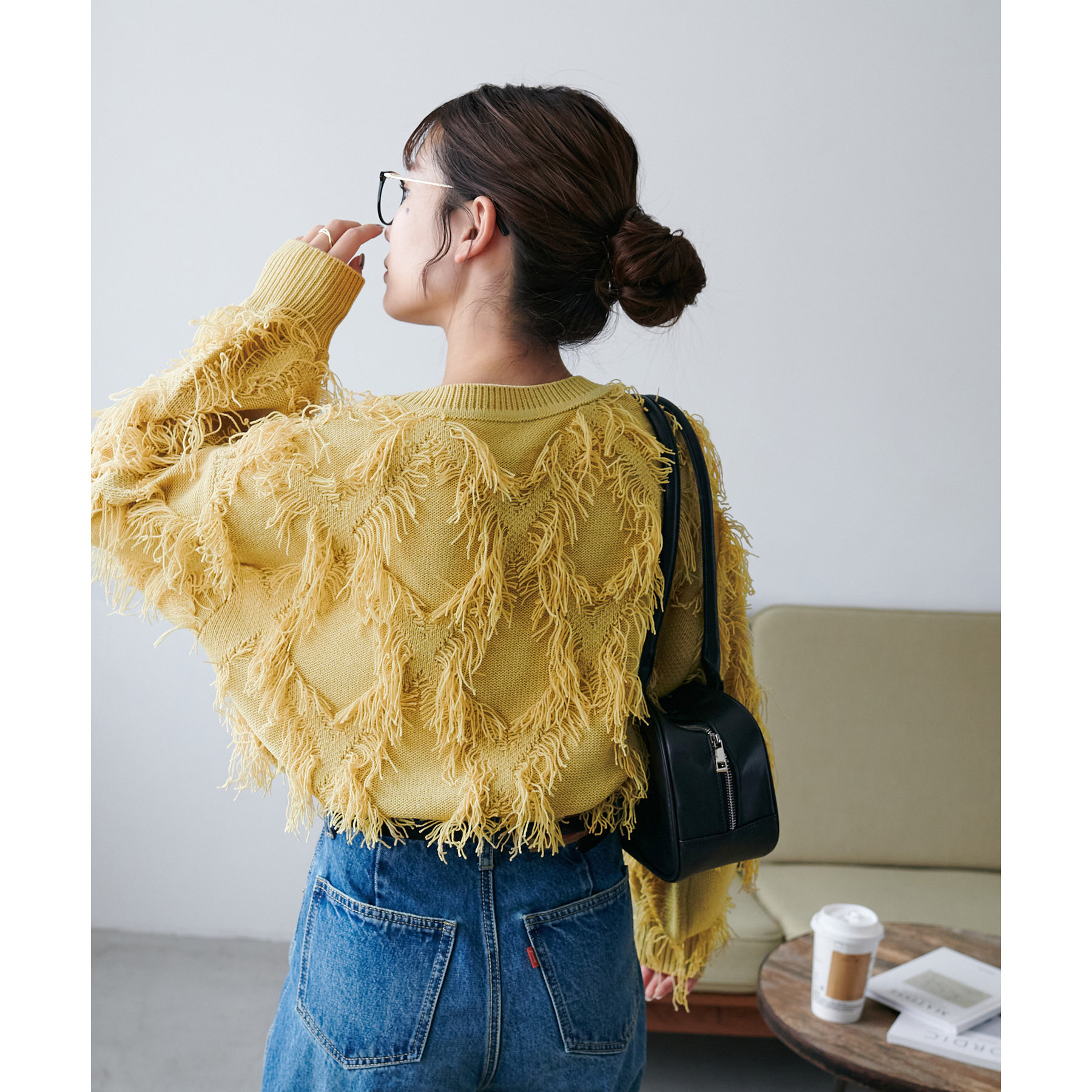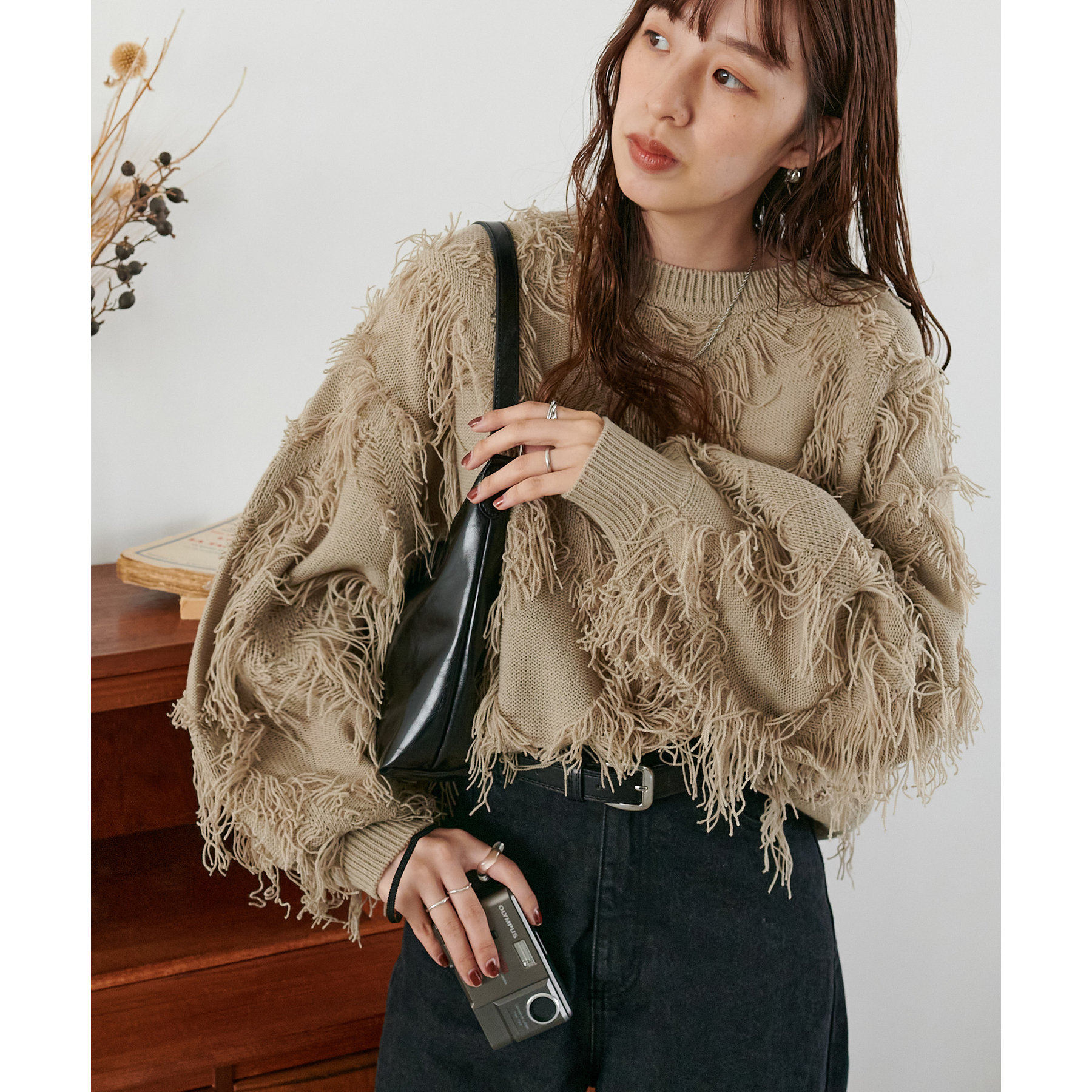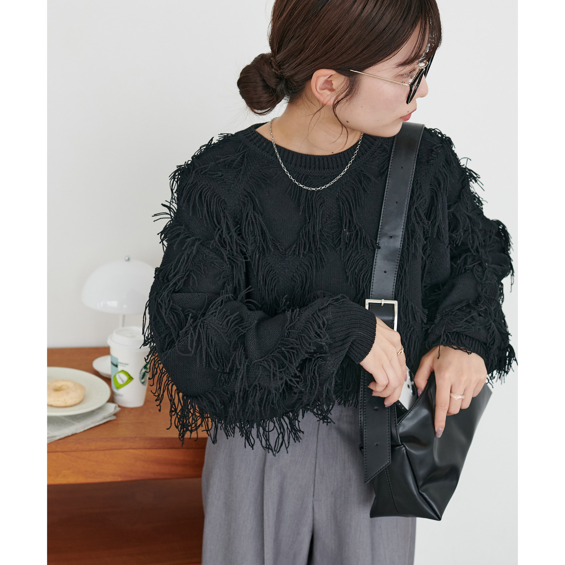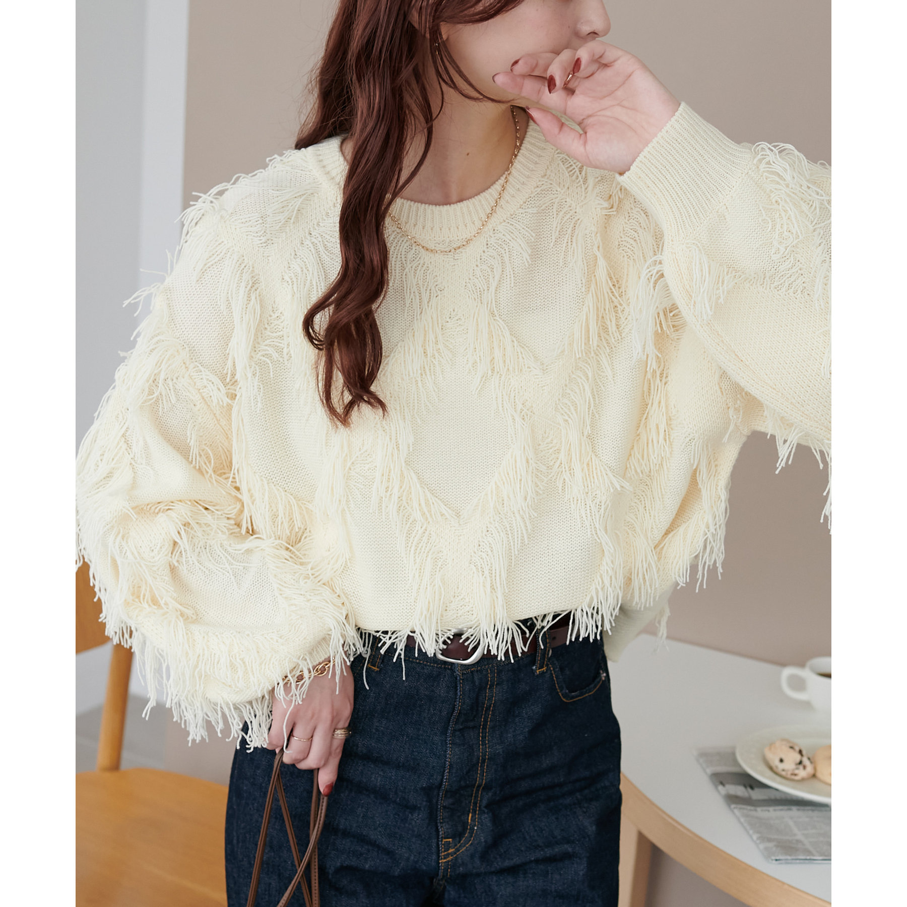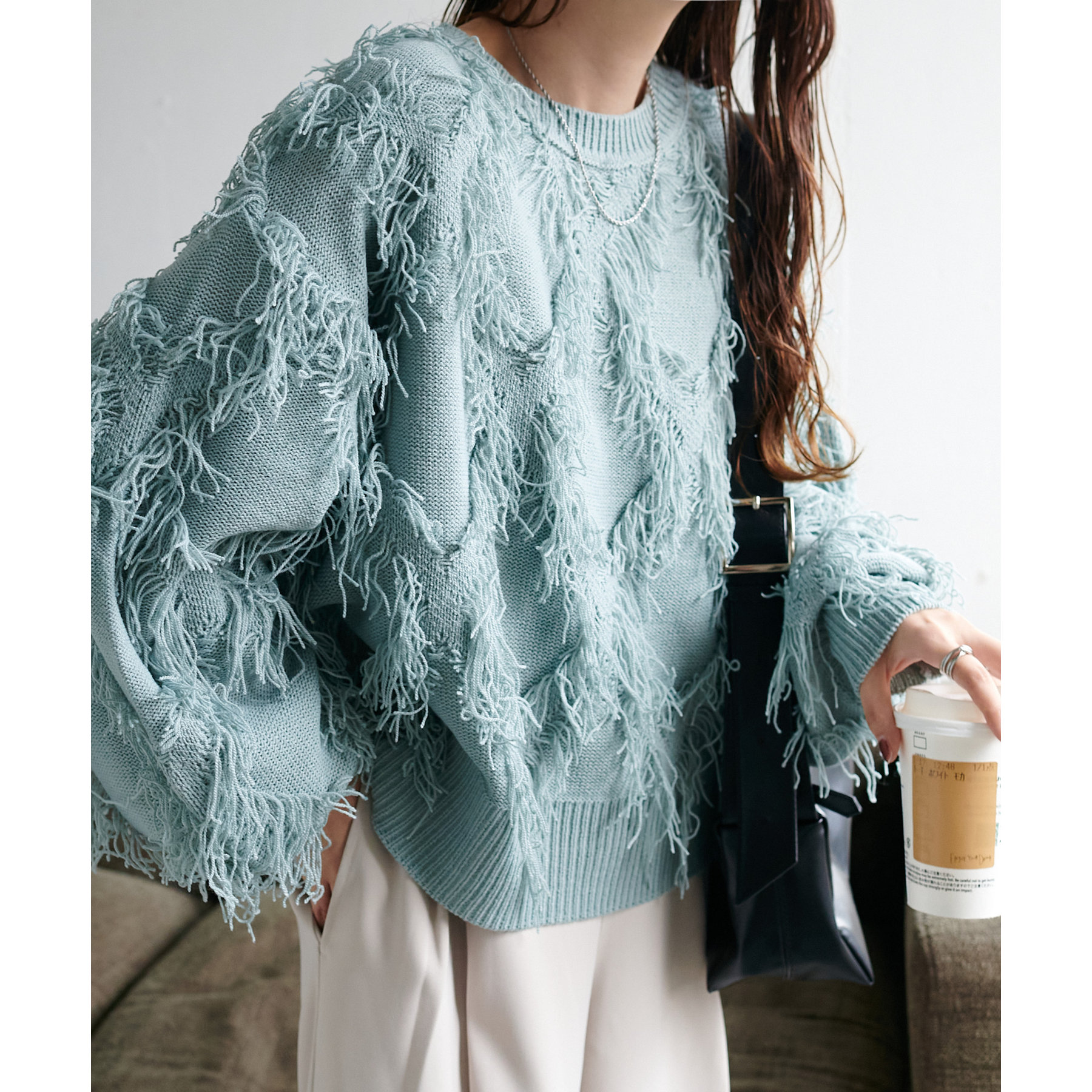 身頃や袖にふさふさしたフリンジのデザインがあしらわれどの角度から見ても目を惹くニットプルオーバー。