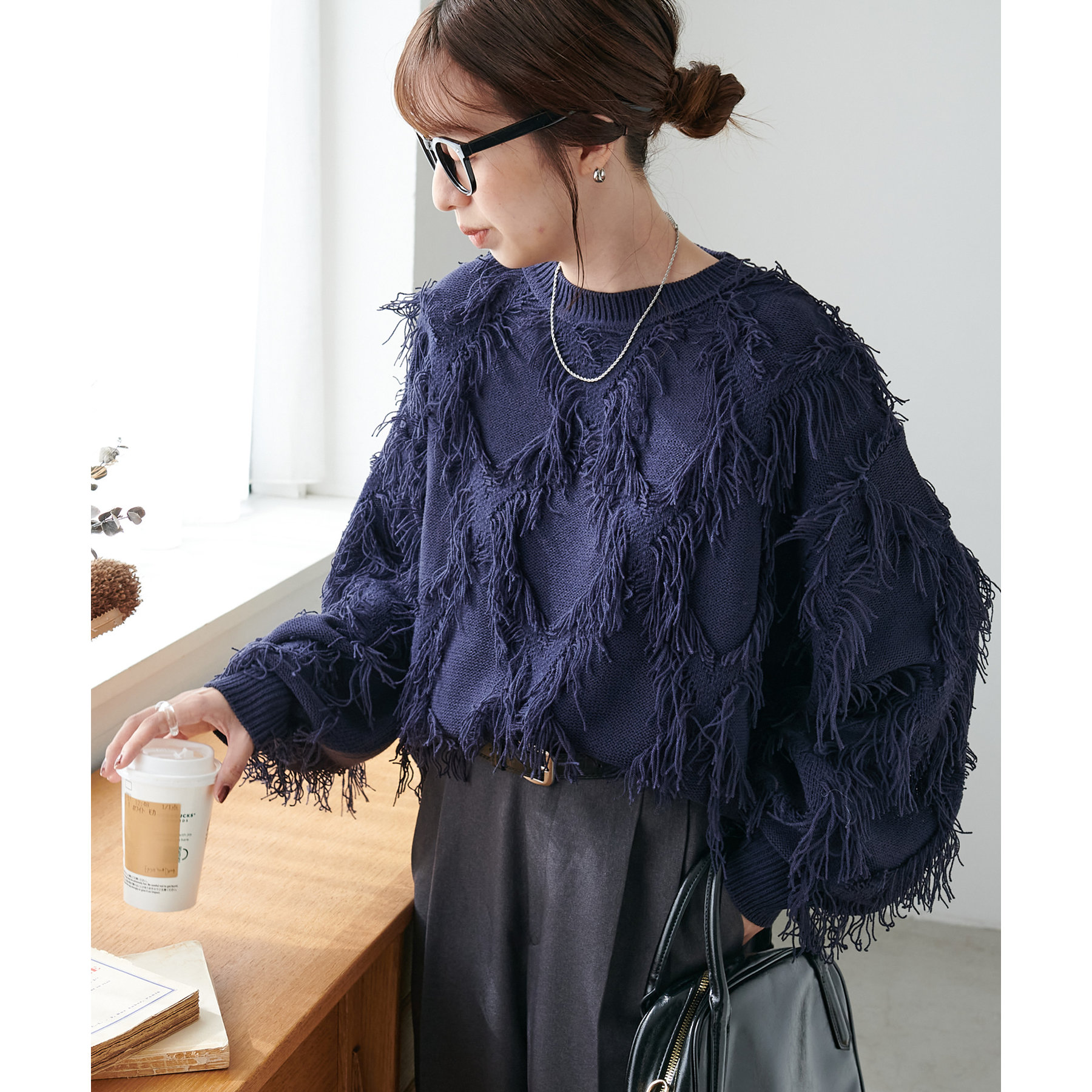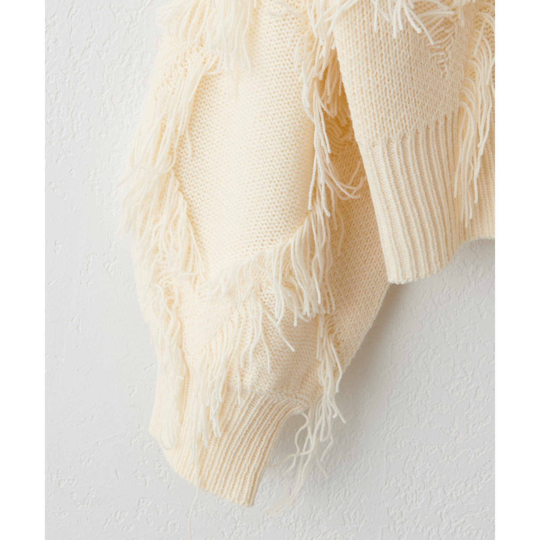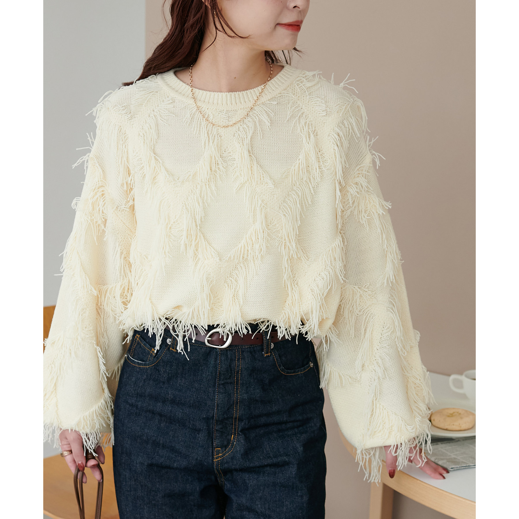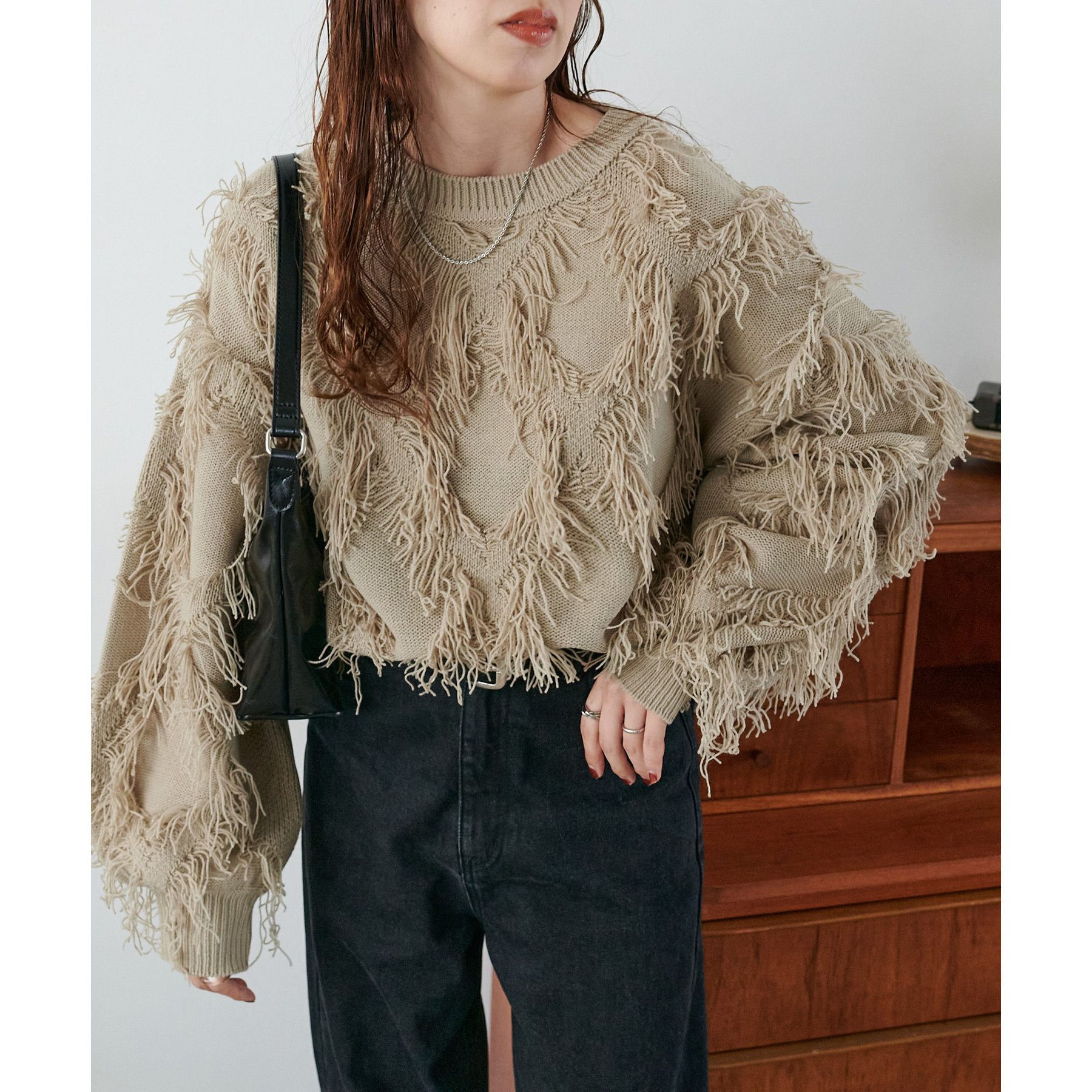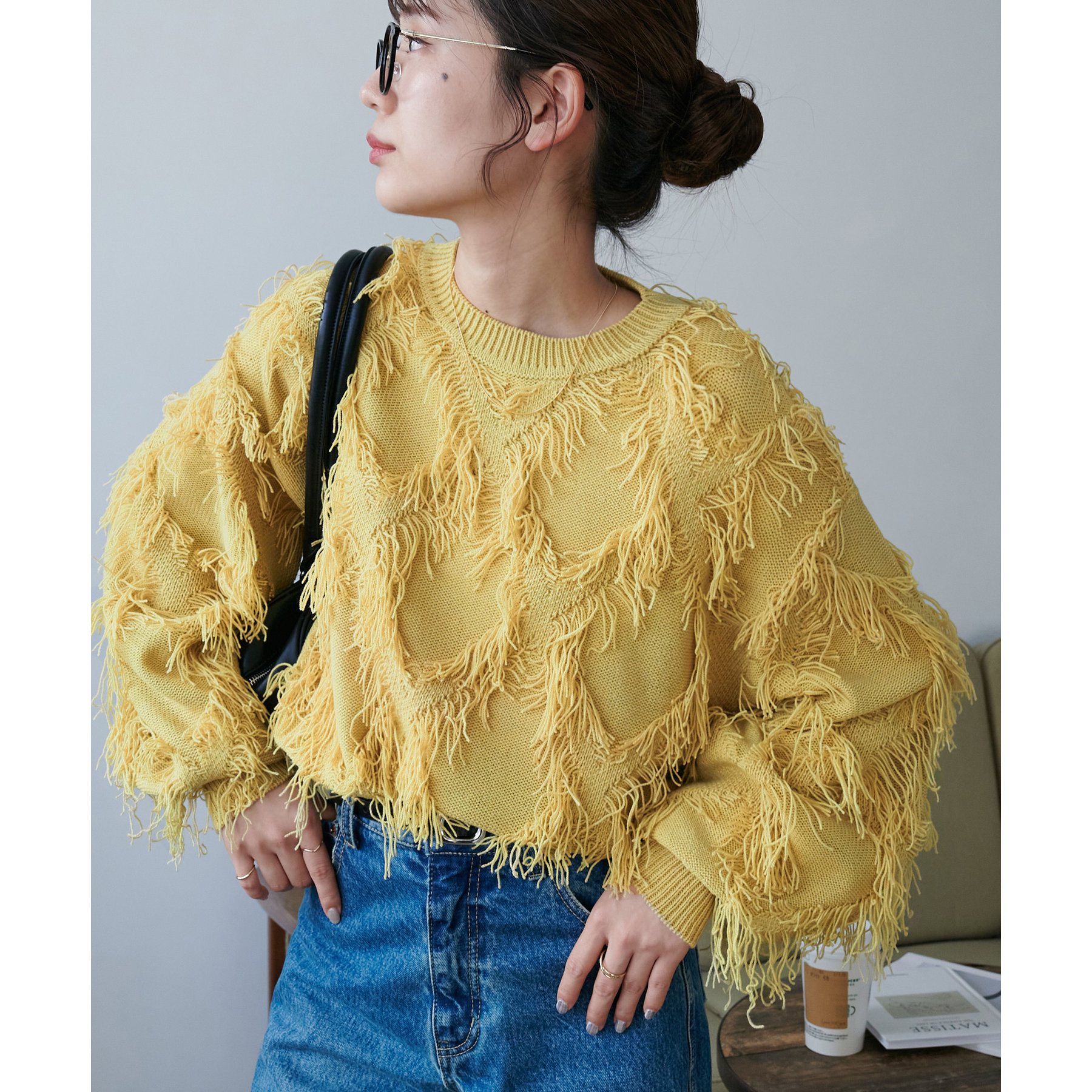 身頃や袖にふさふさしたフリンジのデザインがあしらわれどの角度から見ても目を惹くニットプルオーバー。