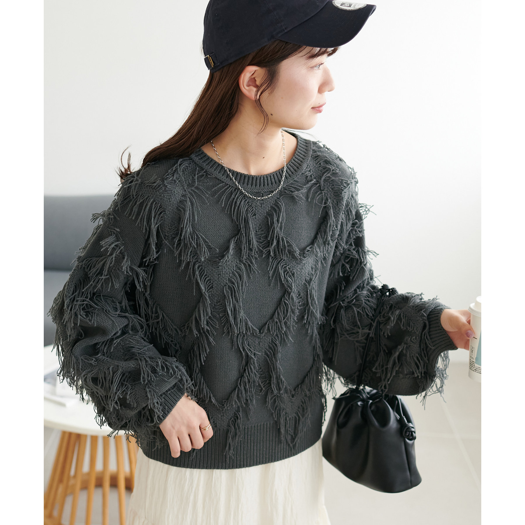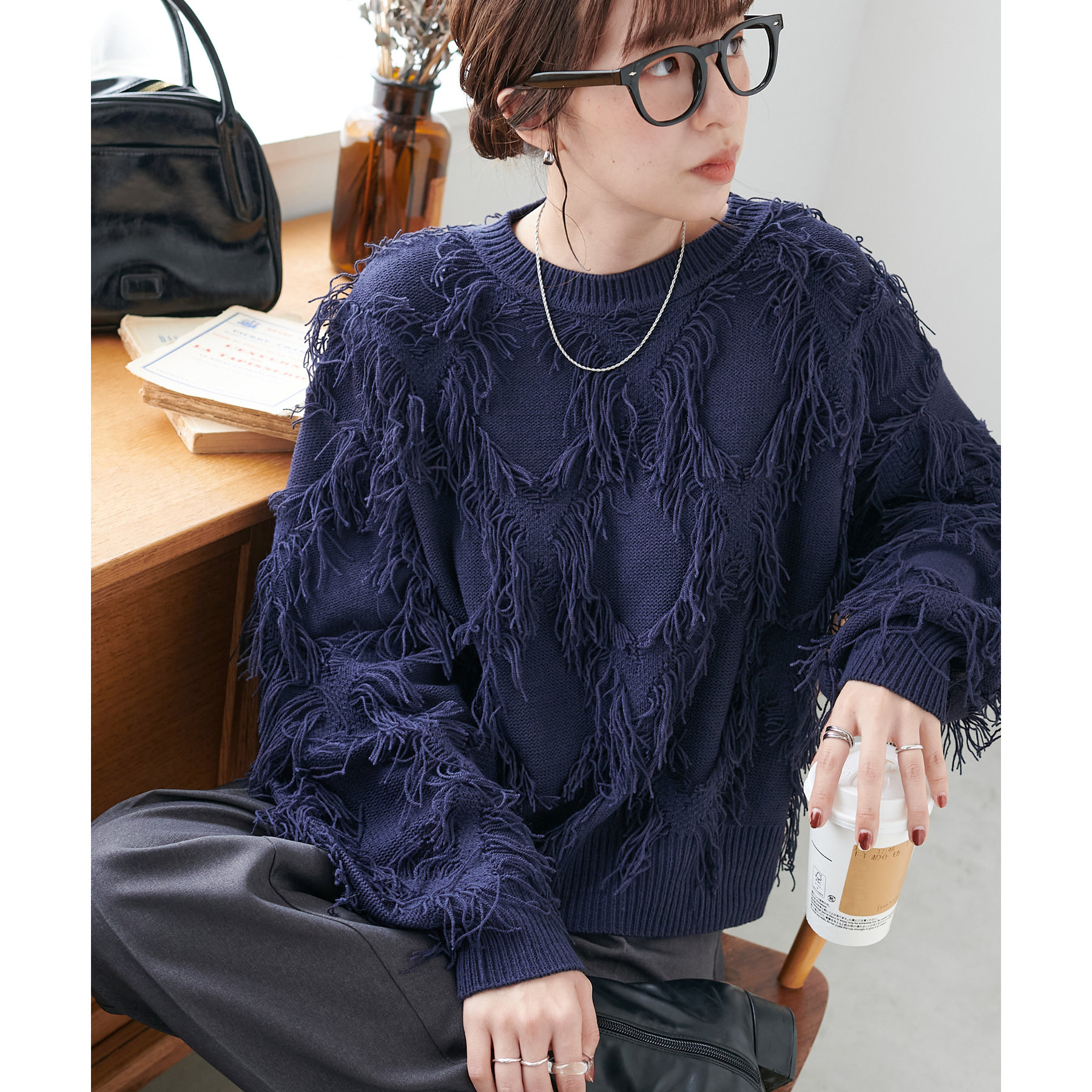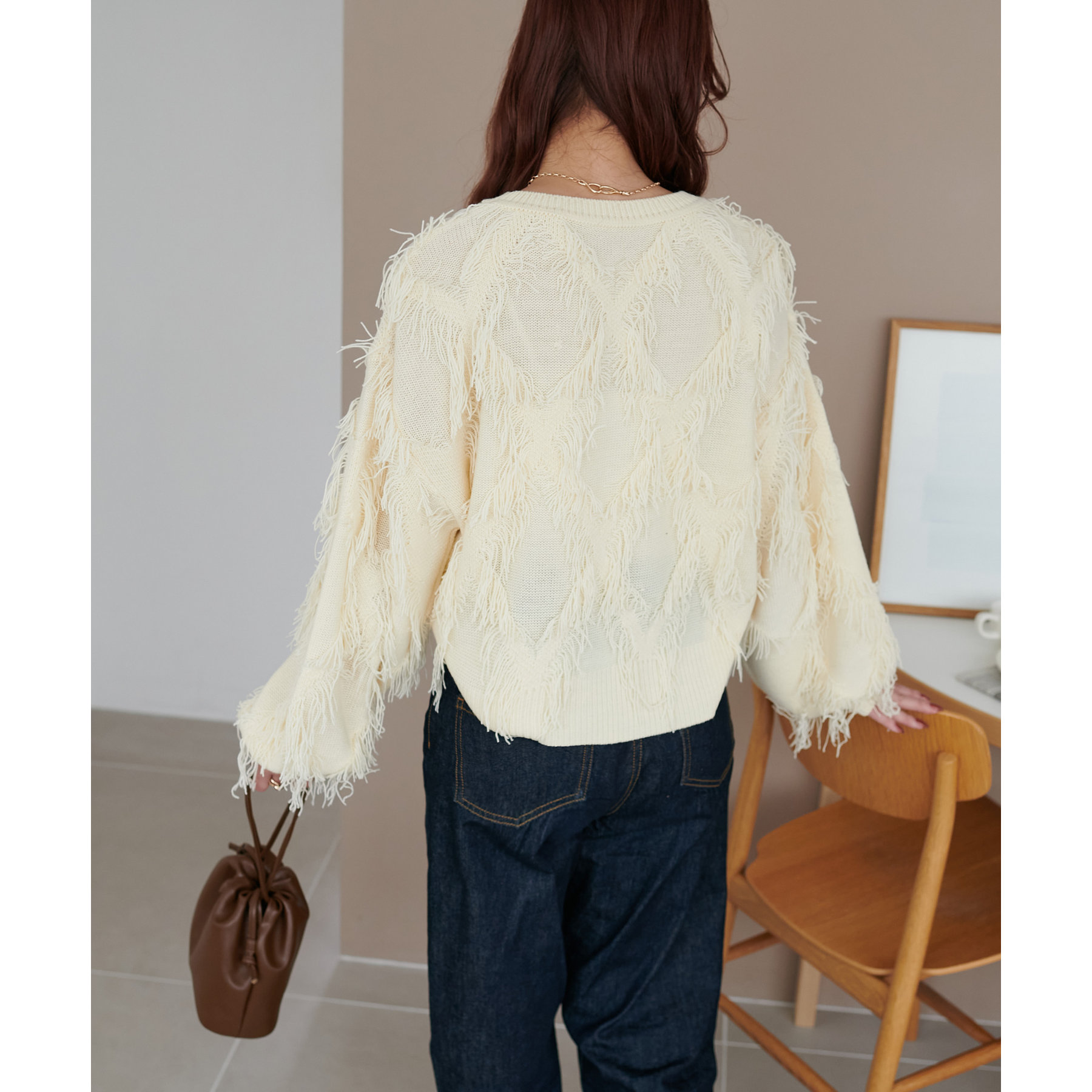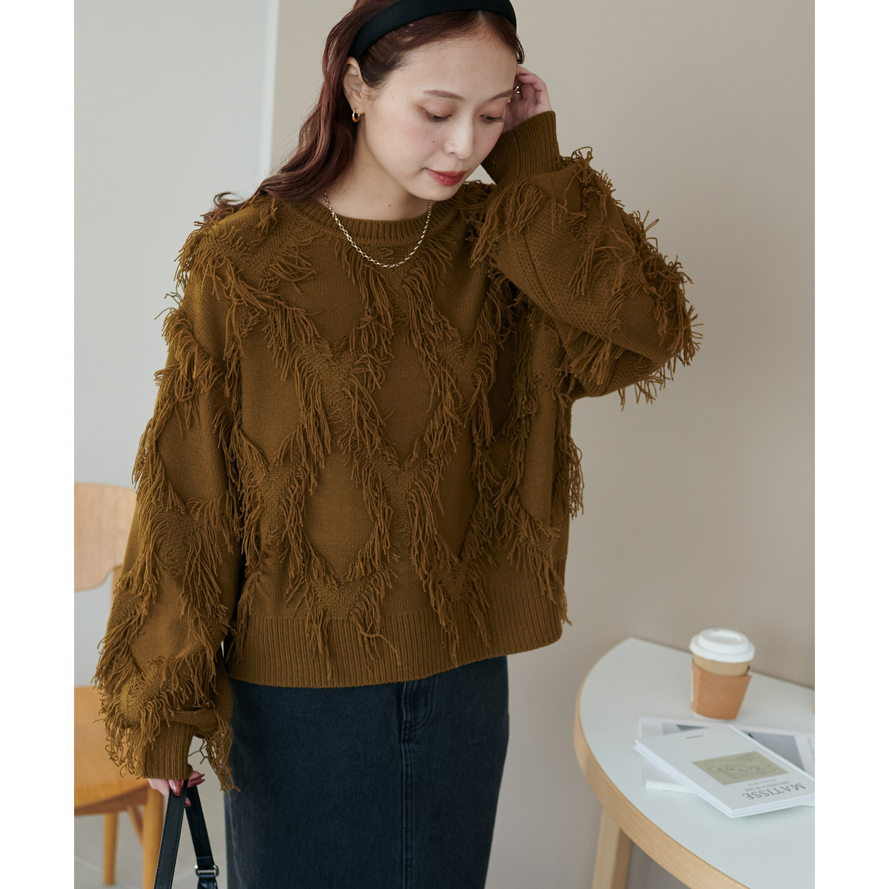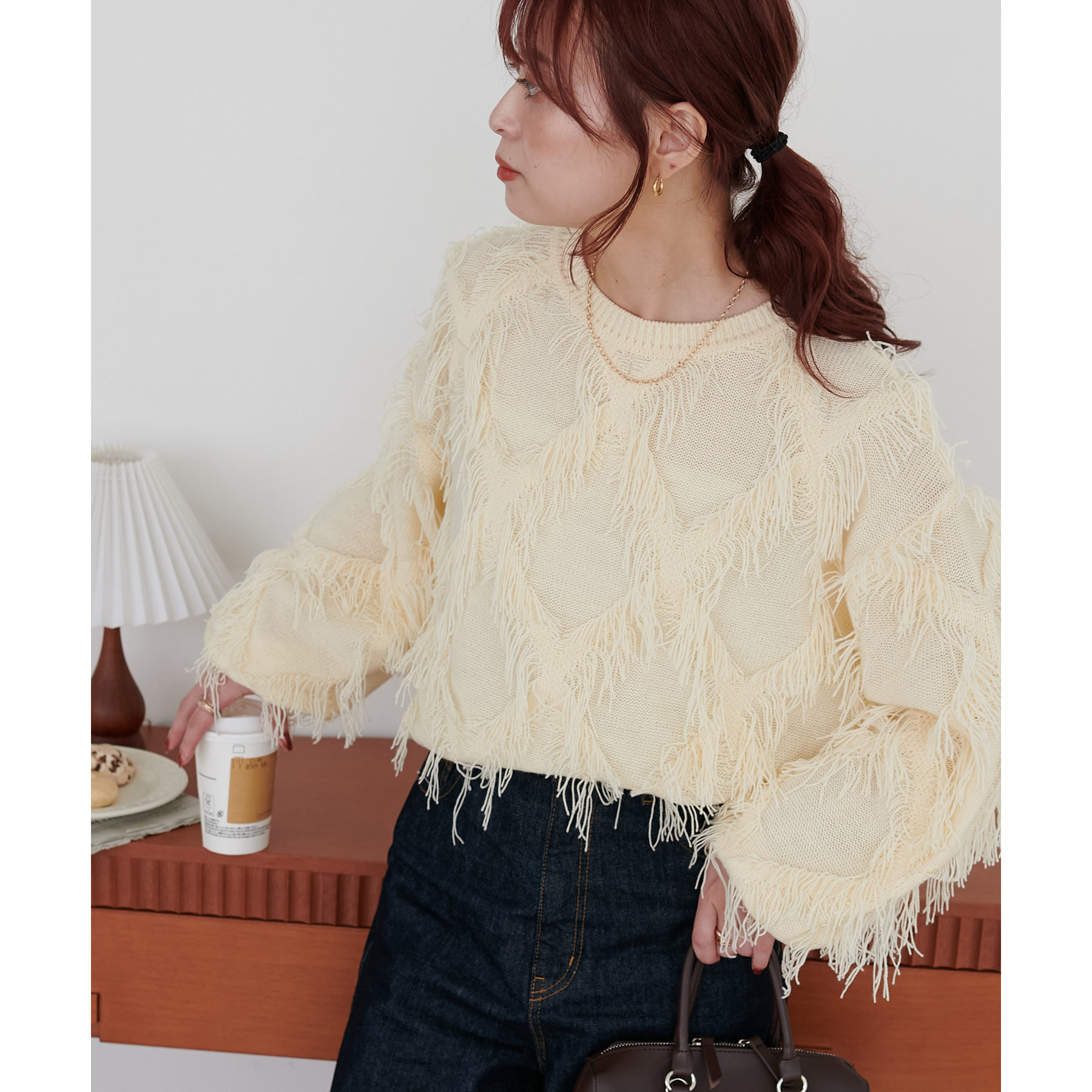 身頃や袖にふさふさしたフリンジのデザインがあしらわれどの角度から見ても目を惹くニットプルオーバー。