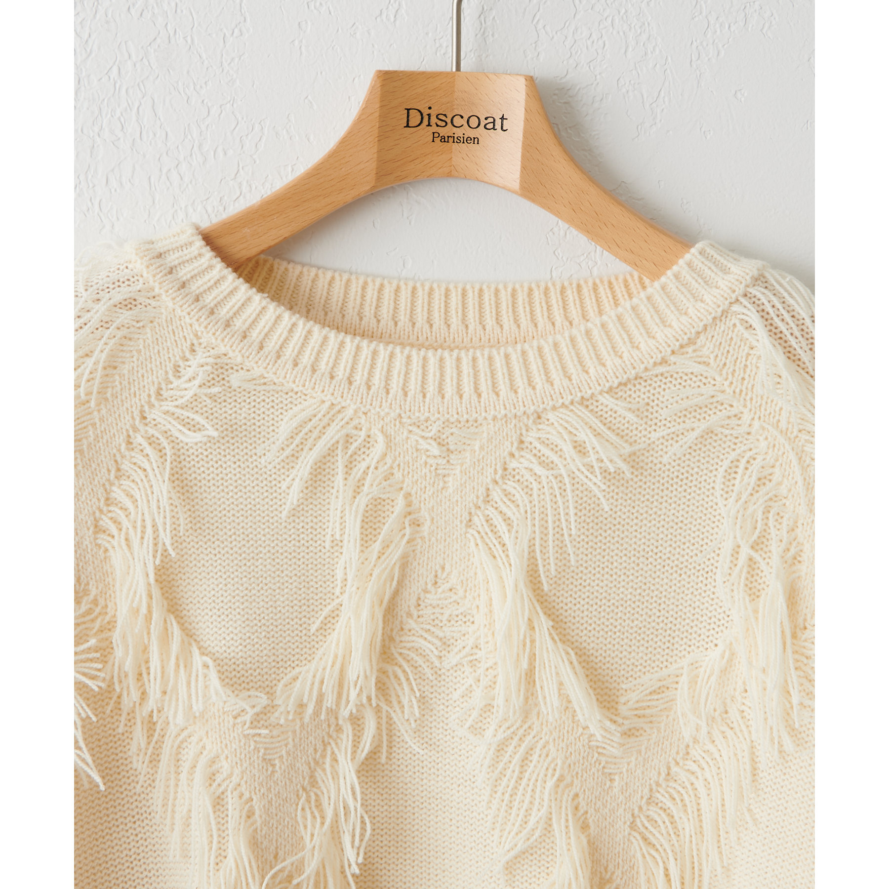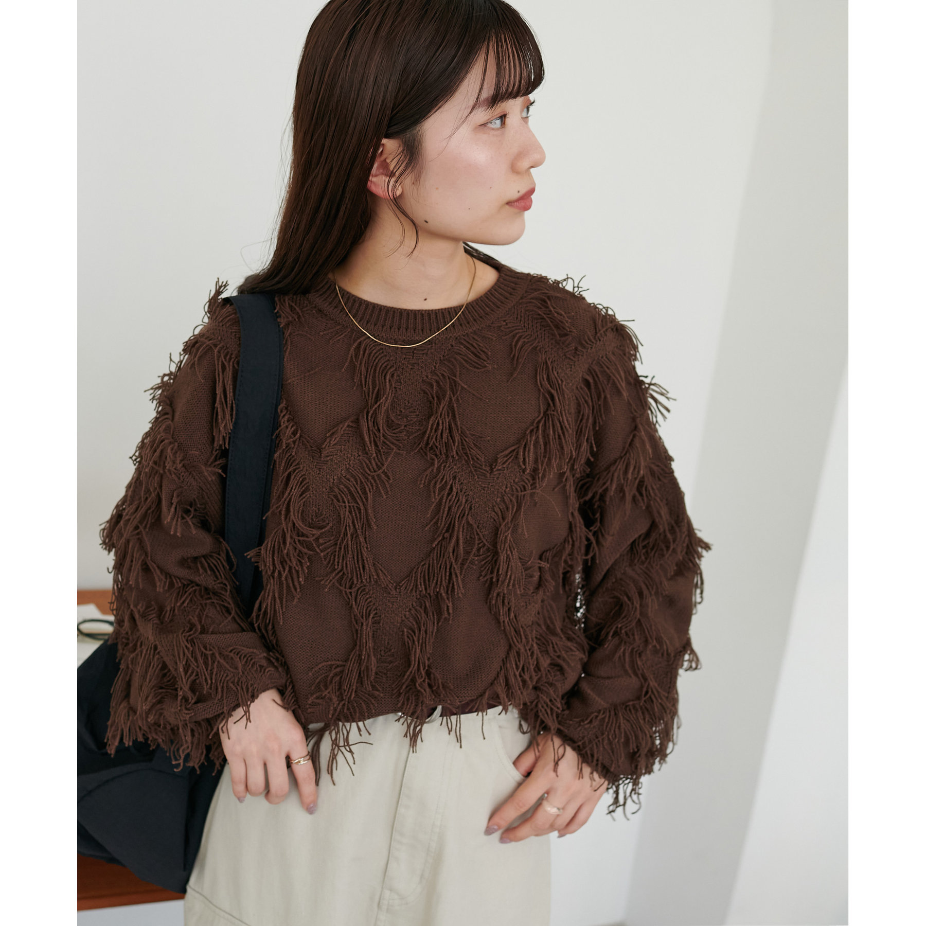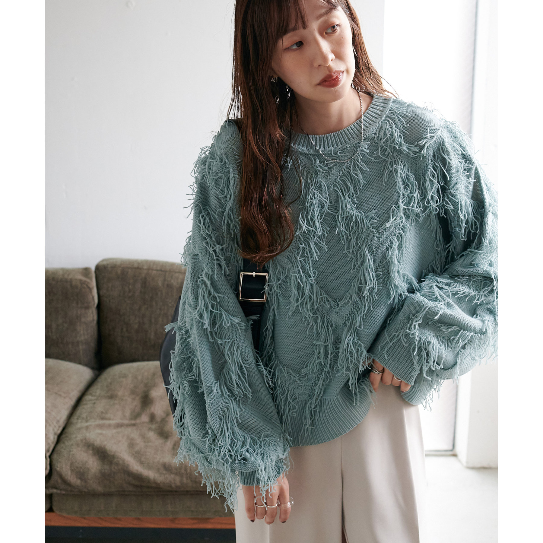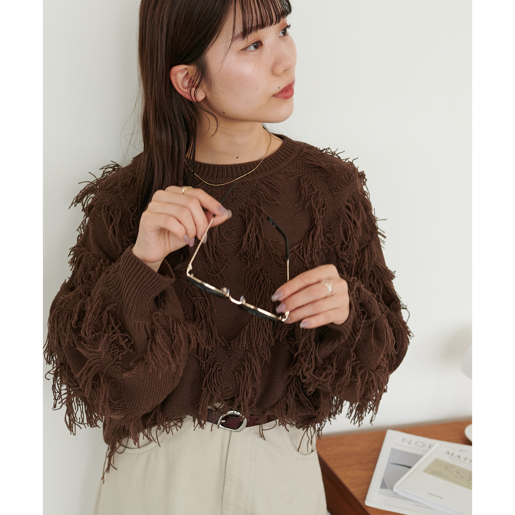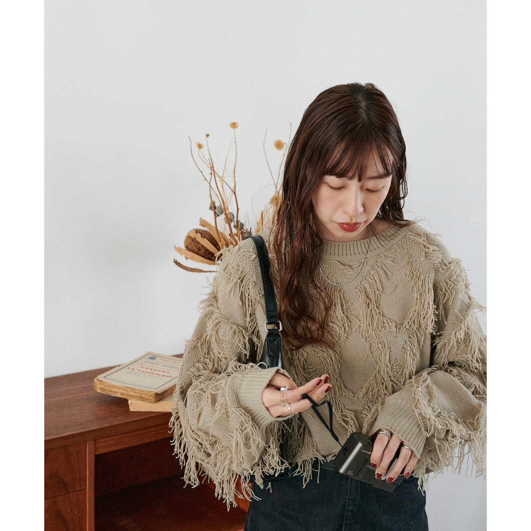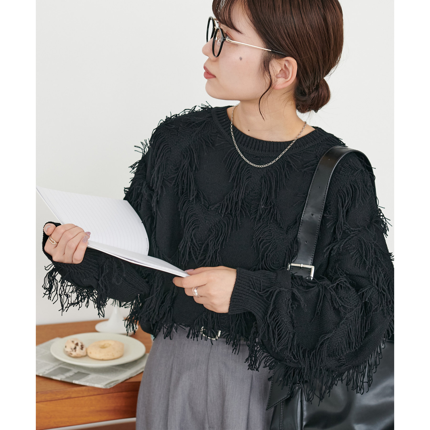 身頃や袖にふさふさしたフリンジのデザインがあしらわれどの角度から見ても目を惹くニットプルオーバー。