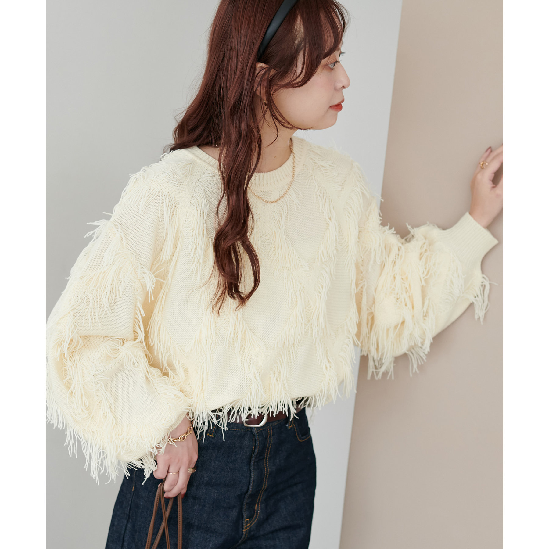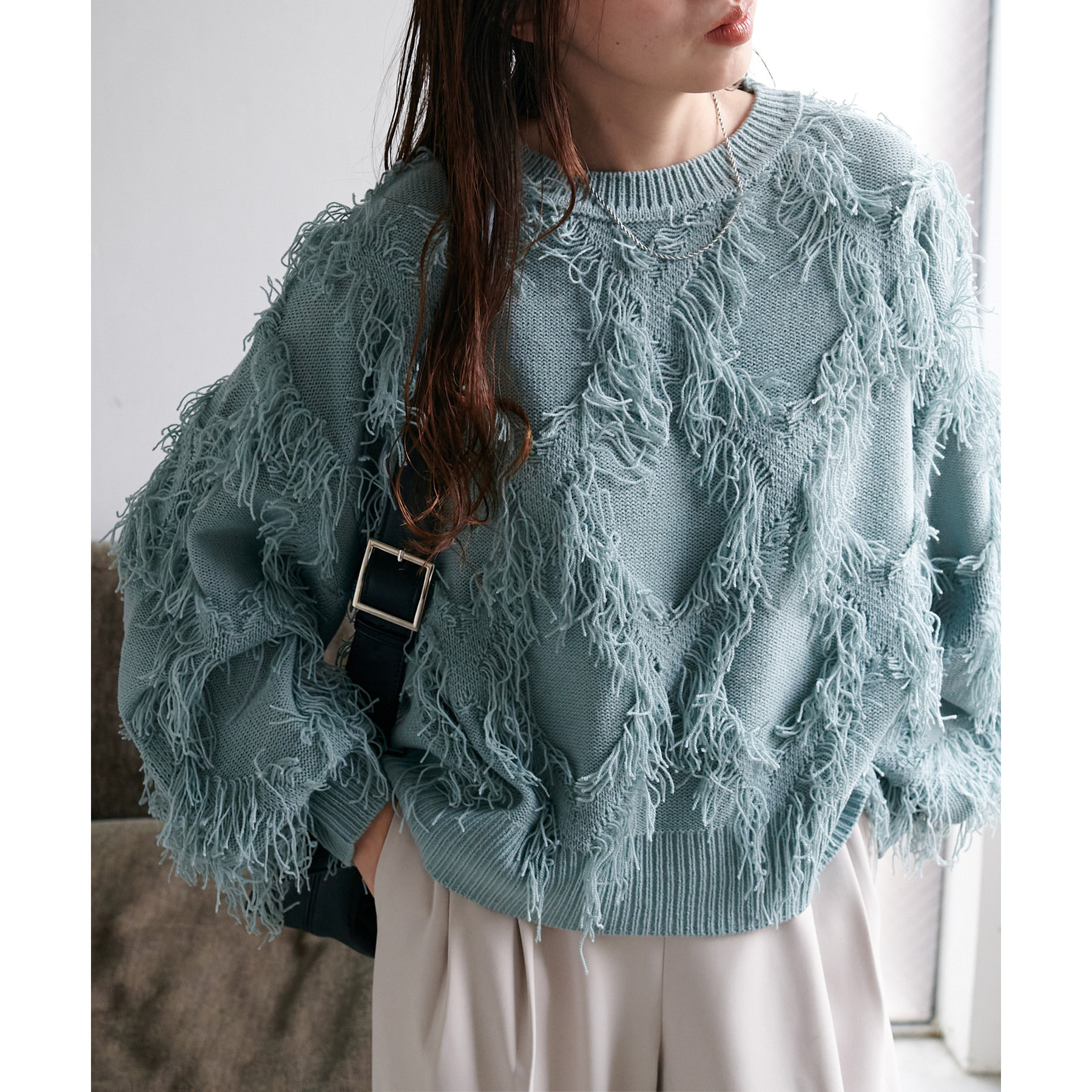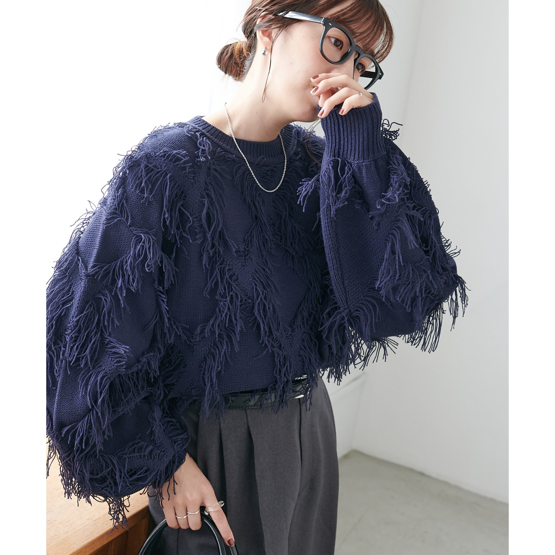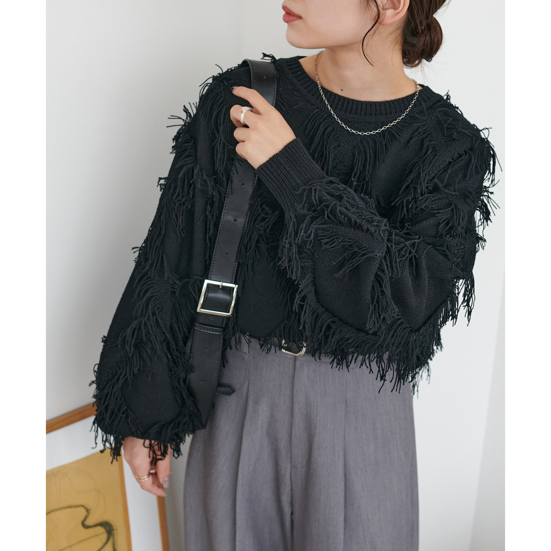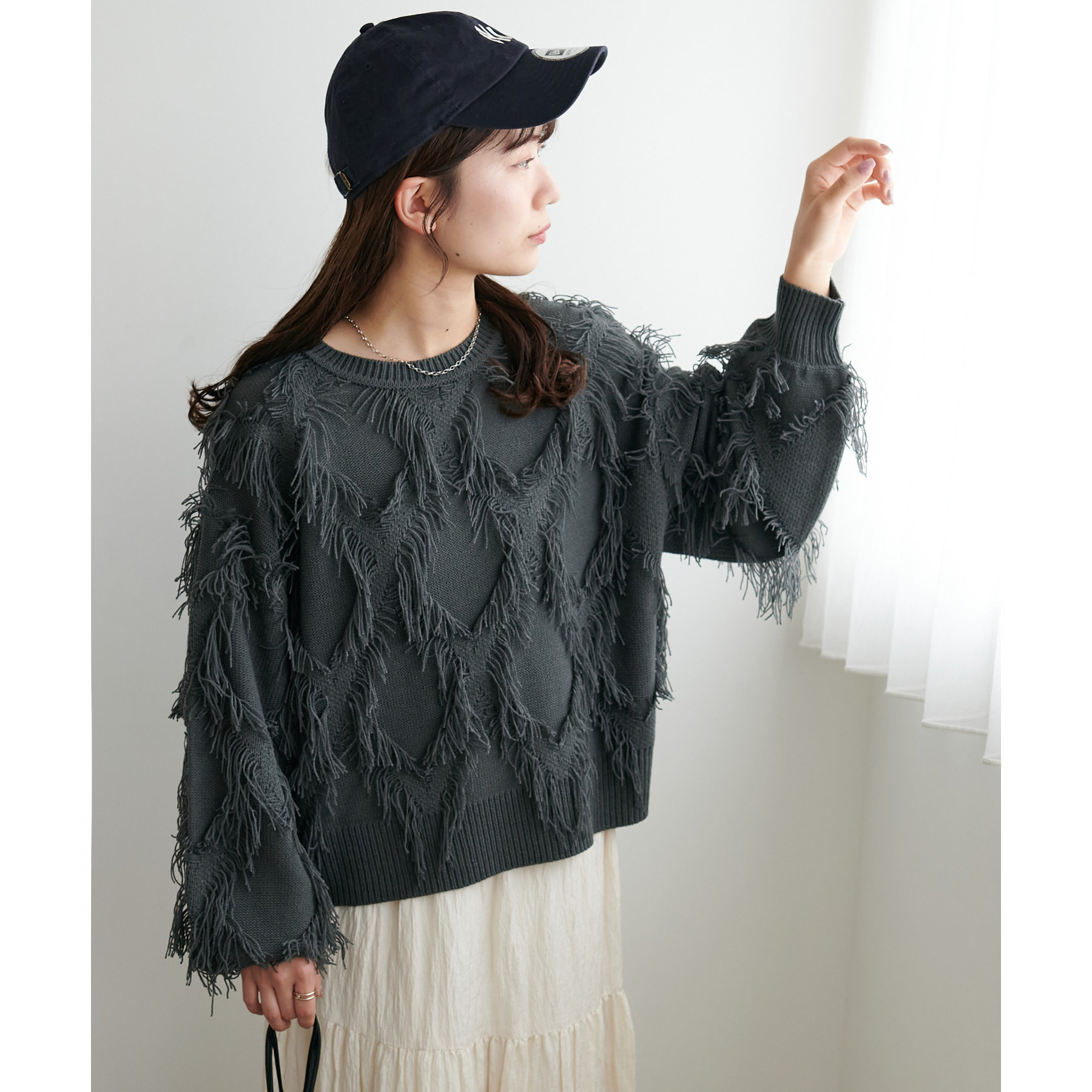 身頃や袖にふさふさしたフリンジのデザインがあしらわれどの角度から見ても目を惹くニットプルオーバー。
