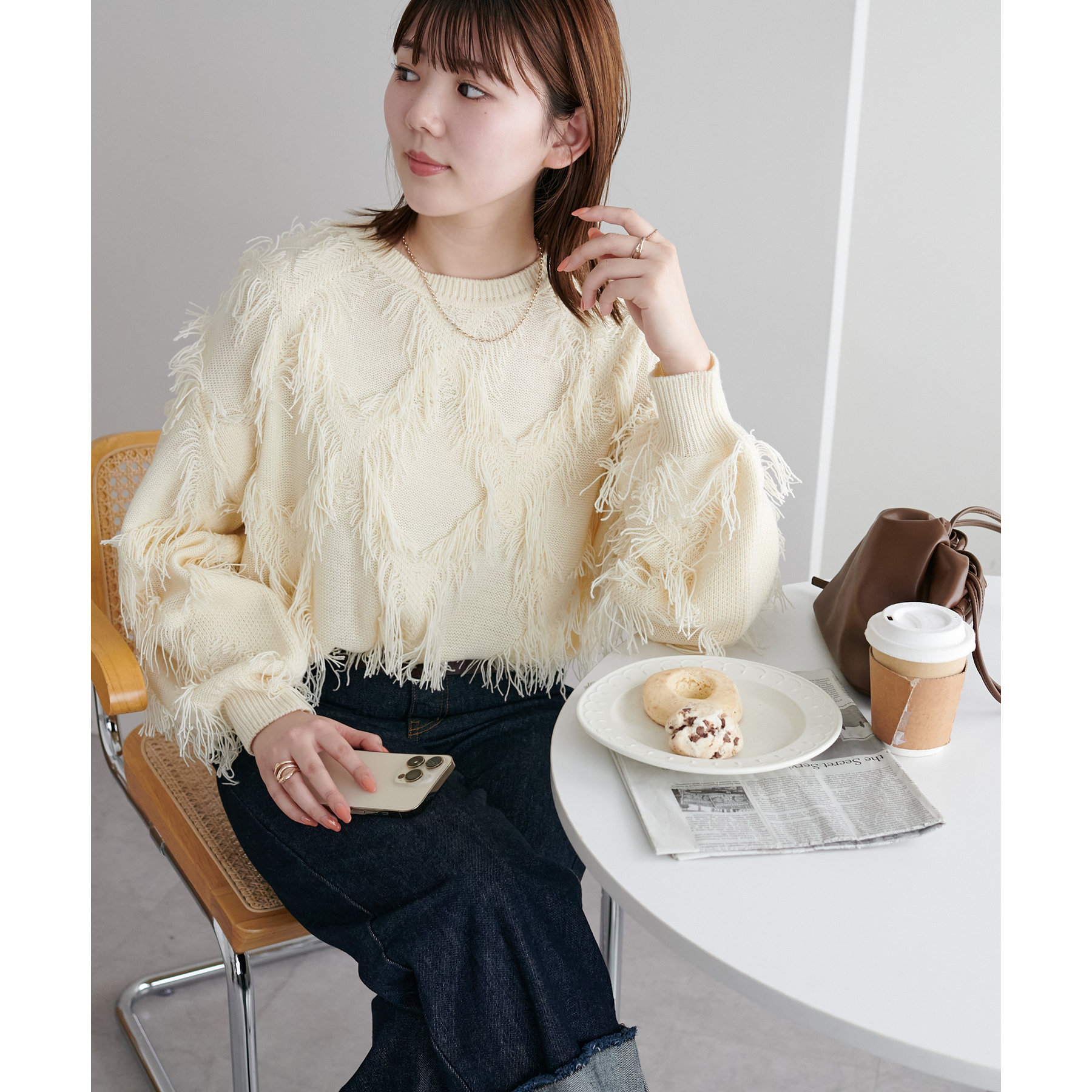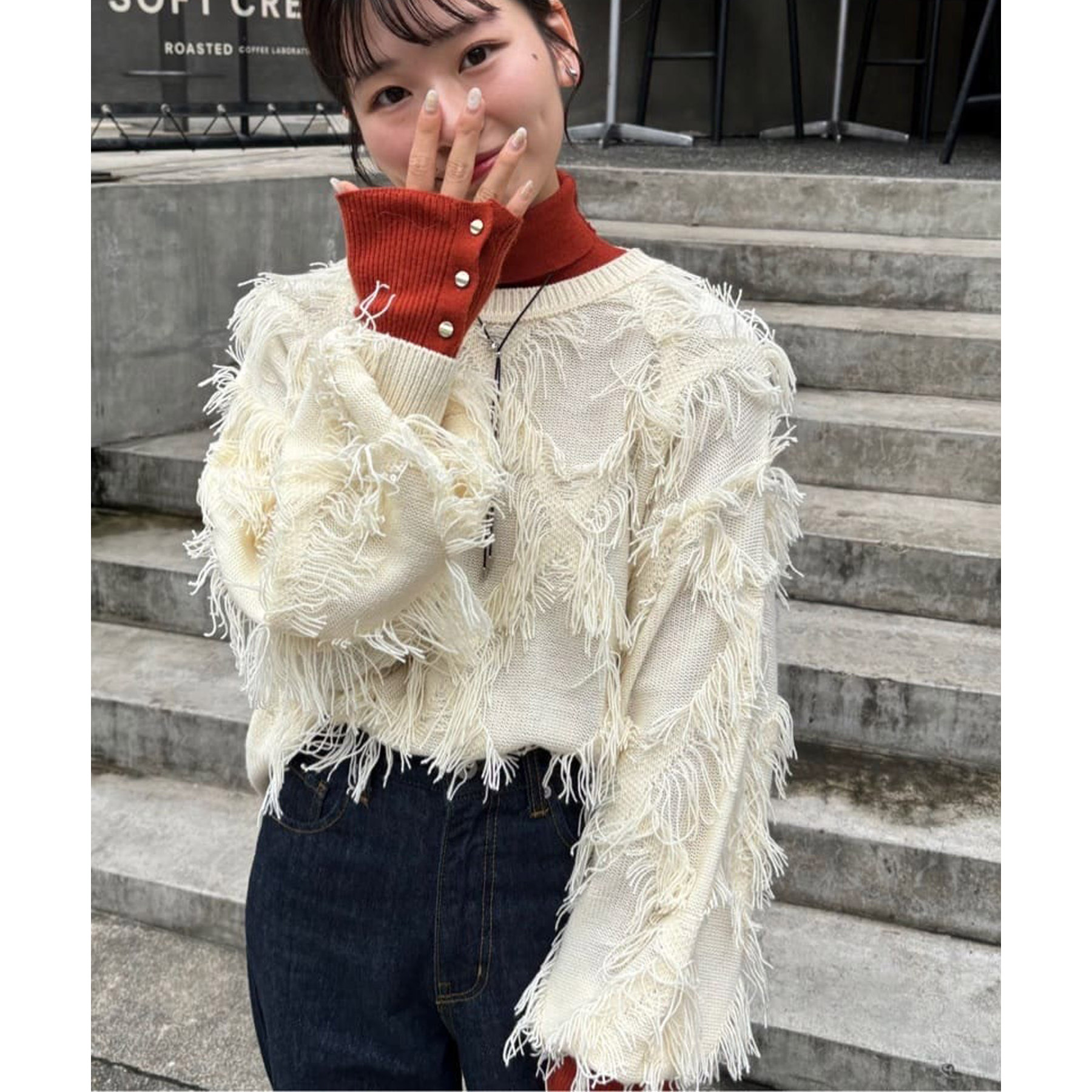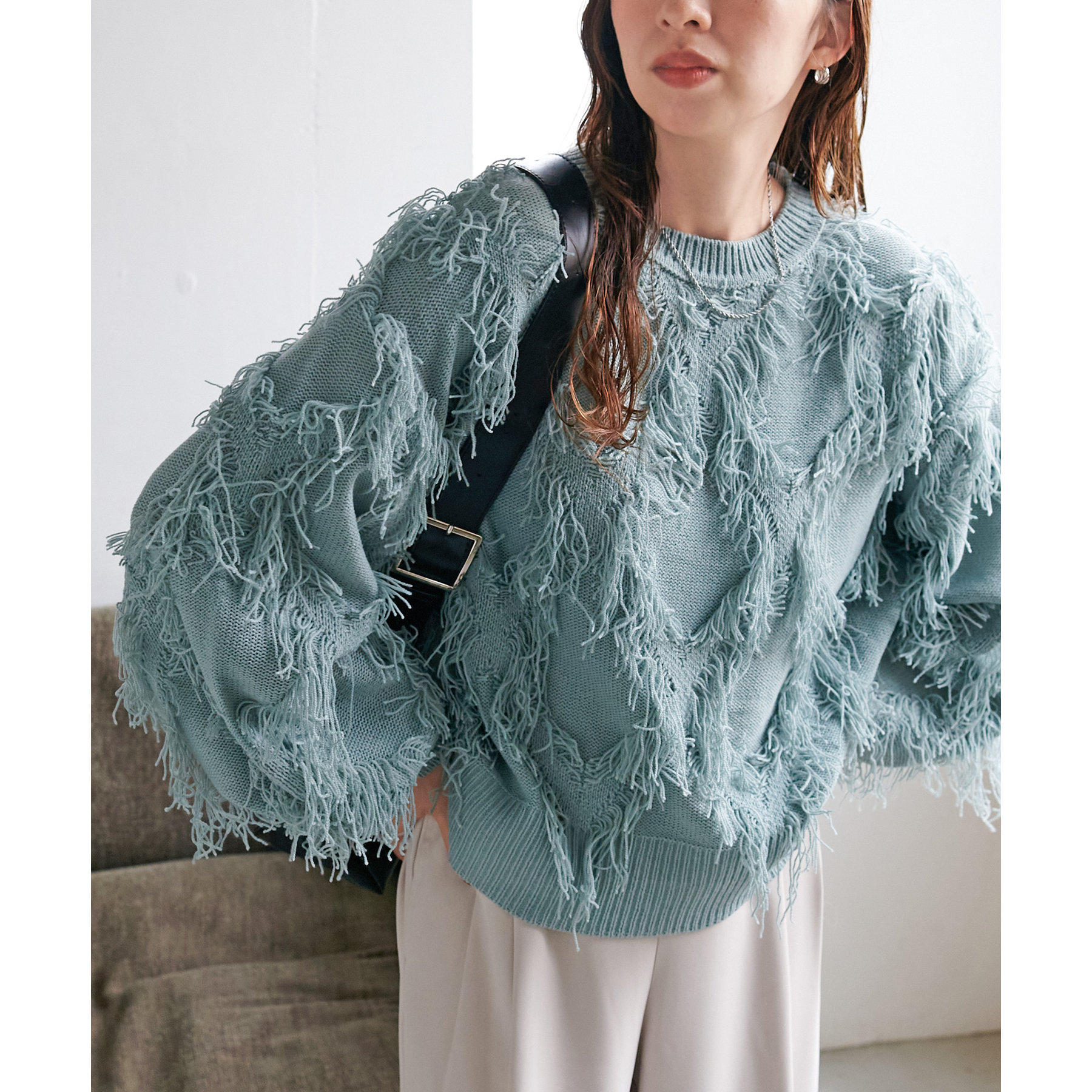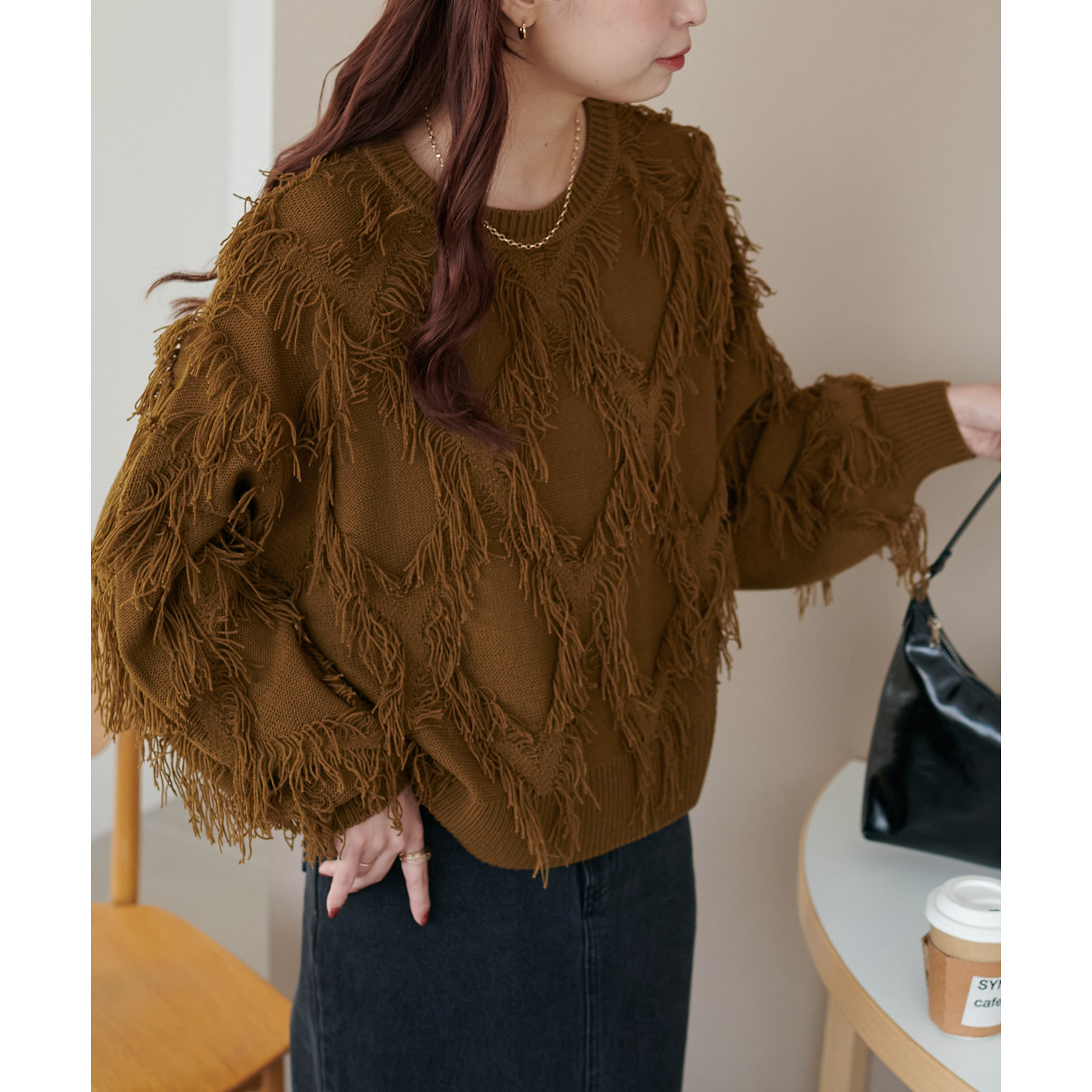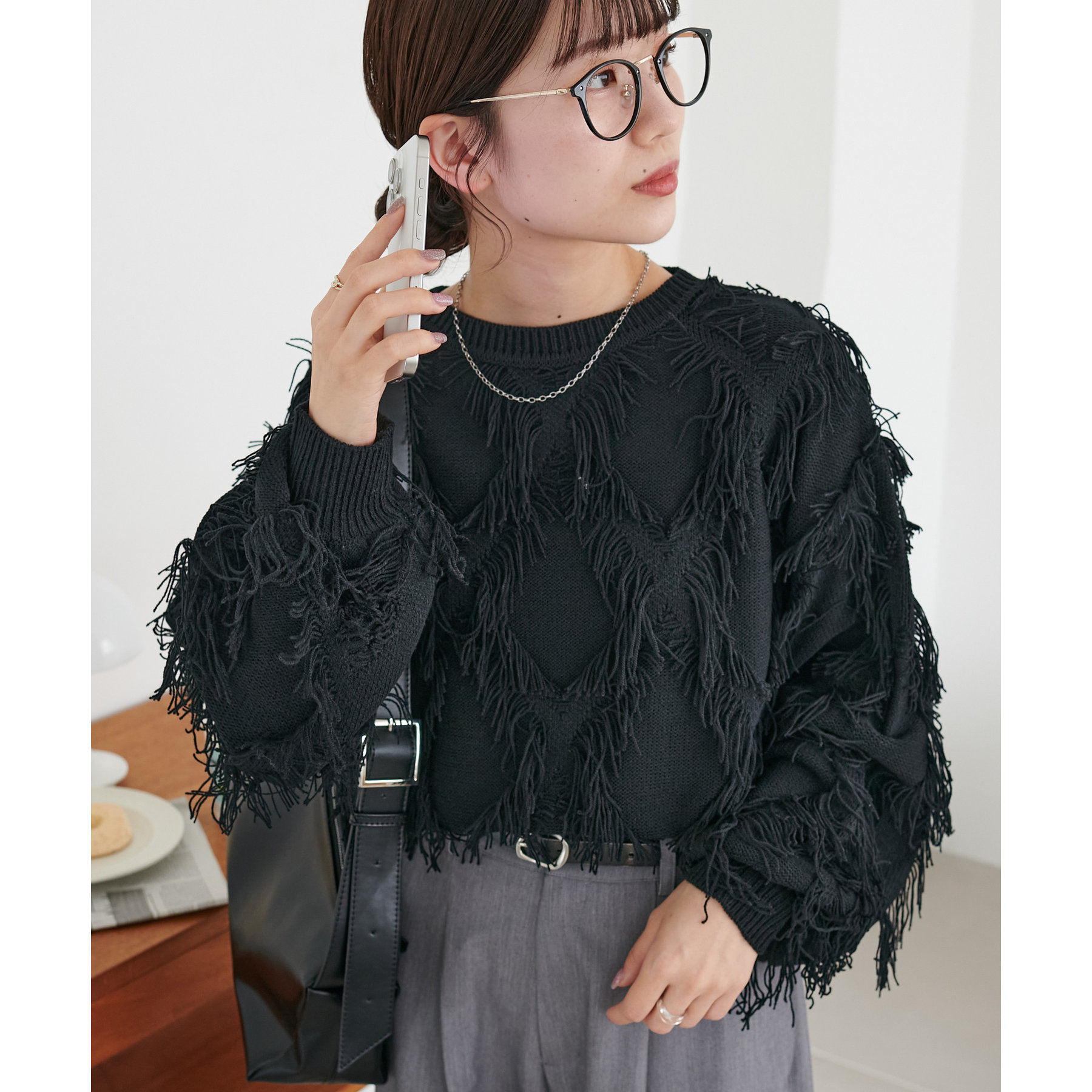 身頃や袖にふさふさしたフリンジのデザインがあしらわれどの角度から見ても目を惹くニットプルオーバー。