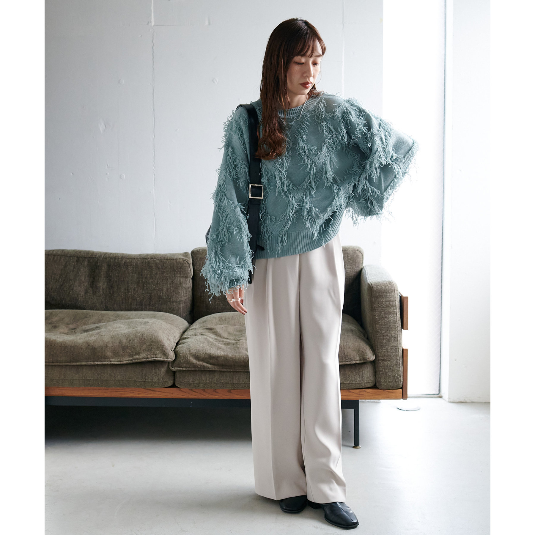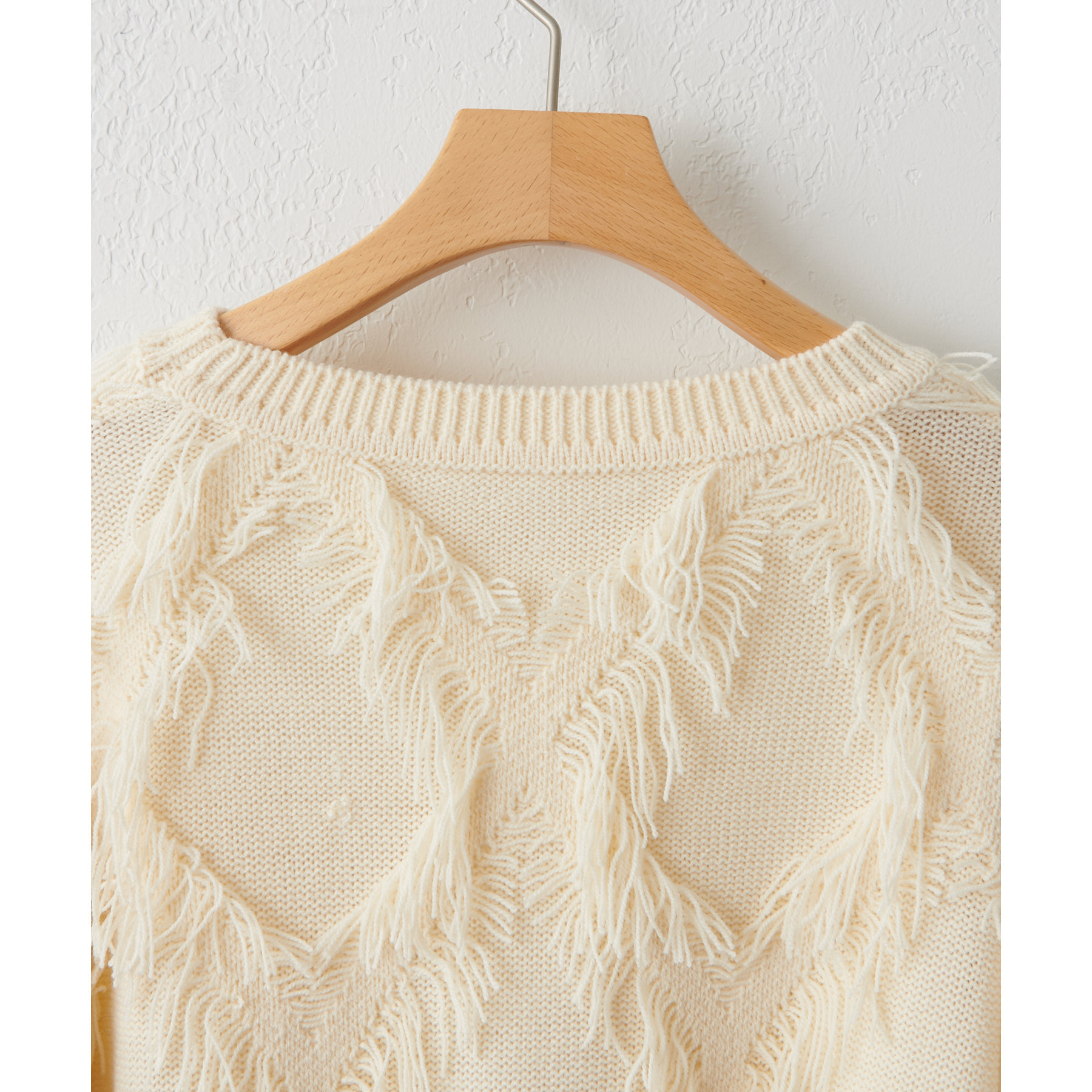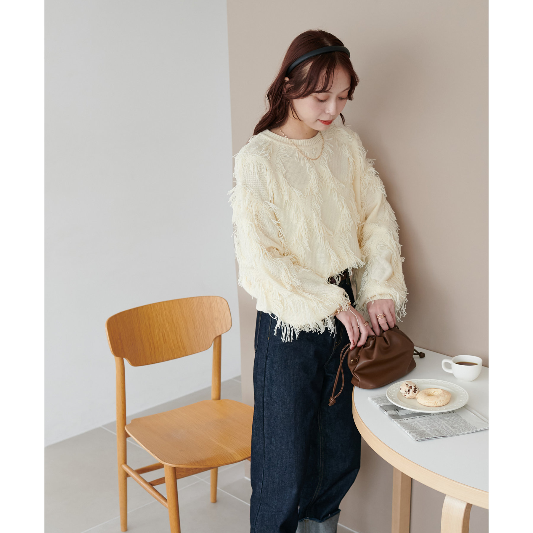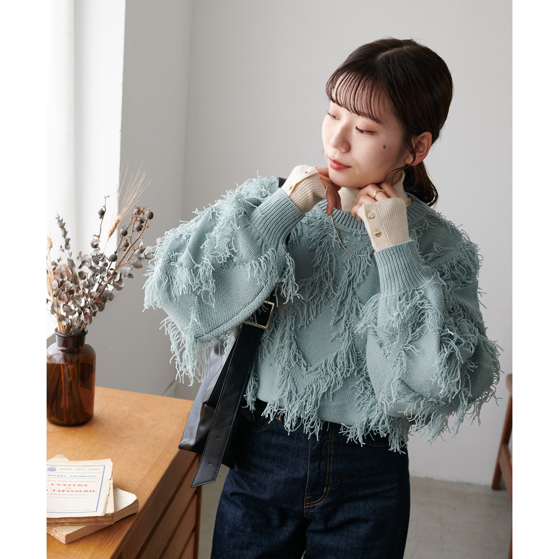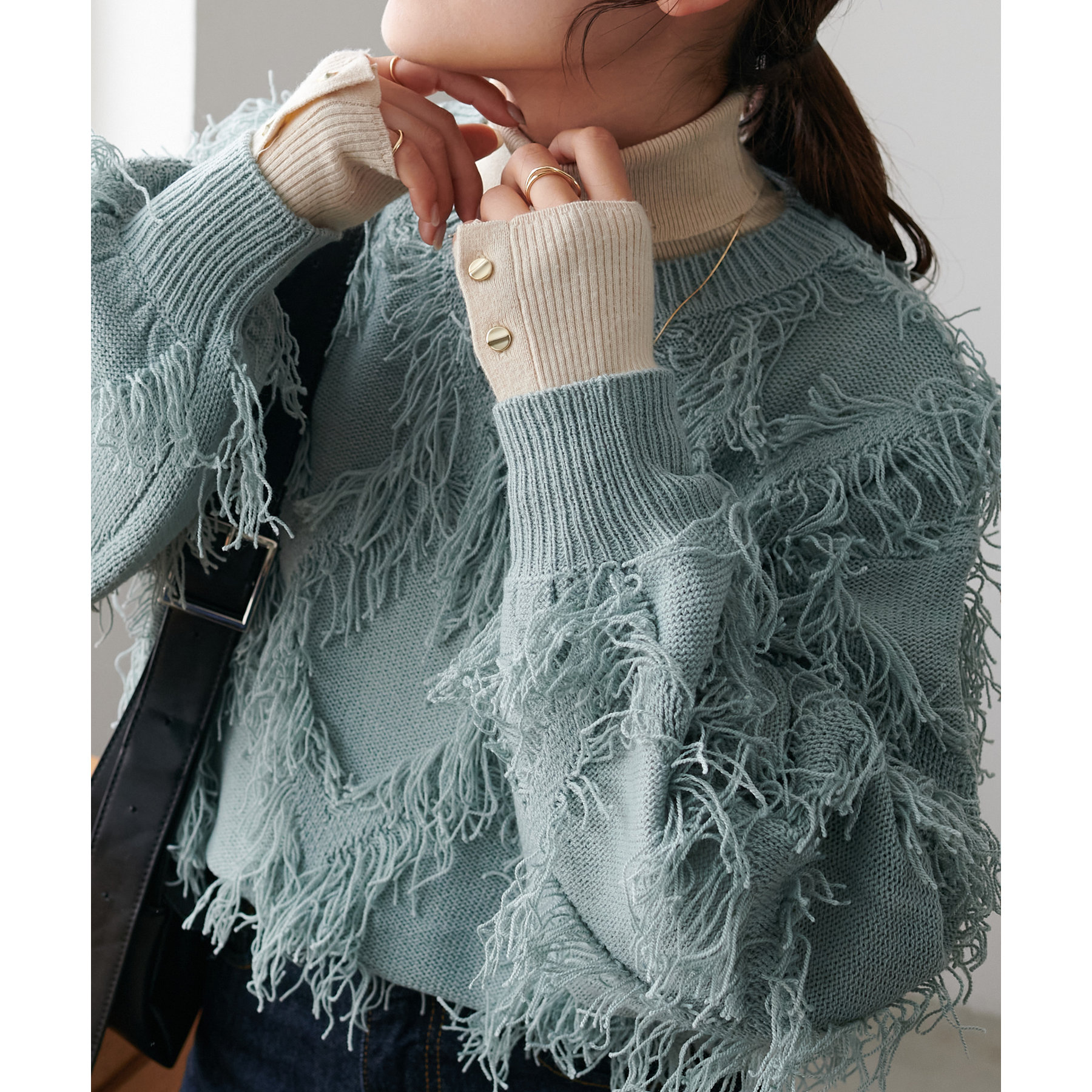 身頃や袖にふさふさしたフリンジのデザインがあしらわれどの角度から見ても目を惹くニットプルオーバー。