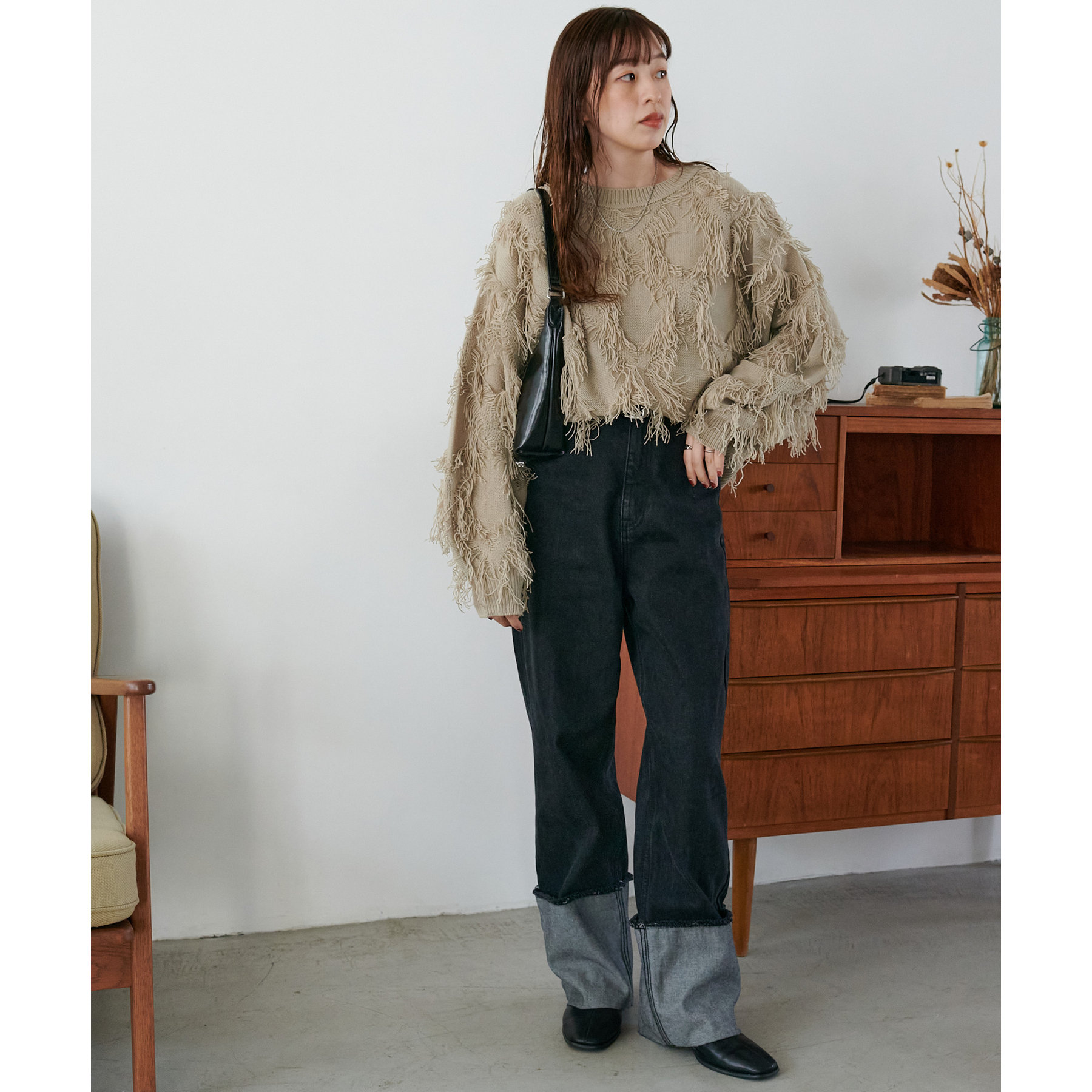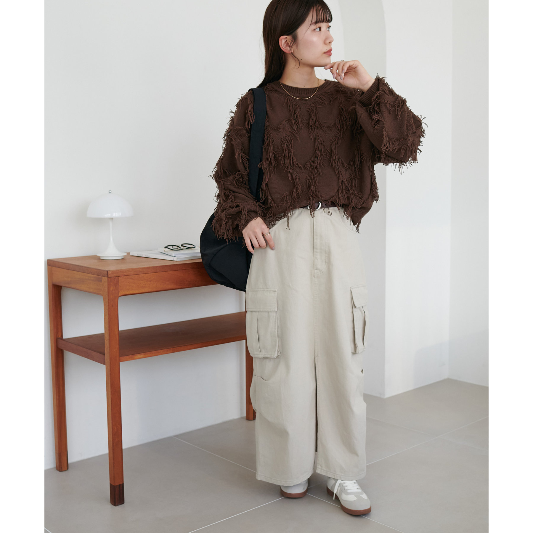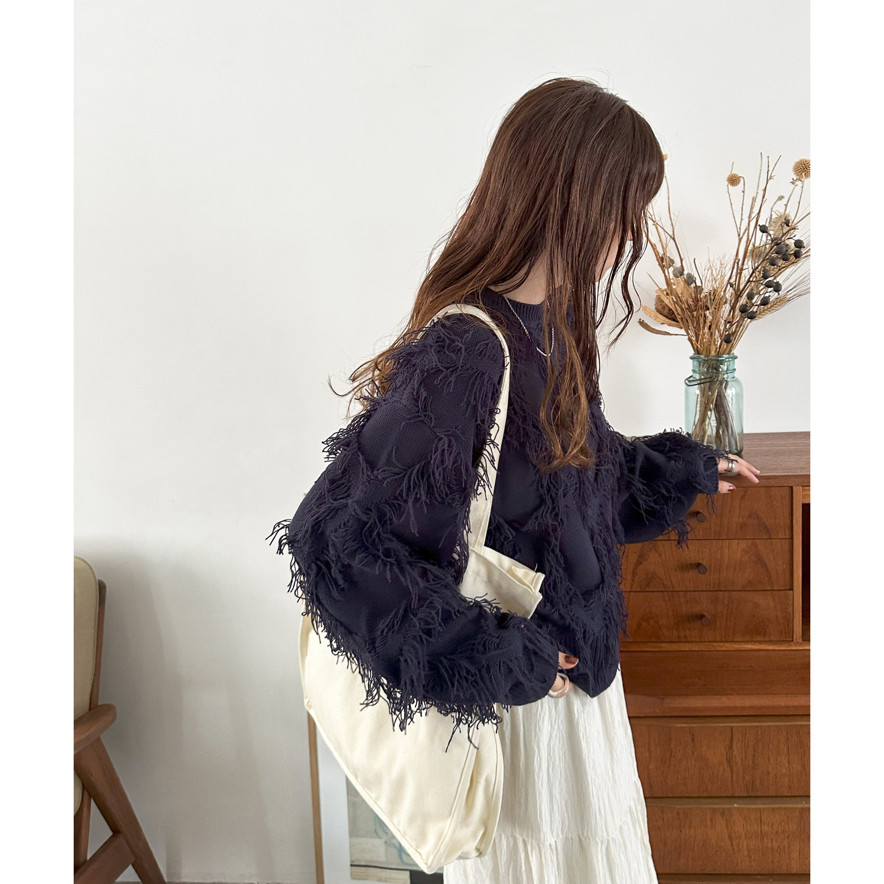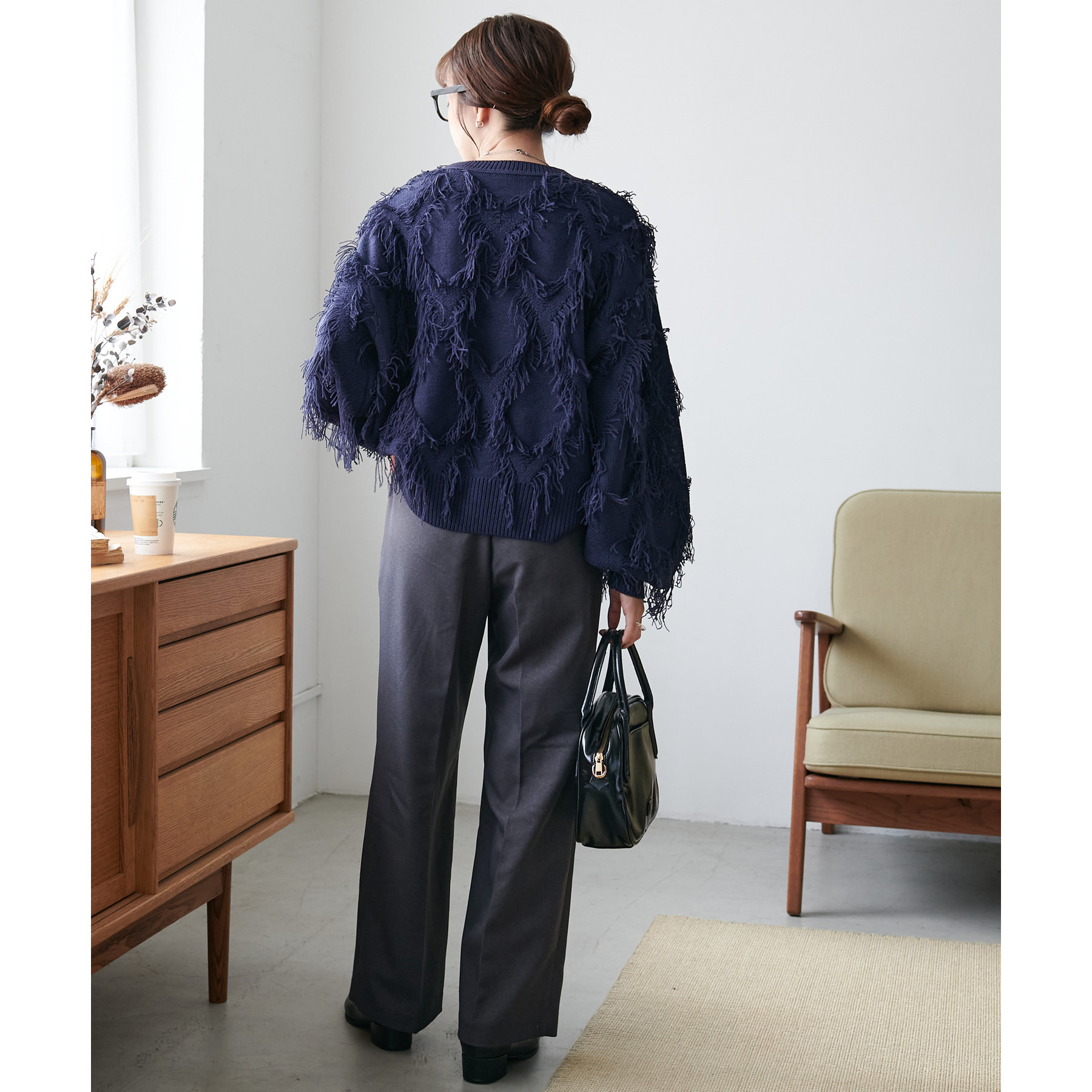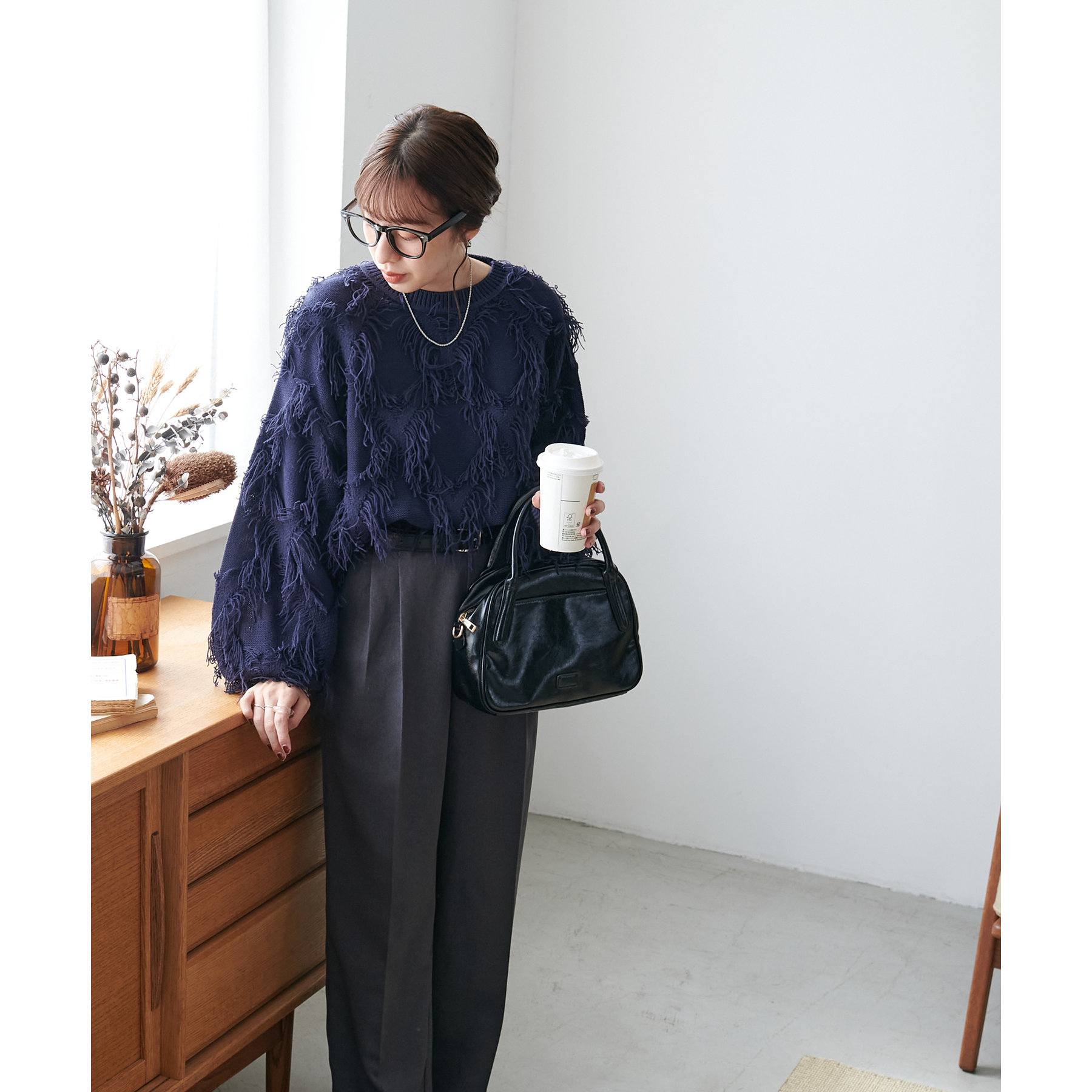身頃や袖にふさふさしたフリンジのデザインがあしらわれどの角度から見ても目を惹くニットプルオーバー。