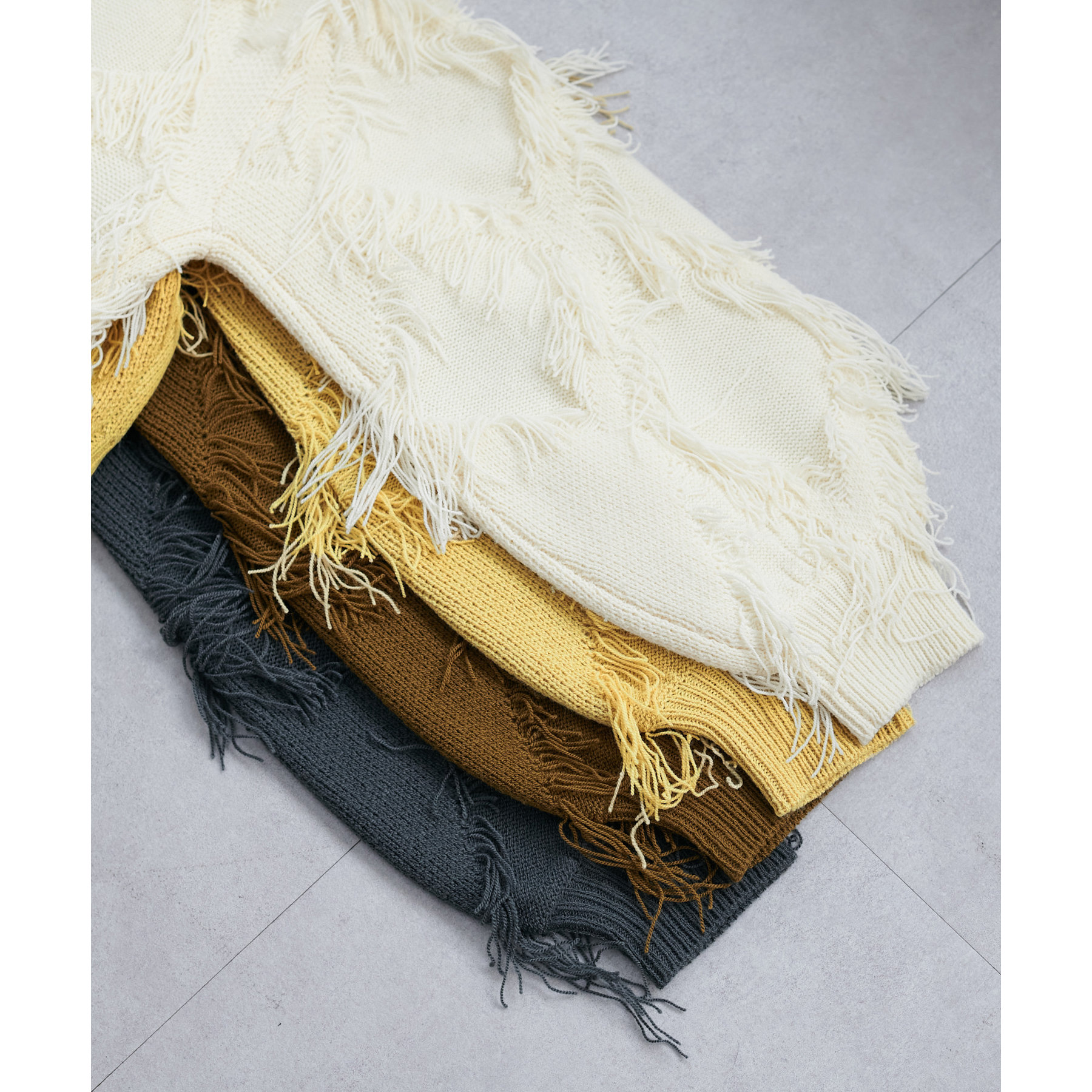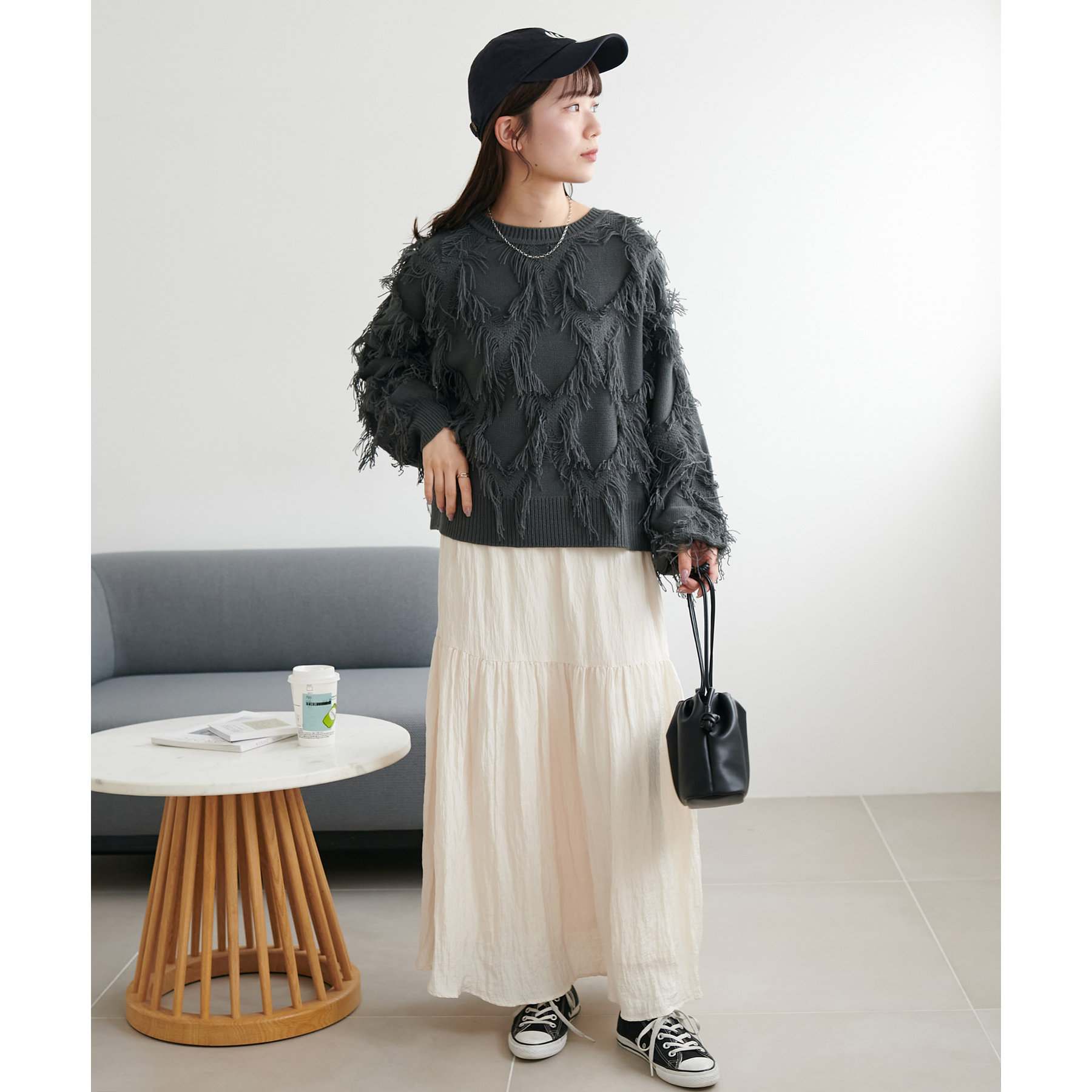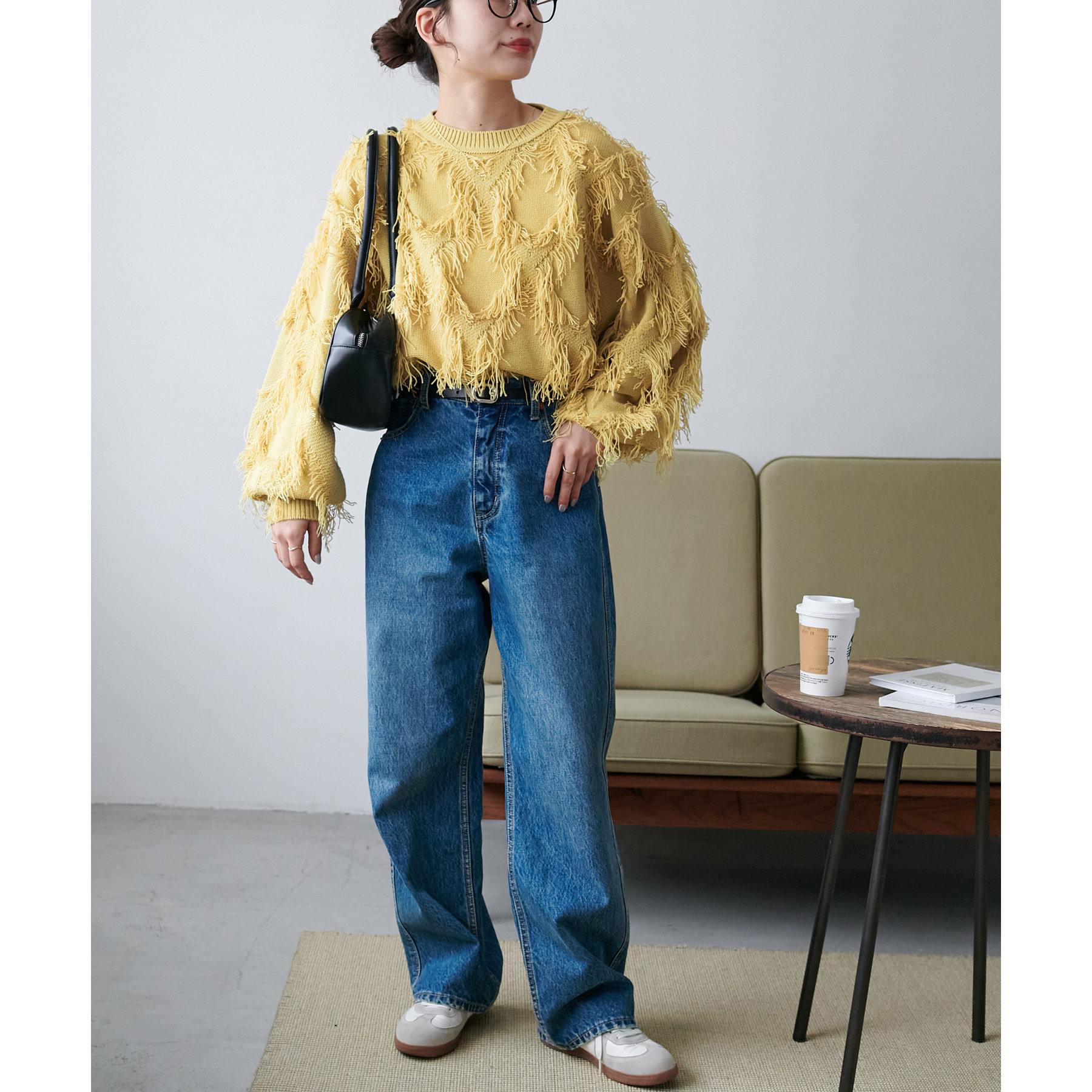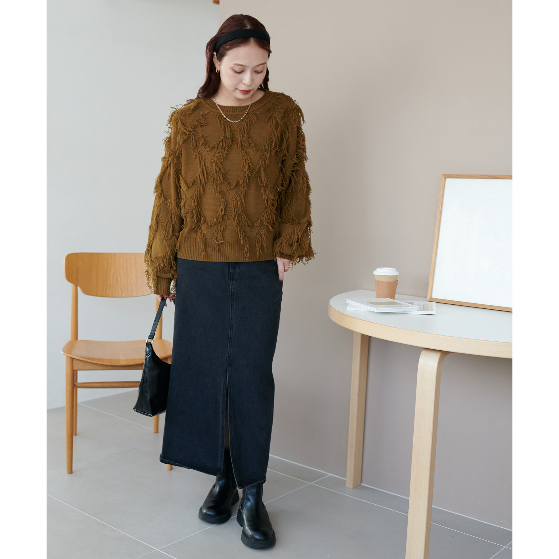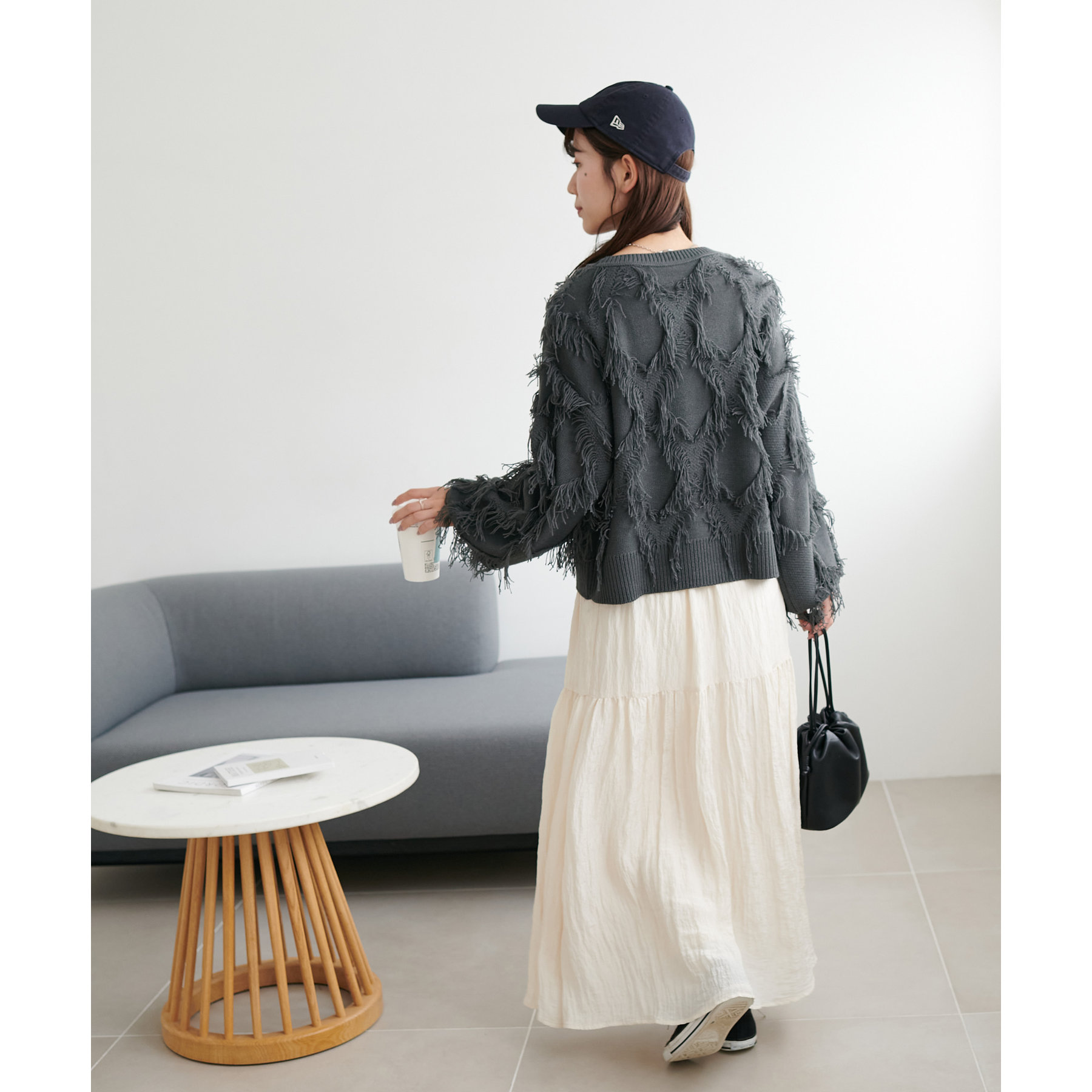 身頃や袖にふさふさしたフリンジのデザインがあしらわれどの角度から見ても目を惹くニットプルオーバー。