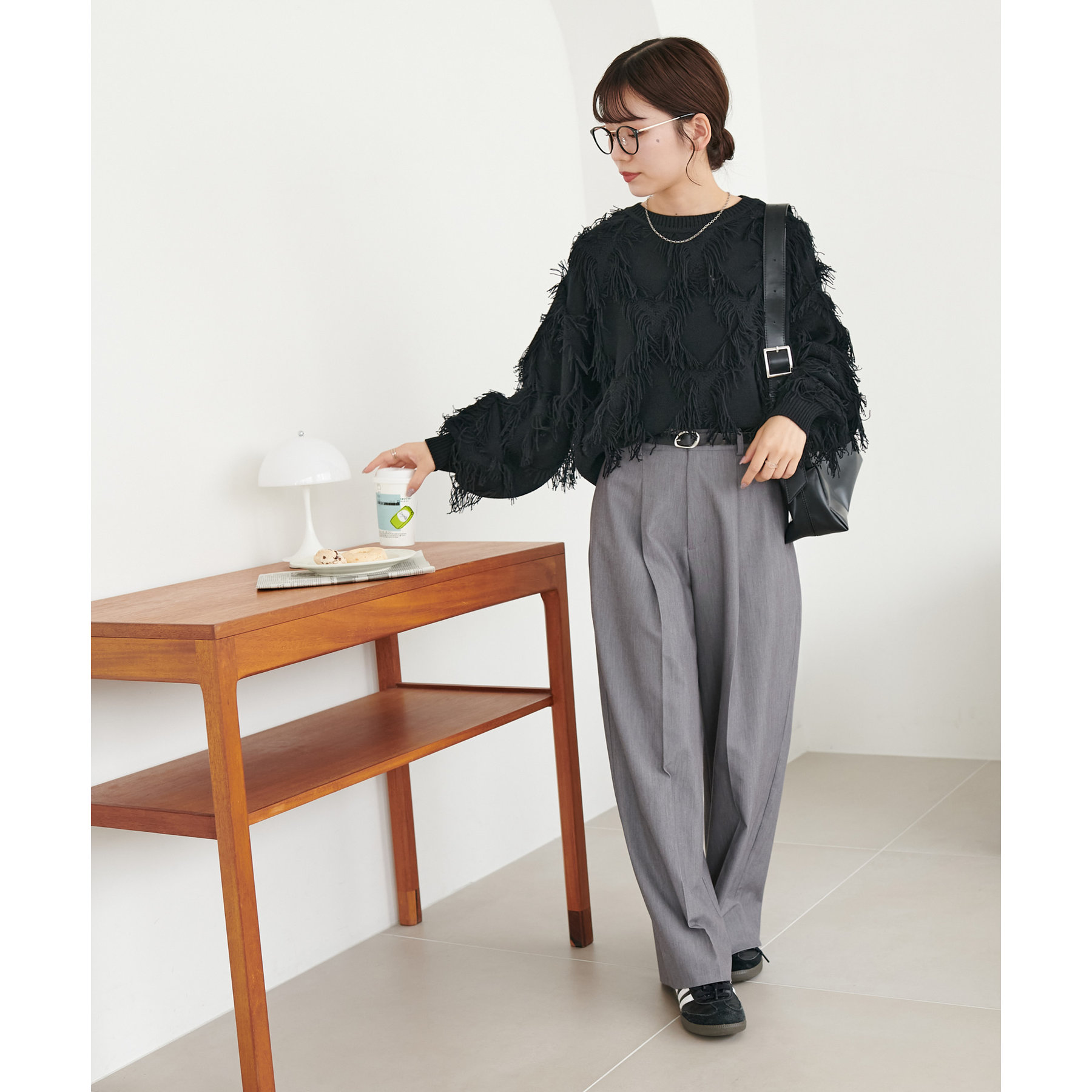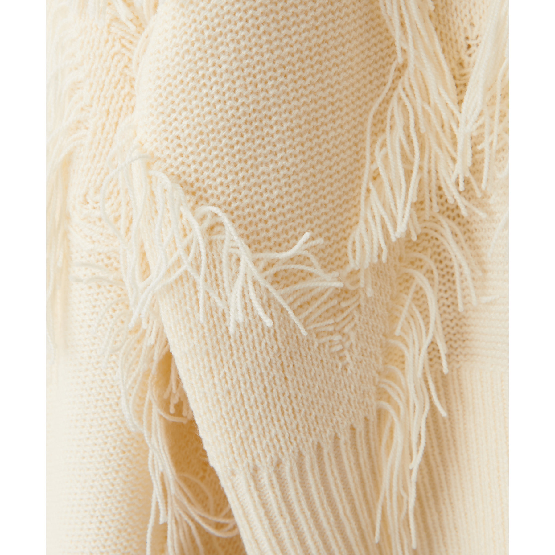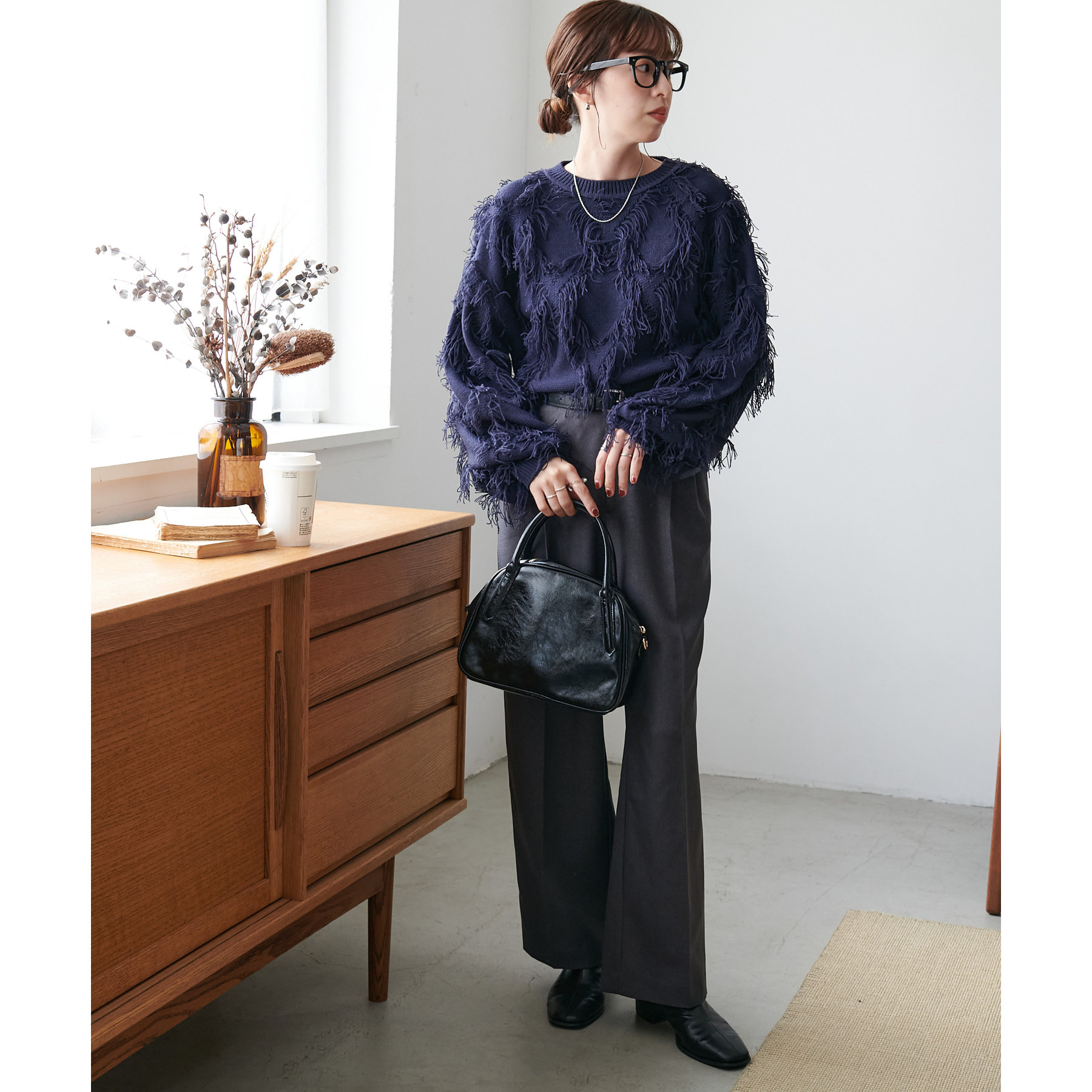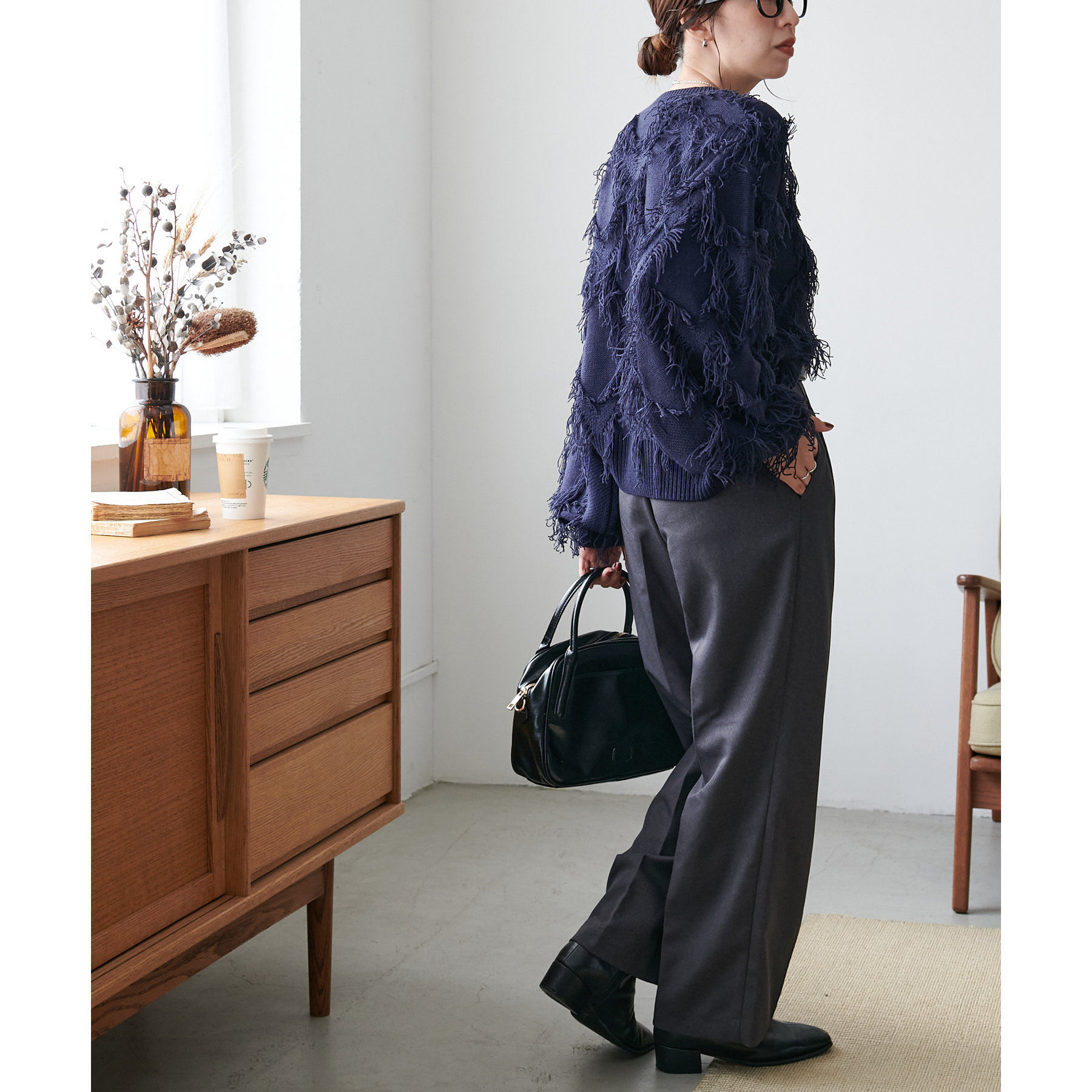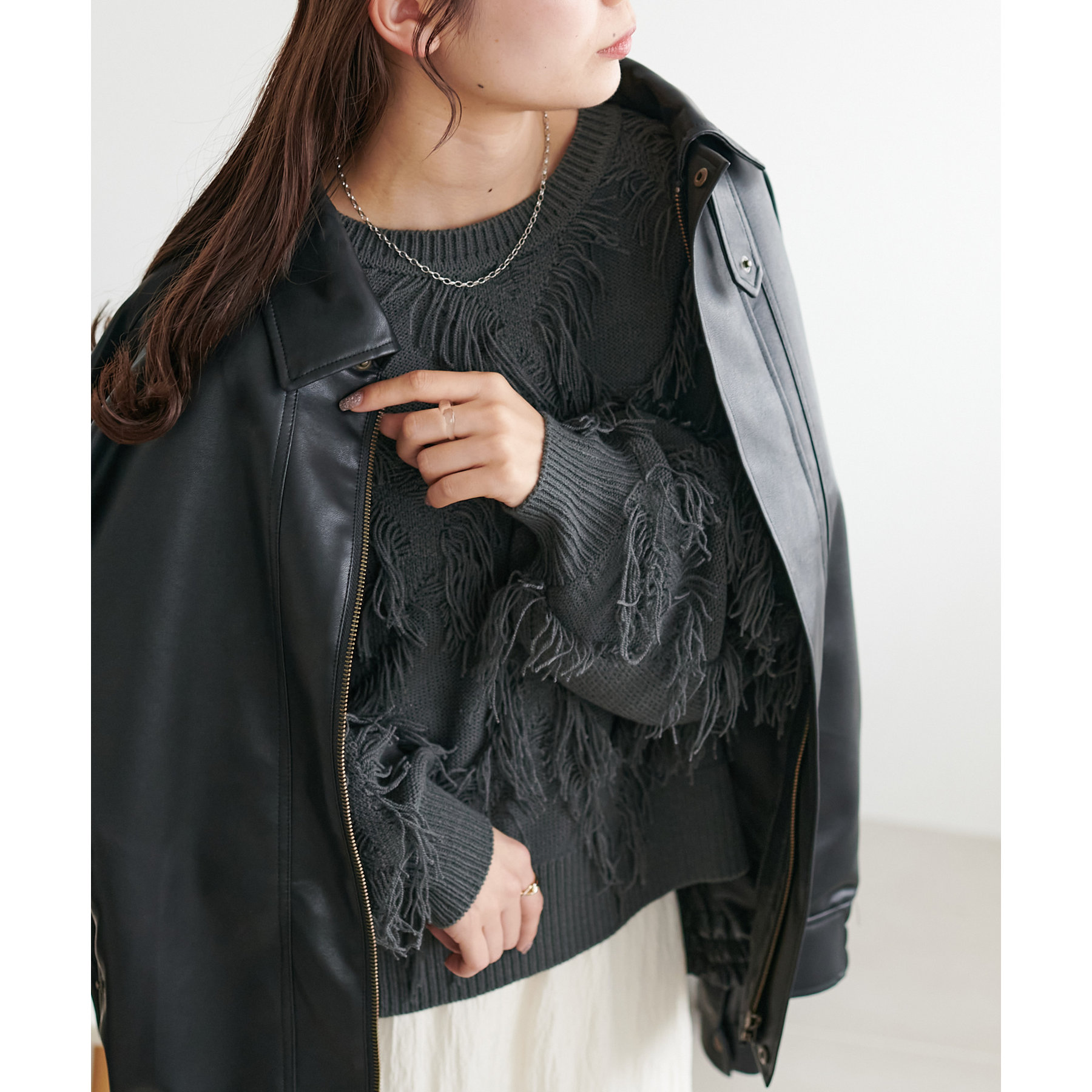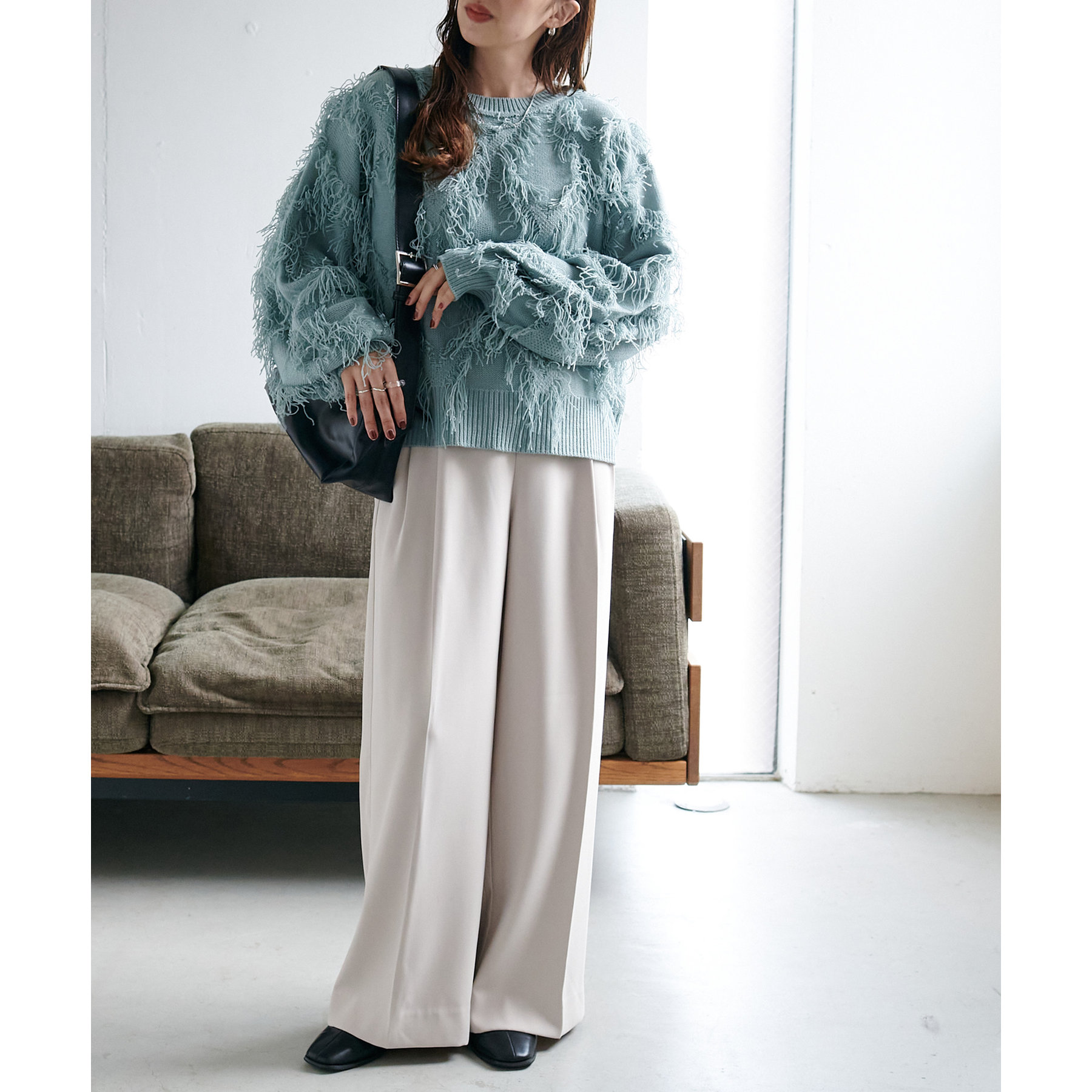身頃や袖にふさふさしたフリンジのデザインがあしらわれどの角度から見ても目を惹くニットプルオーバー。