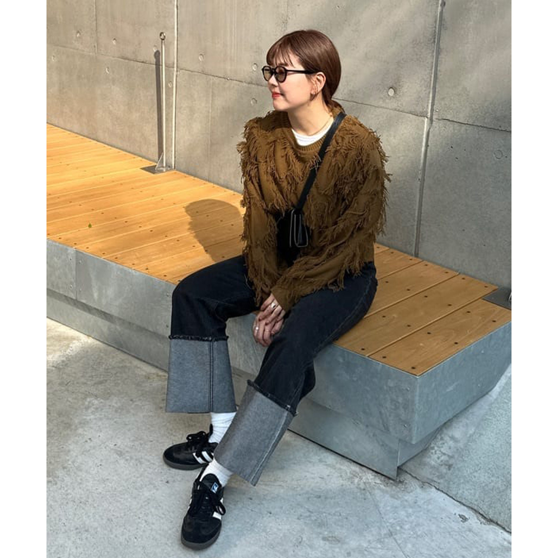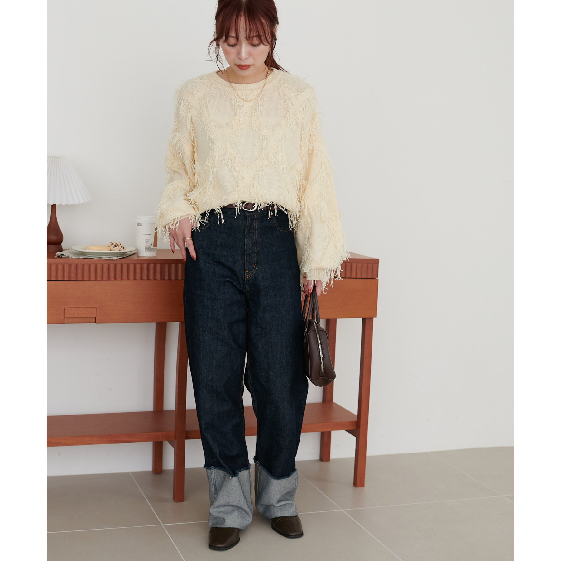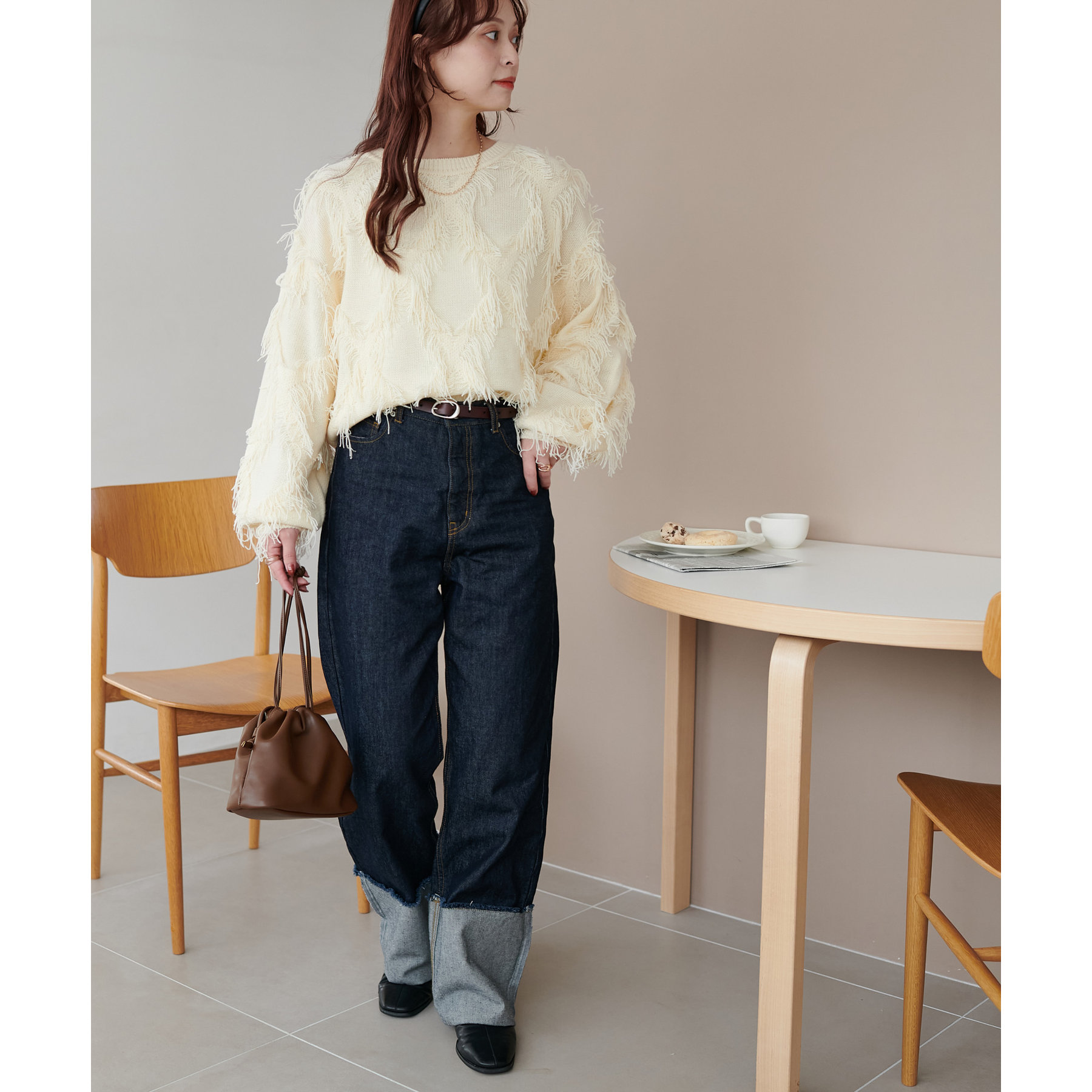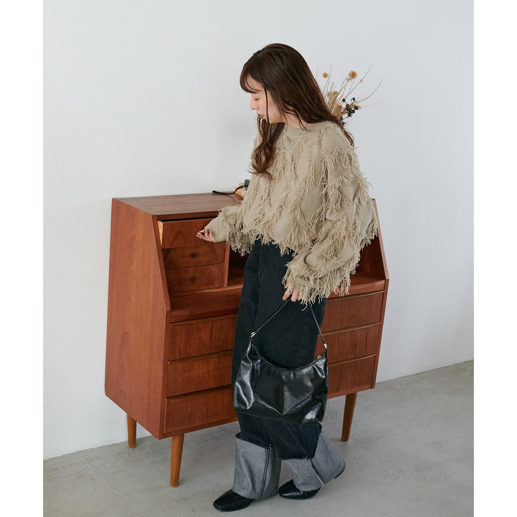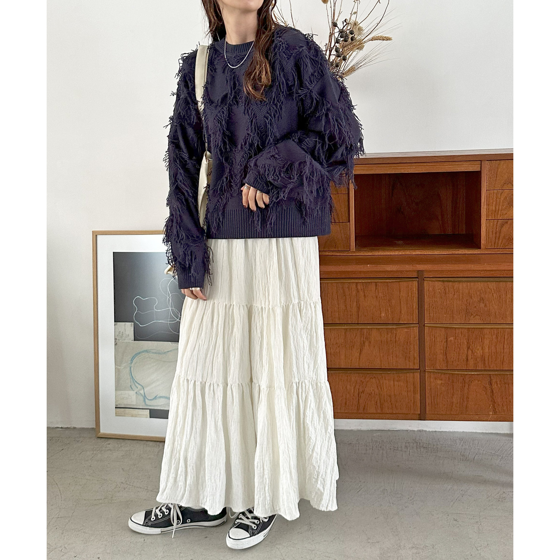 身頃や袖にふさふさしたフリンジのデザインがあしらわれどの角度から見ても目を惹くニットプルオーバー。
