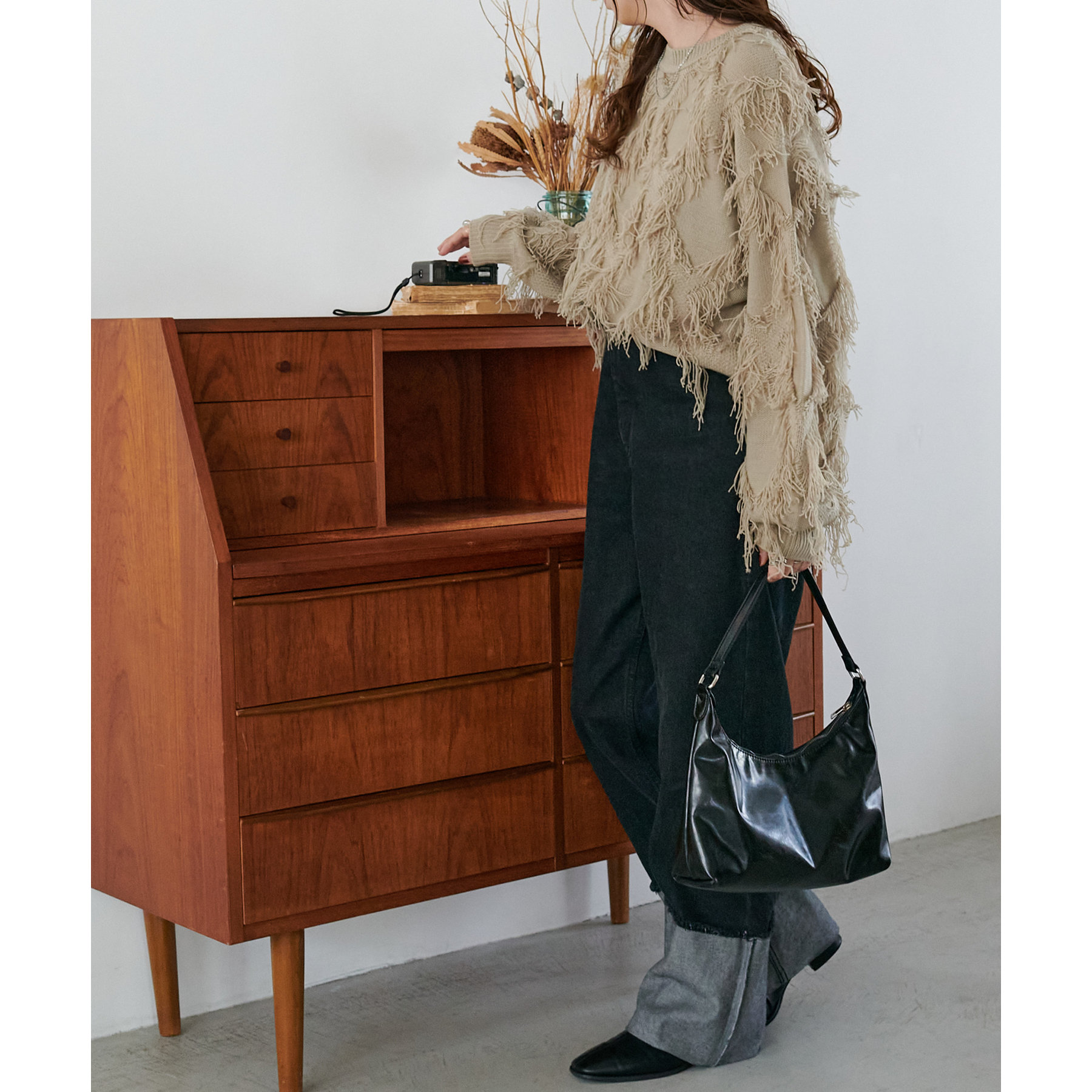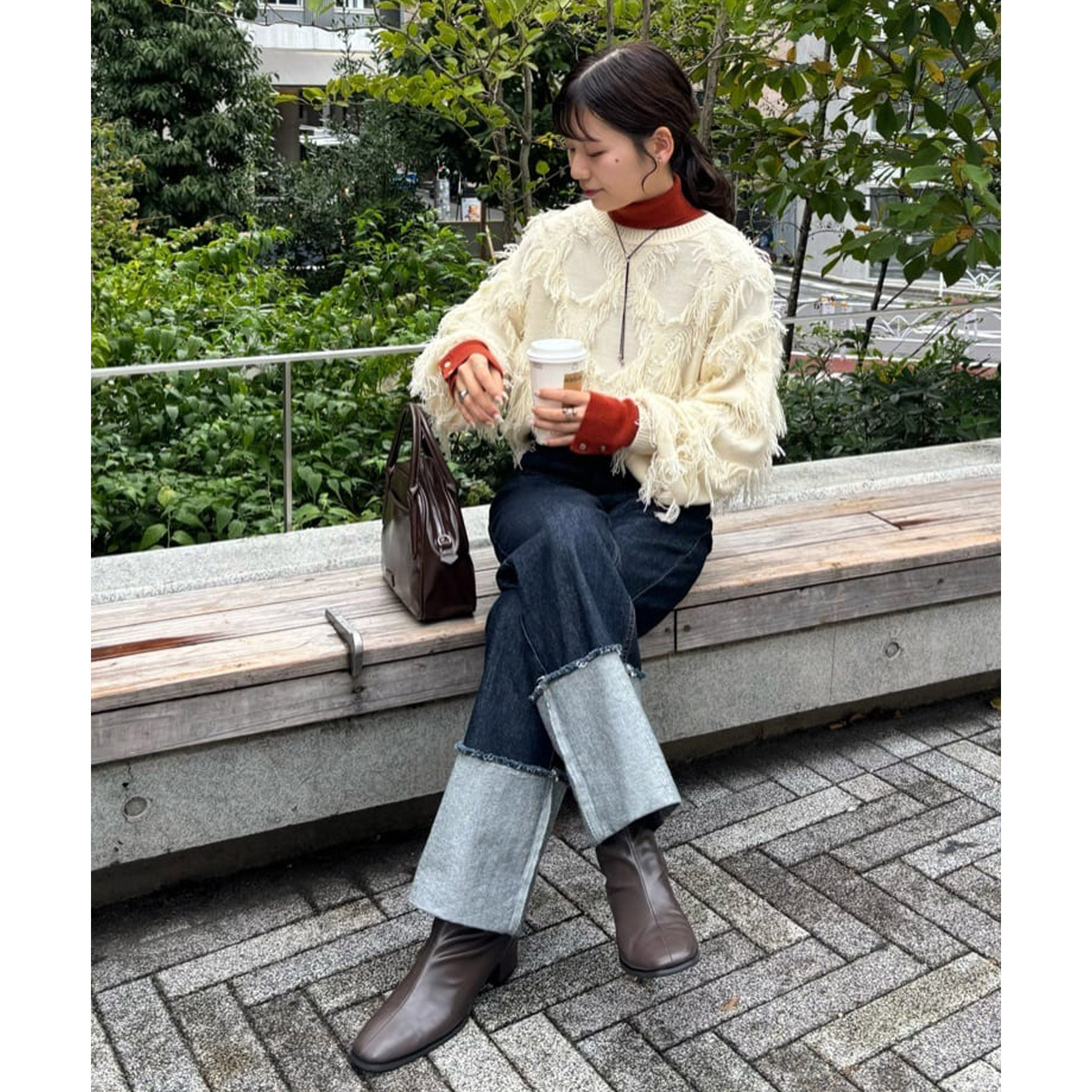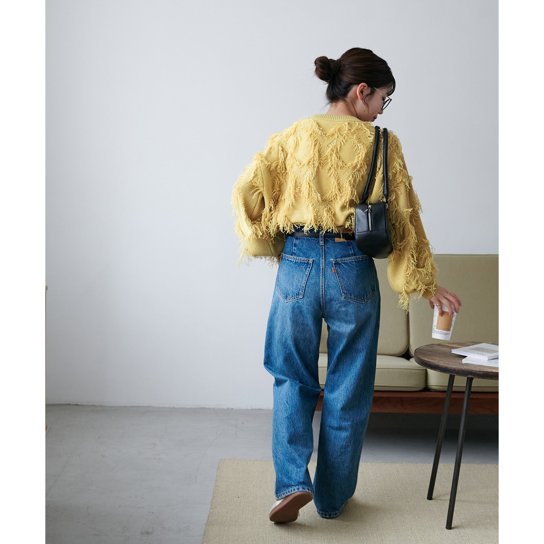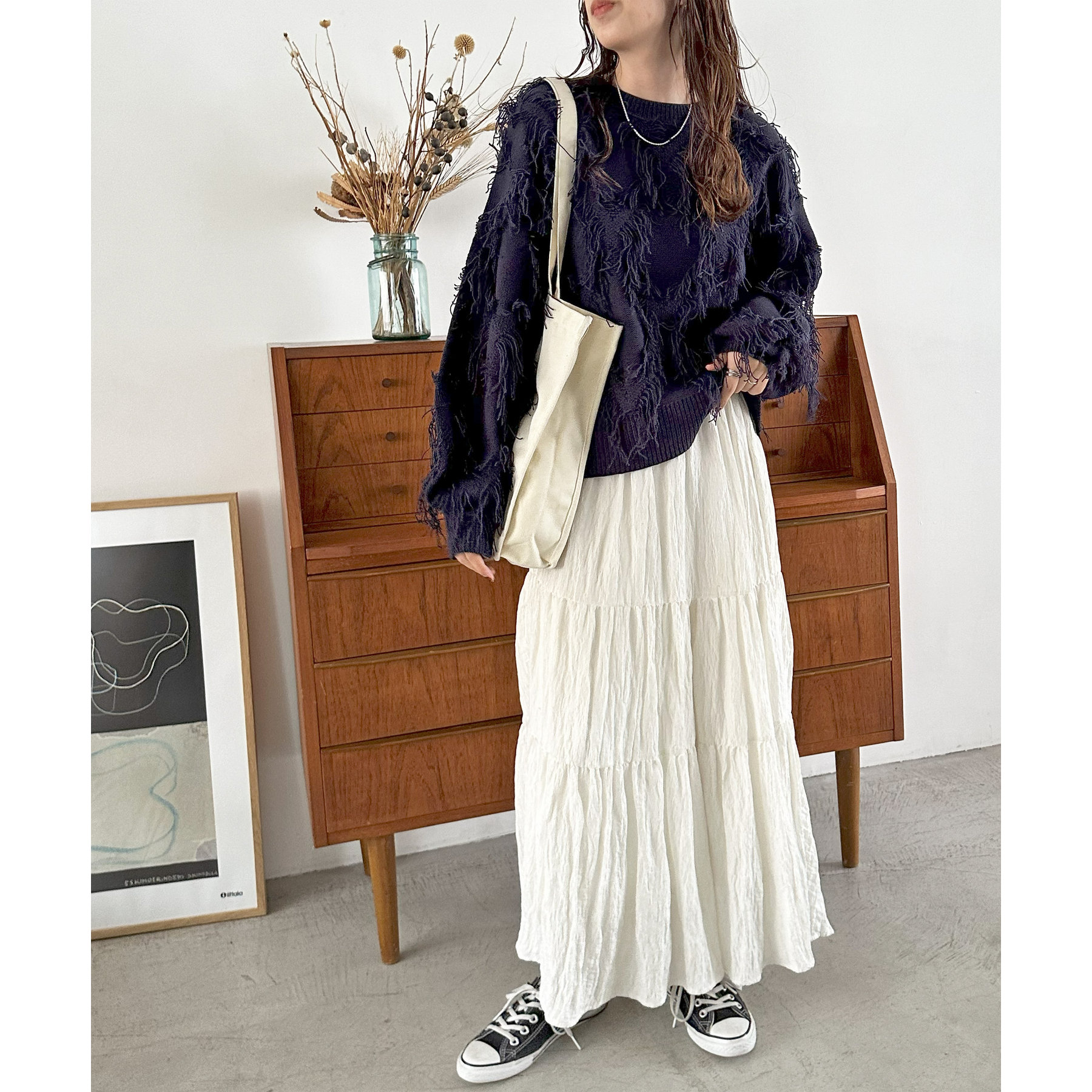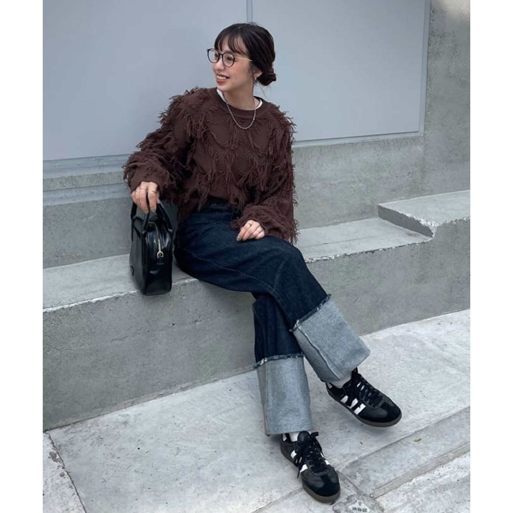 身頃や袖にふさふさしたフリンジのデザインがあしらわれどの角度から見ても目を惹くニットプルオーバー。