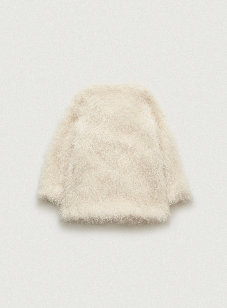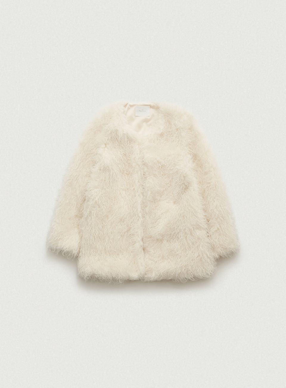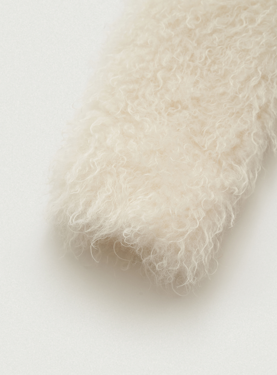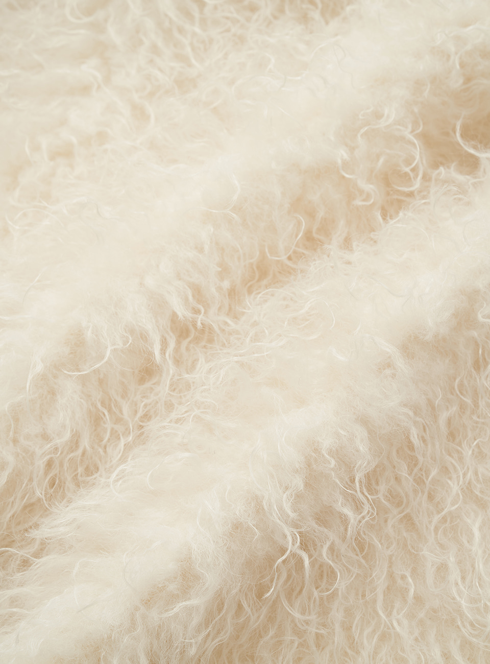 アイボリーカラーで、独特のカールしたテクスチャーが特徴のポリエステルファー。