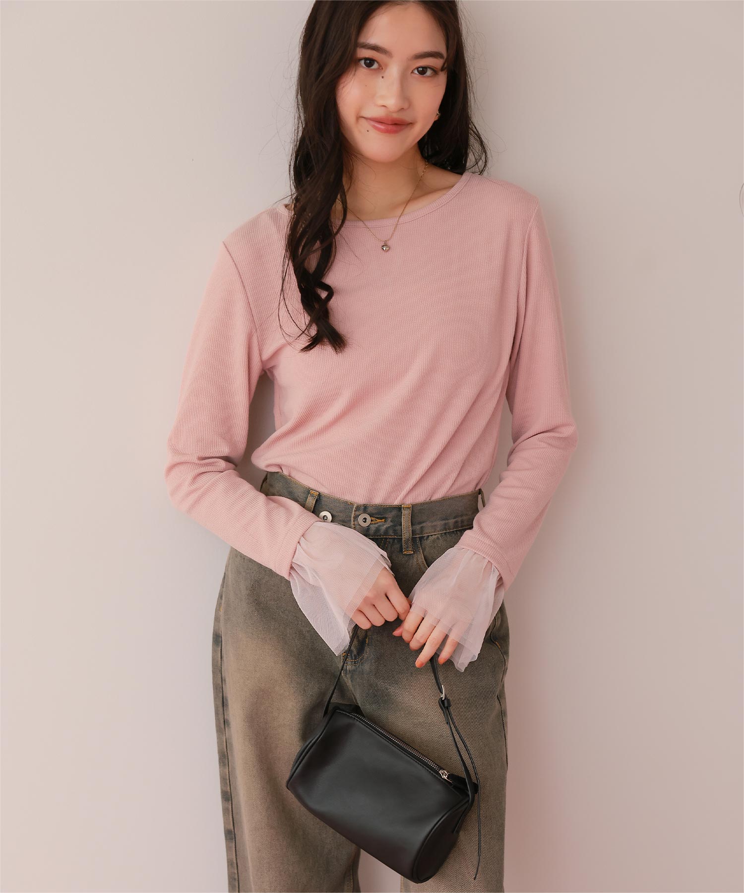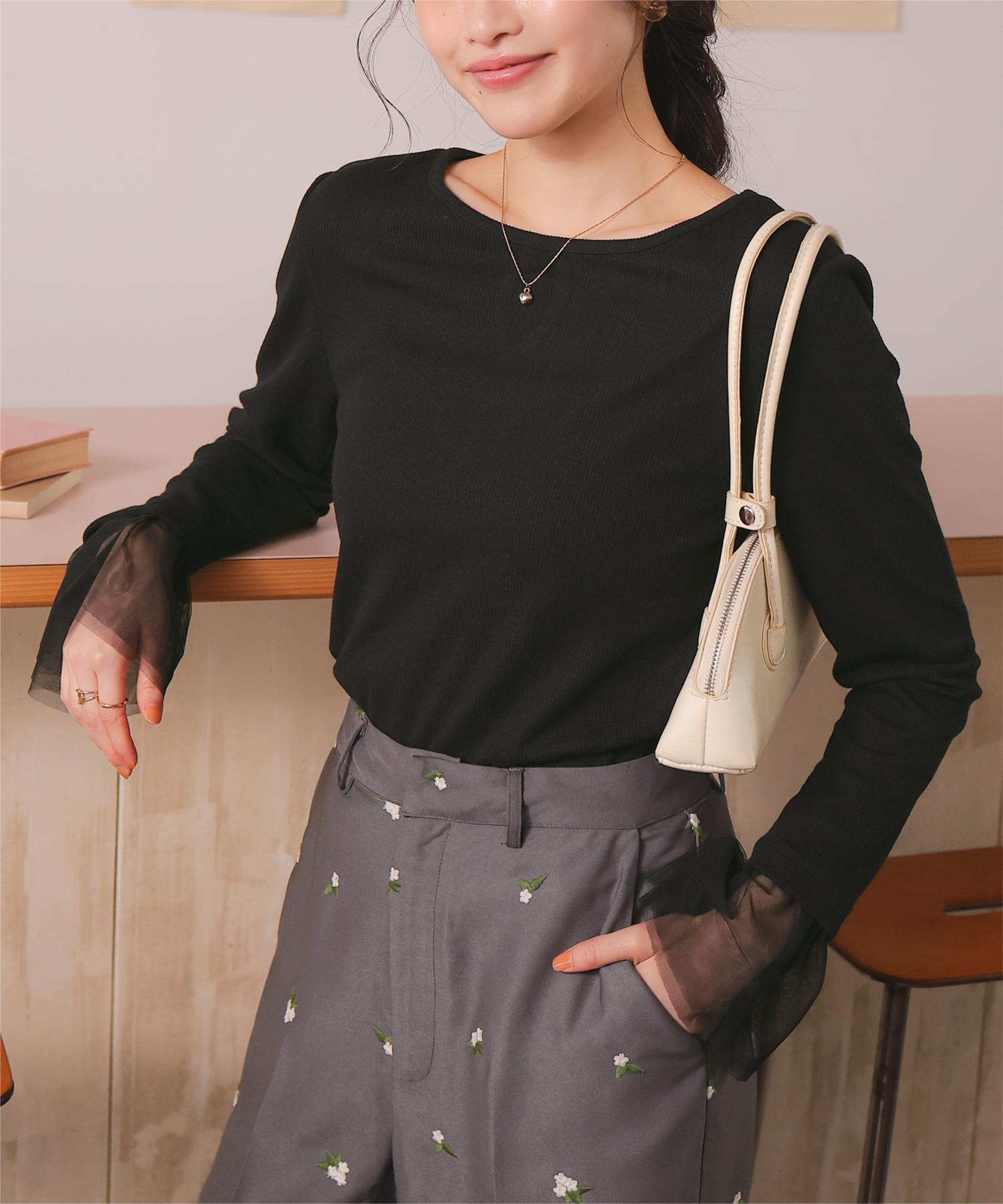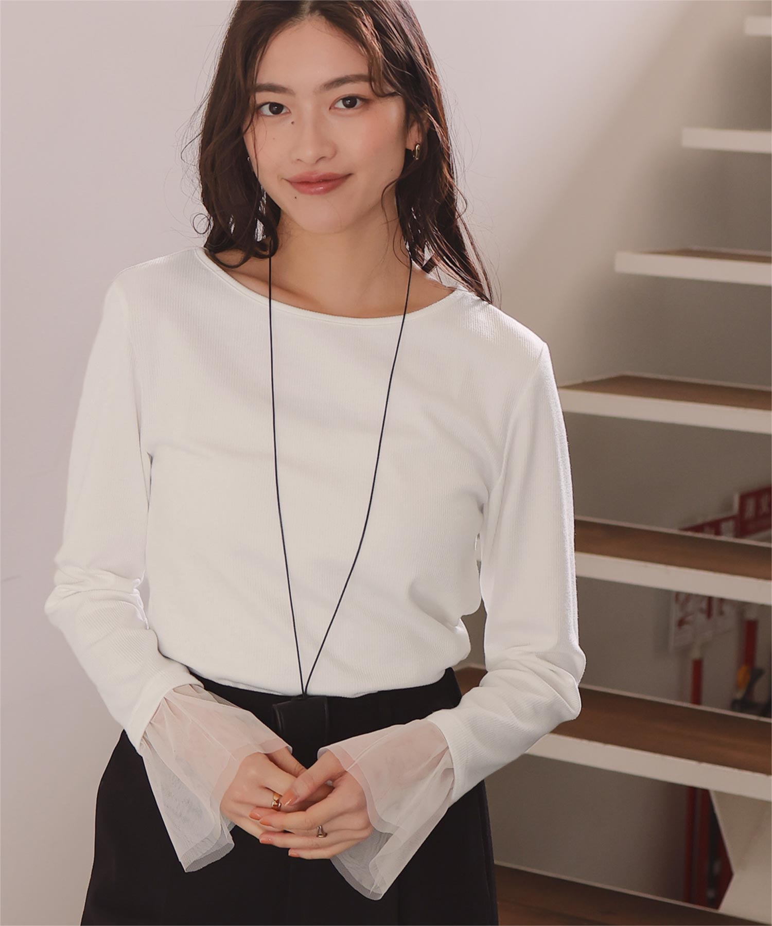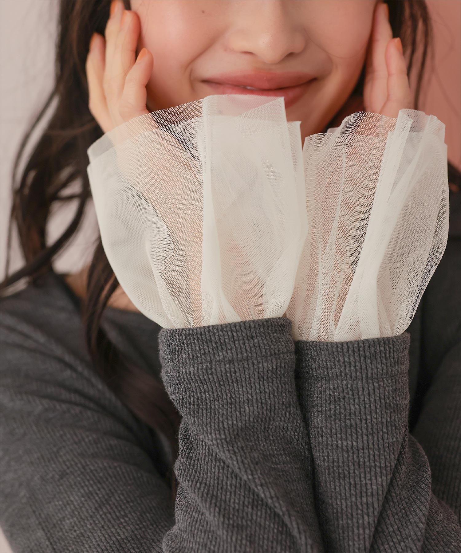 ・袖口のチュールフリルが手元を華やかに彩る、大人フェミニンなカットソートップス