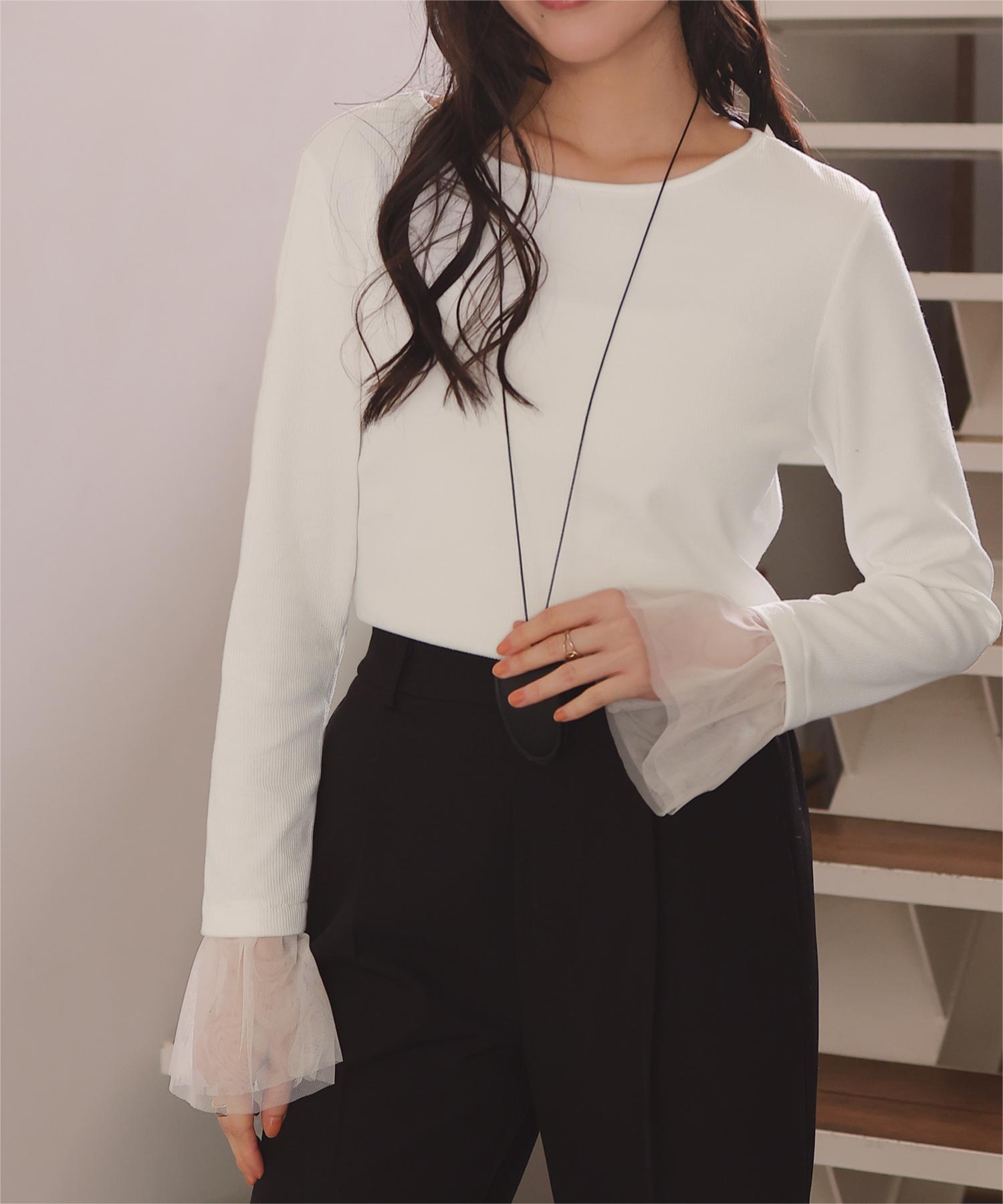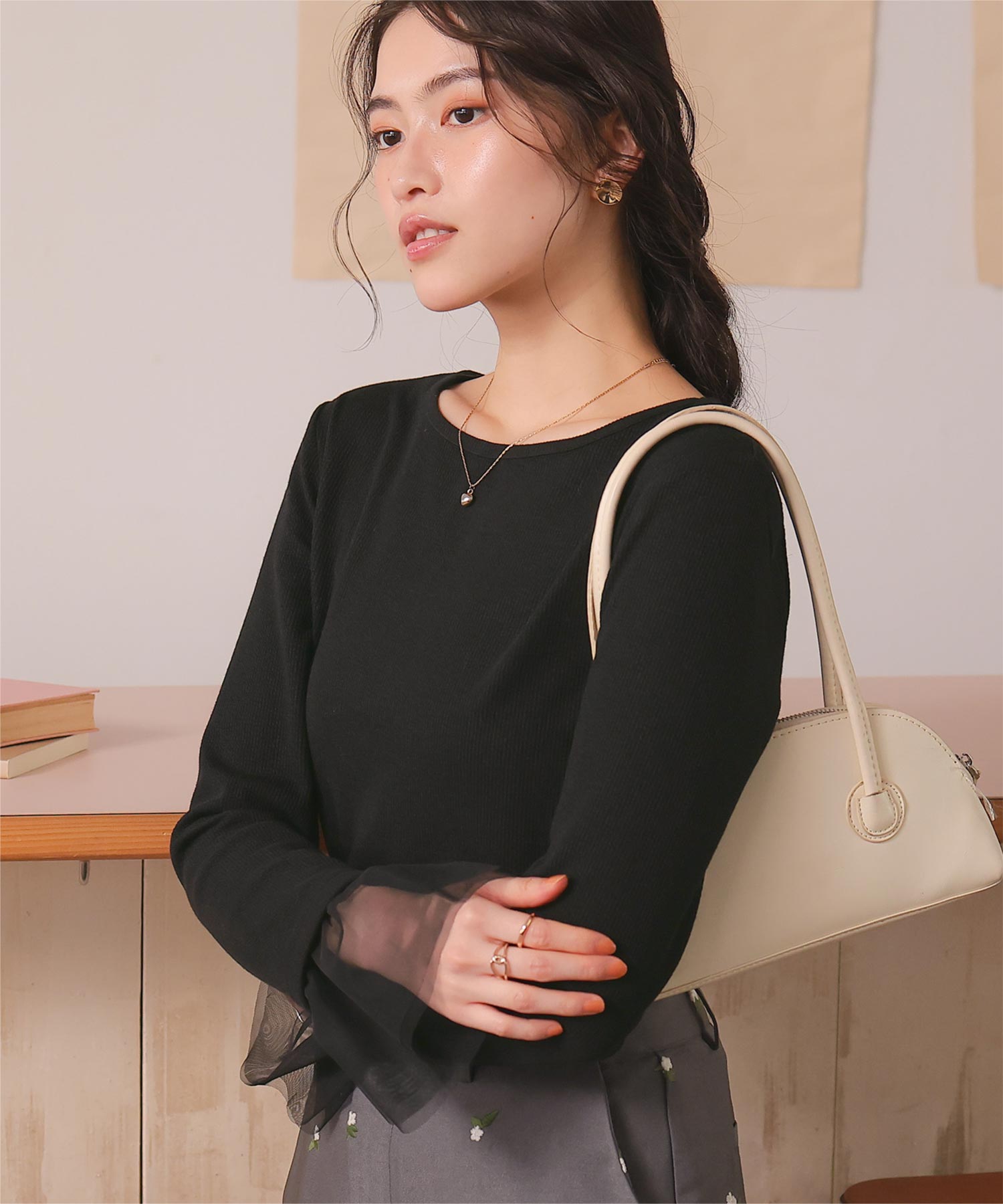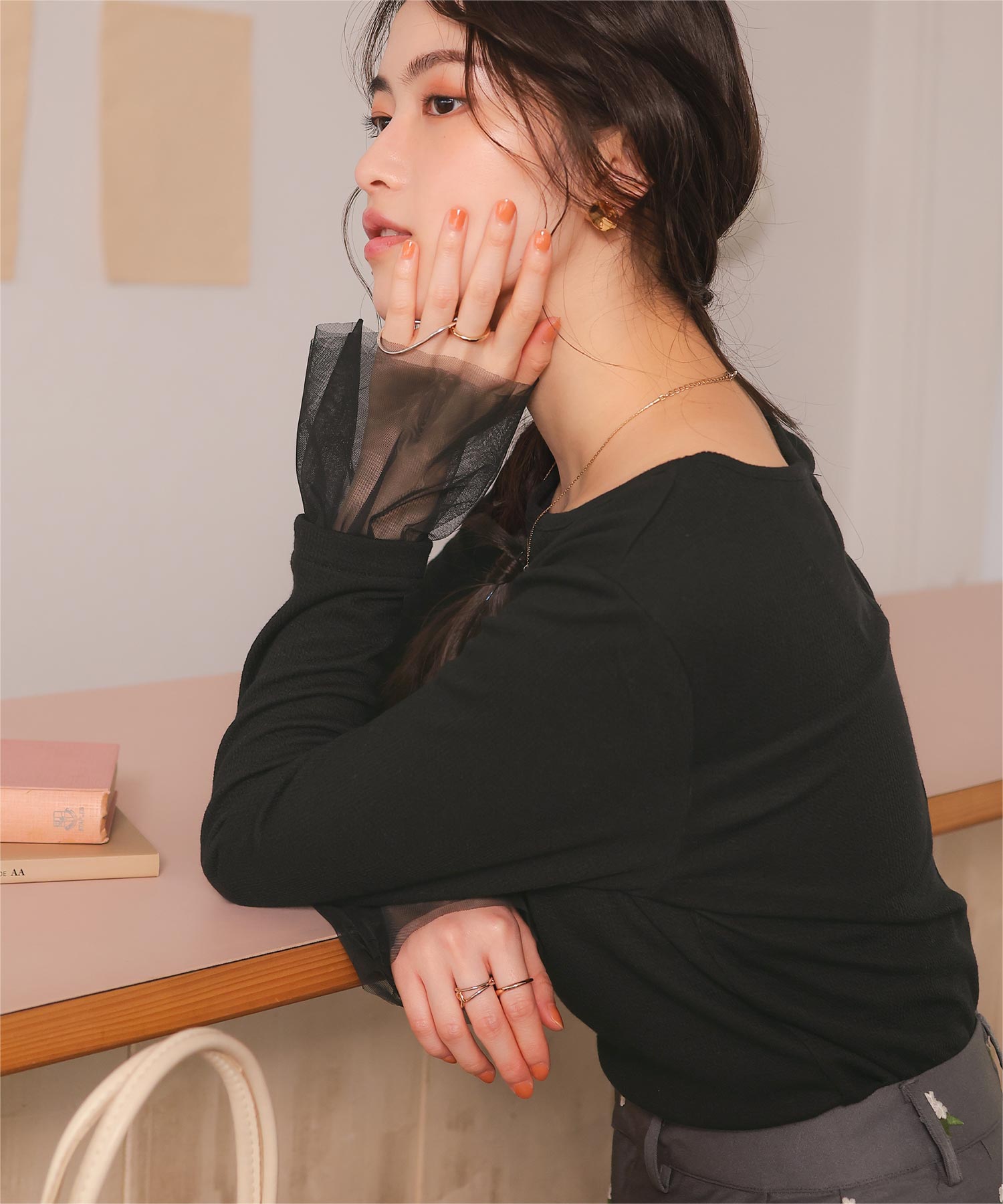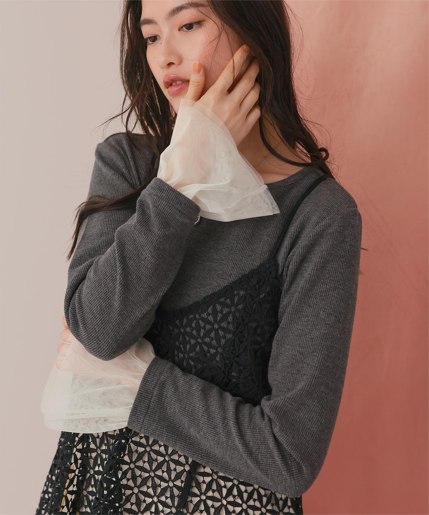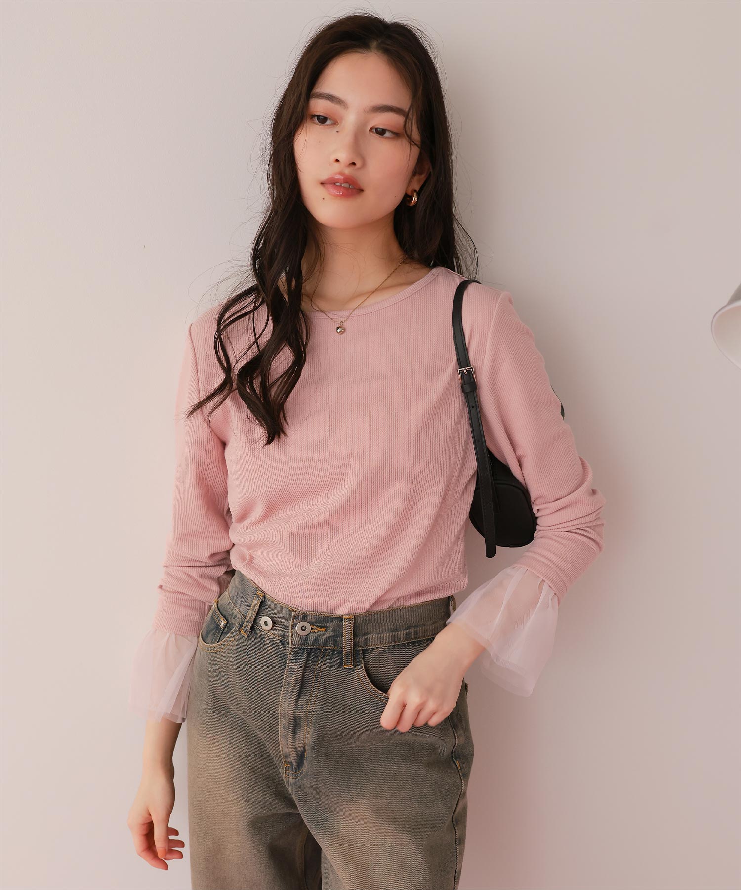・袖口のチュールフリルが手元を華やかに彩る、大人フェミニンなカットソートップス