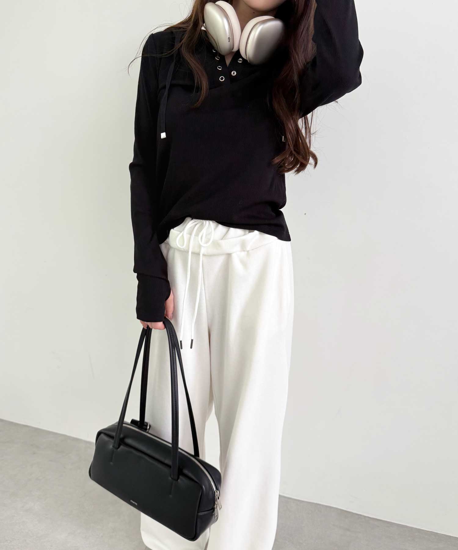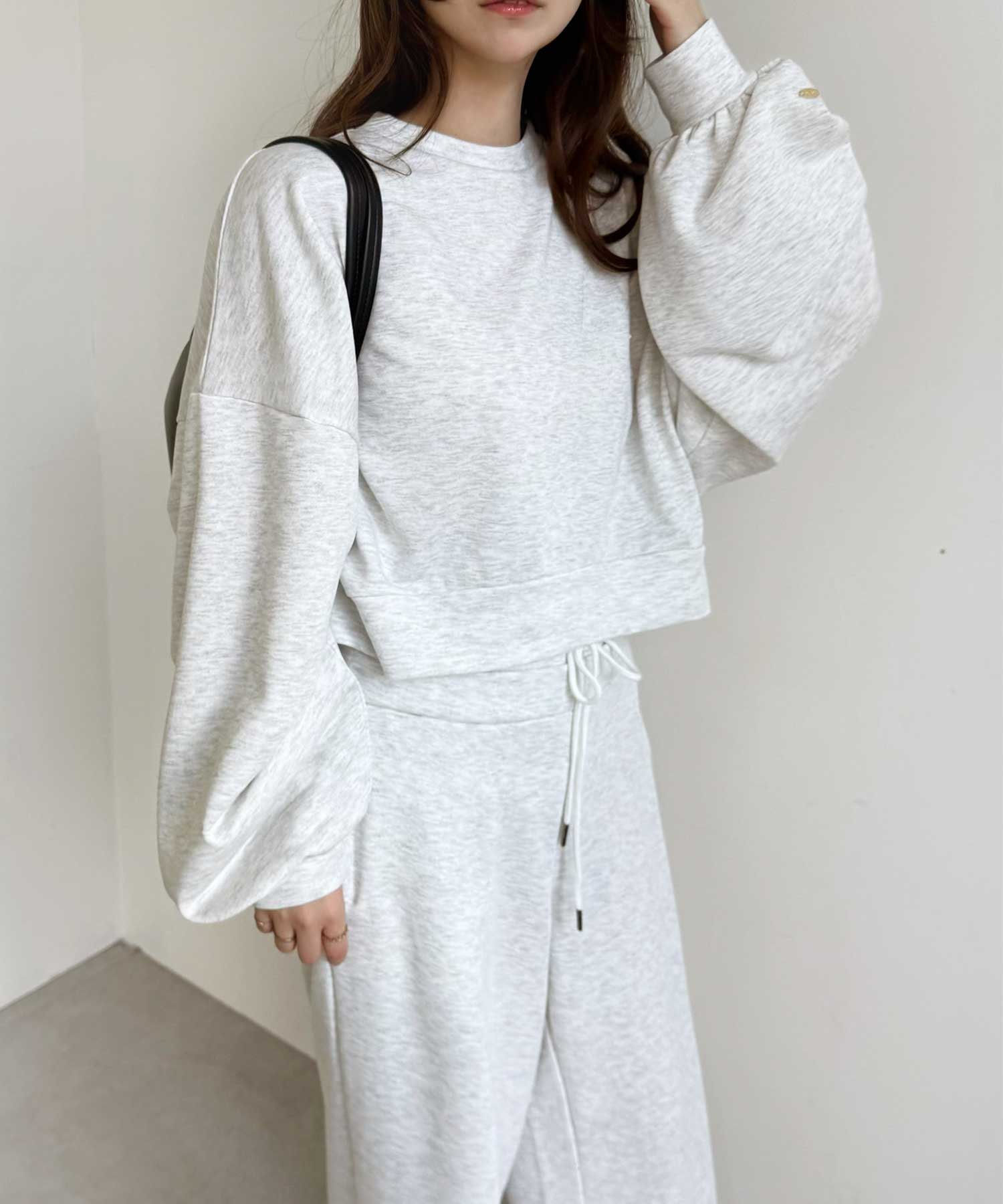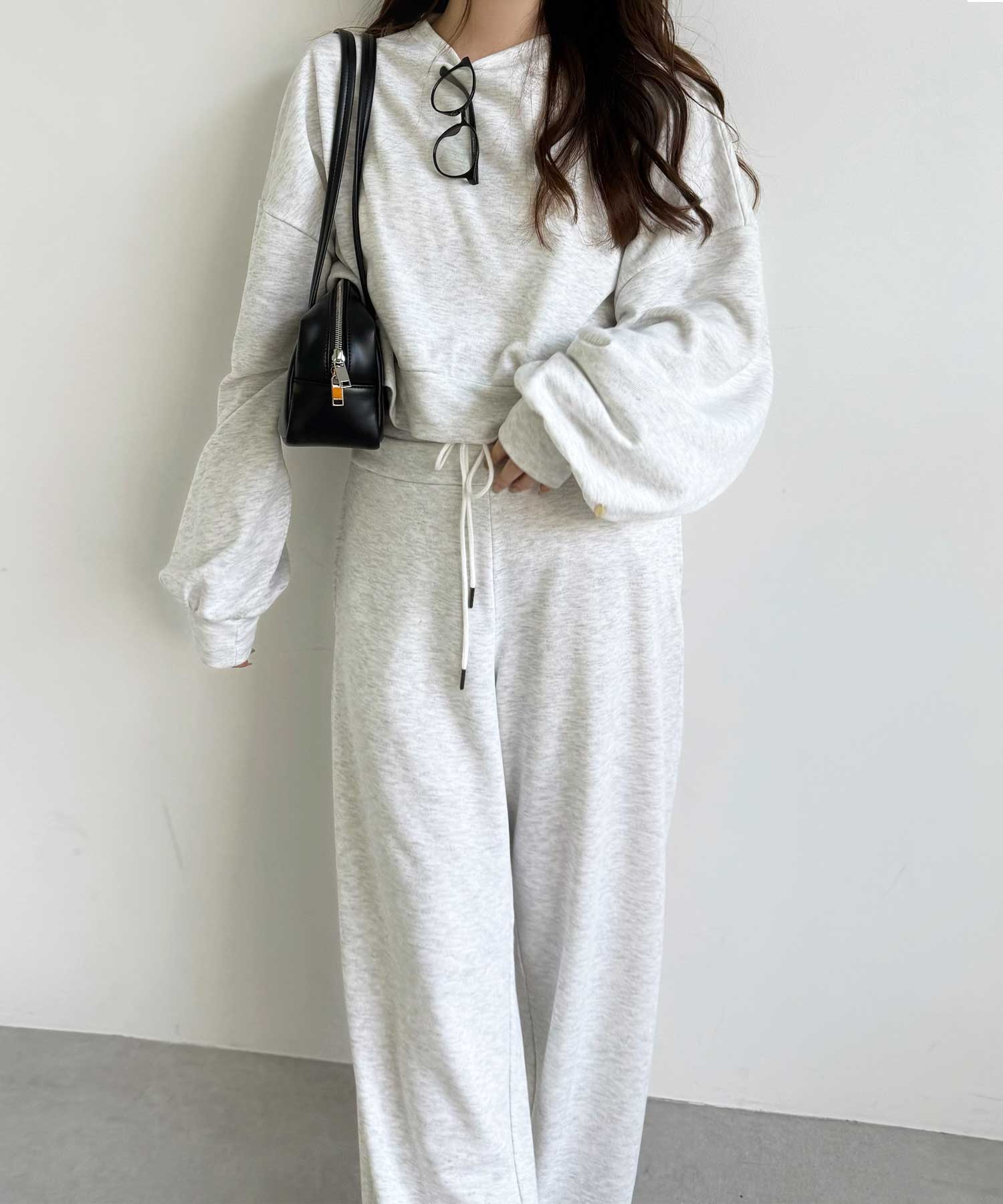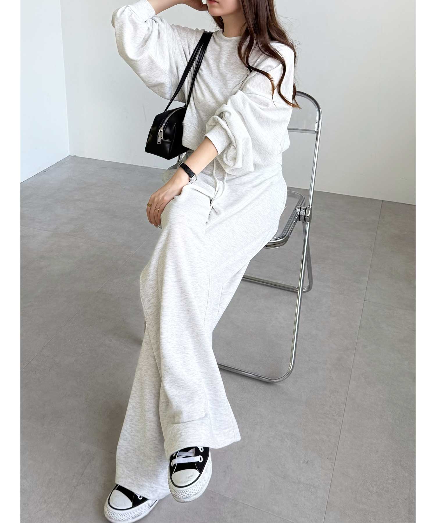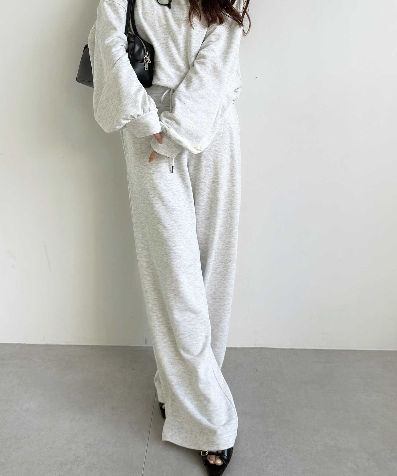 同素材のスウェットトップスと合わせたセットアップコーデもおすすめです。