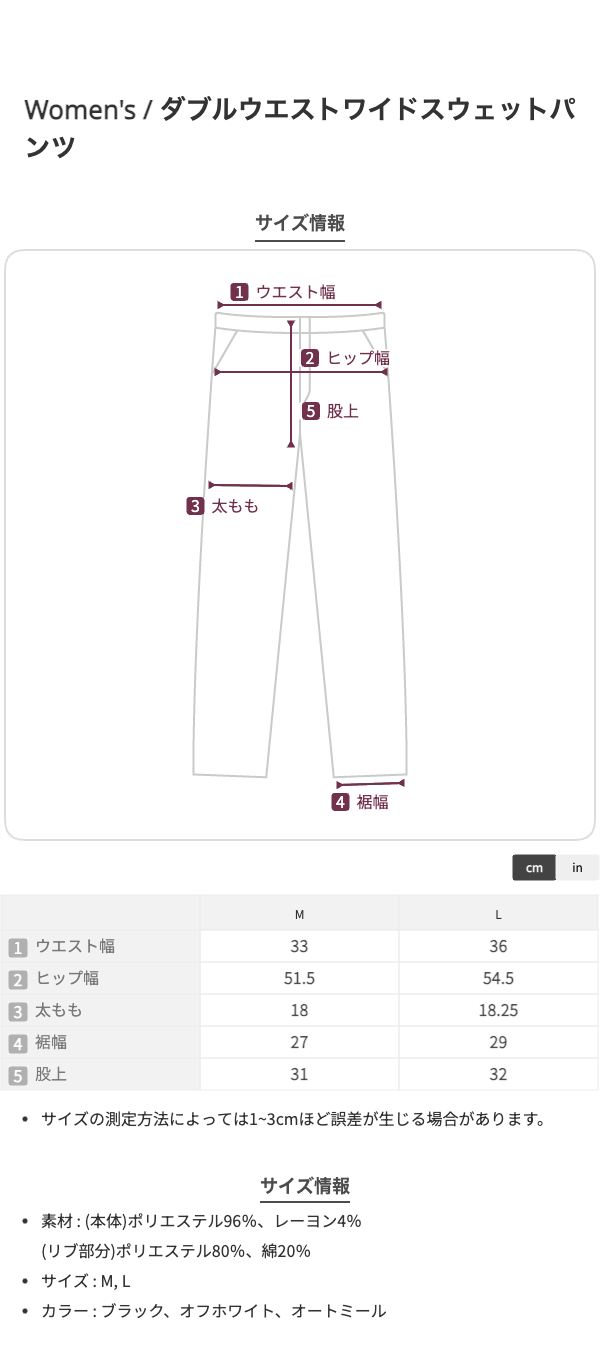 M:ウエスト66、ヒップ103、股上31、わたり幅36、裾幅27