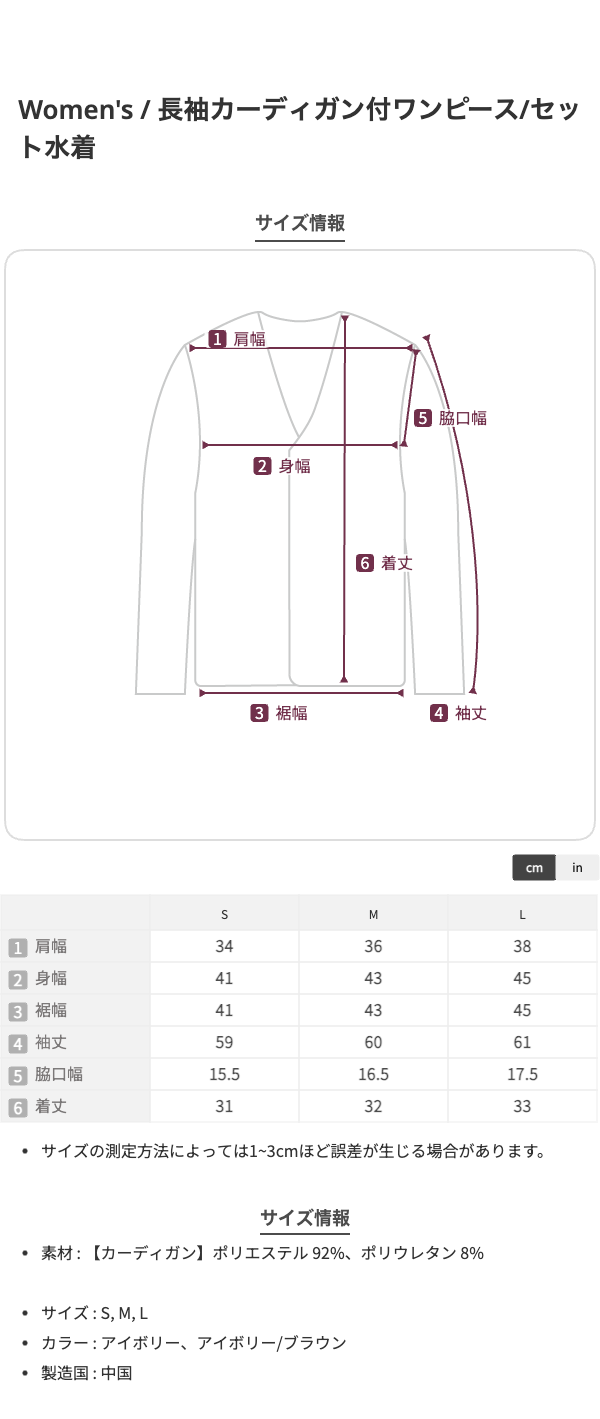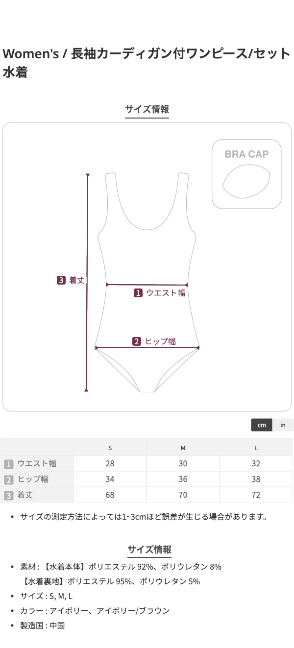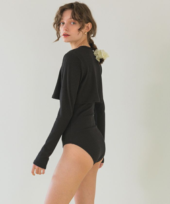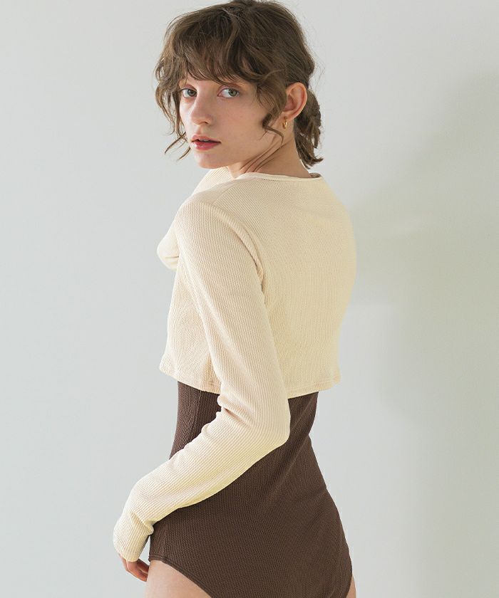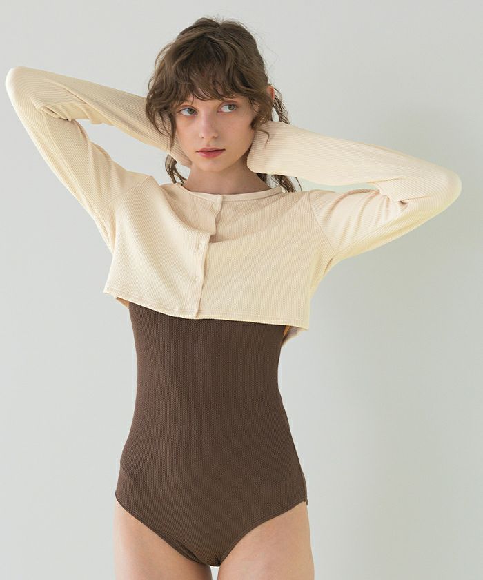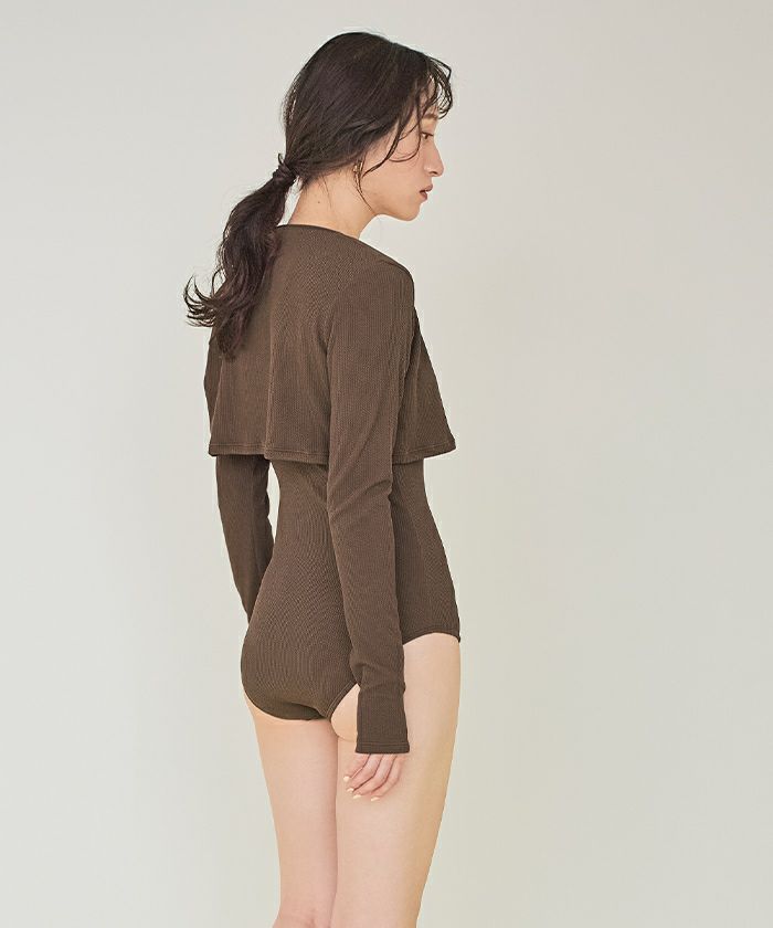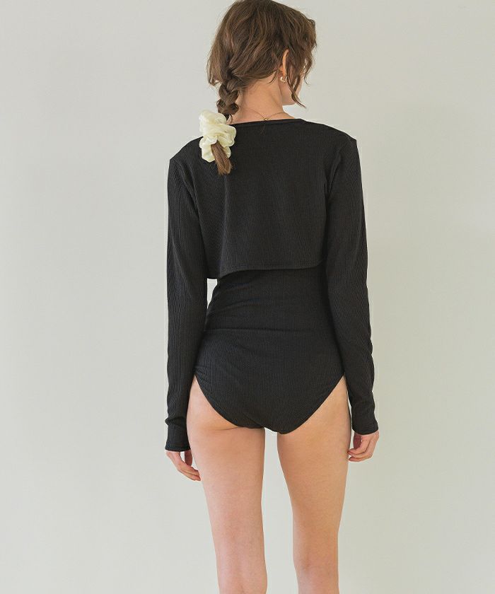 ・リブワンピース水着と同素材の長袖ショート丈カーディガン付きのセット商品。