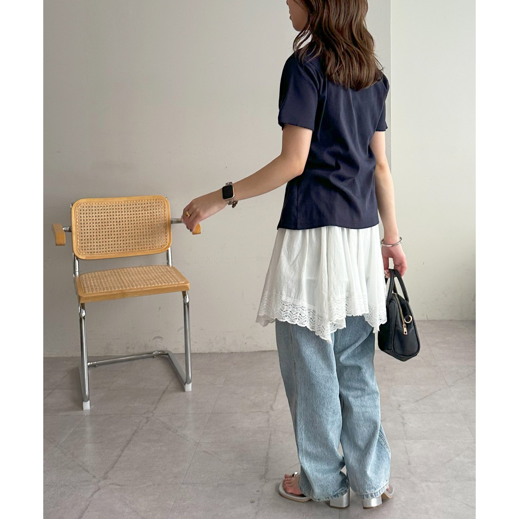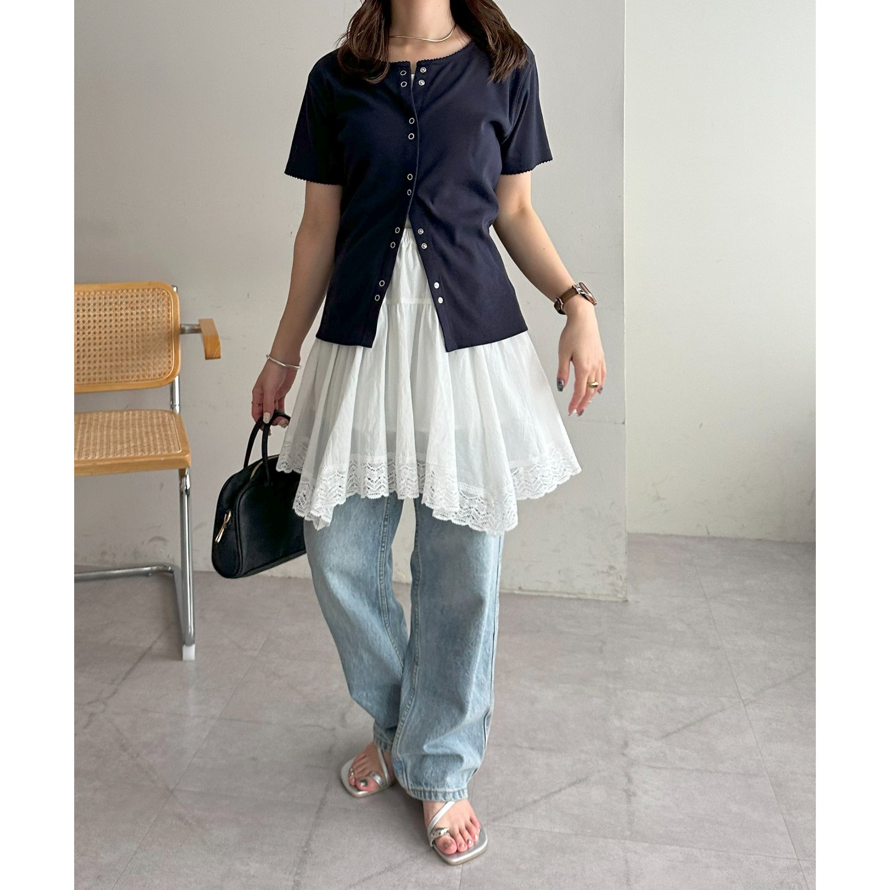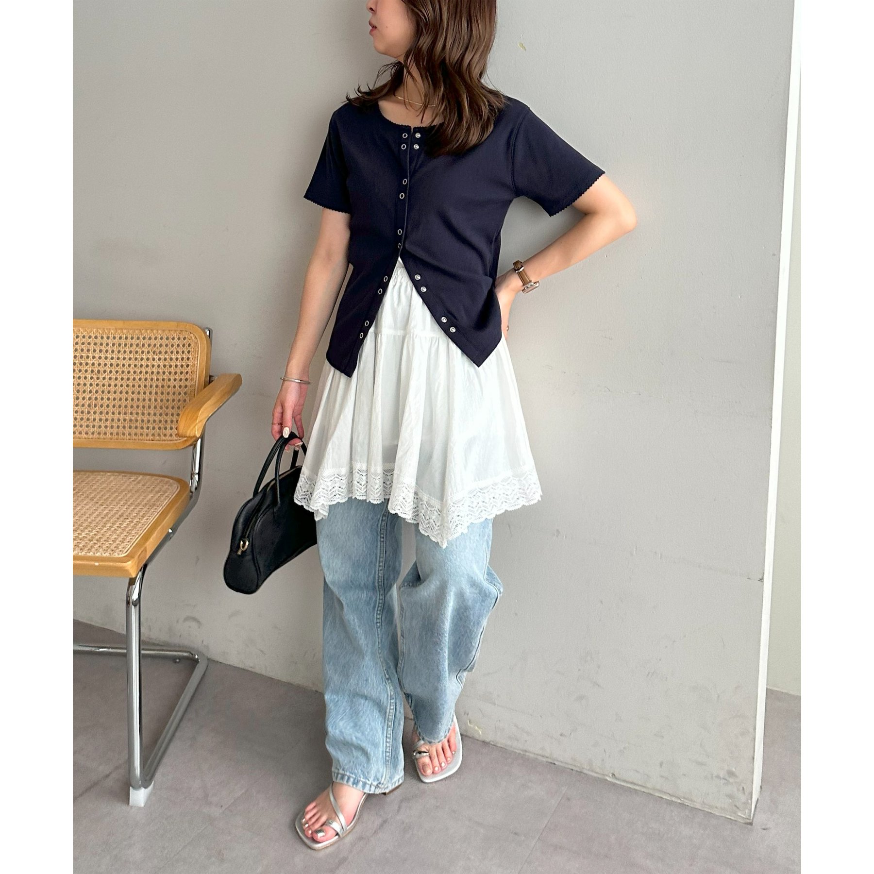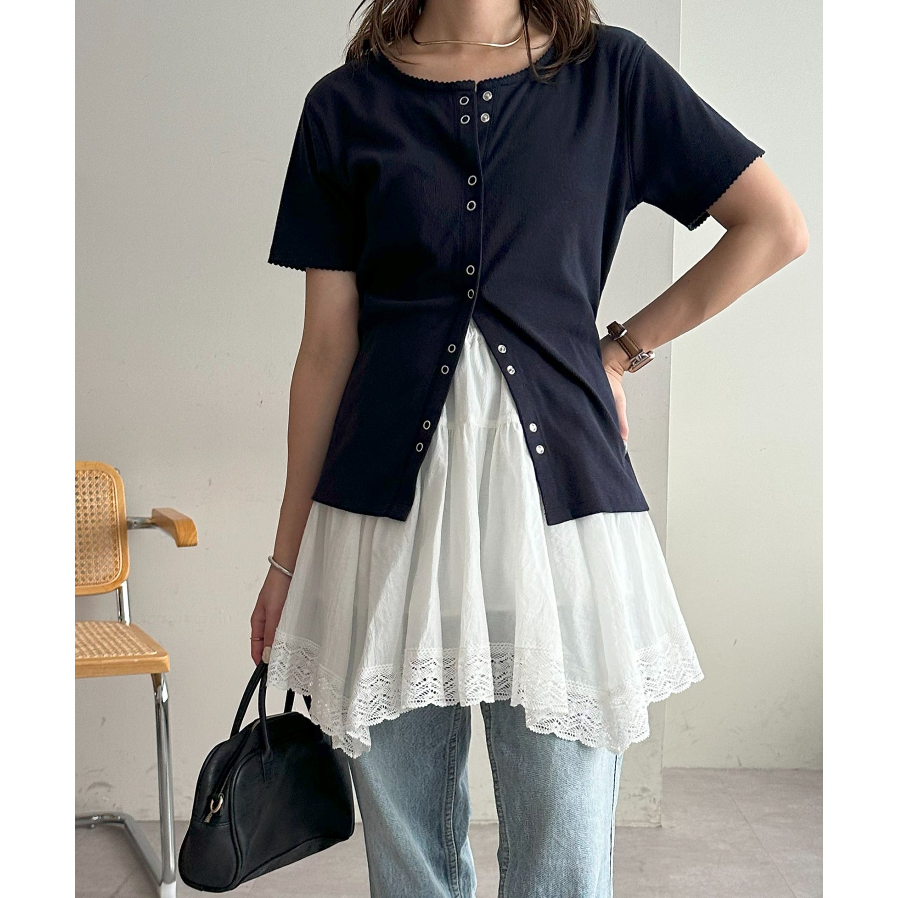 アシメデザインにすることで、シンプルなレイヤードスタイルに立体感とニュアンスをプラス。