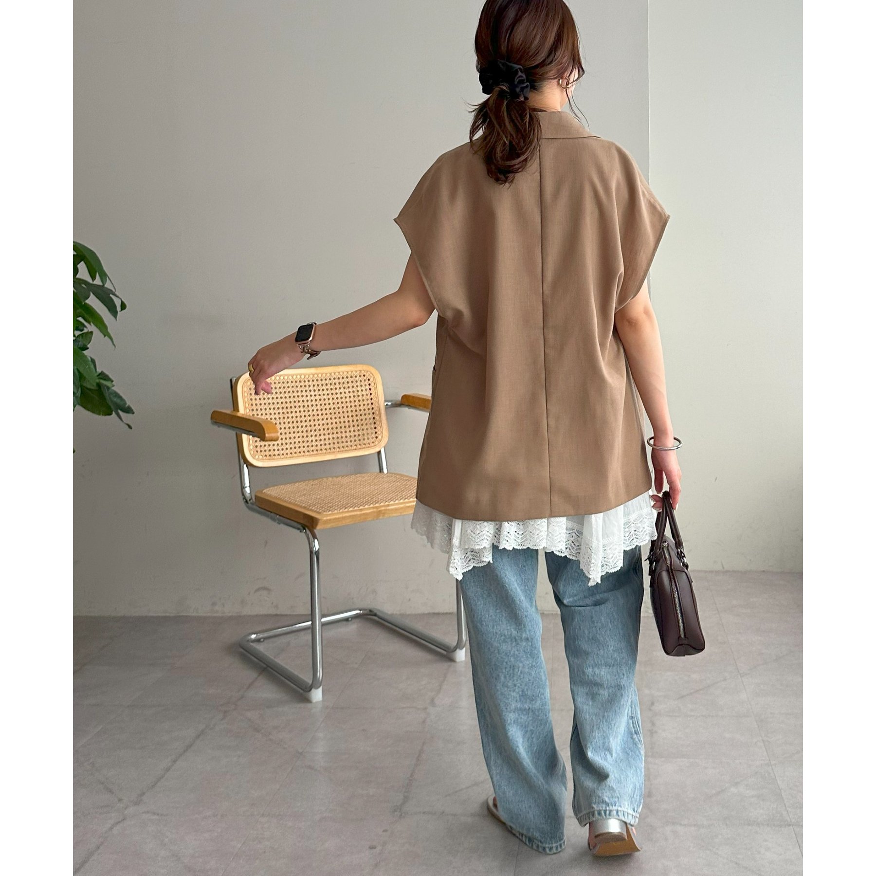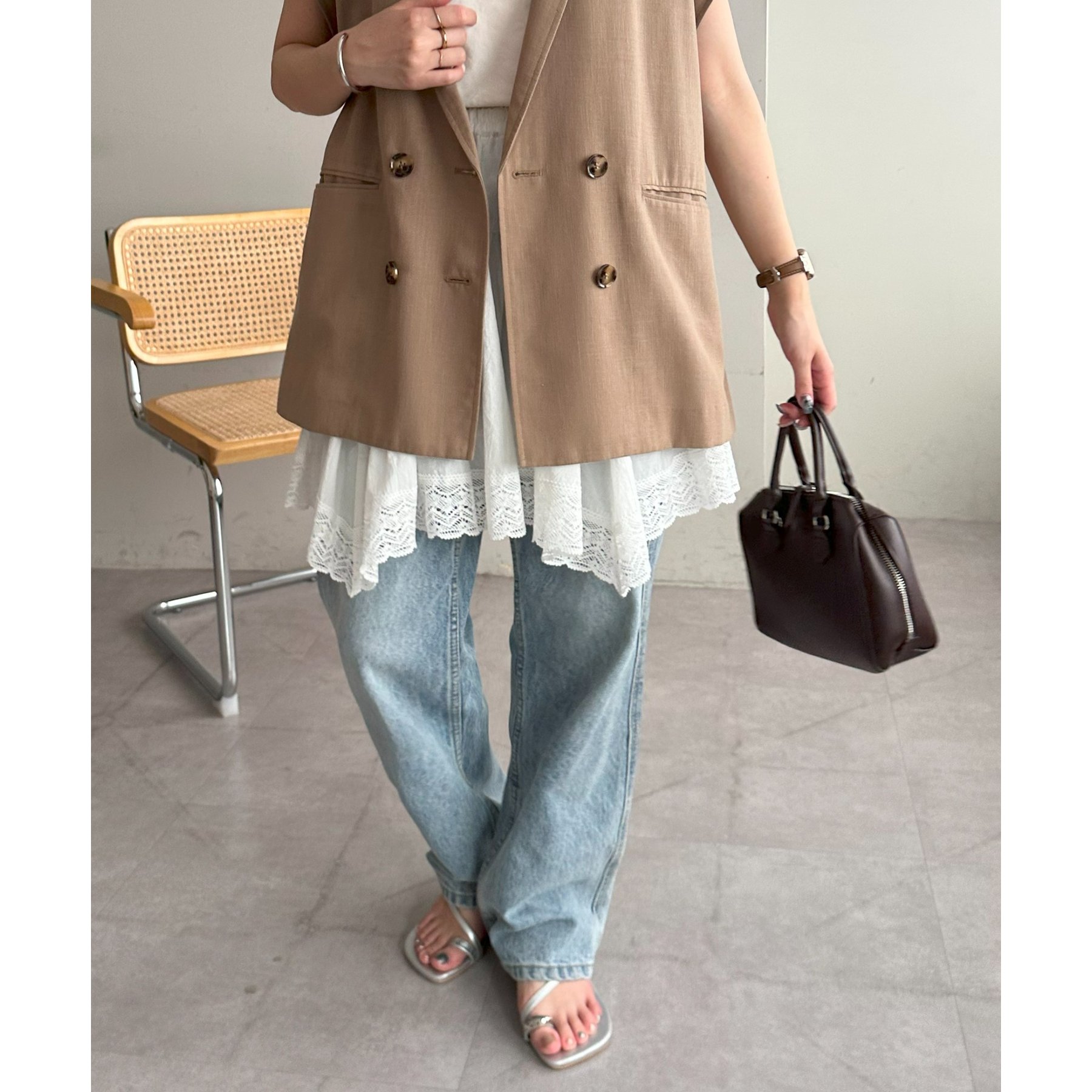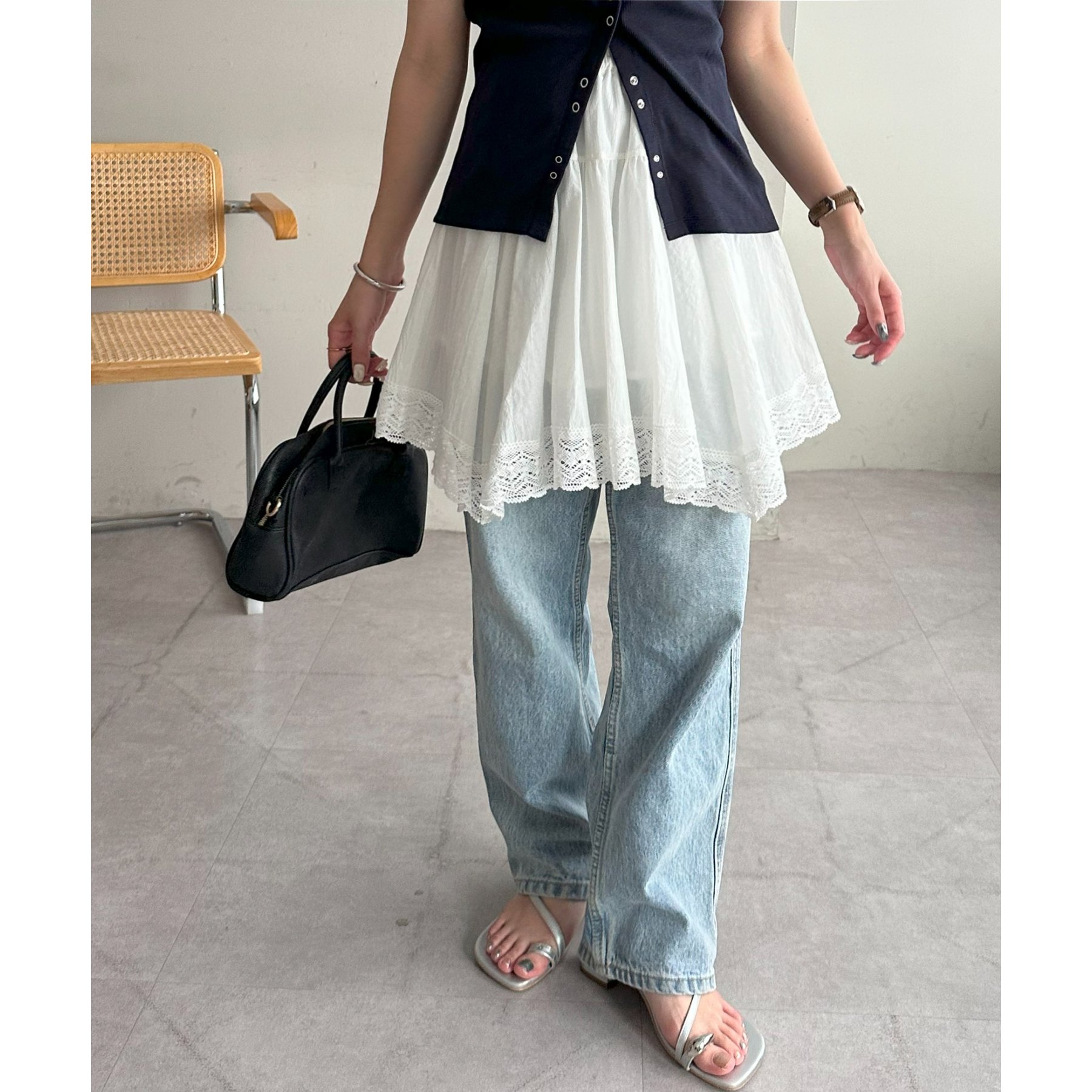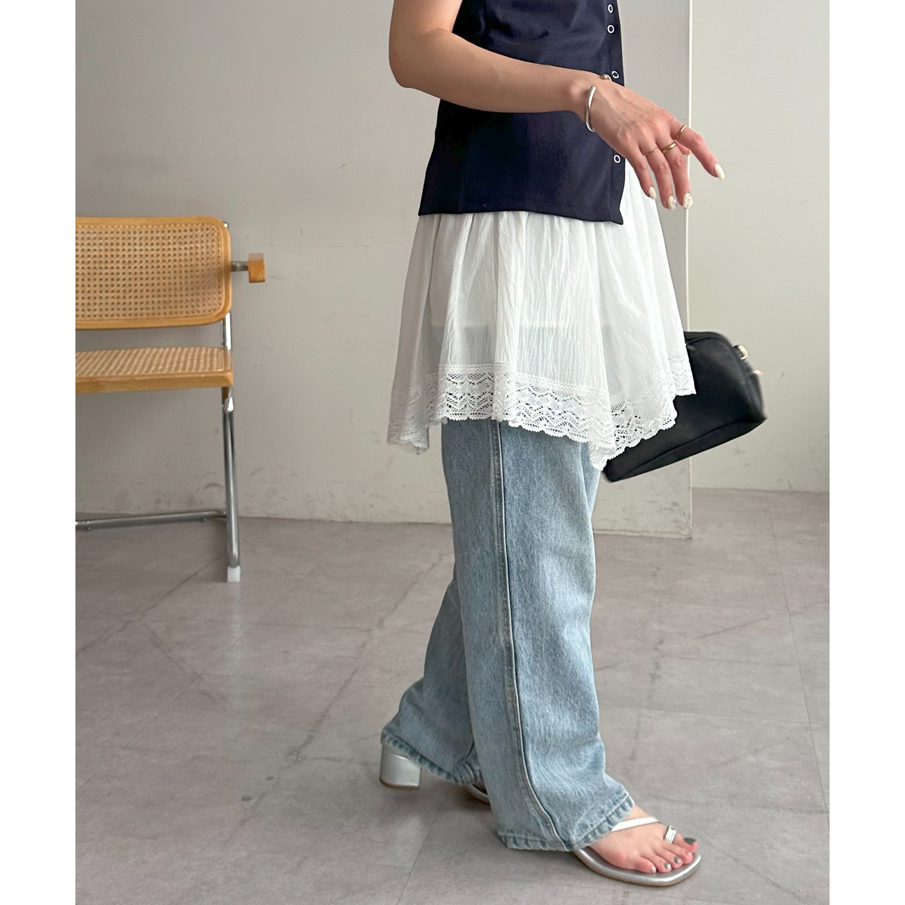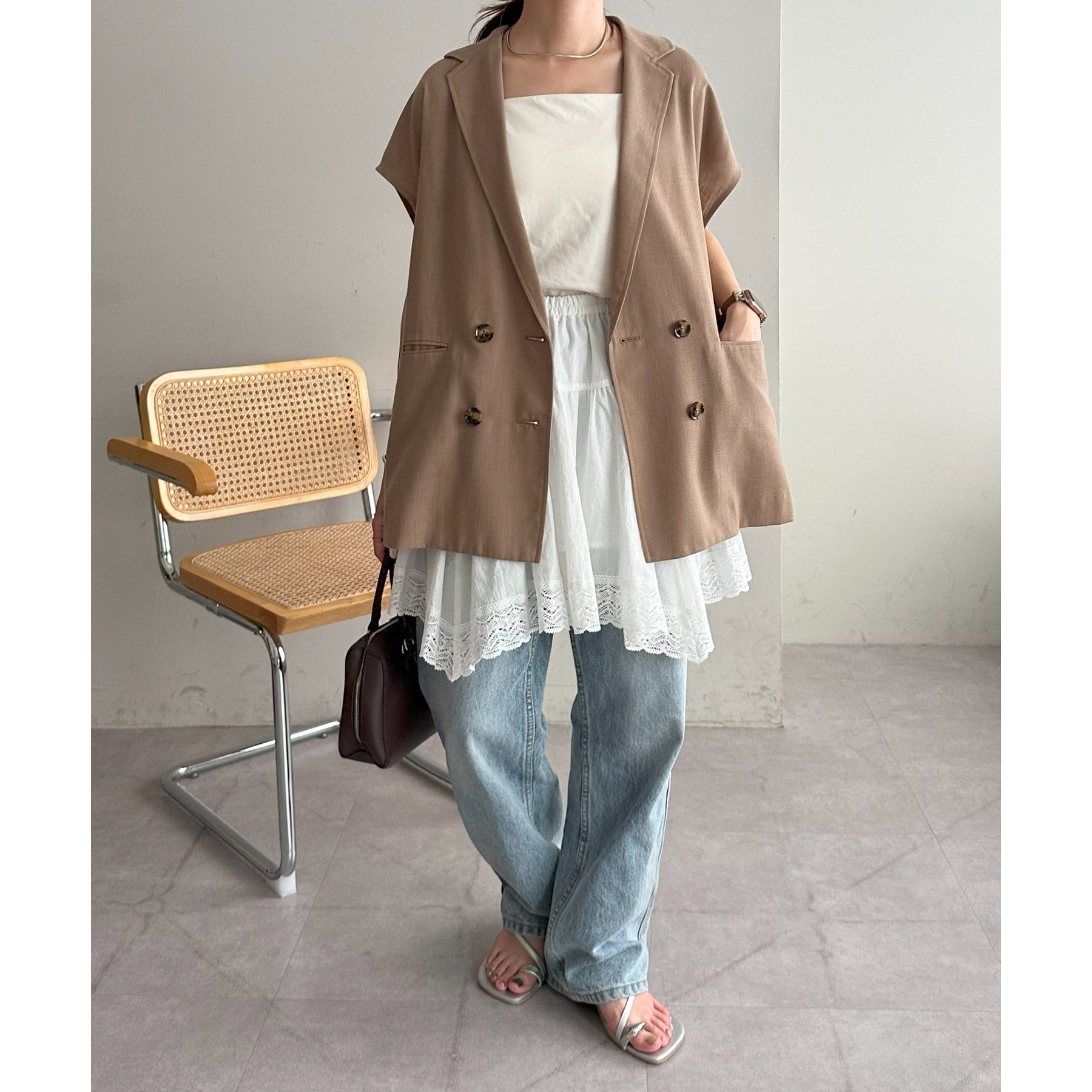 アシメデザインにすることで、シンプルなレイヤードスタイルに立体感とニュアンスをプラス。